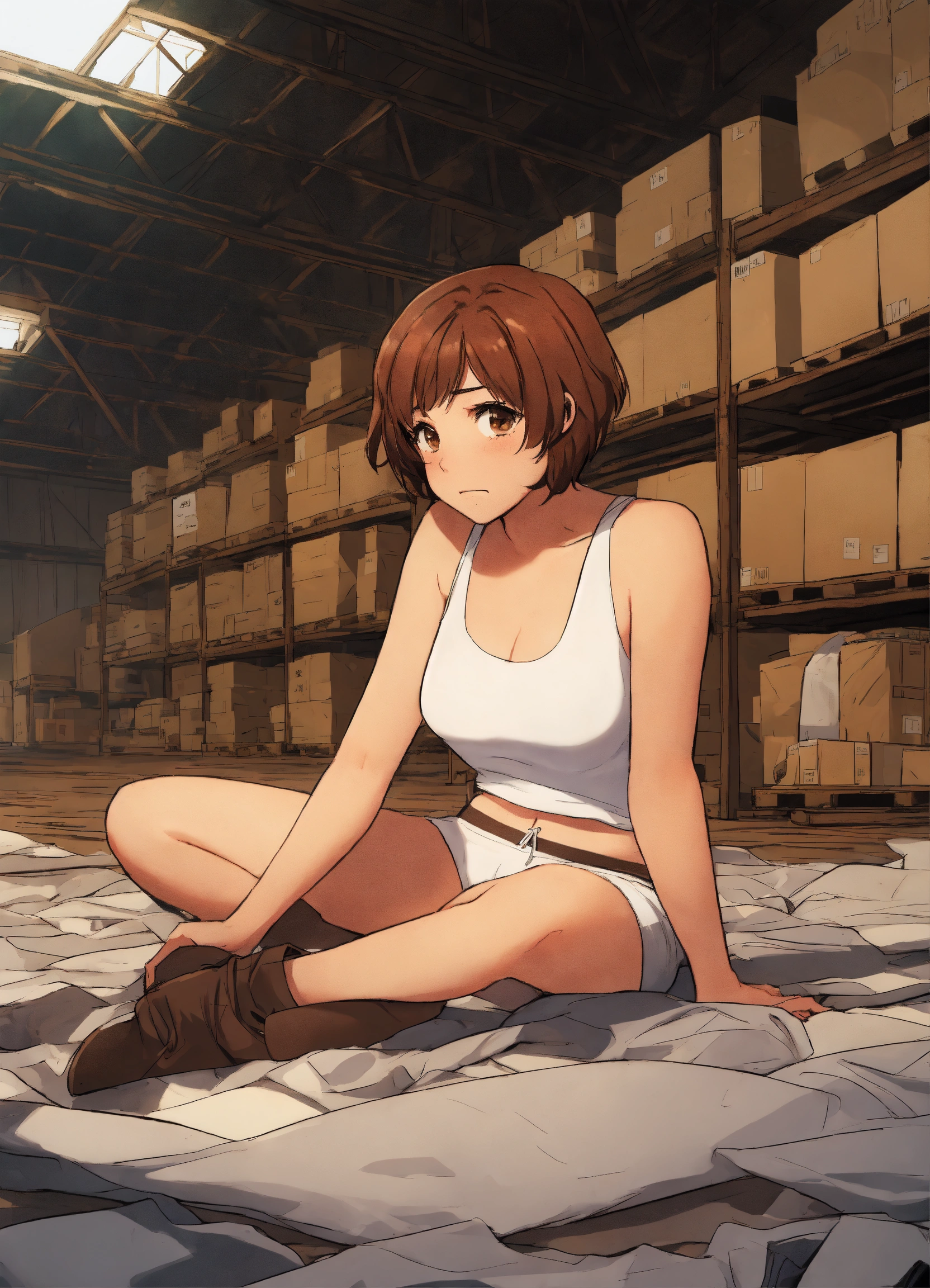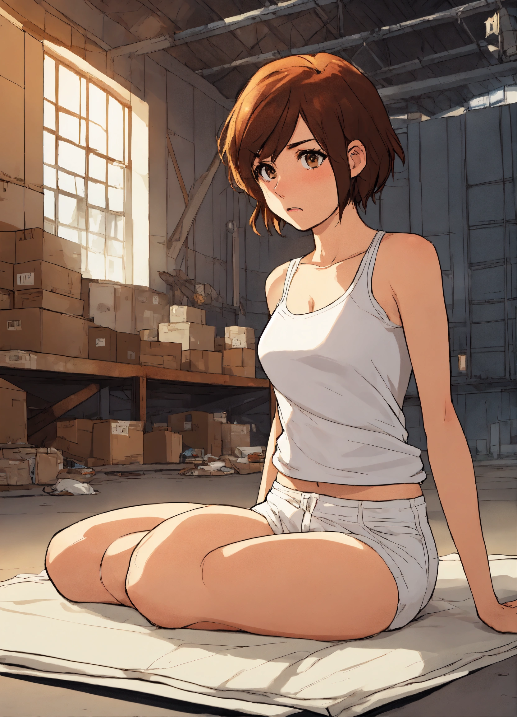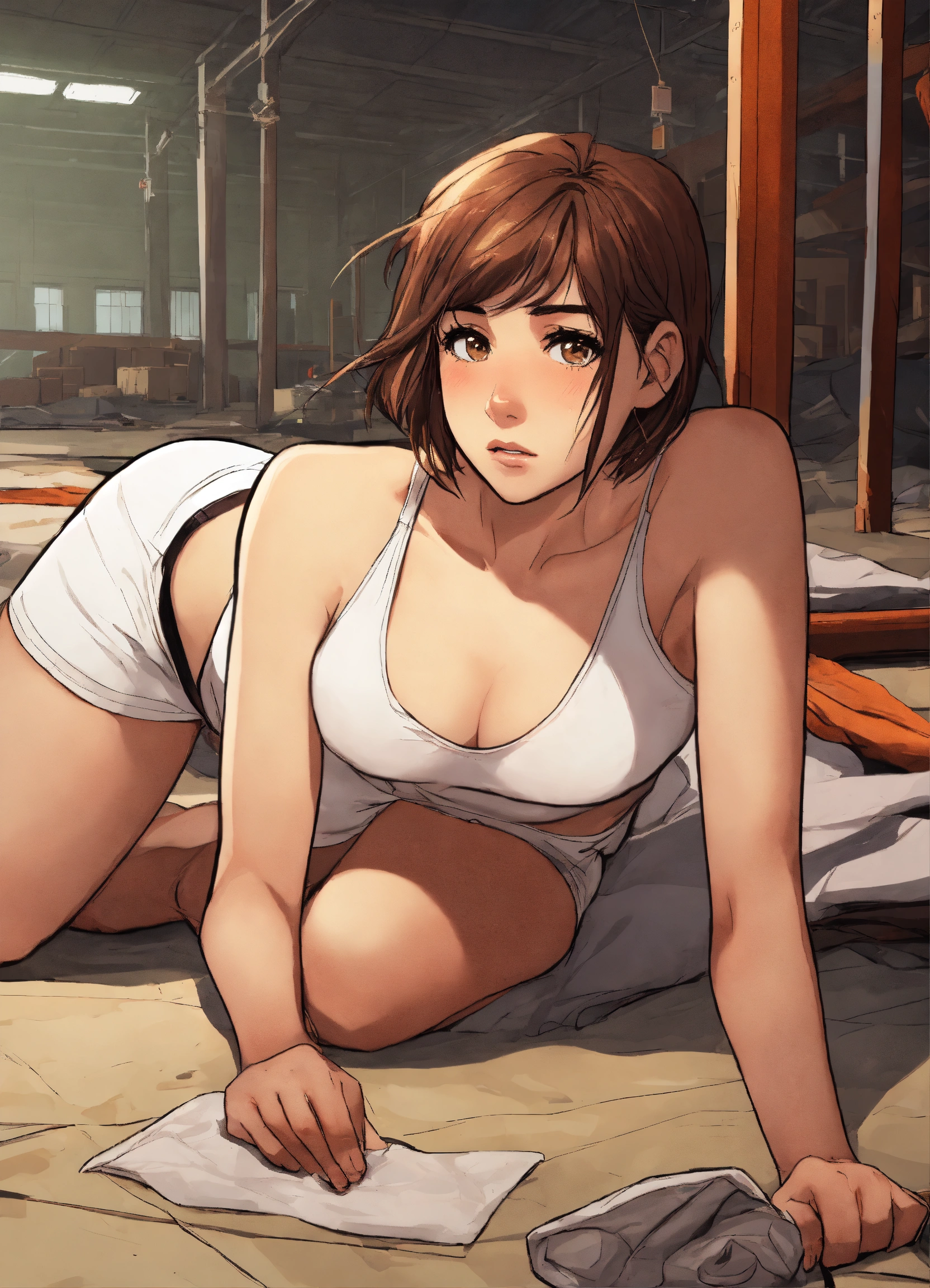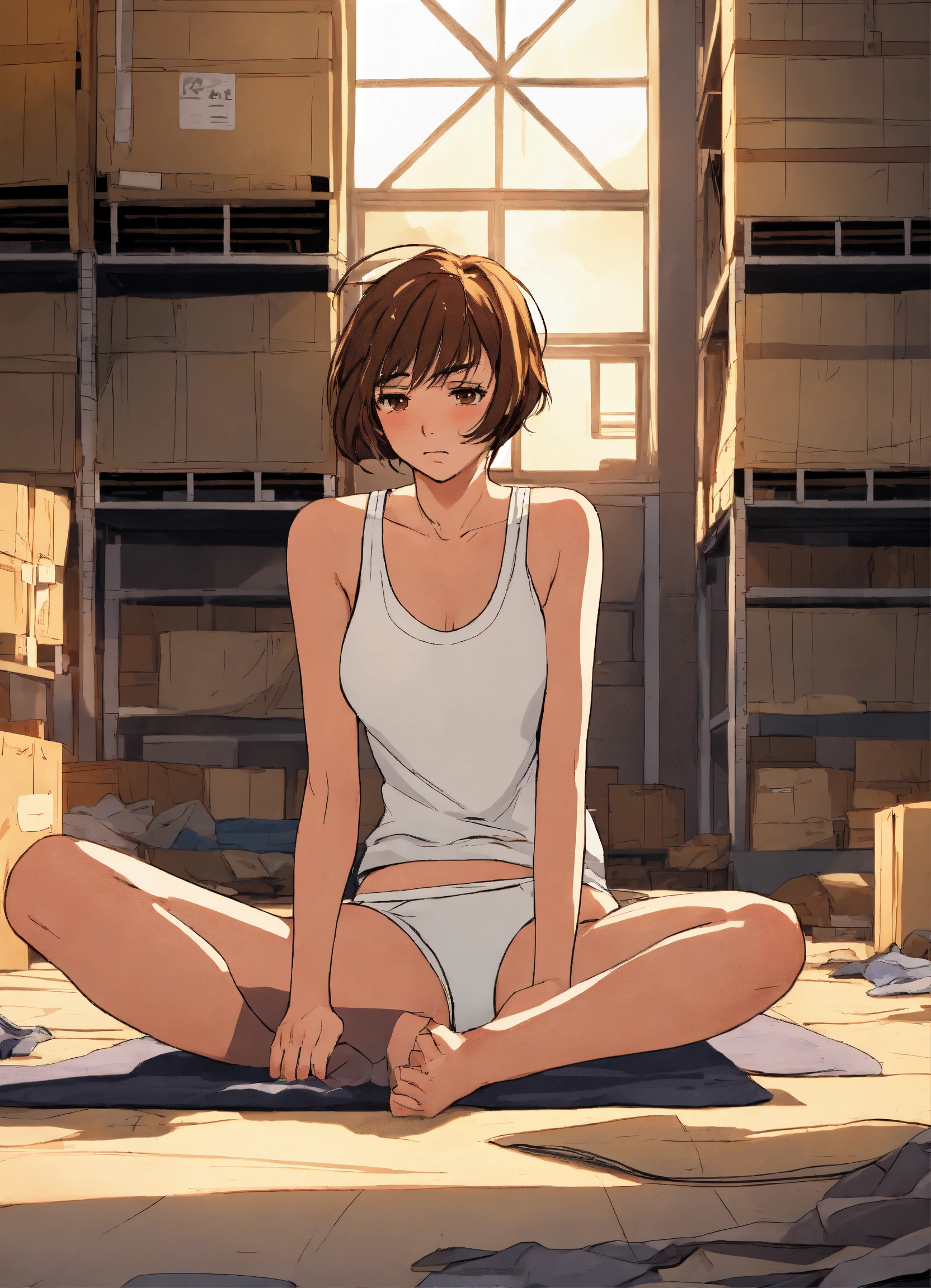 Comic character, sad, 21-year old girl, short brown hair, brown eyes, white tank top and white briefs, full body, laying down on a mat inside a warehouse.