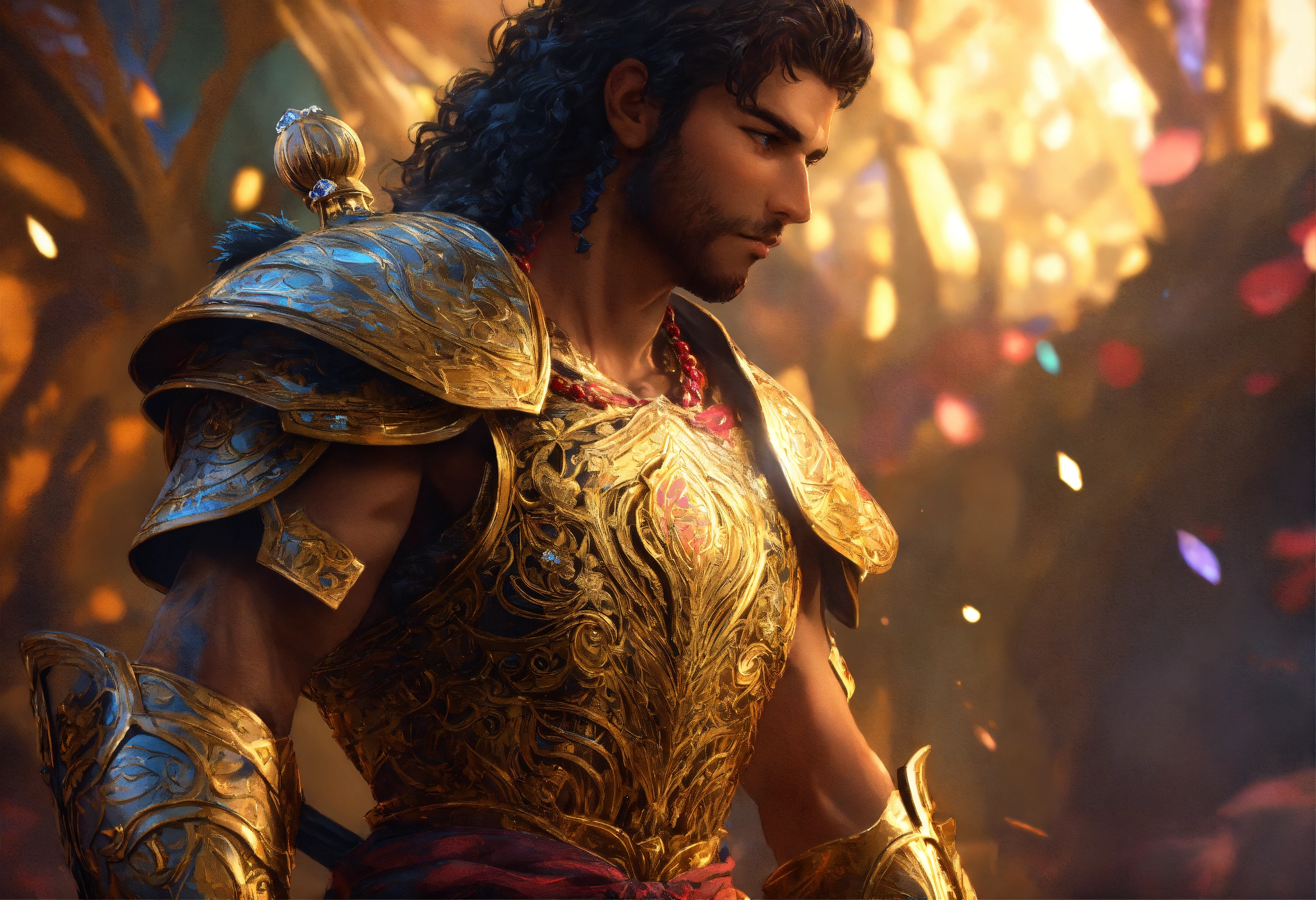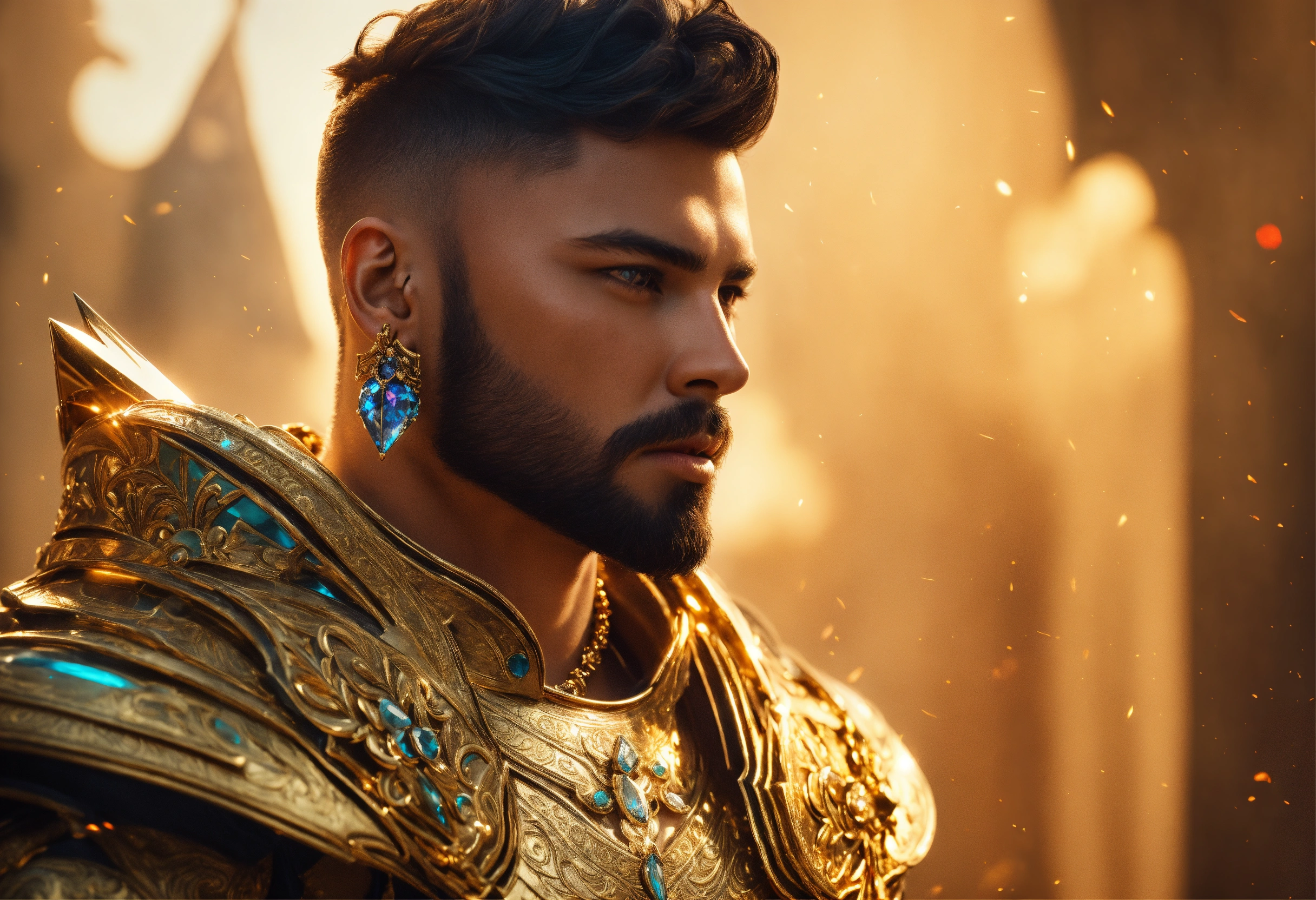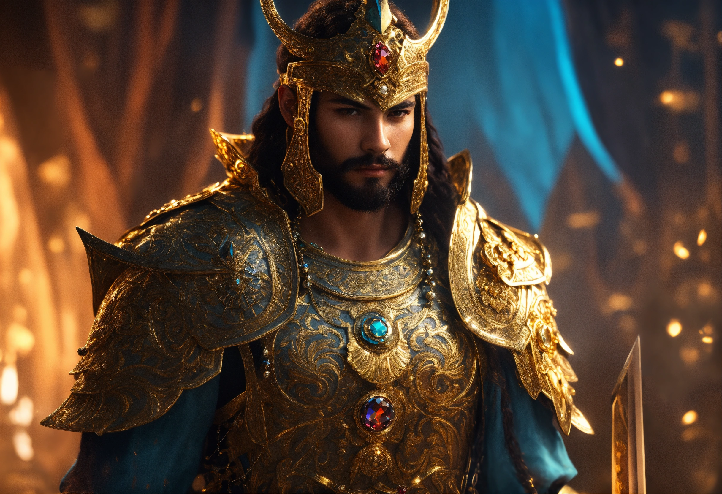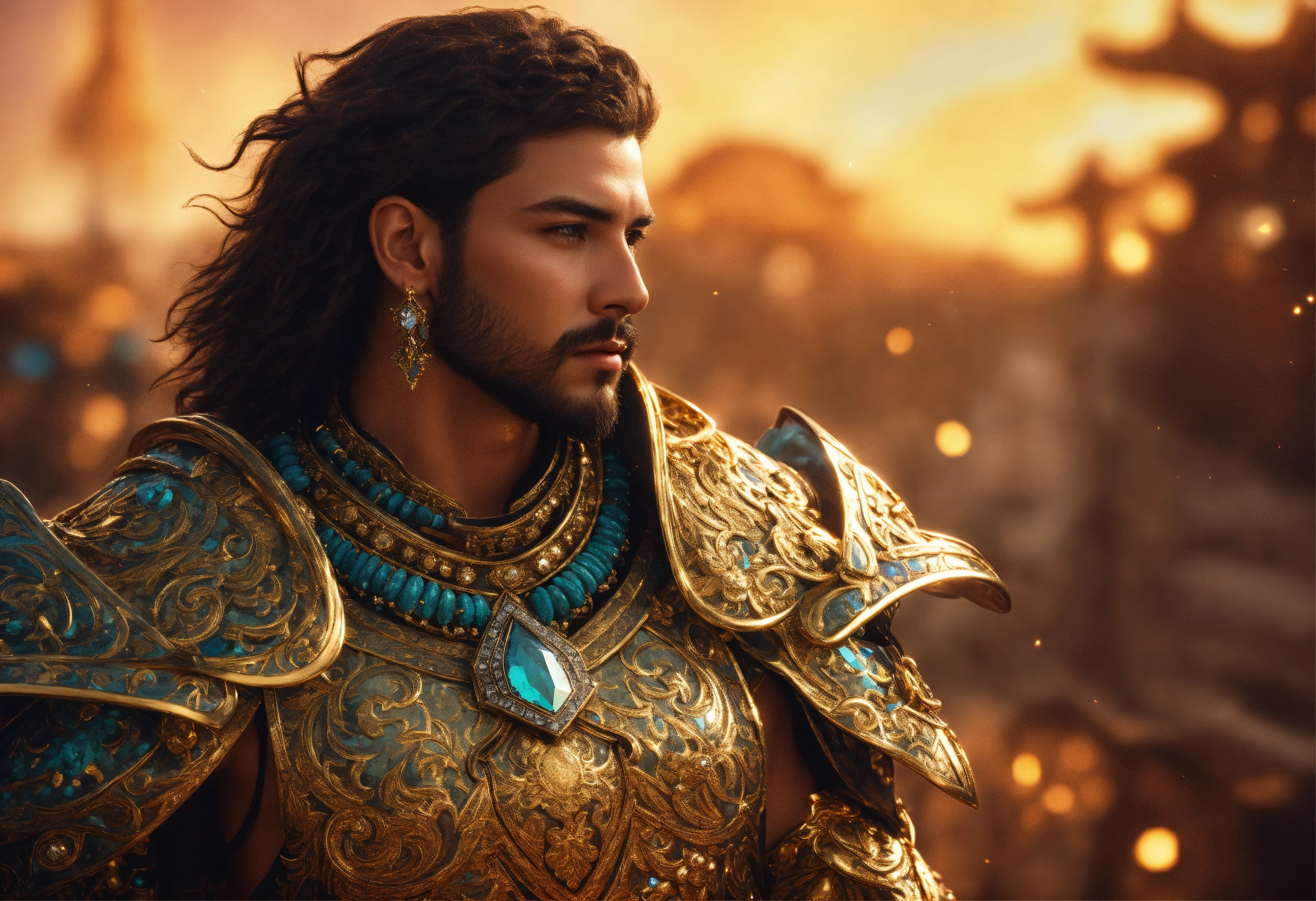 Warrior, male, full body, psychedelic, brass, gold and diamonds, strong sword, complex design on ornaments, invincible, bright backdrop, hair, violent, gentle, focused, godpower, divine, concept art, smooth, extremely sharp detail, finely tuned detail, ultra high definition, 8 k, unreal engine 5, ultra sharp focus, fantasy, high contrast, beautiful lots of colorful jewelry great necklace