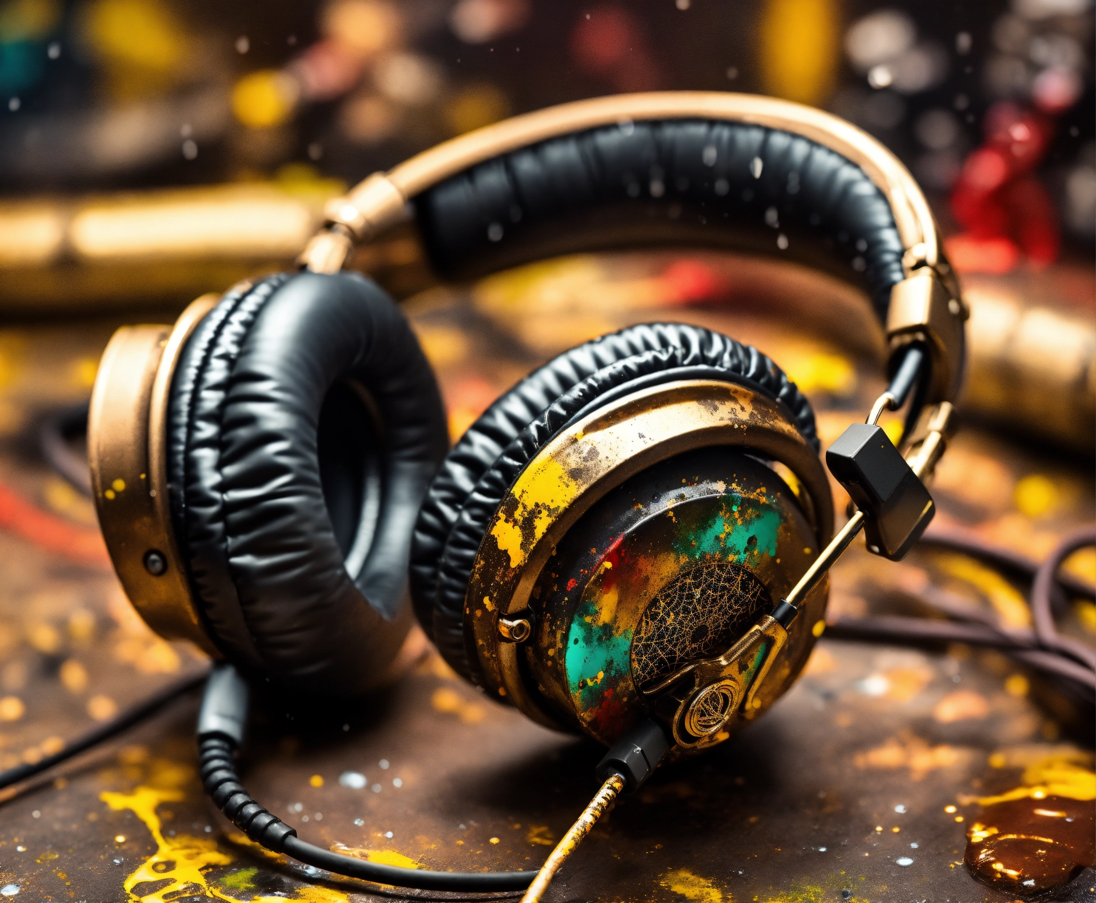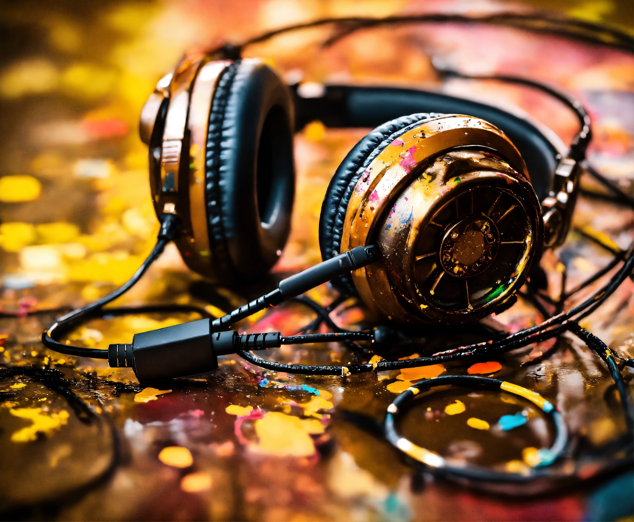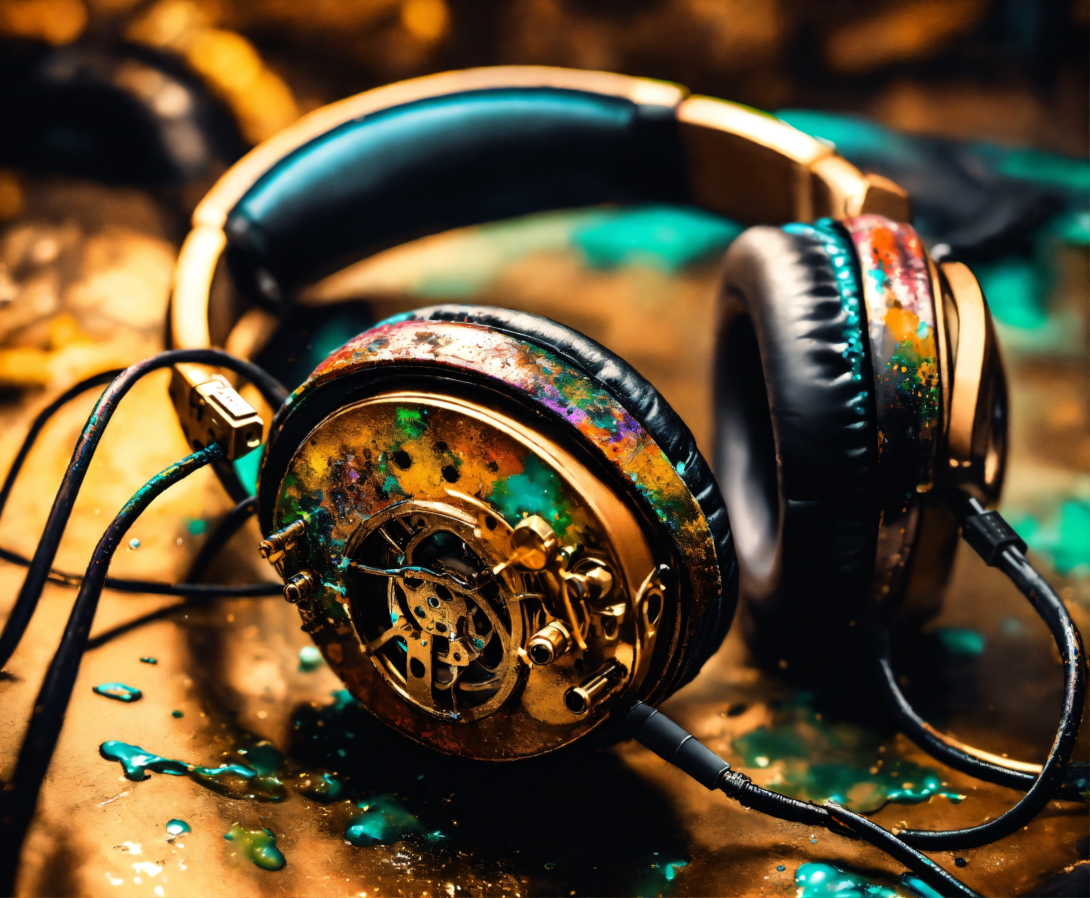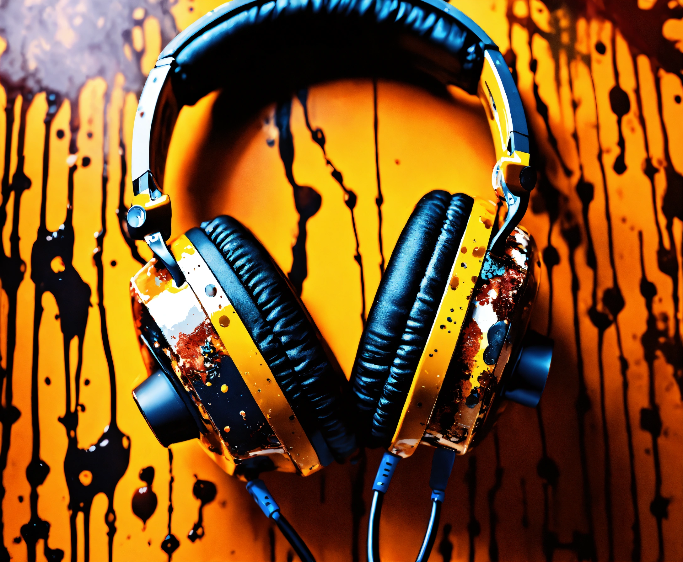Drip paint headset. usb-c cables tangled with hdmi cables colorful brilliant tones. paint splatters in sepia toned background. water condensation effect, photograph, intricate detail. steampunkcore halloweencore