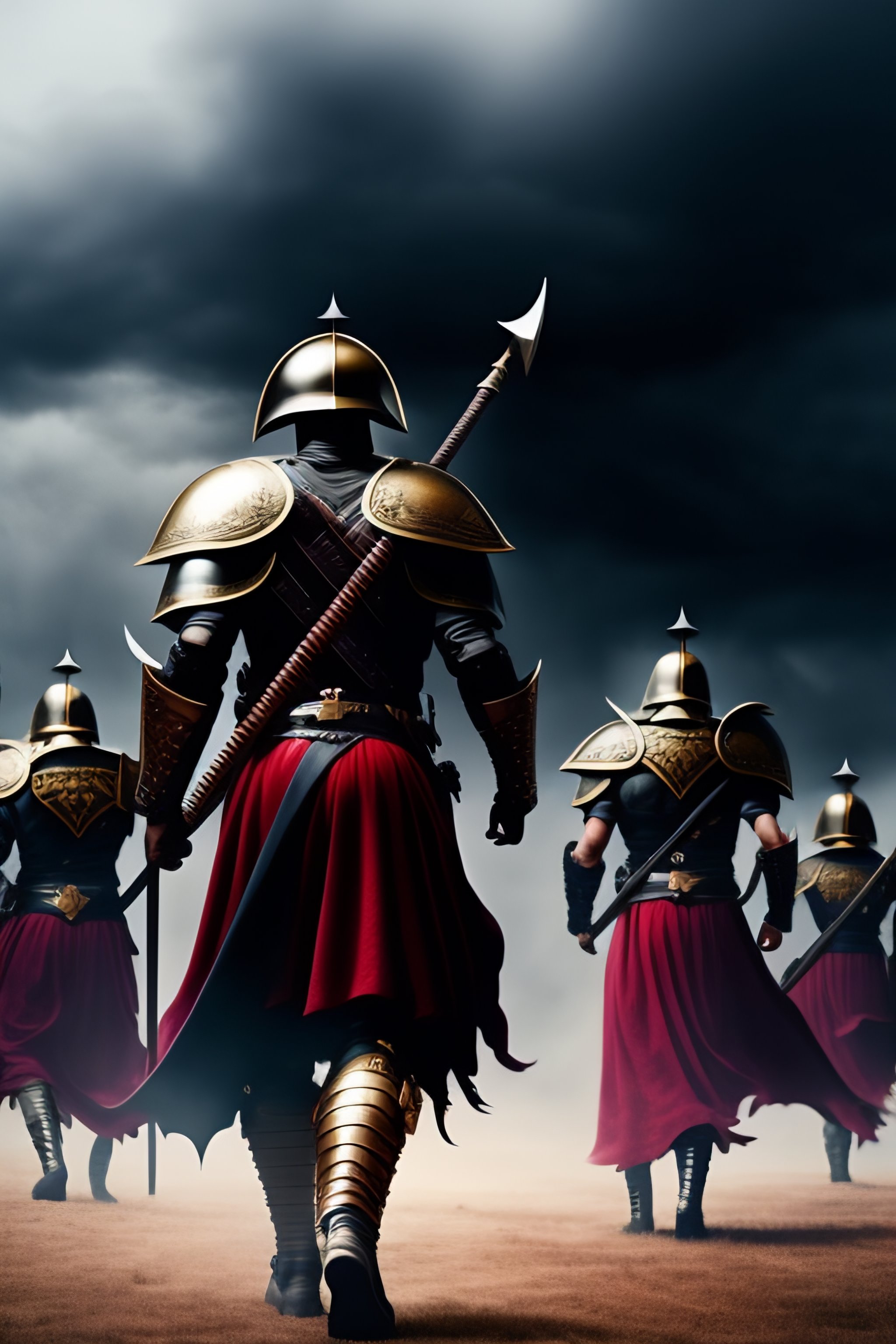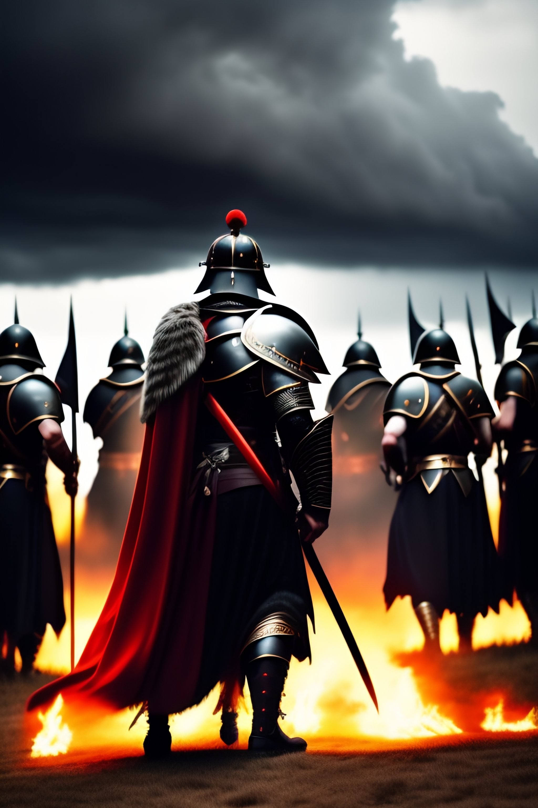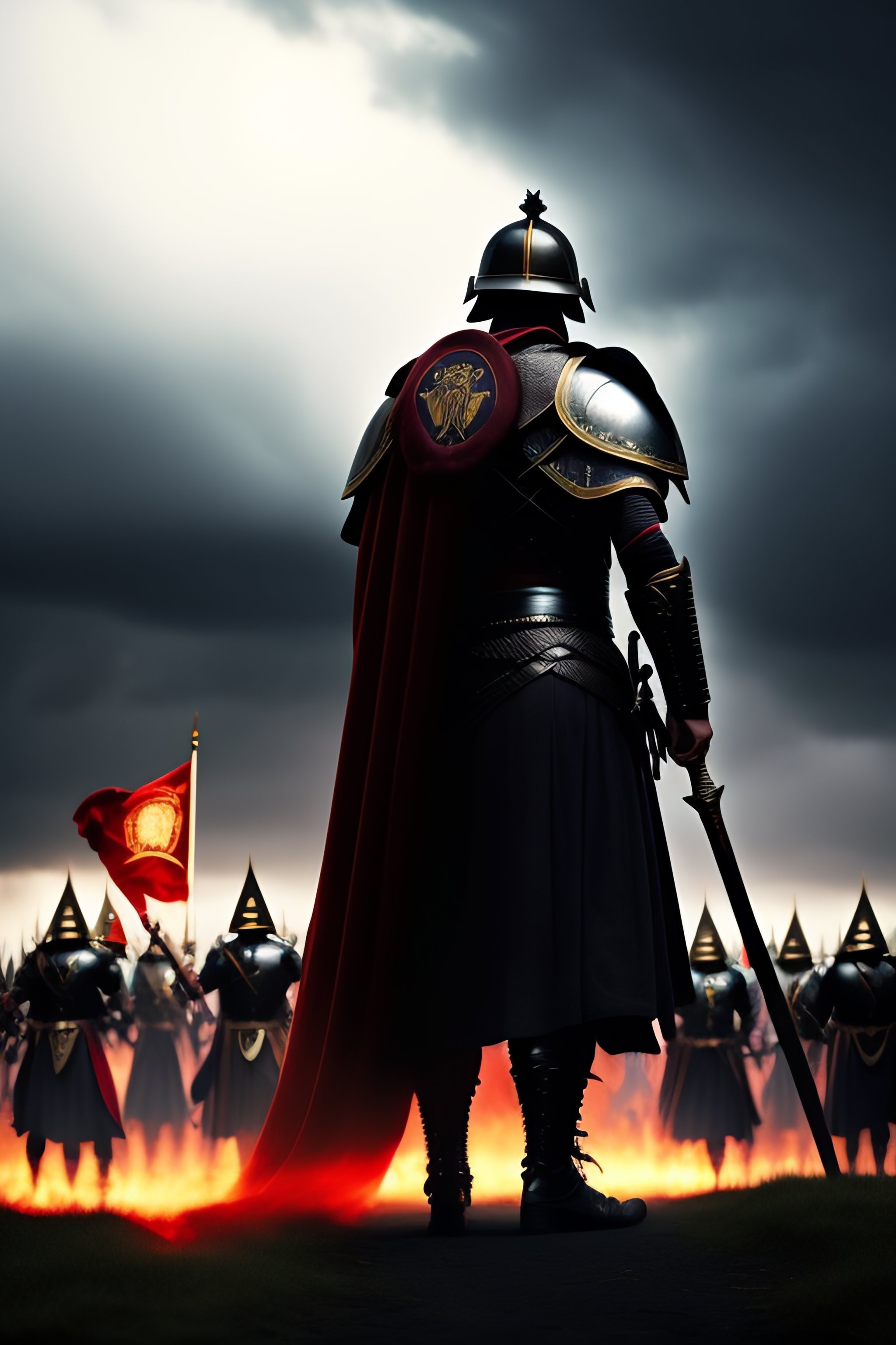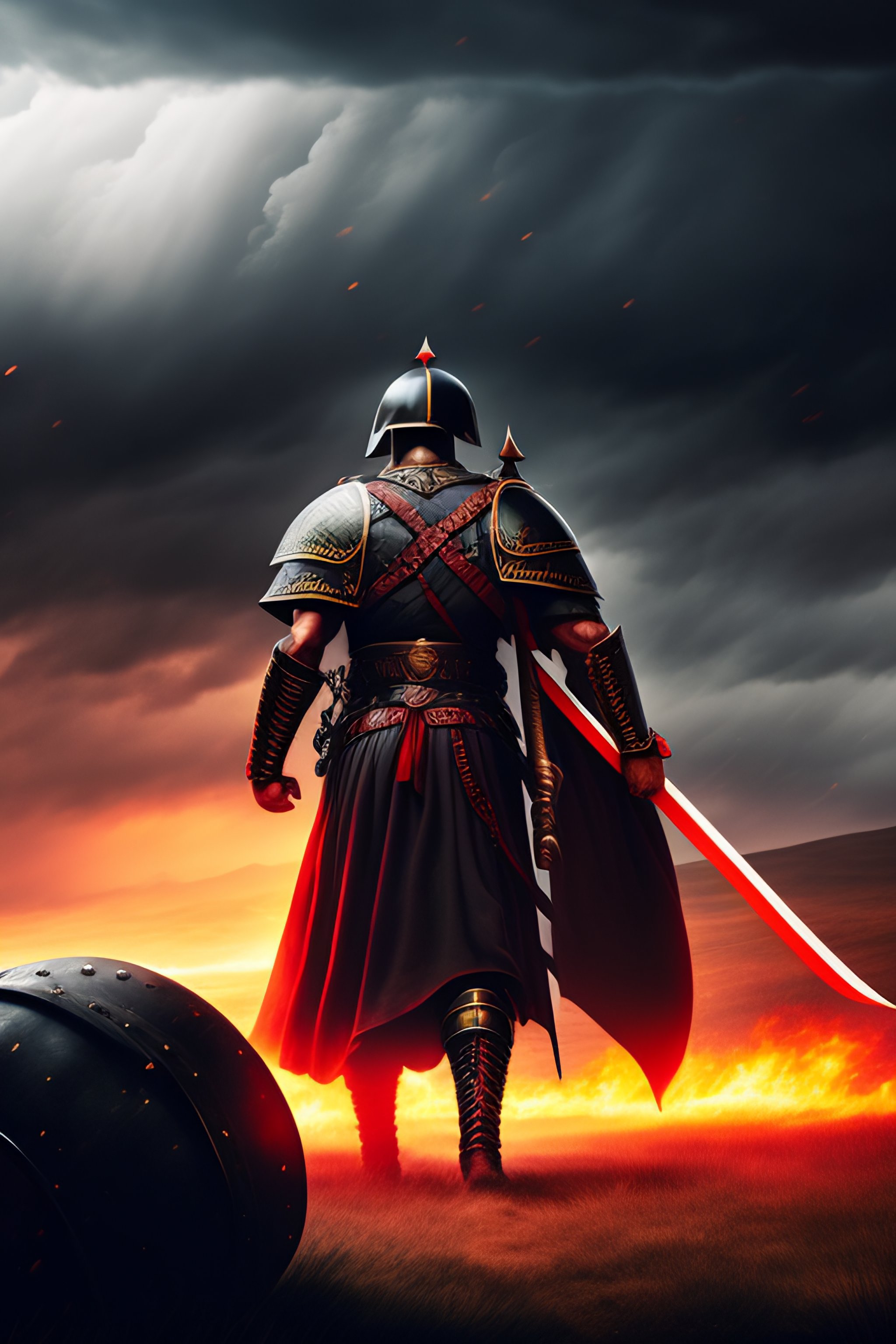 A roman legion forming a shield wall against a demon army under a black, stormy sky. a distant black fortress on scorched, black earth. the roman soldier holds a red banner.
