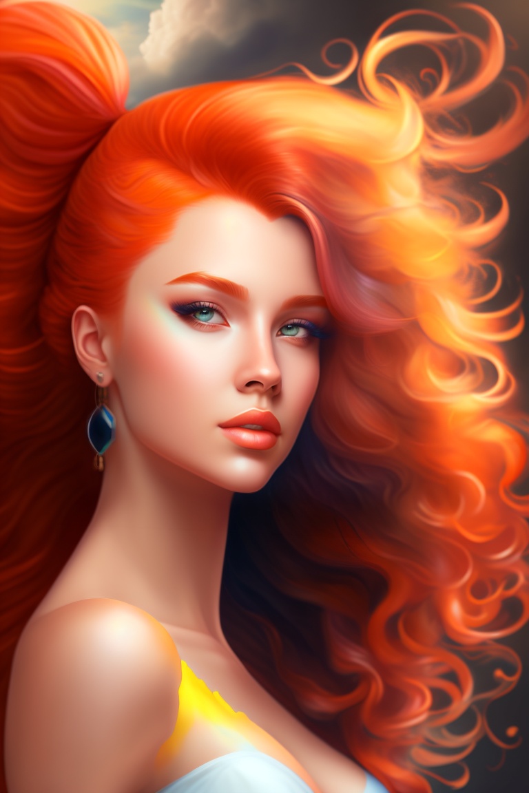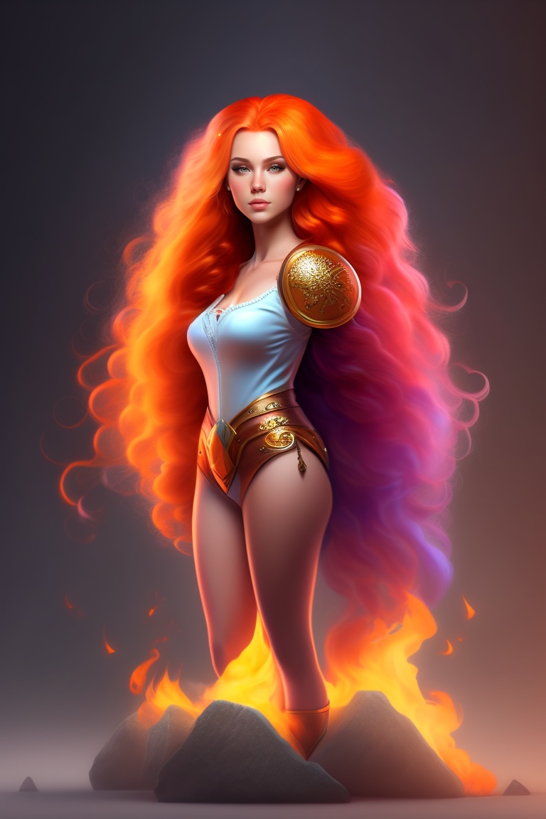 Draw a full-length adult girl with fiery hair in daylight soft light, detailed 3d photo in fantasy style