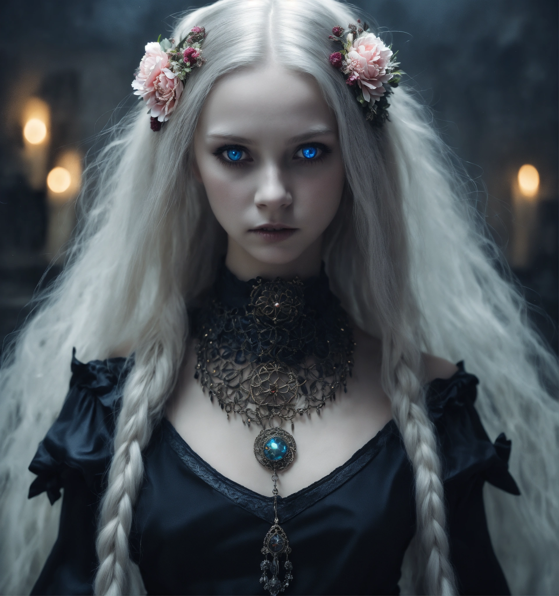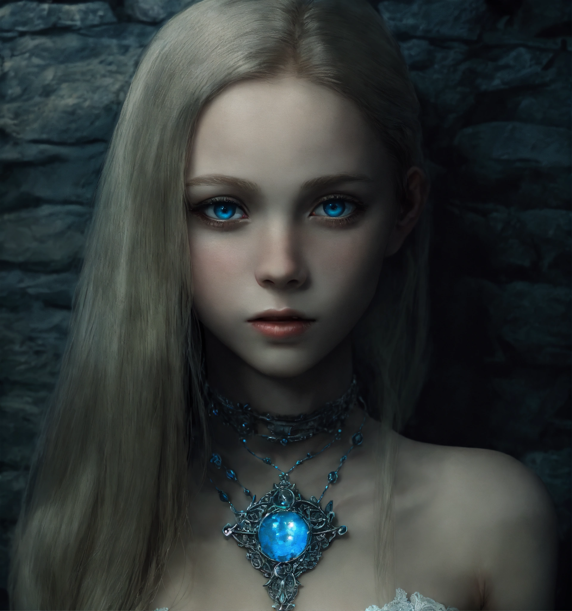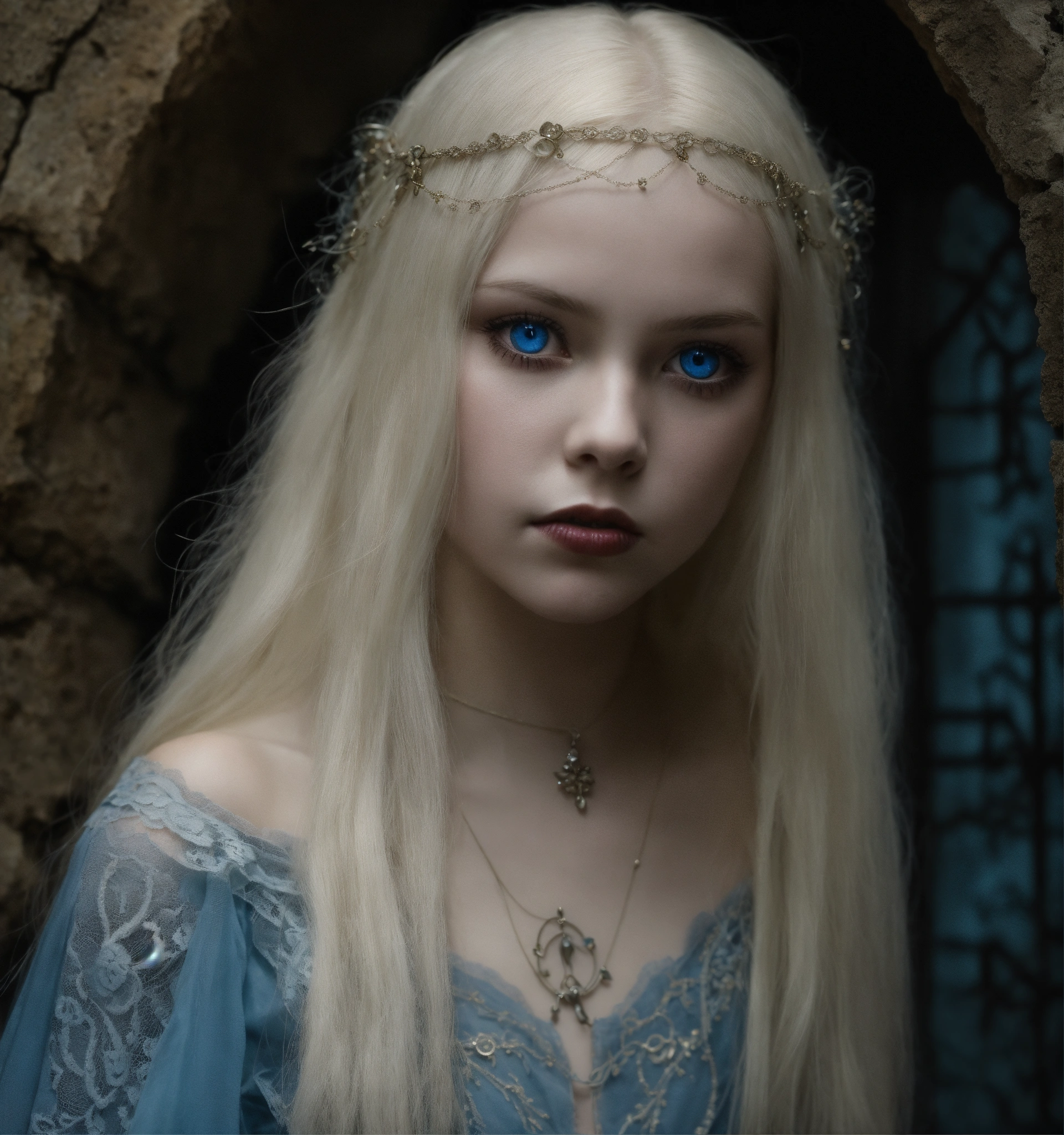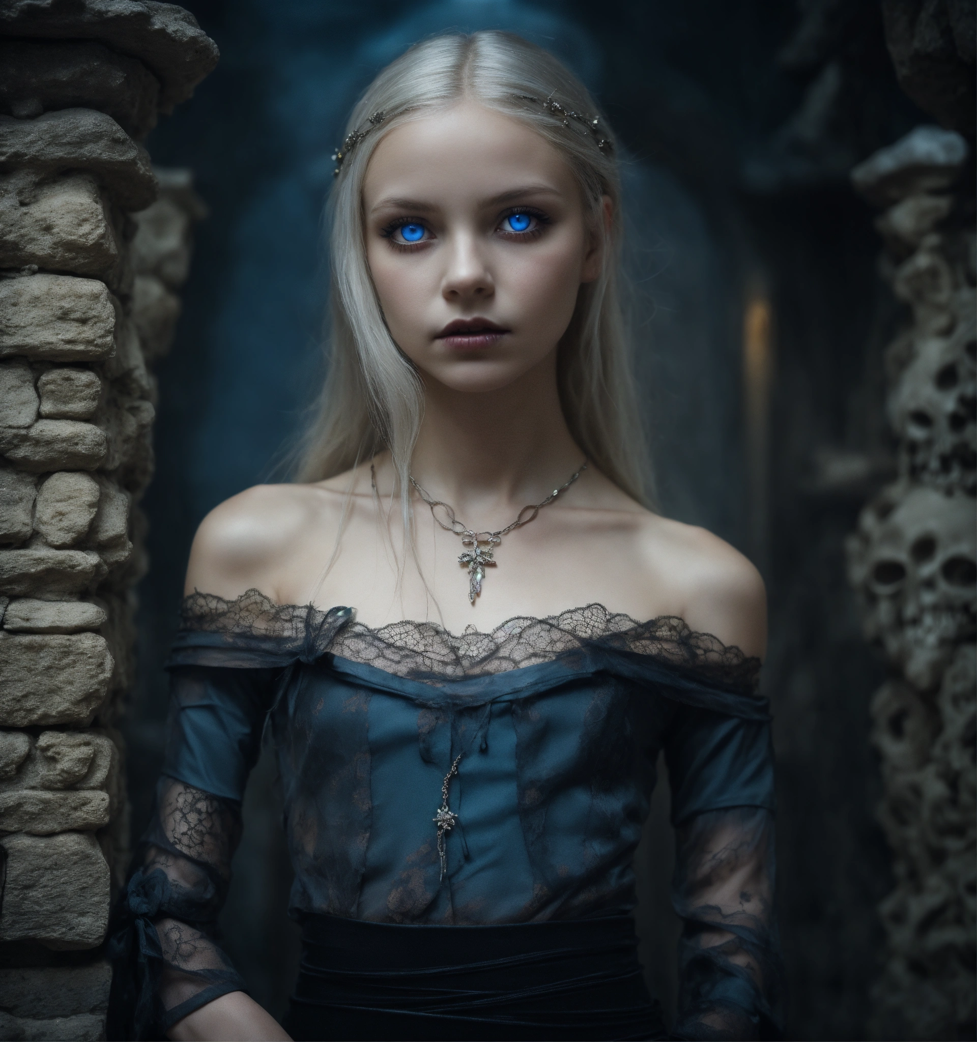Body portrait, sehr kindhaft deadly pale twelve year old female child goth necromancer with waist long silverwhite hair and a aufreizendes off-the-shoulder lace silk cropped top mit tiefem ausschnitt and a low-waisted high slit skirt, very flat belly, extremely skinny, extremely slim and emaciated body, very narrow face, alabaster skin, pale as a corpse, glowing blue eyes, slim face, innocent looking, in a gloomy crypt, kindlich, unschuldig, childlike, juvenile, graceful, wispy, glowing blue eyes, ghostly, dead, evil, demonic, undead, darkness, grotesque, mysterious, dark, dark, cold ambient lighting, extremely detailed, fantasy, medieval setting
