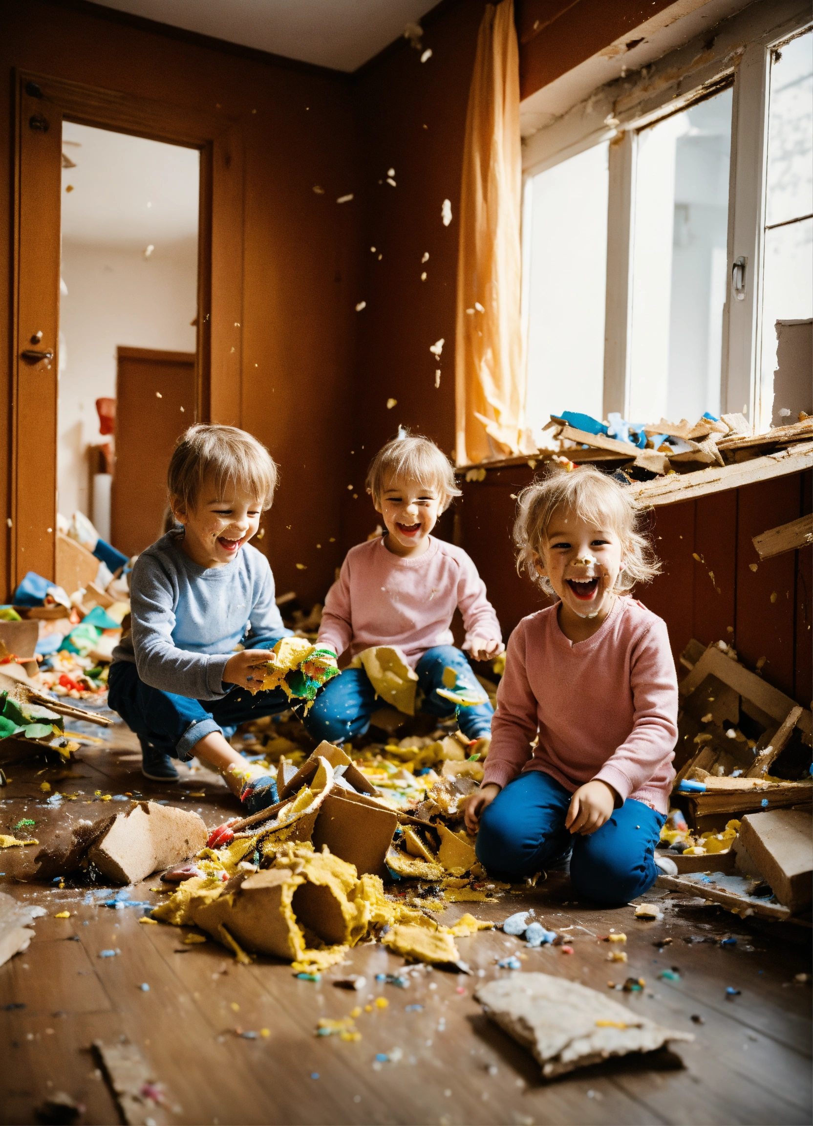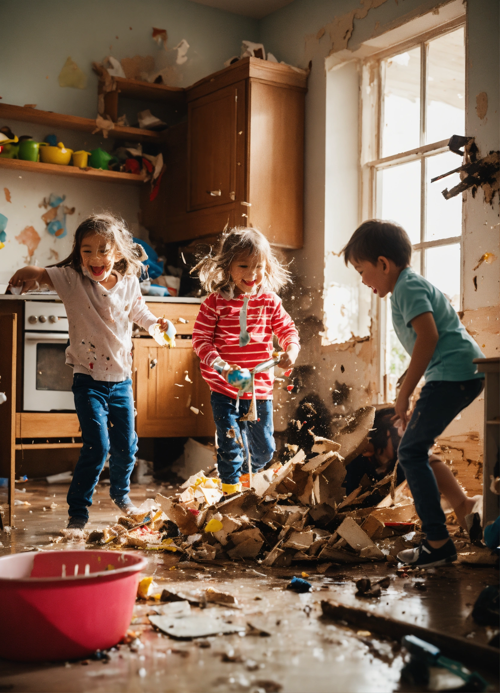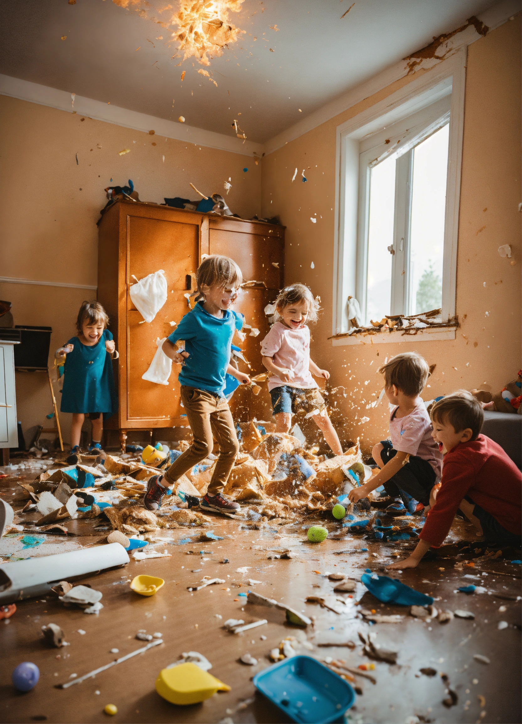 Six cheerful and active children make a mess and destroy their house
