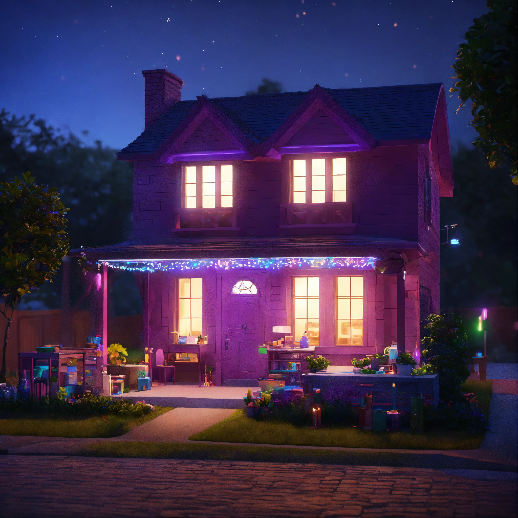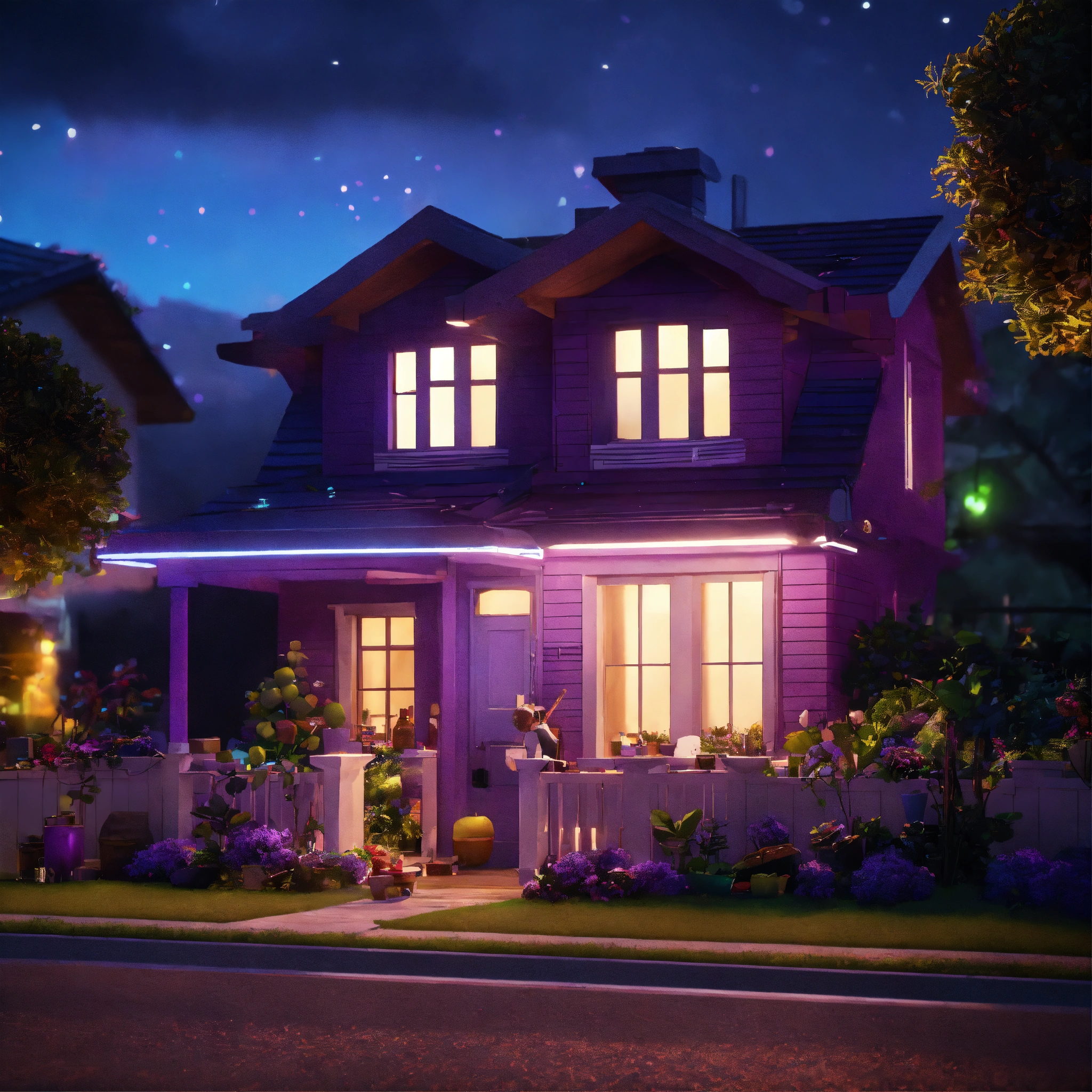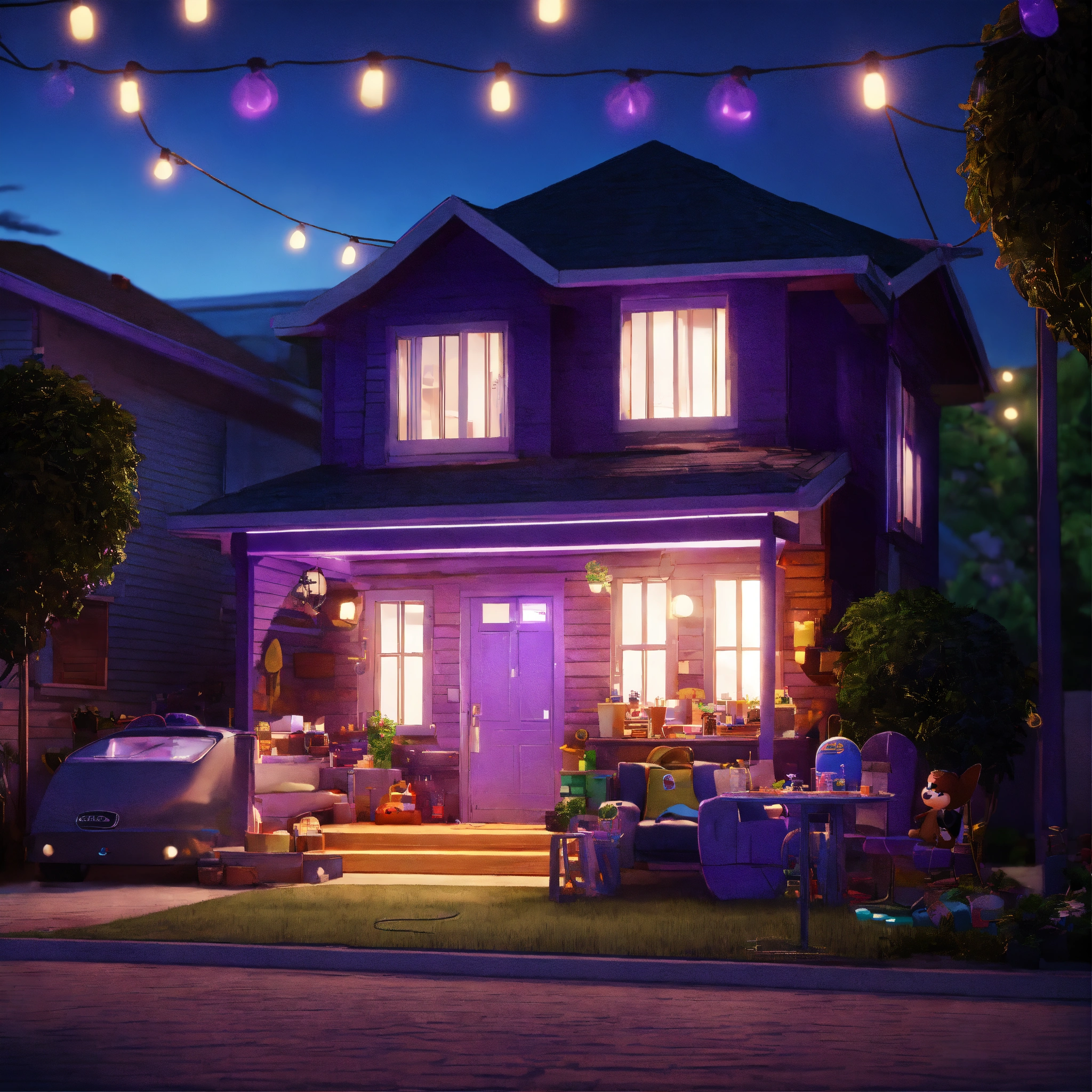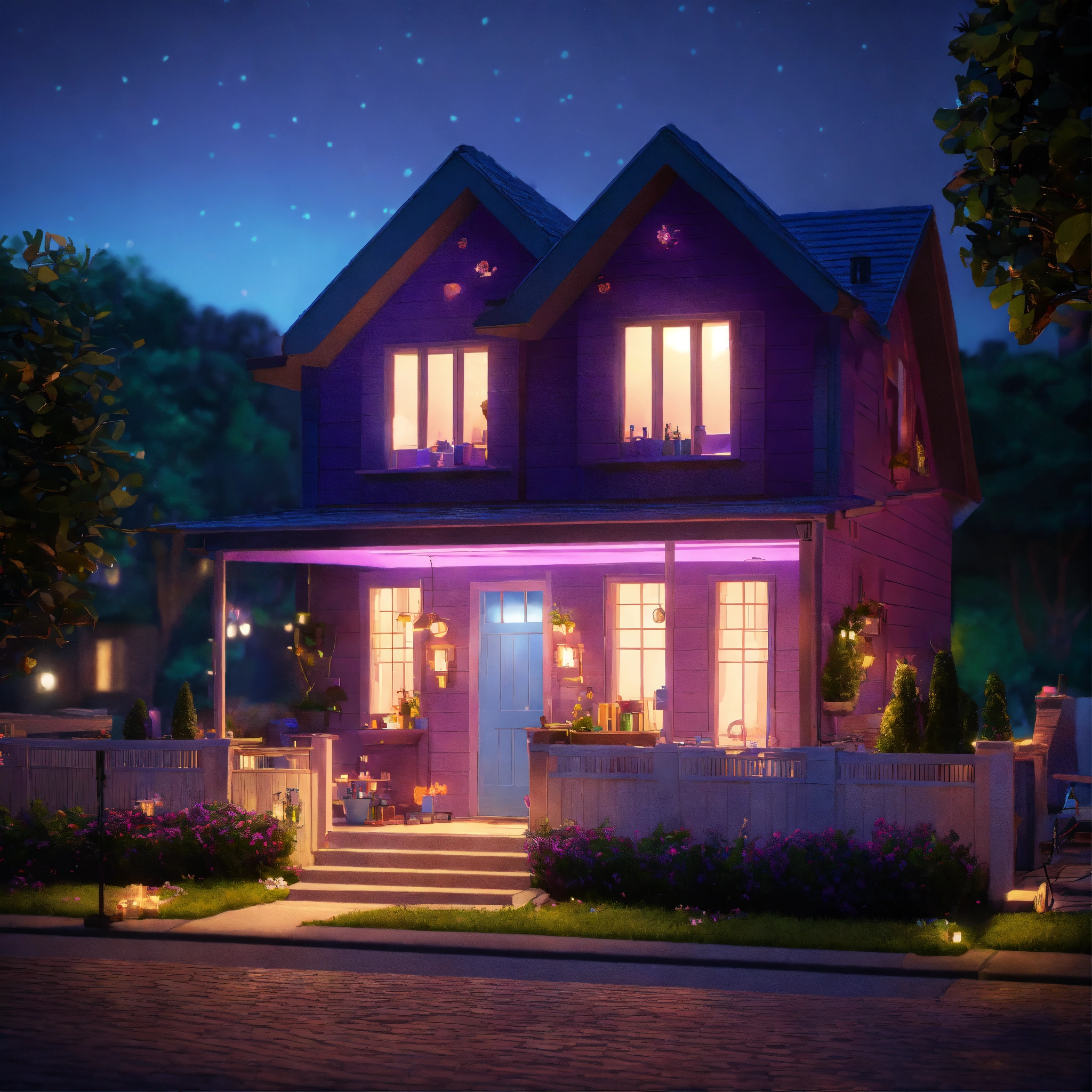 Cgi! pixar style modern home interior, house party, no people, highly detailed, stop motion! purple and blue lighting! nighttime