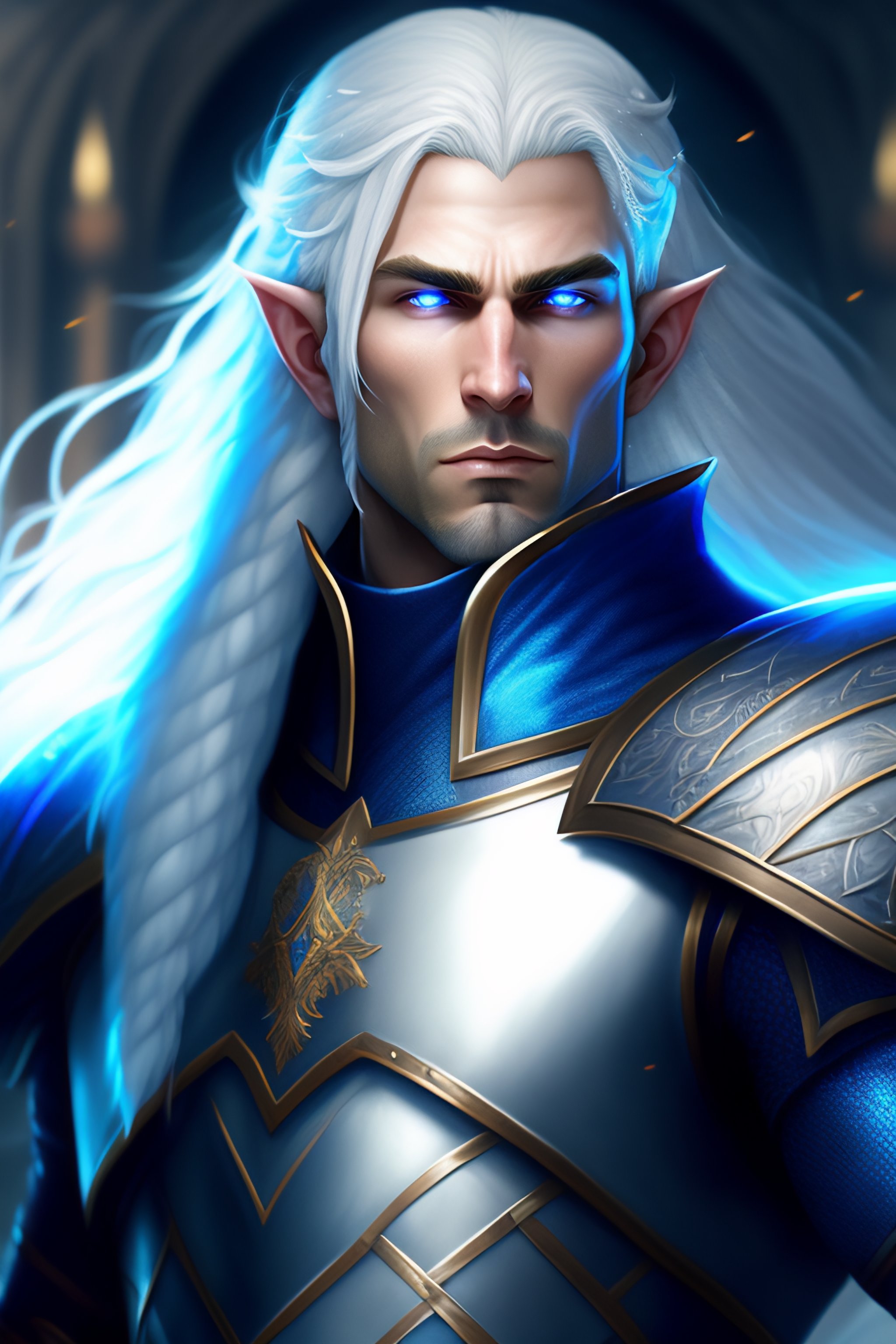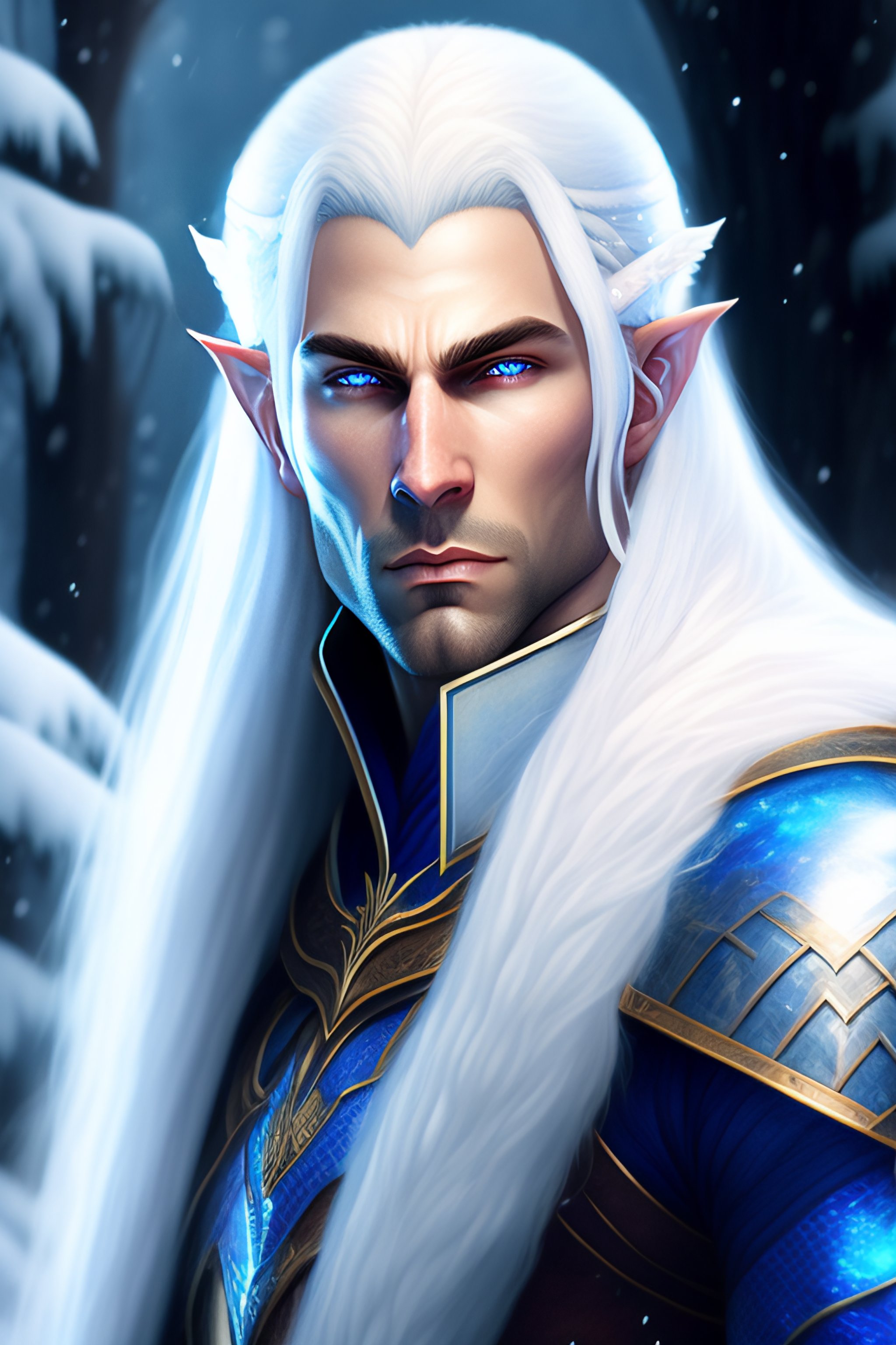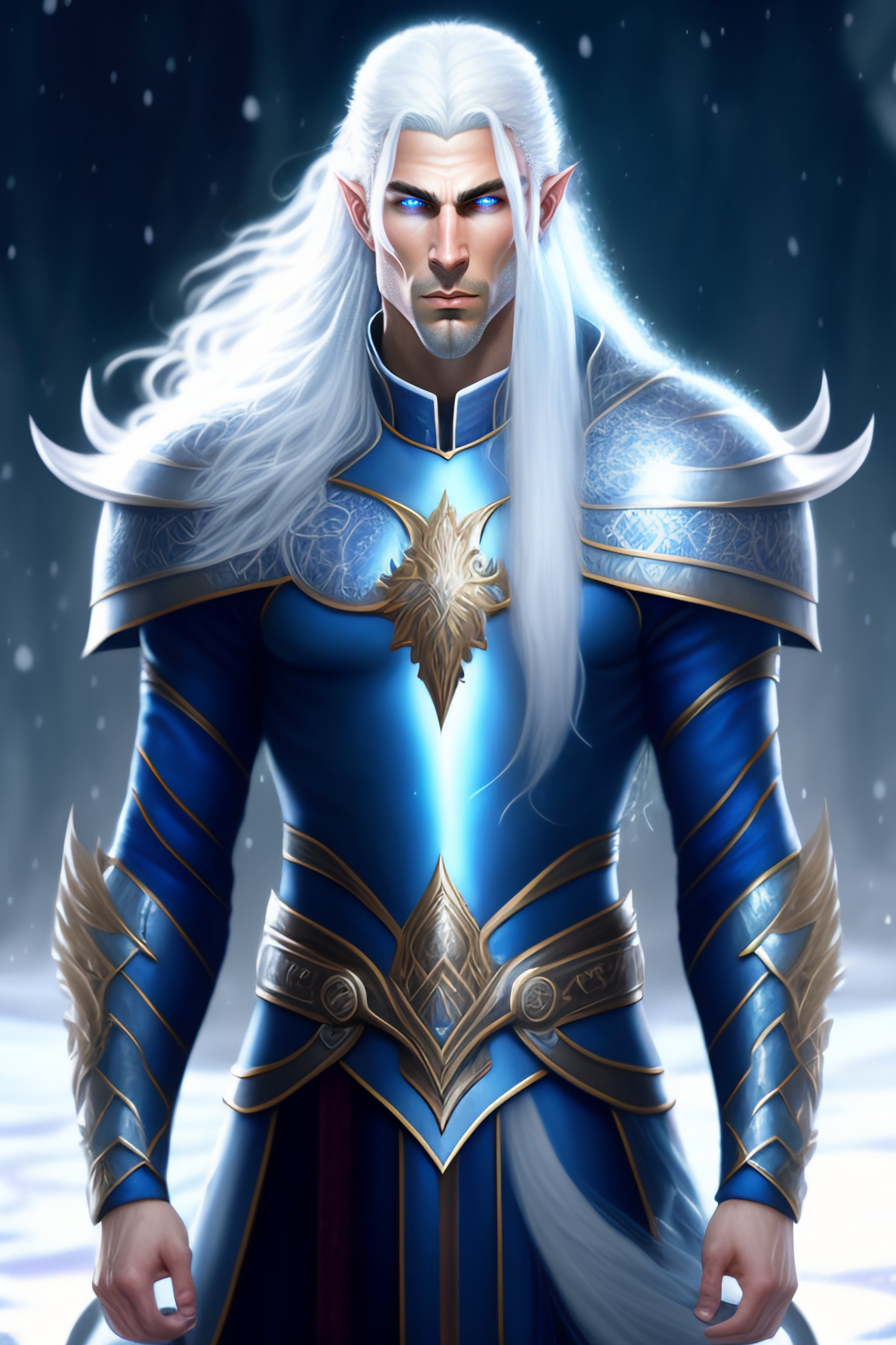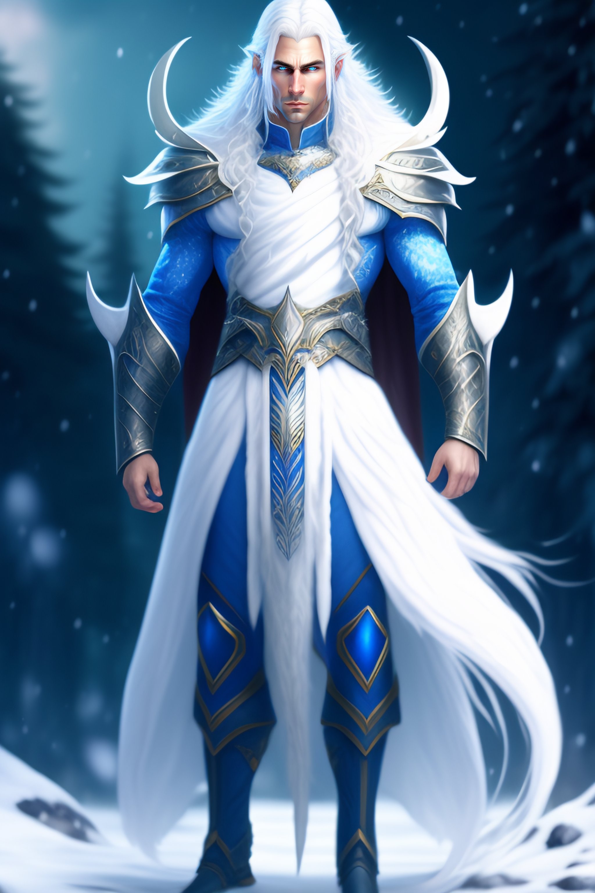 Full body image, 40 year old, pale white skin male elf, with long white hair, snowy background, blue metallic armor, white eyes, digital illustration, gothic color scheme, detailed, cinematic lighting, wide angle action