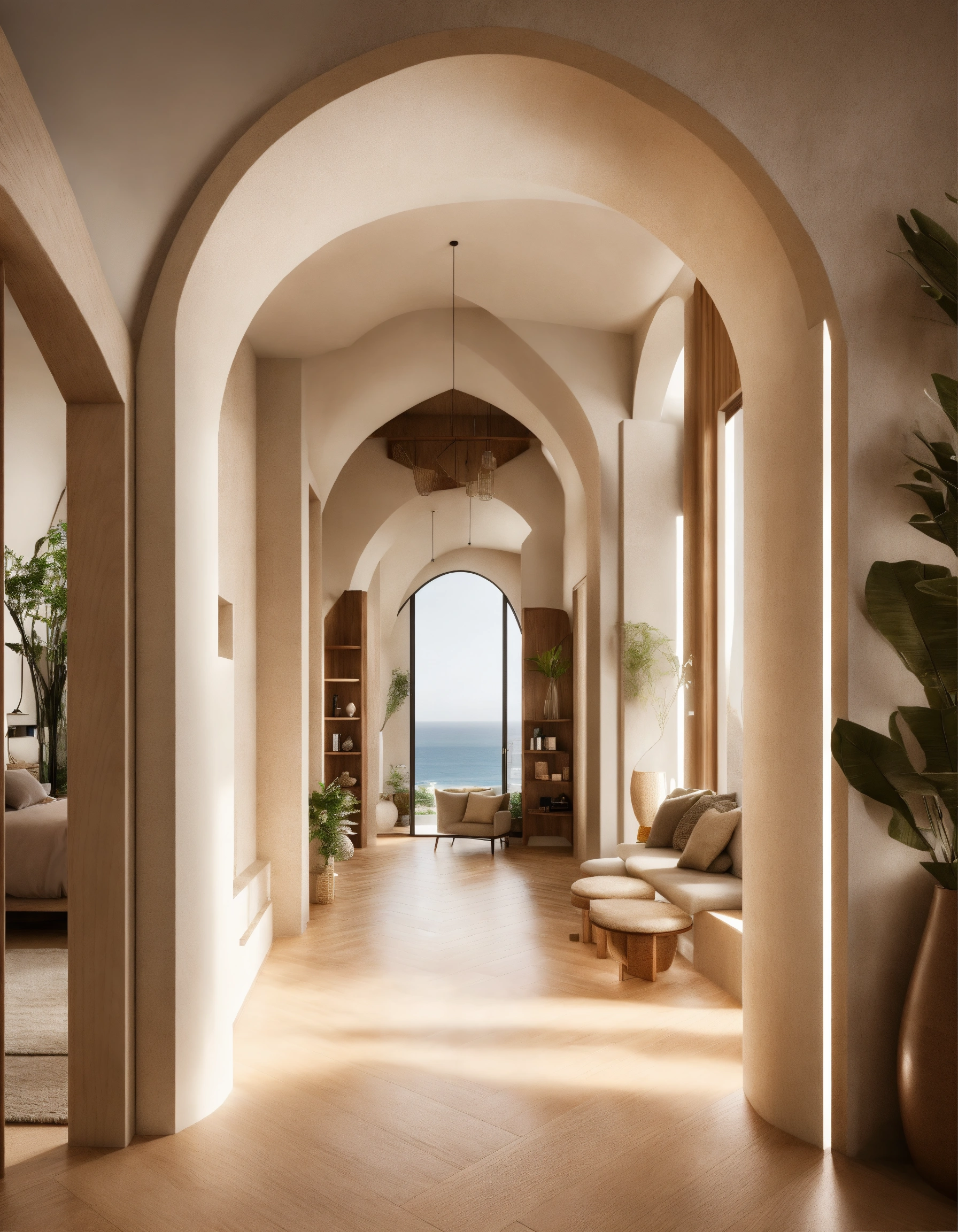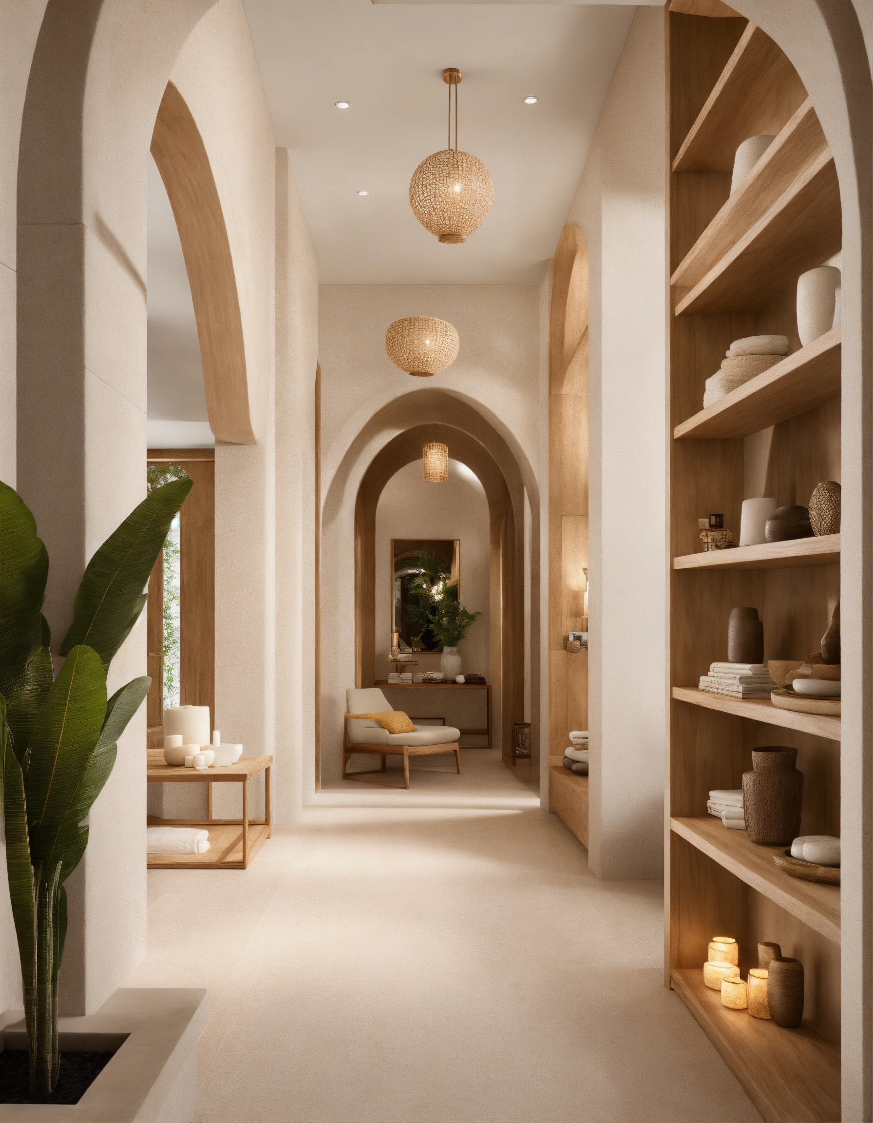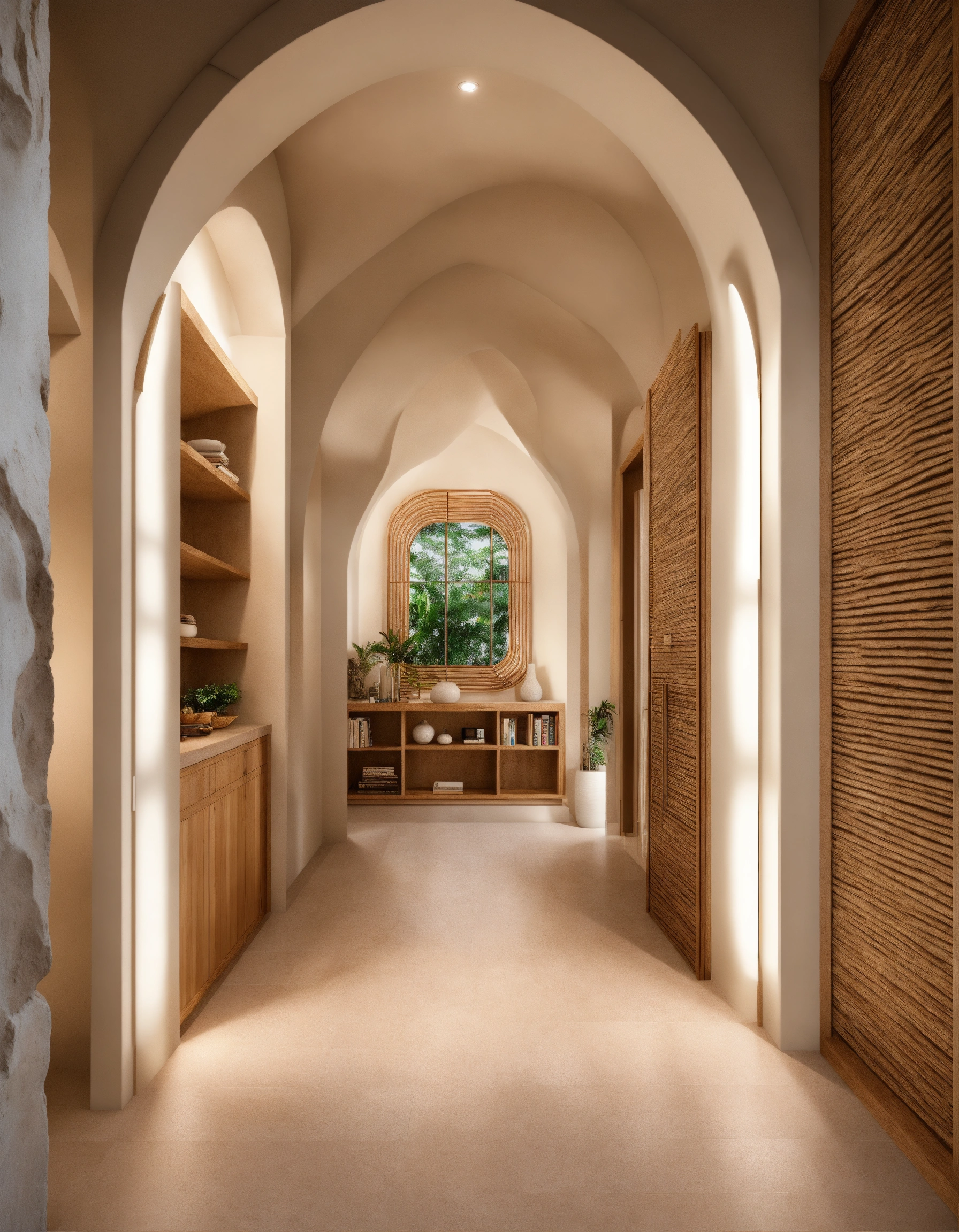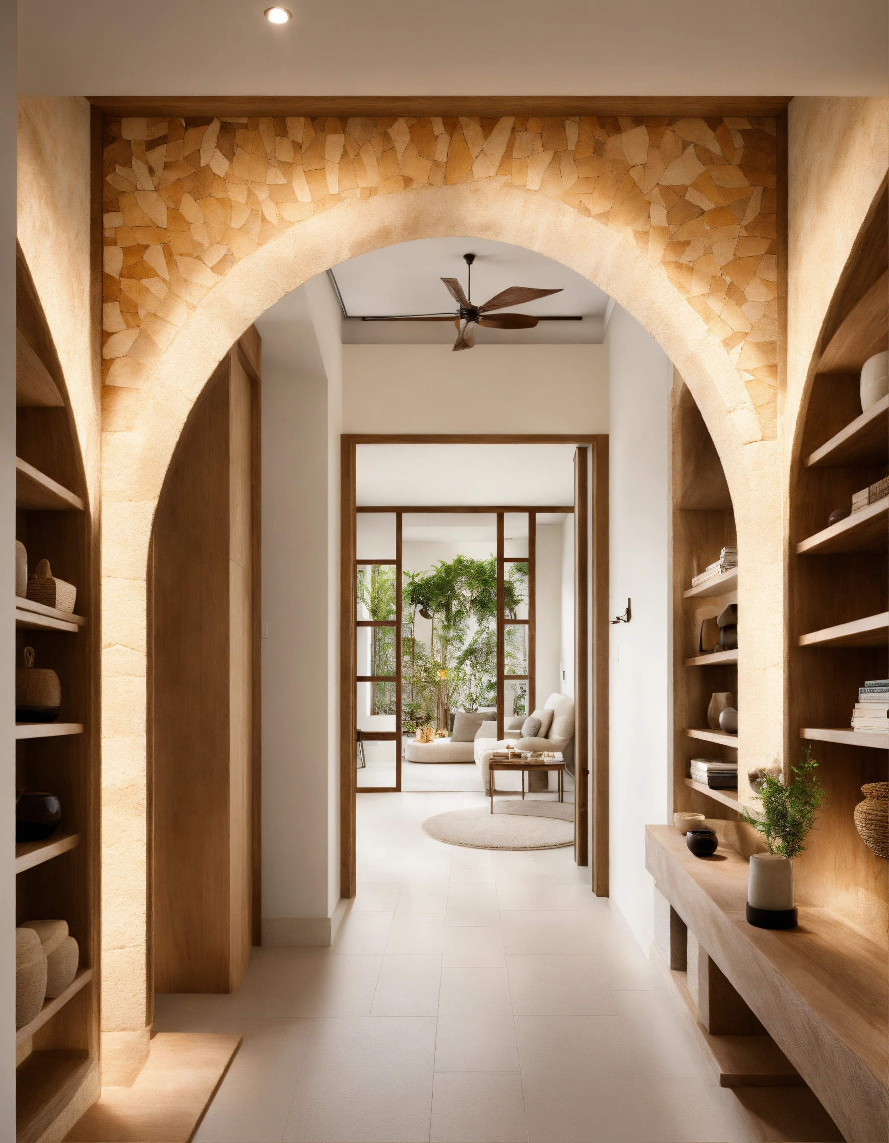 Ultra realistic photo of modern take on upscale bali inspired small condo white cream stone, light wood round arches interor view of hallway with shelving