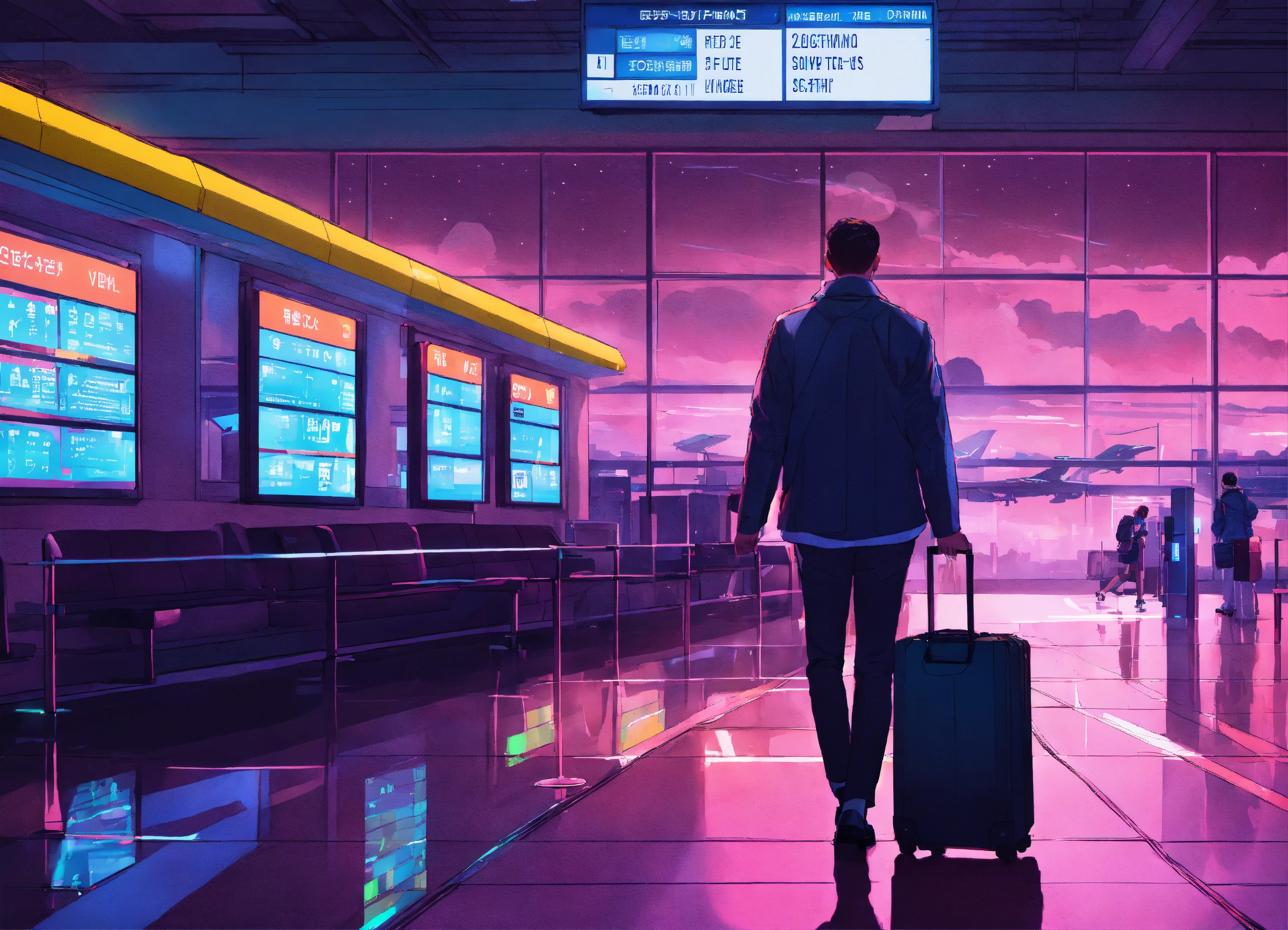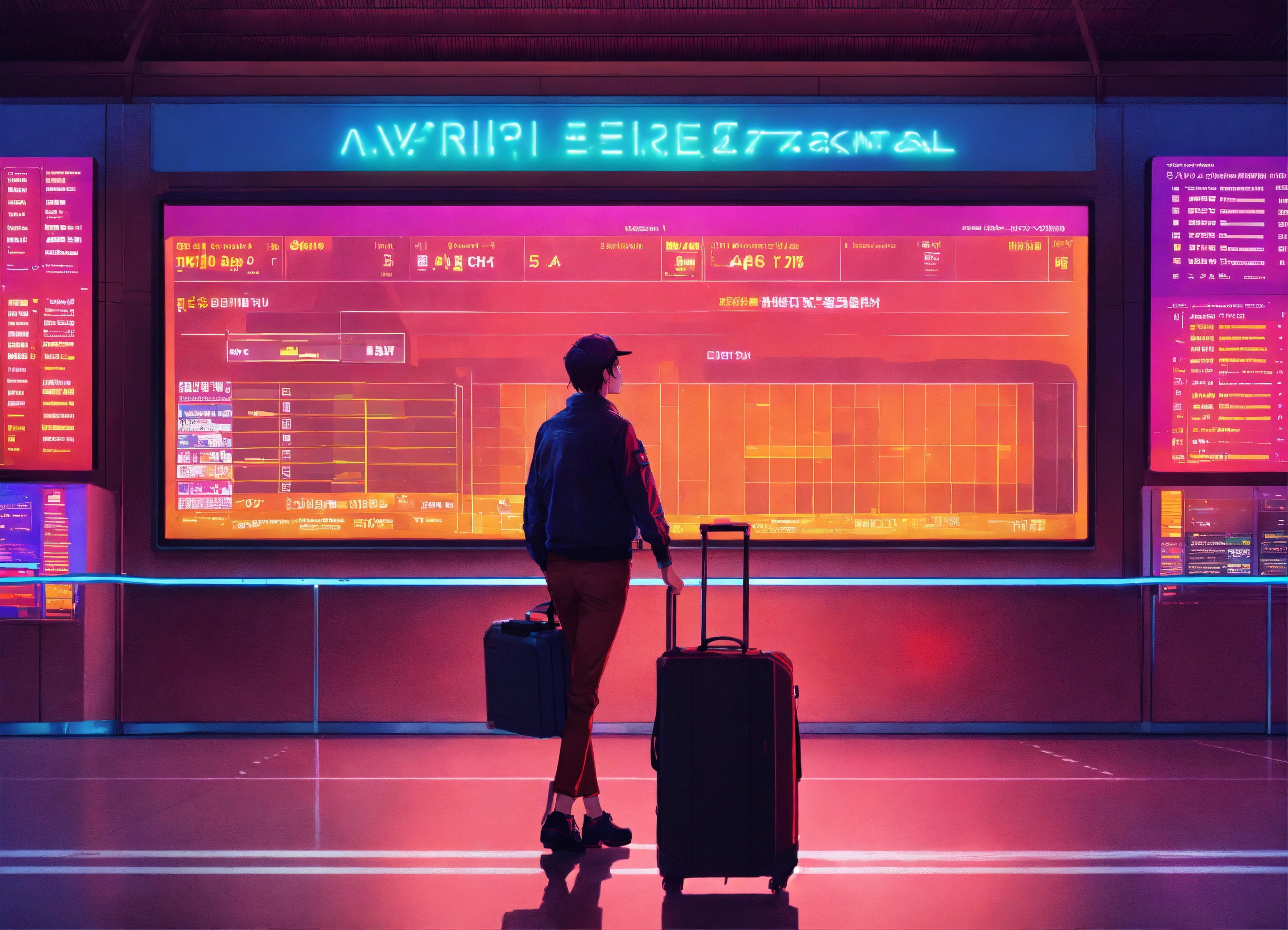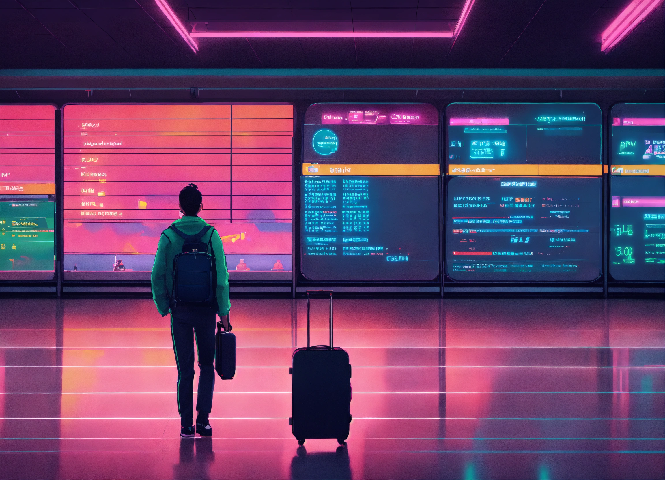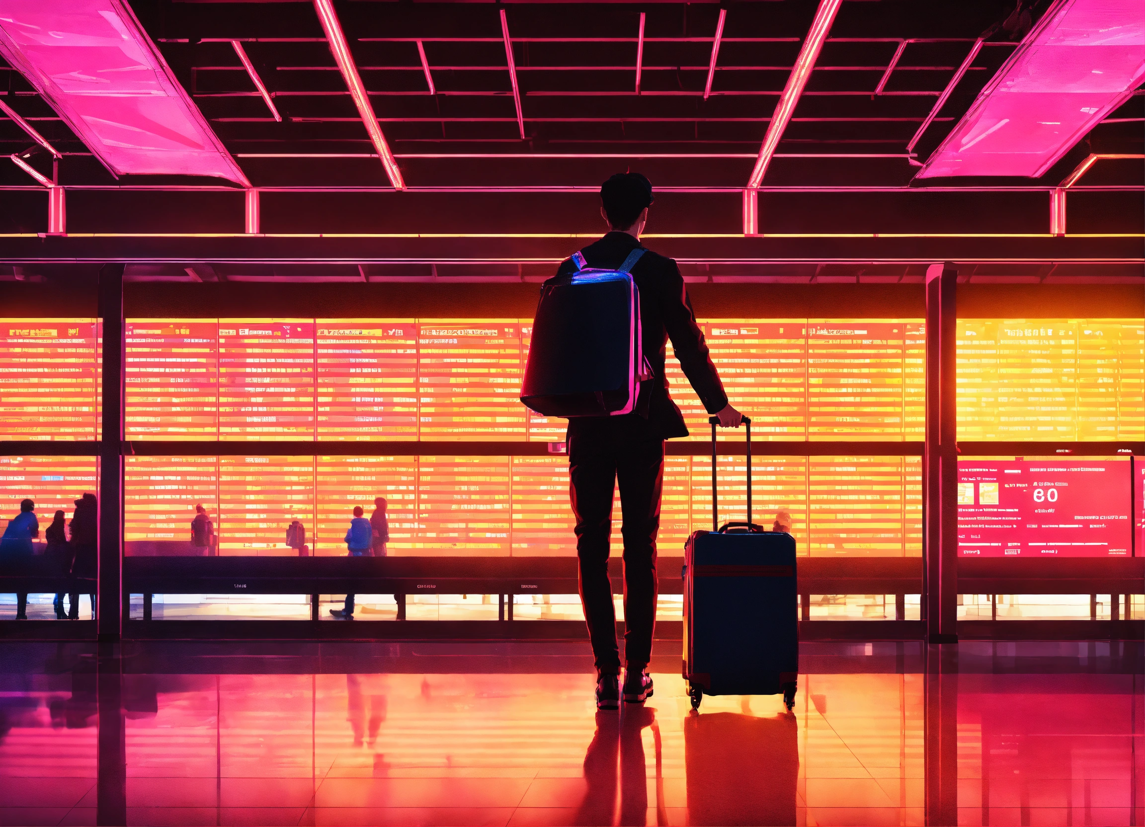 A person with a suitcase at an airport, looking at the departure and arrival screen with neon lights on neon vibes