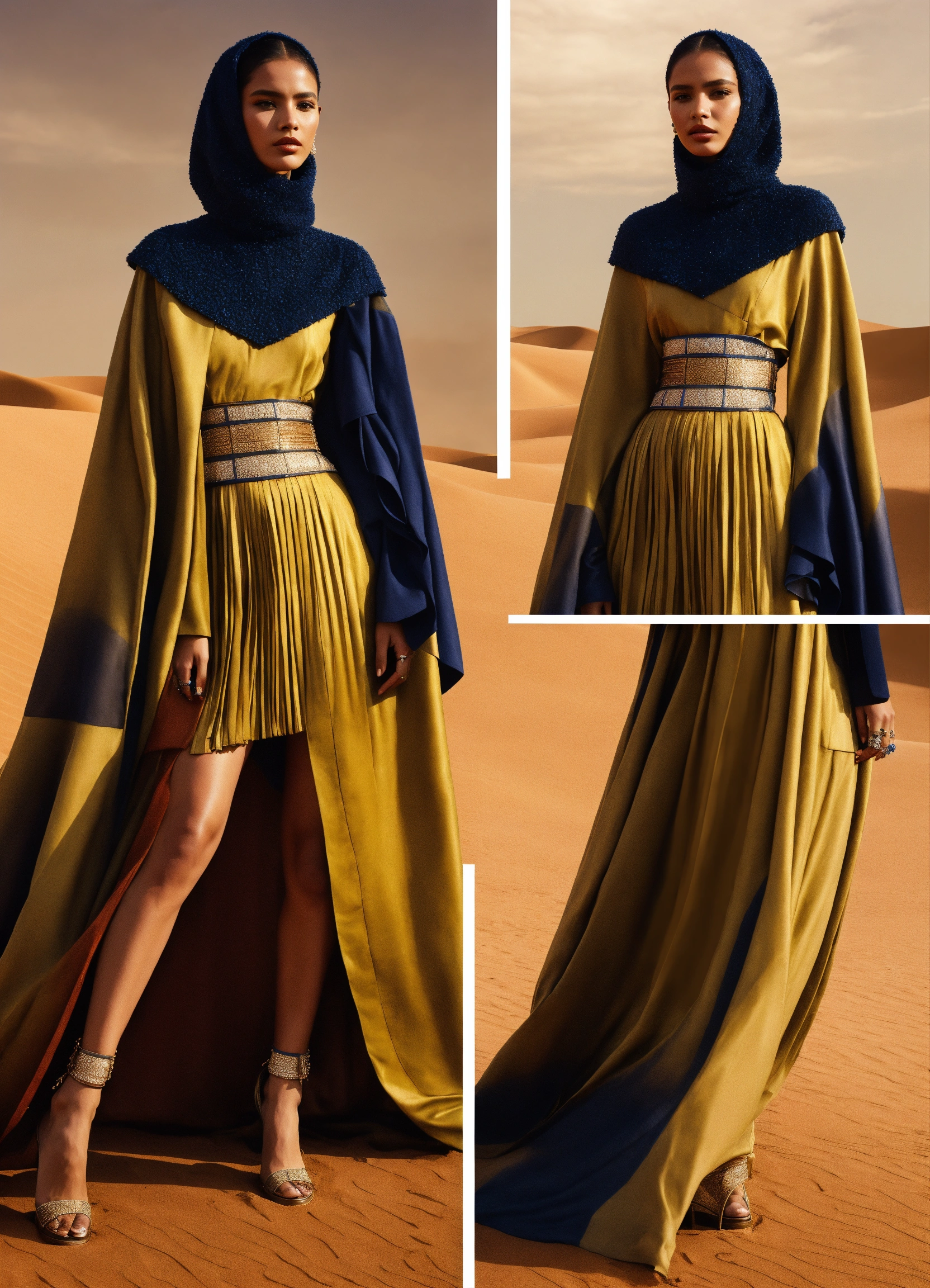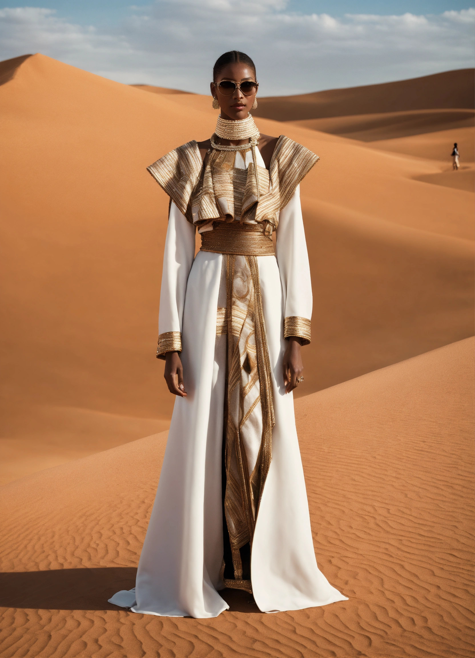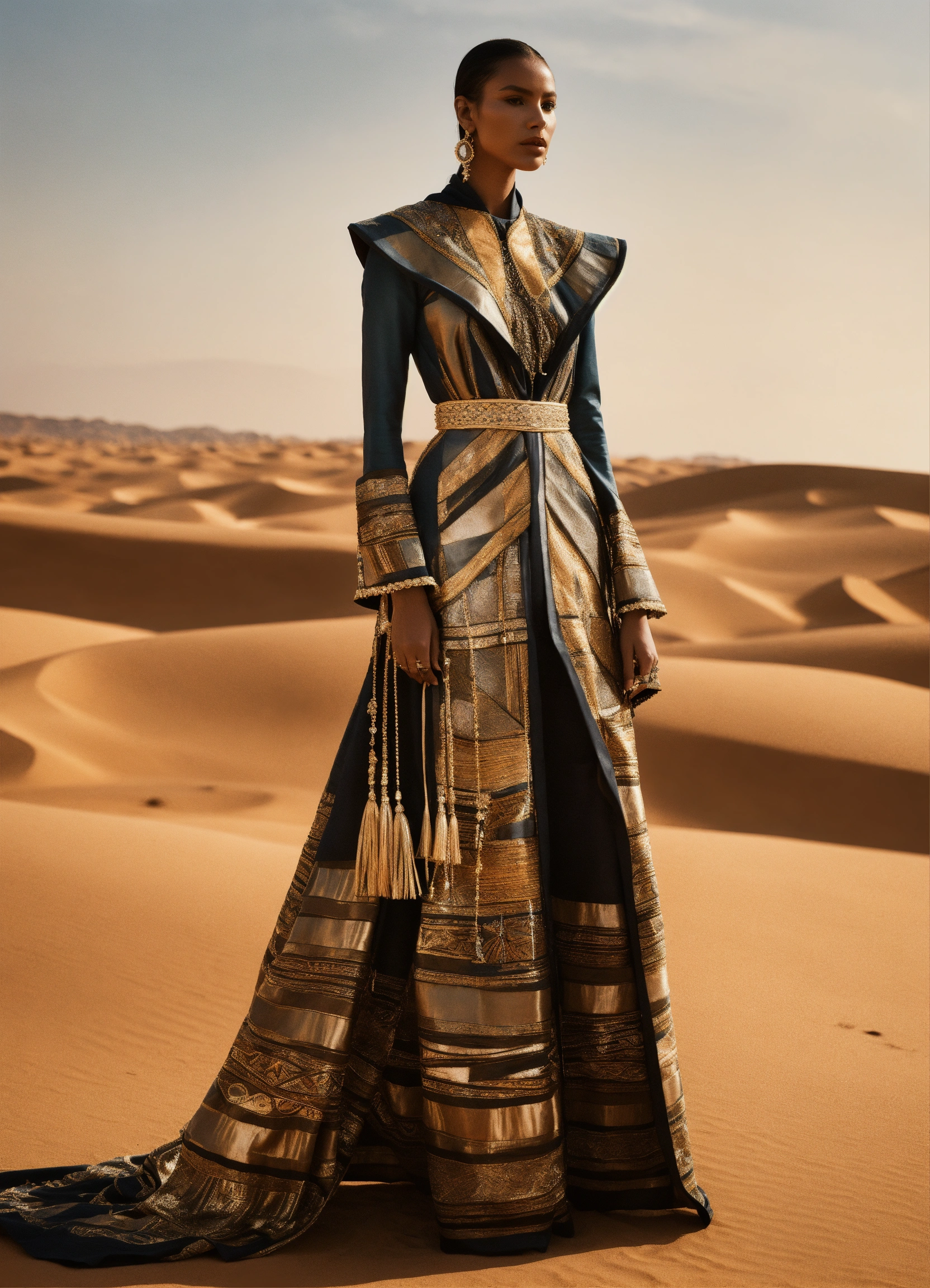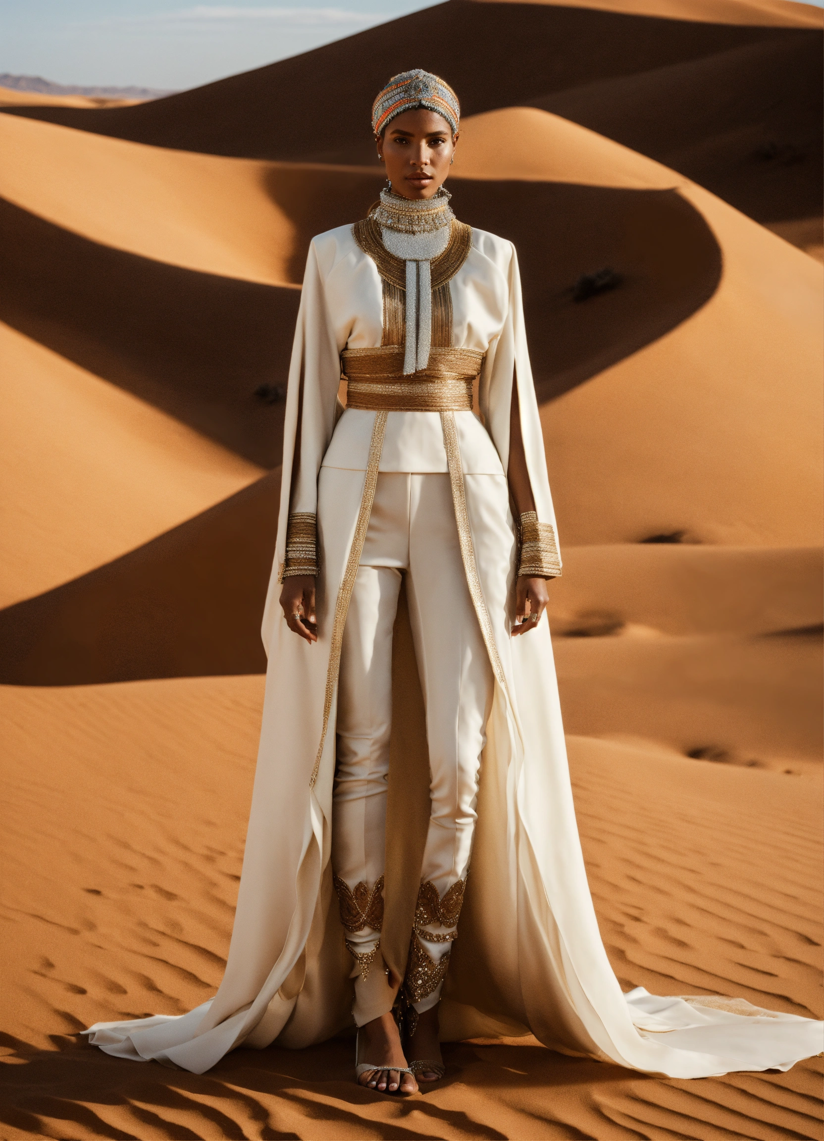 Design a conceptual haute couture outfit for women inspired by the desert and touareg culture