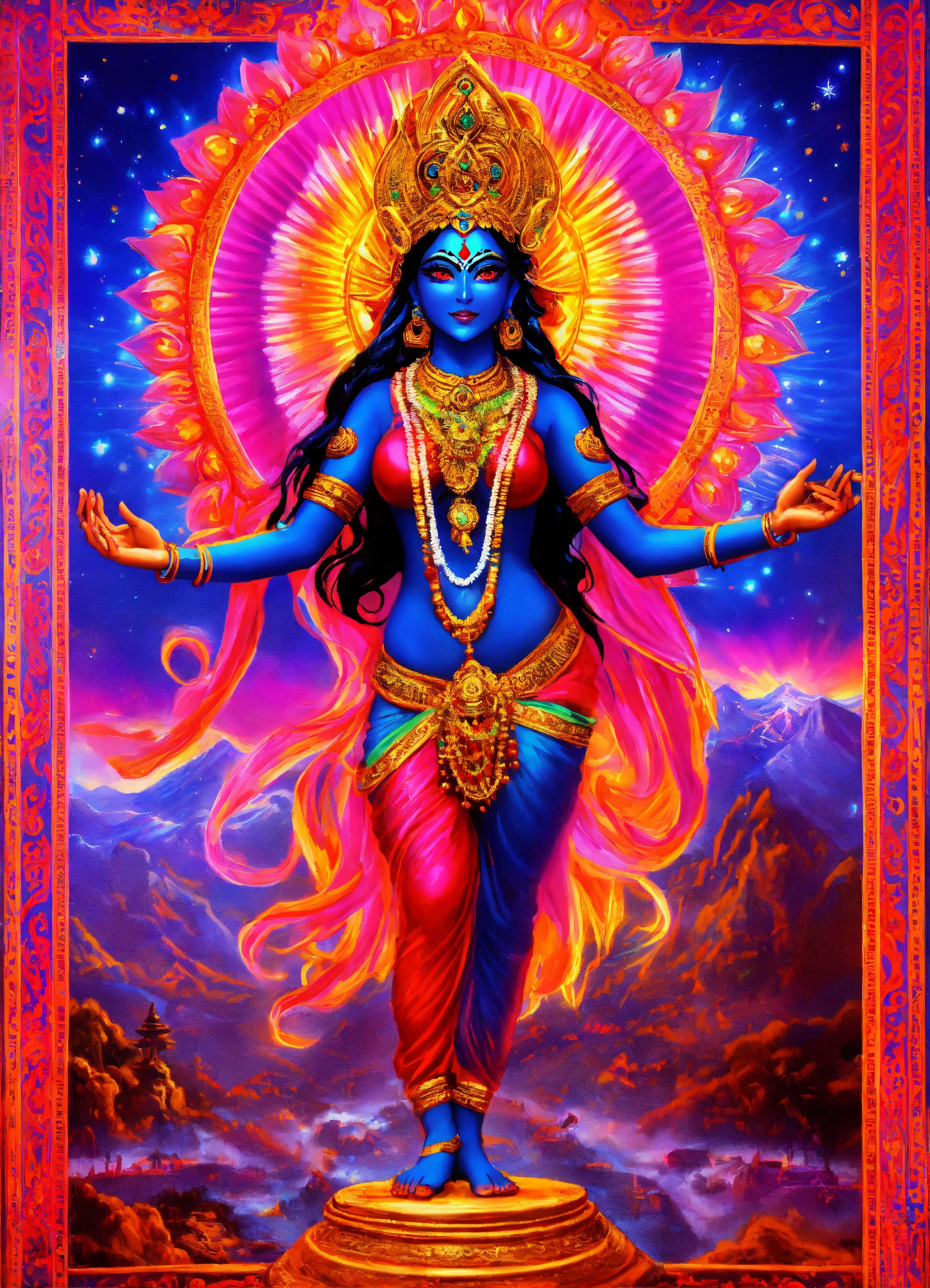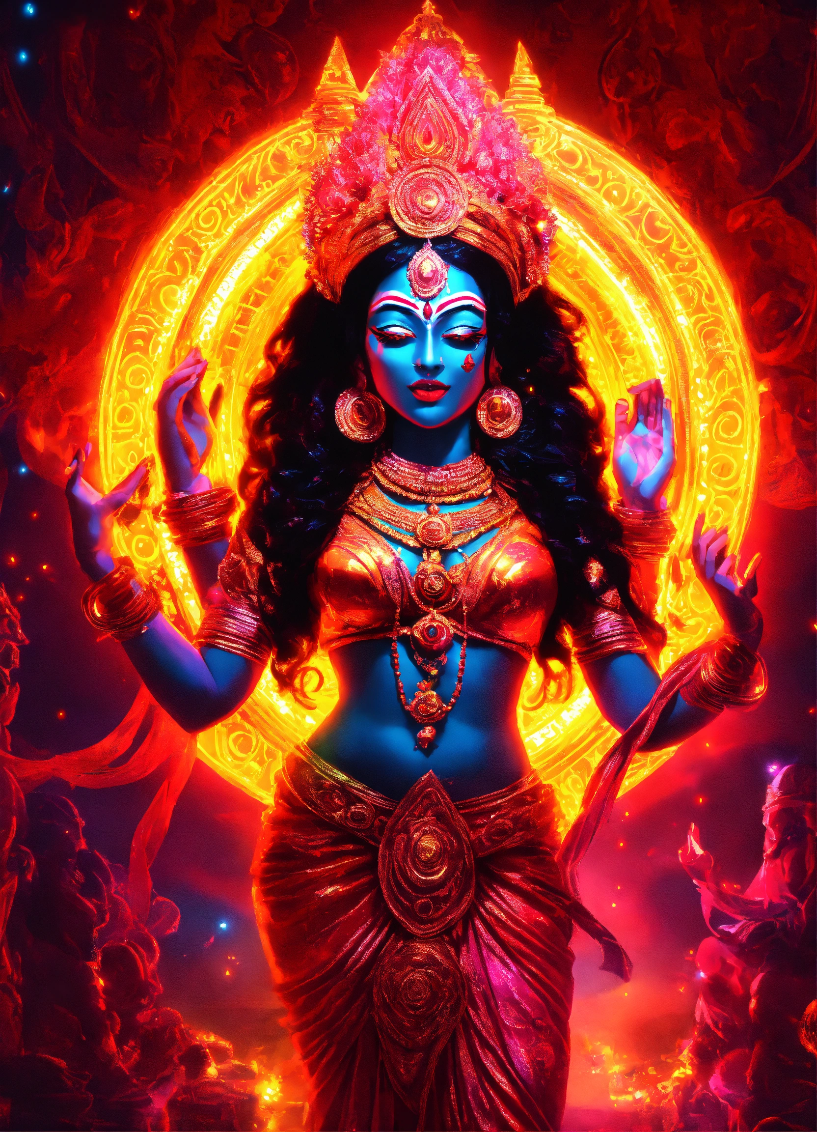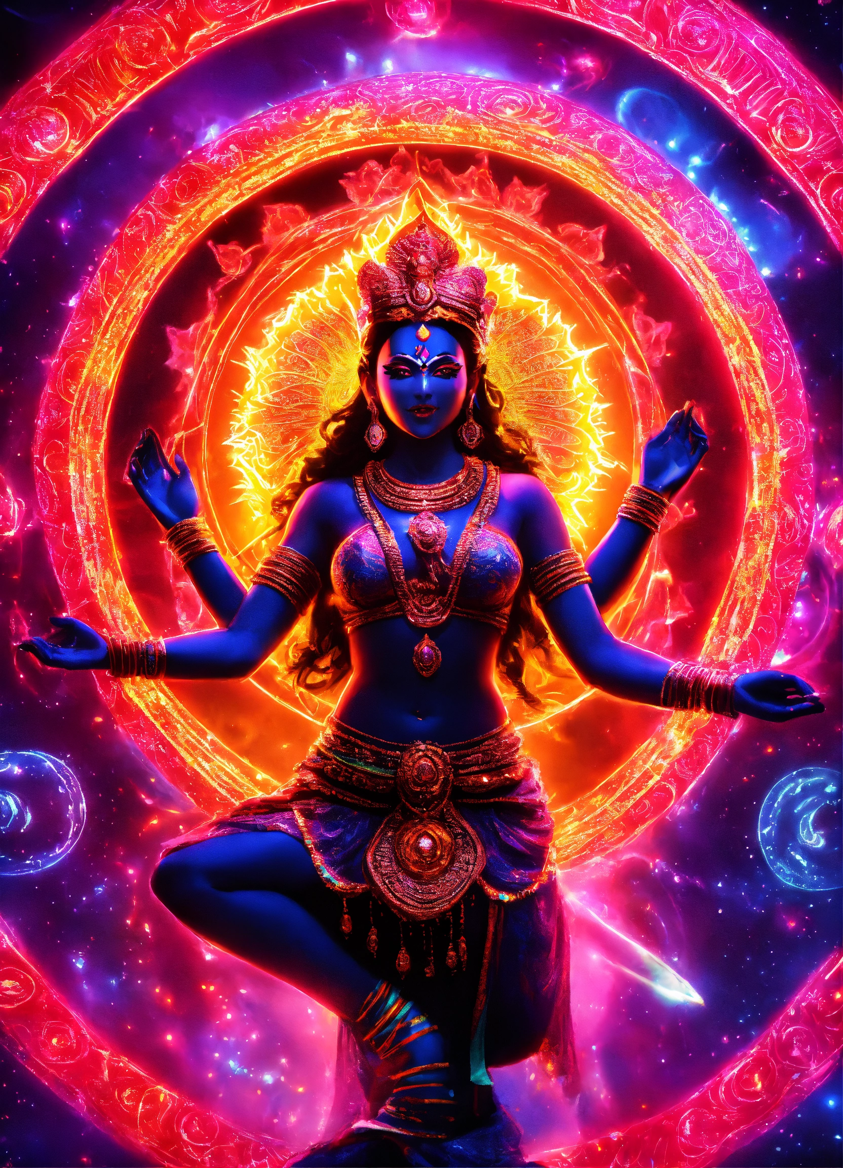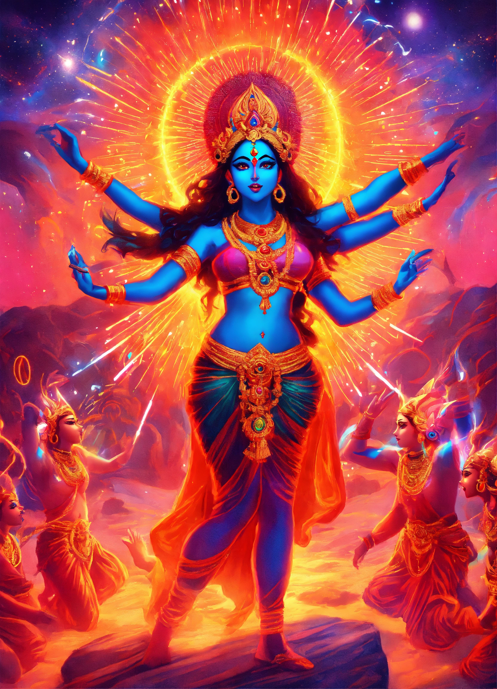 Hindu goddess kali dancing in electric neon gleam with dmt light beings in a celestial realm