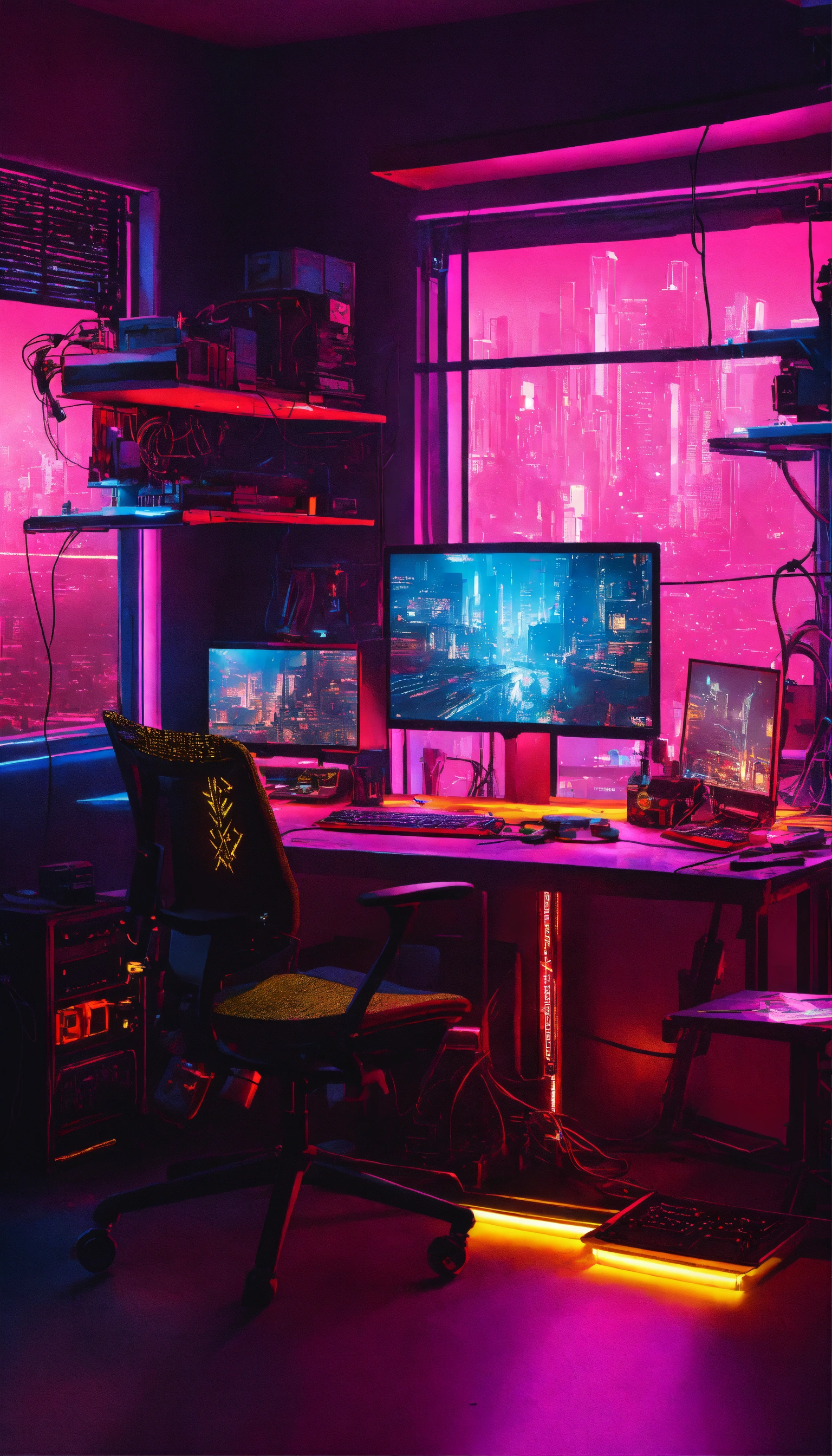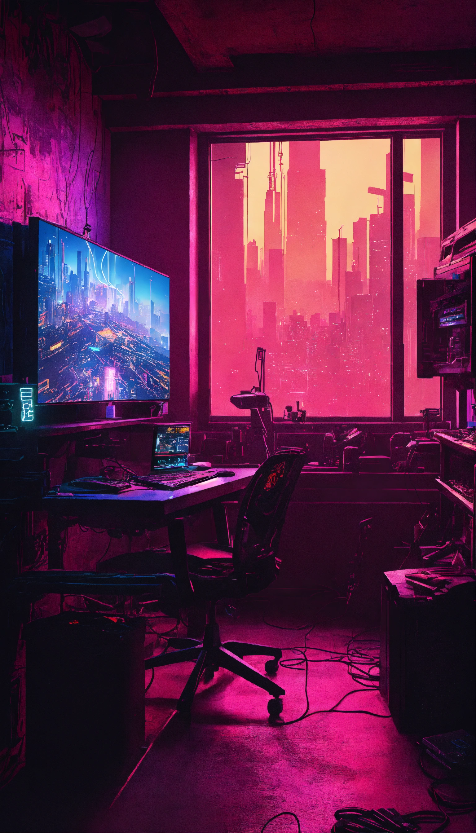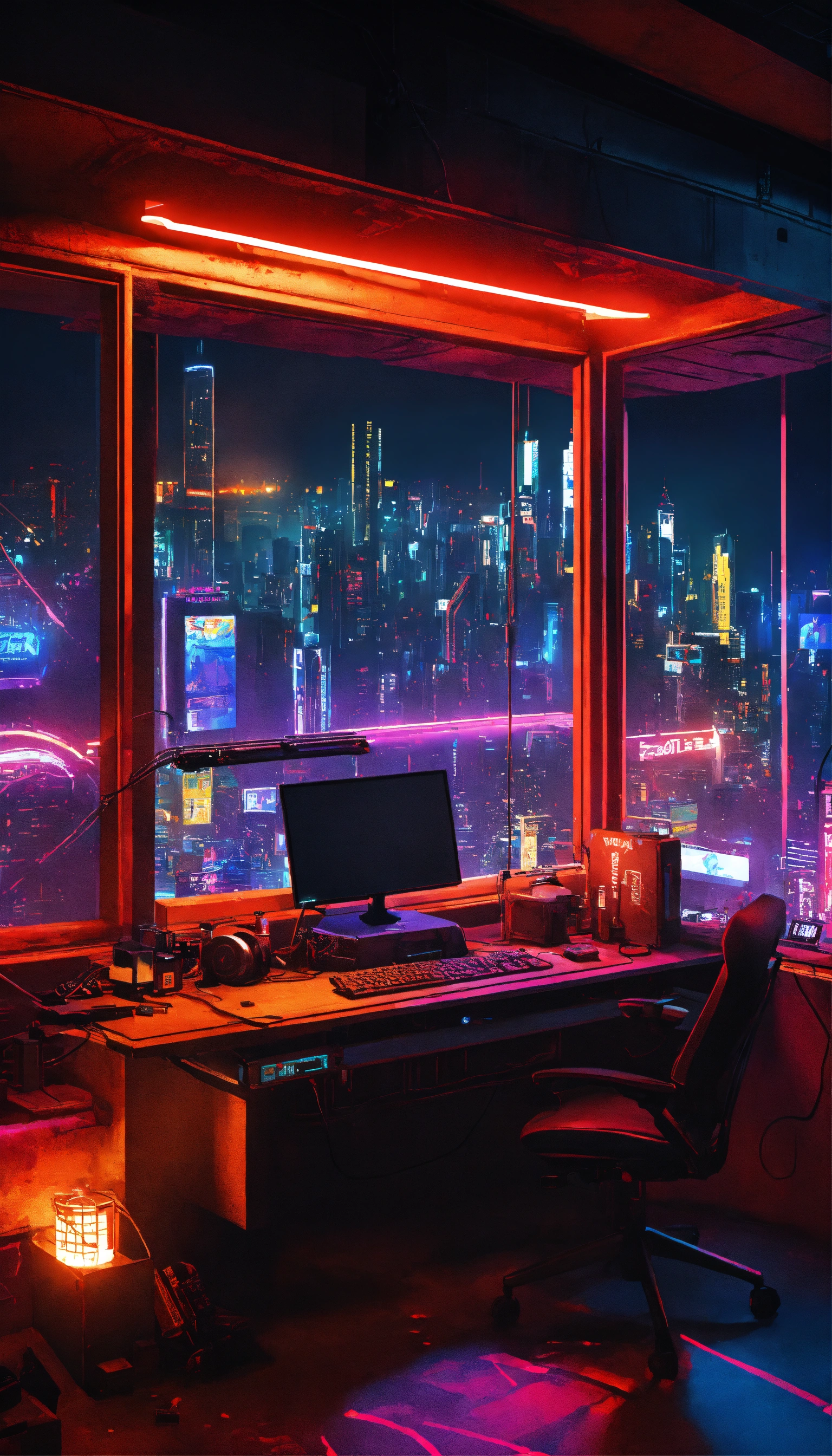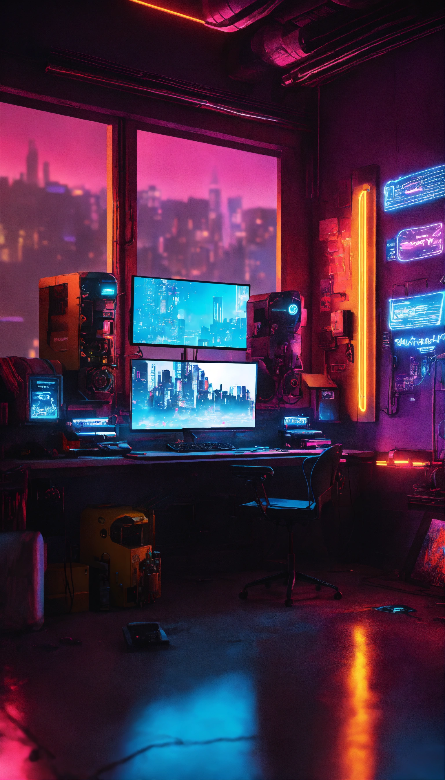 A cyberpunk room with a pc setup that has a stark aesthetic. start with an industrial workbench where an led-lit pc resides, a beacon of neon light creating a mix of shadows and brightness. project screens hover in the air as cutting-edge tech, while gritty graffiti decals pepper the walls to set the gritty urban mood. for more immersion, position a wall-sized poster of a cyberpunk cityscape to mimic a window view, amplifying the futuristic feel. play with the contrasts of neon lights and deep shadows to hit the perfect striking cyberpunk atmosphere. cityscape for your window view. remember, focus on rich details, and play with light and shadow to enhance the atmosphere.