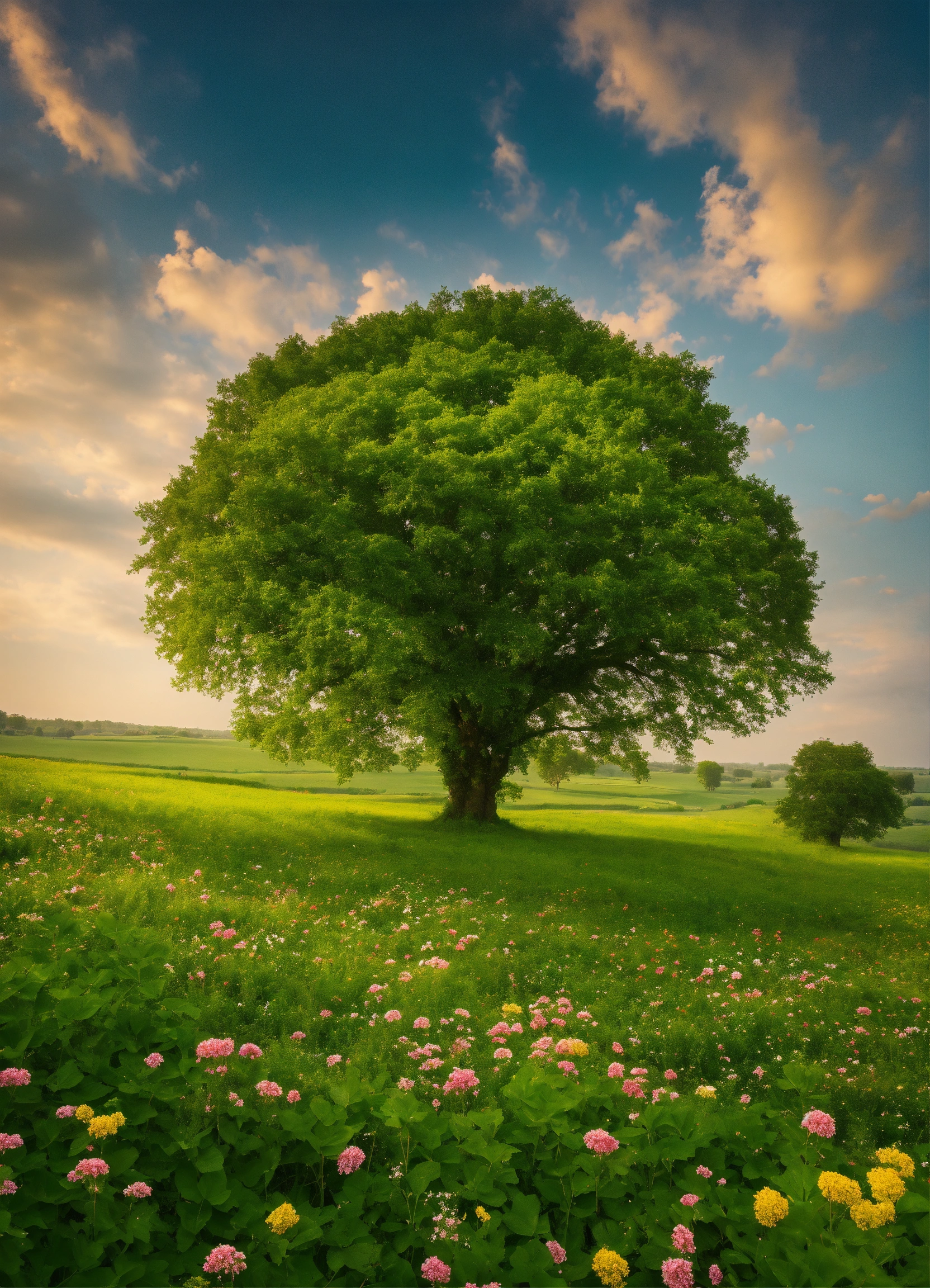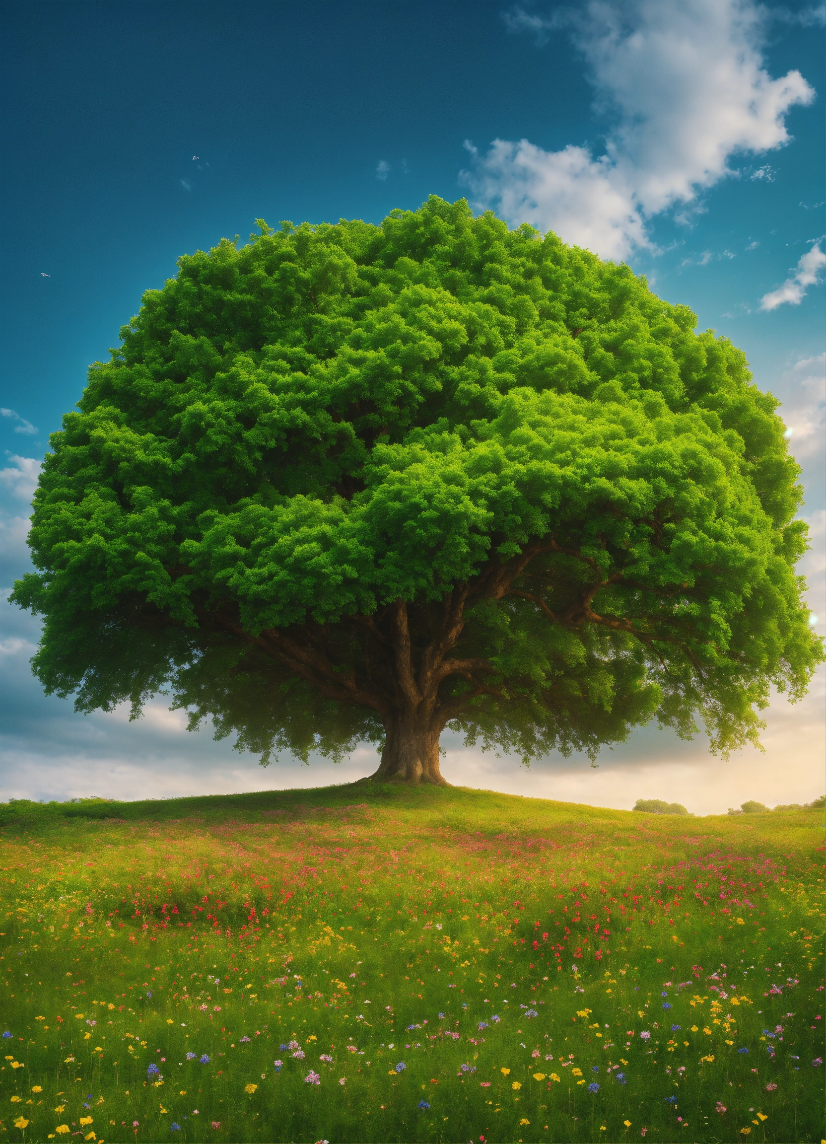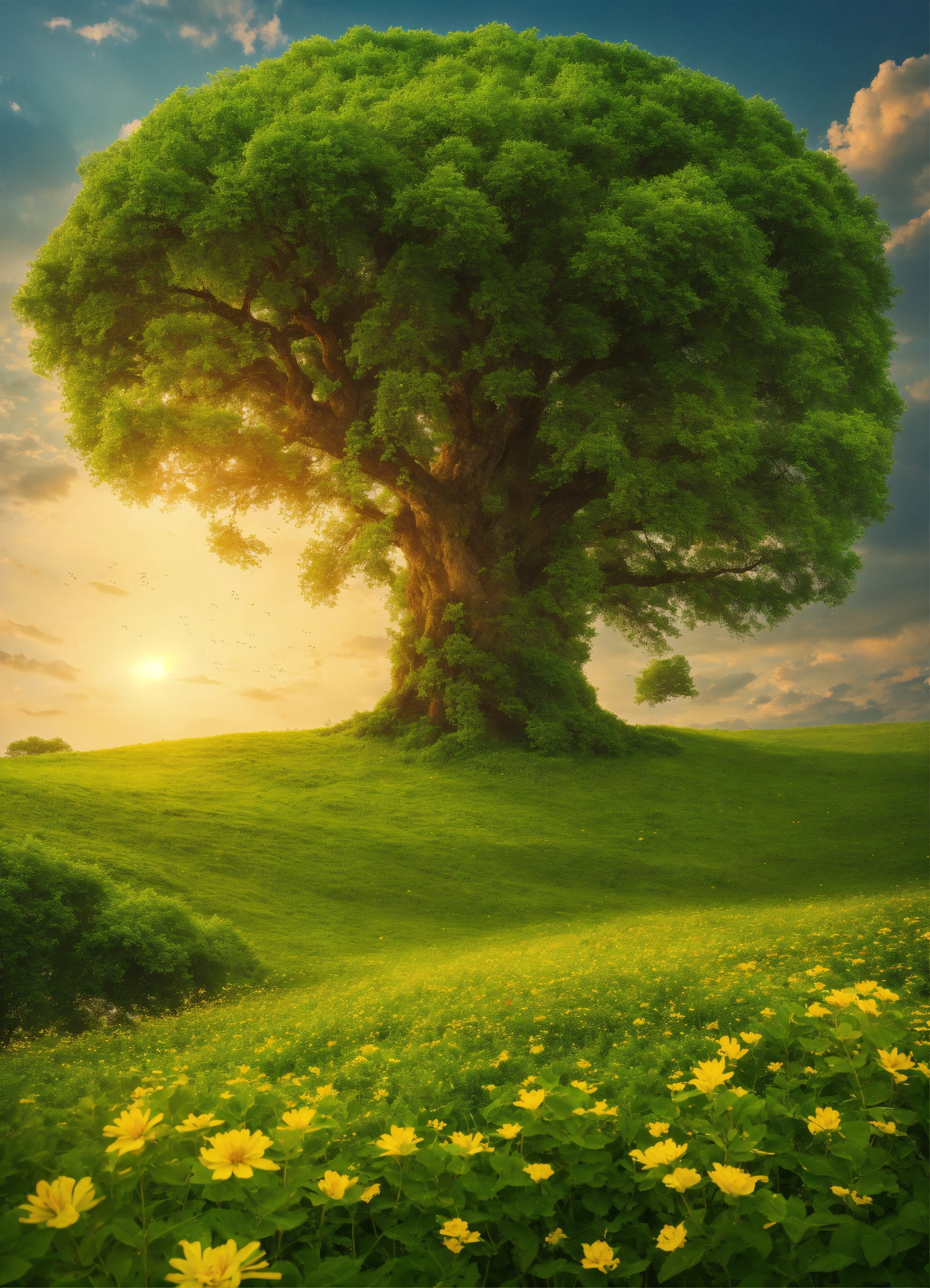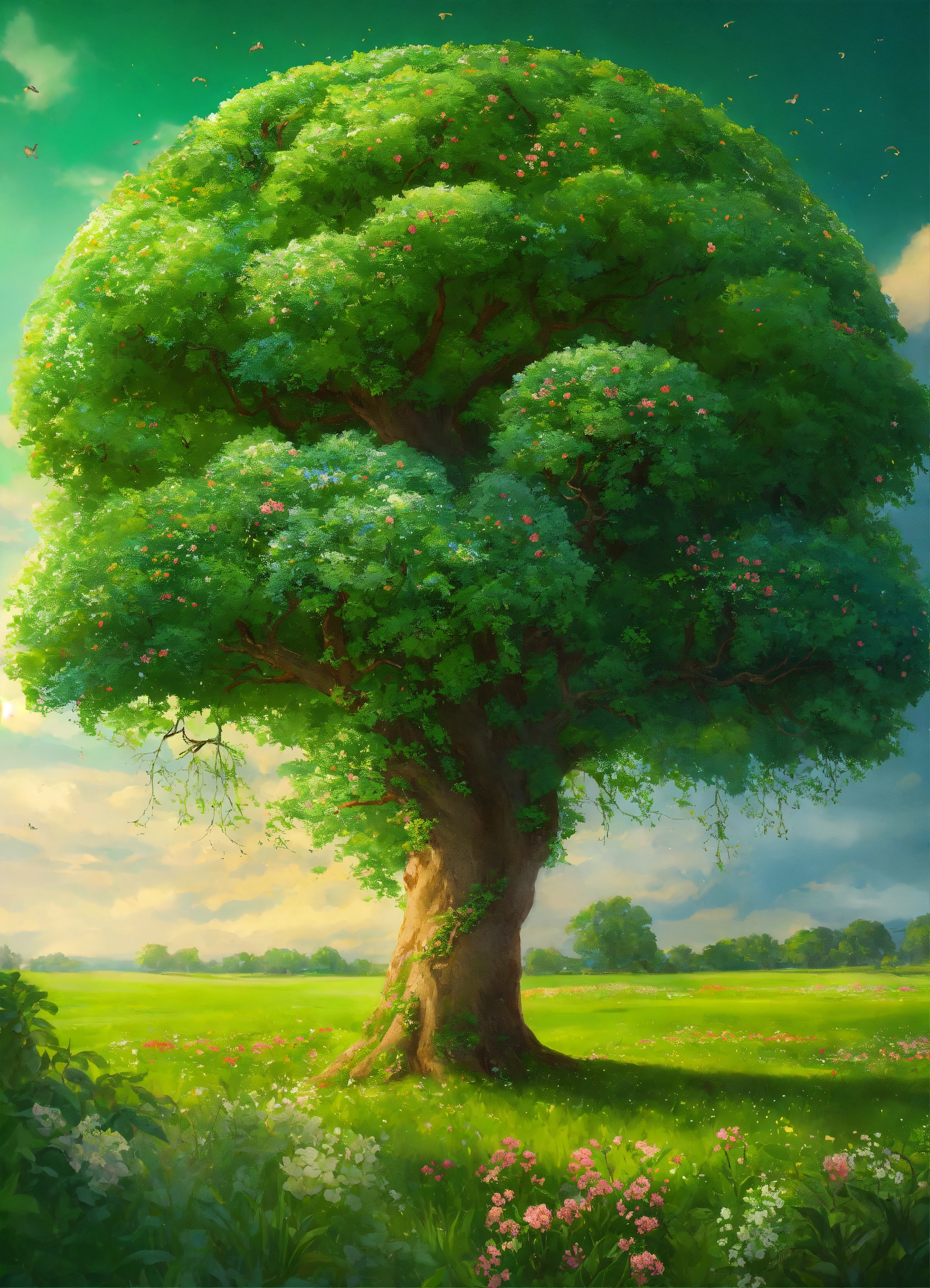 Massive lush green field with clusters of flowers throguhout, with massive tree of life, beautiful suuny sky