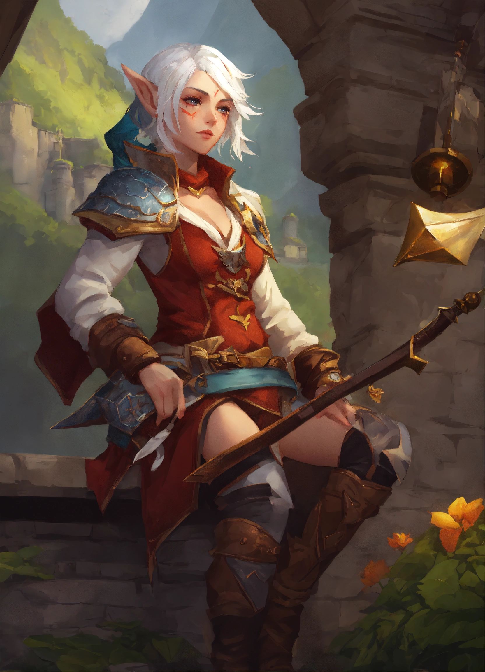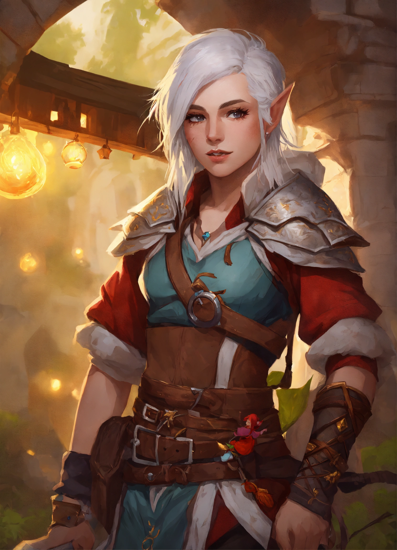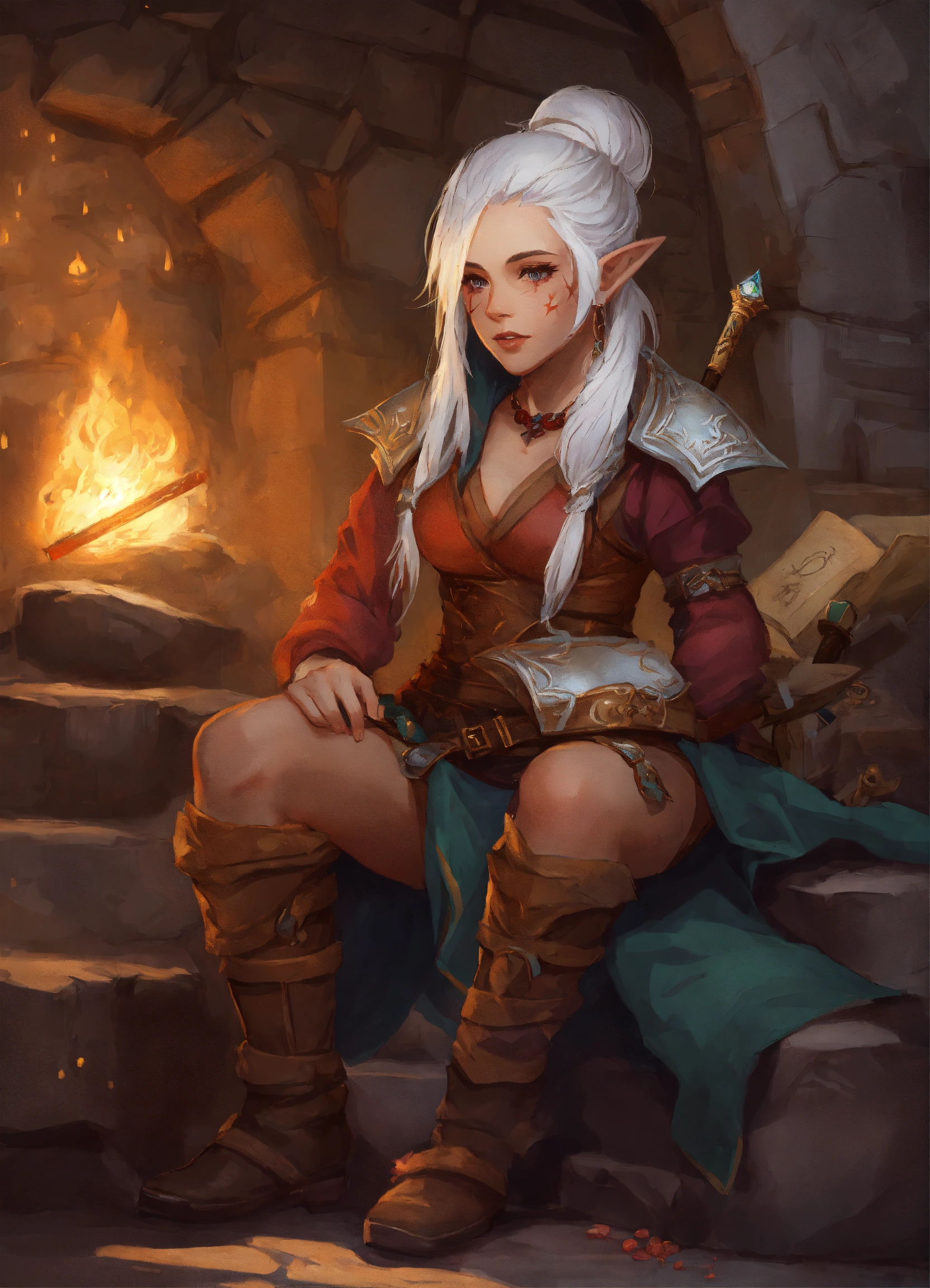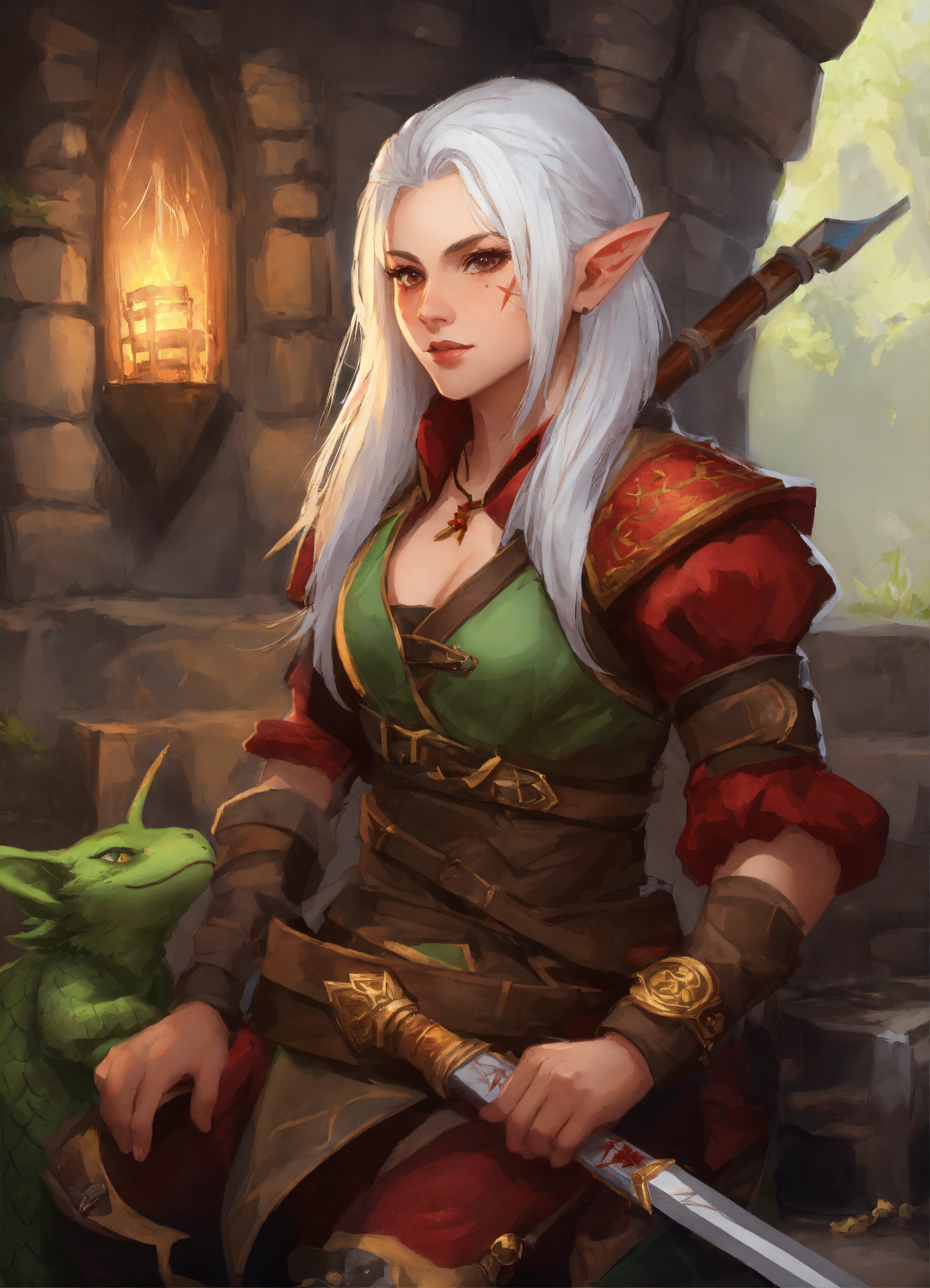 Donjon and dragon female gnome bard with white hair and a luth and a scar on his face