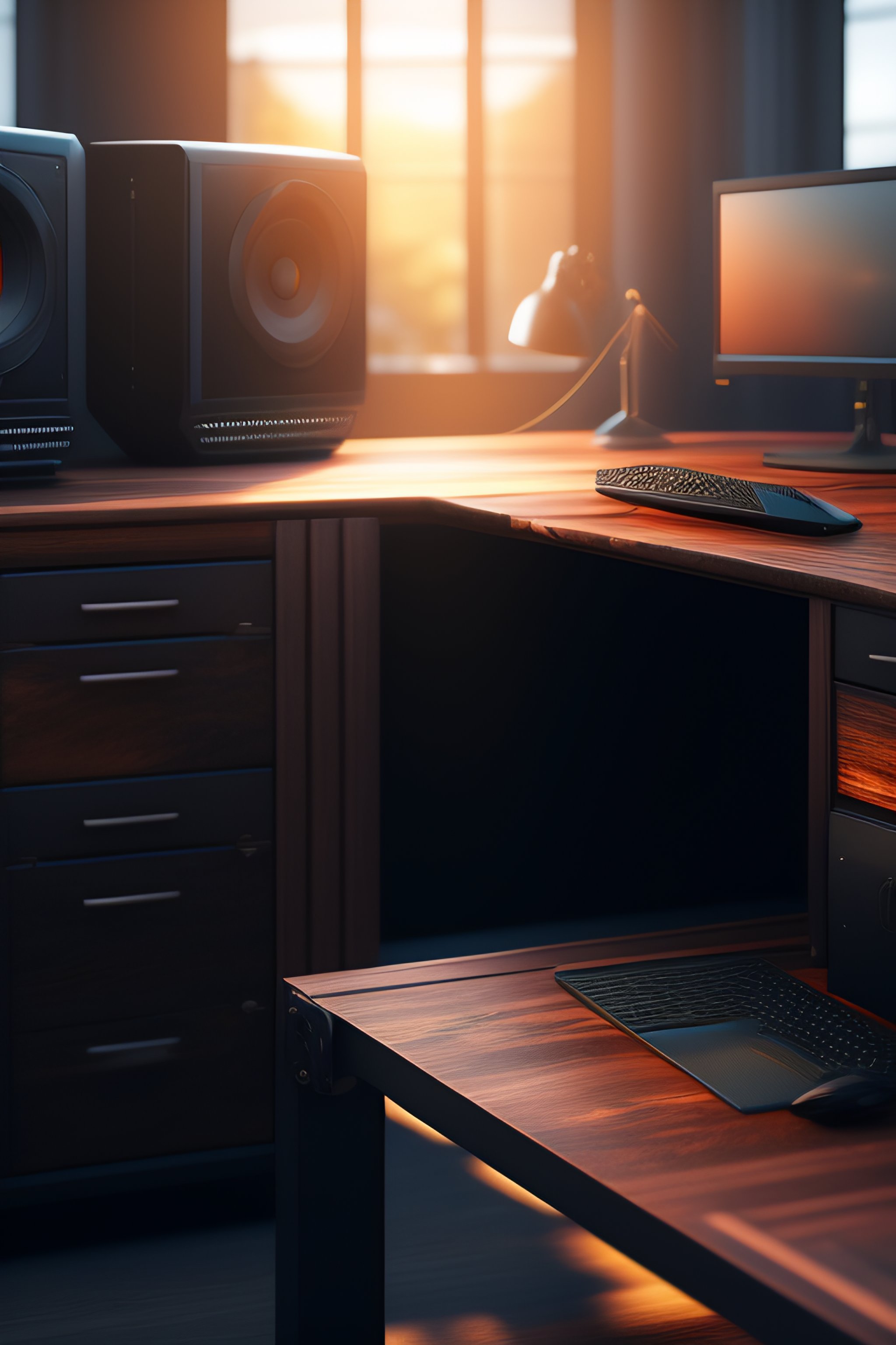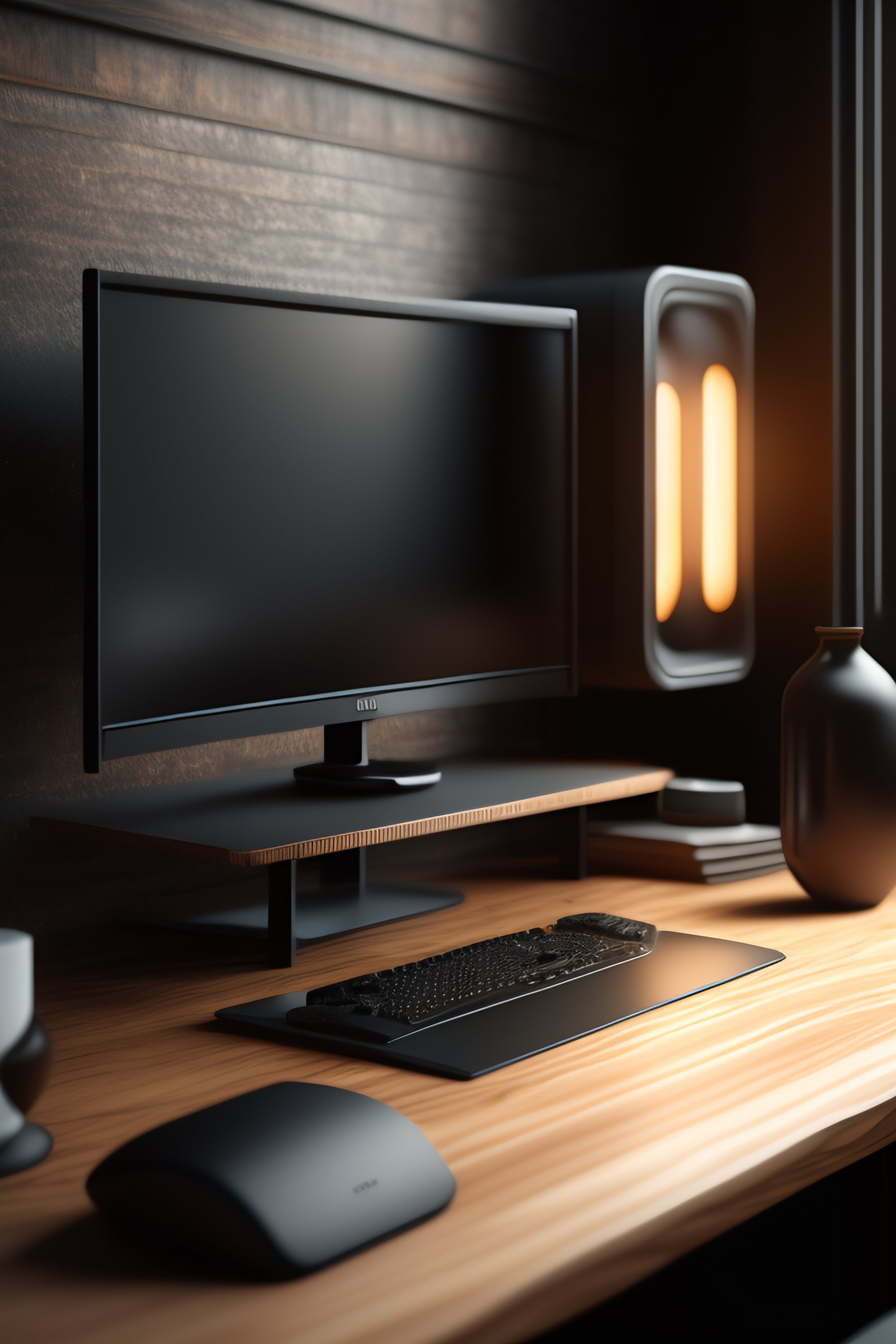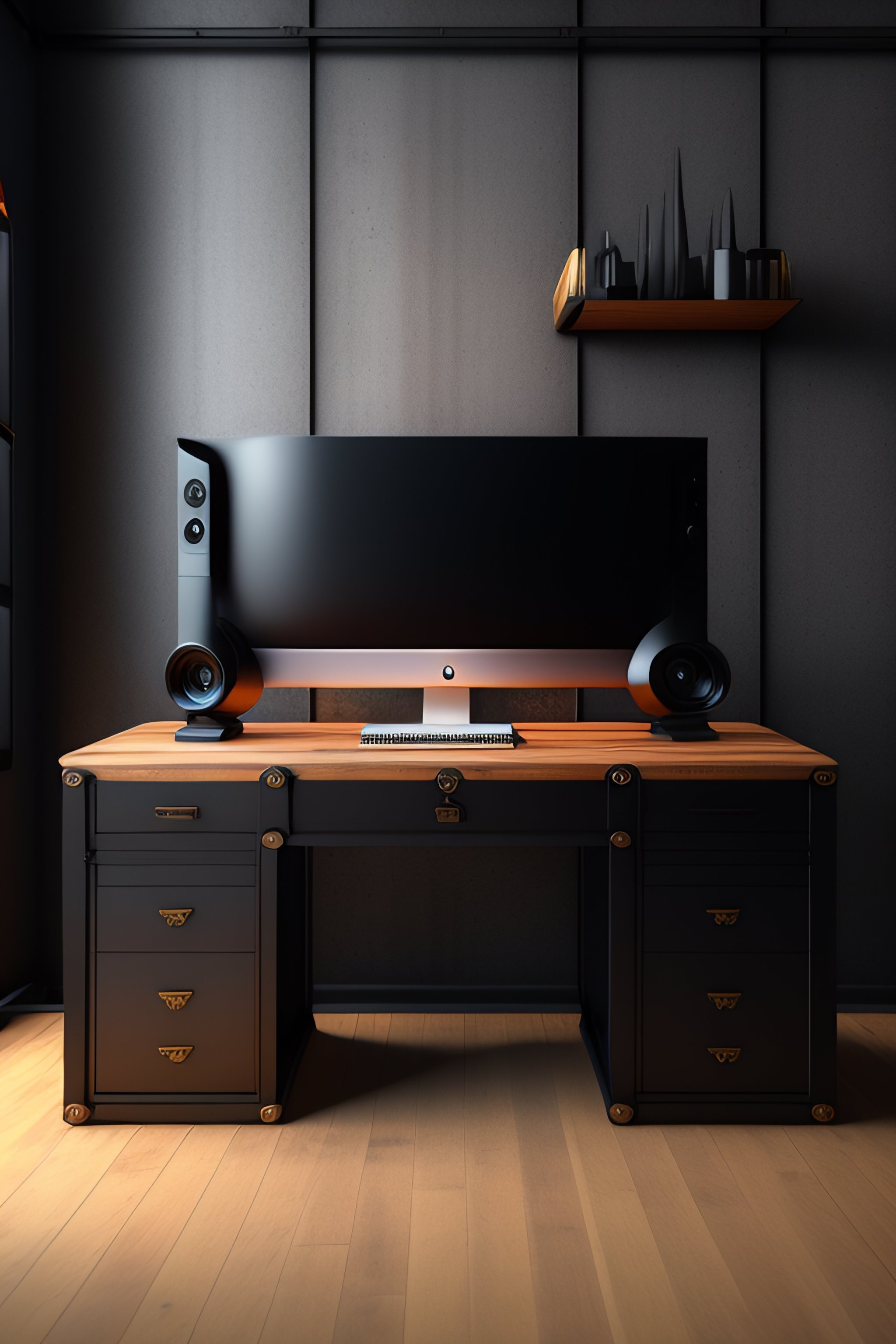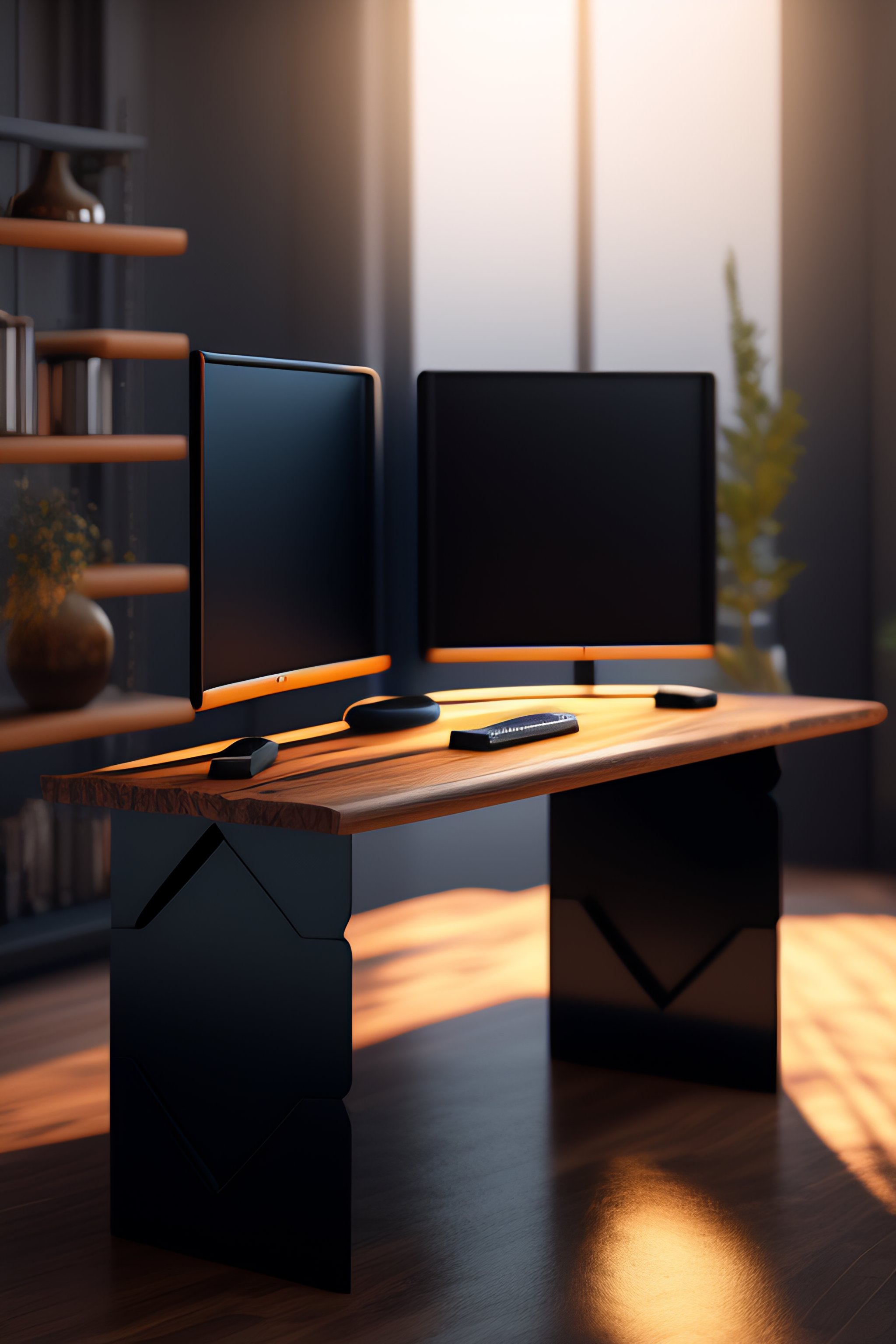 A dark industrial wood desk, with two curved monitors, very electronic, very detailed, maximalism, industrial, high tech, ambient occlusion, volumetric light, atmospheric haze, unreal engine, hyper realism, realistic shading, cinematic composition, realistic render, octane render, detailed textures, photorealistic, wide shot