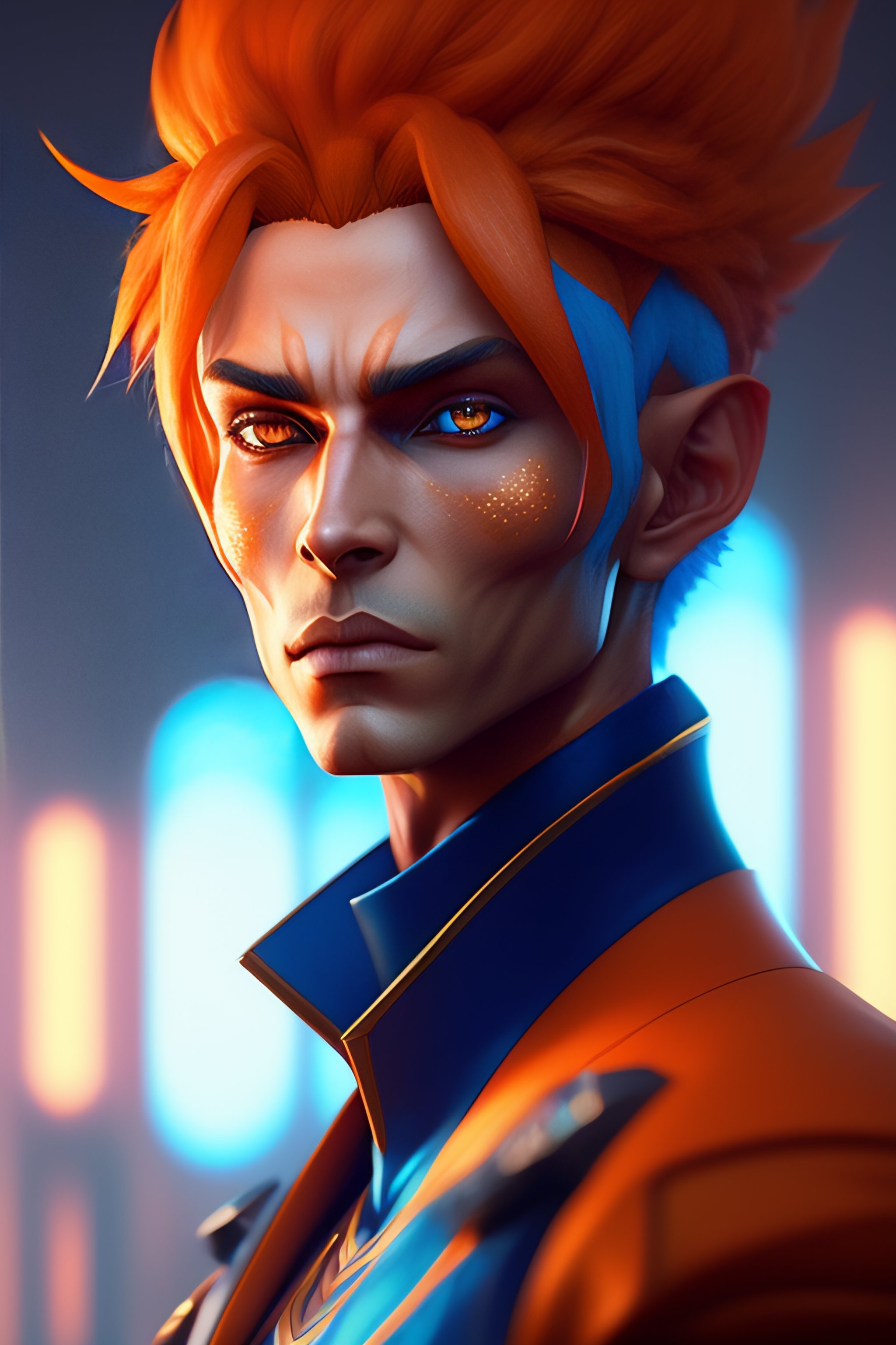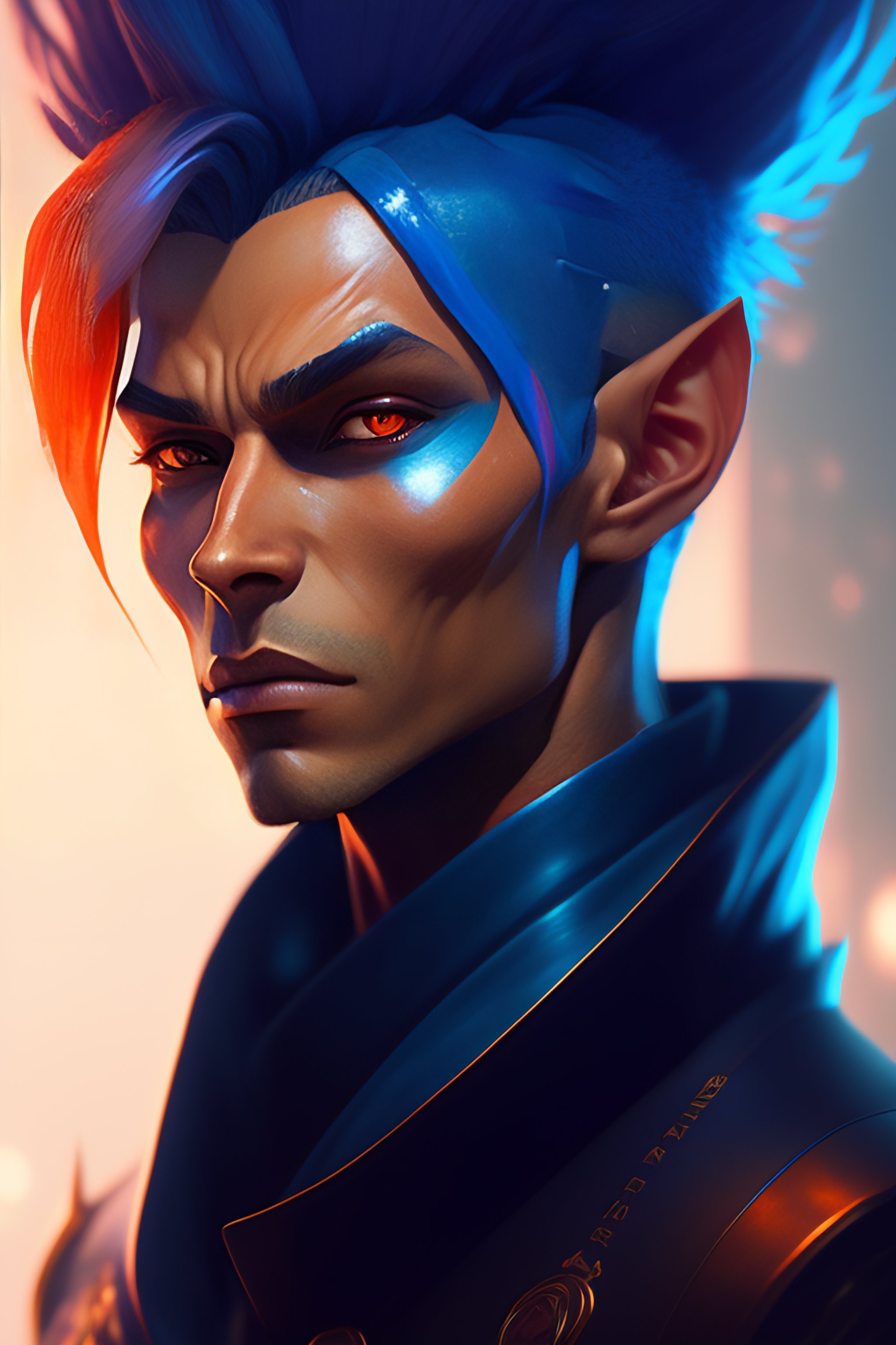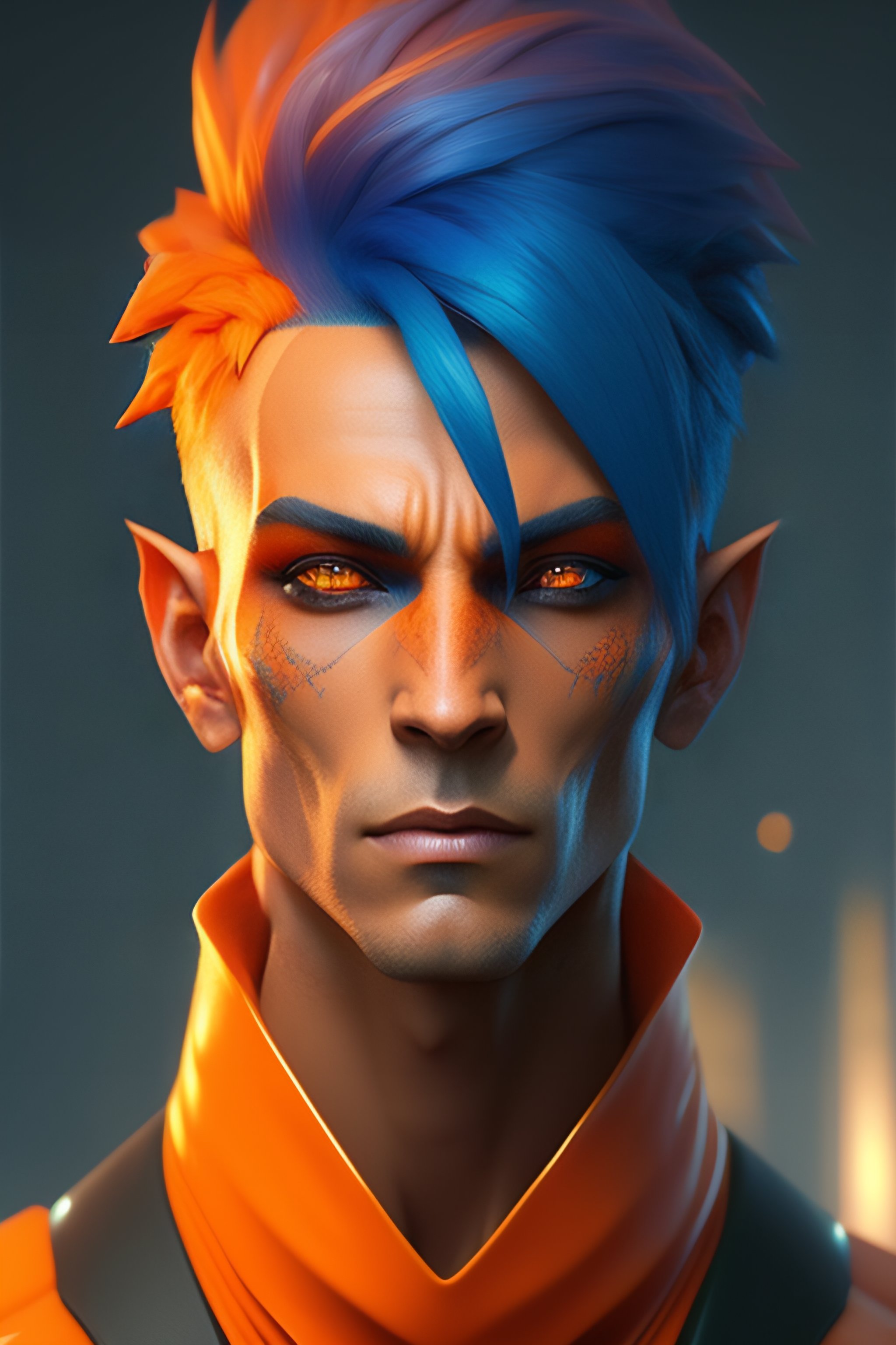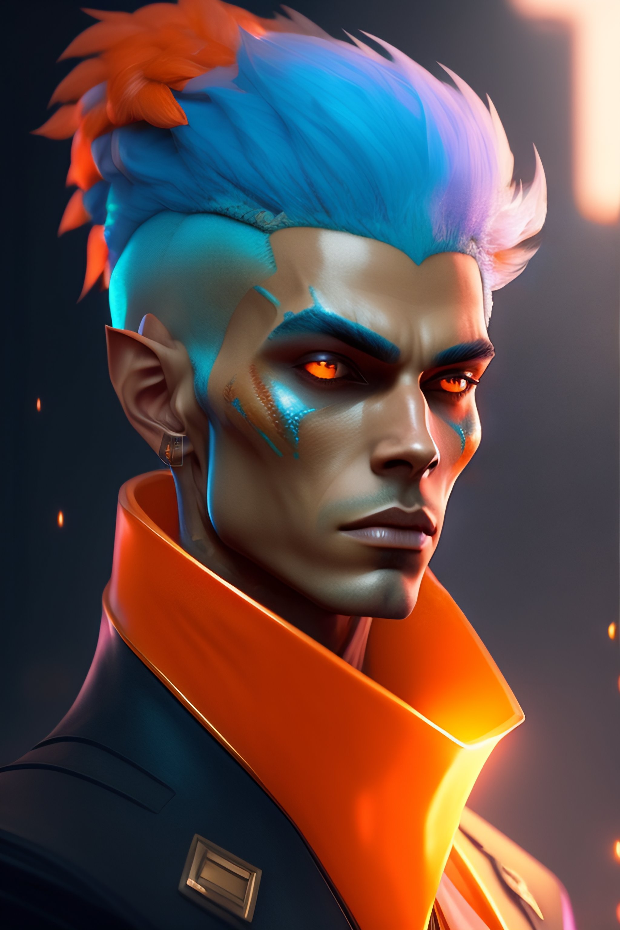 A portrait of a orange tan male alien elf mad scientist, angular scaled face with cyan blue hair by greg rutkowski, digital art, horror, trending on artstation, anime arts, featured on pixiv, hd, 8k, highly detailed, good lighting, creepy face, epic, masterpiece - h 768