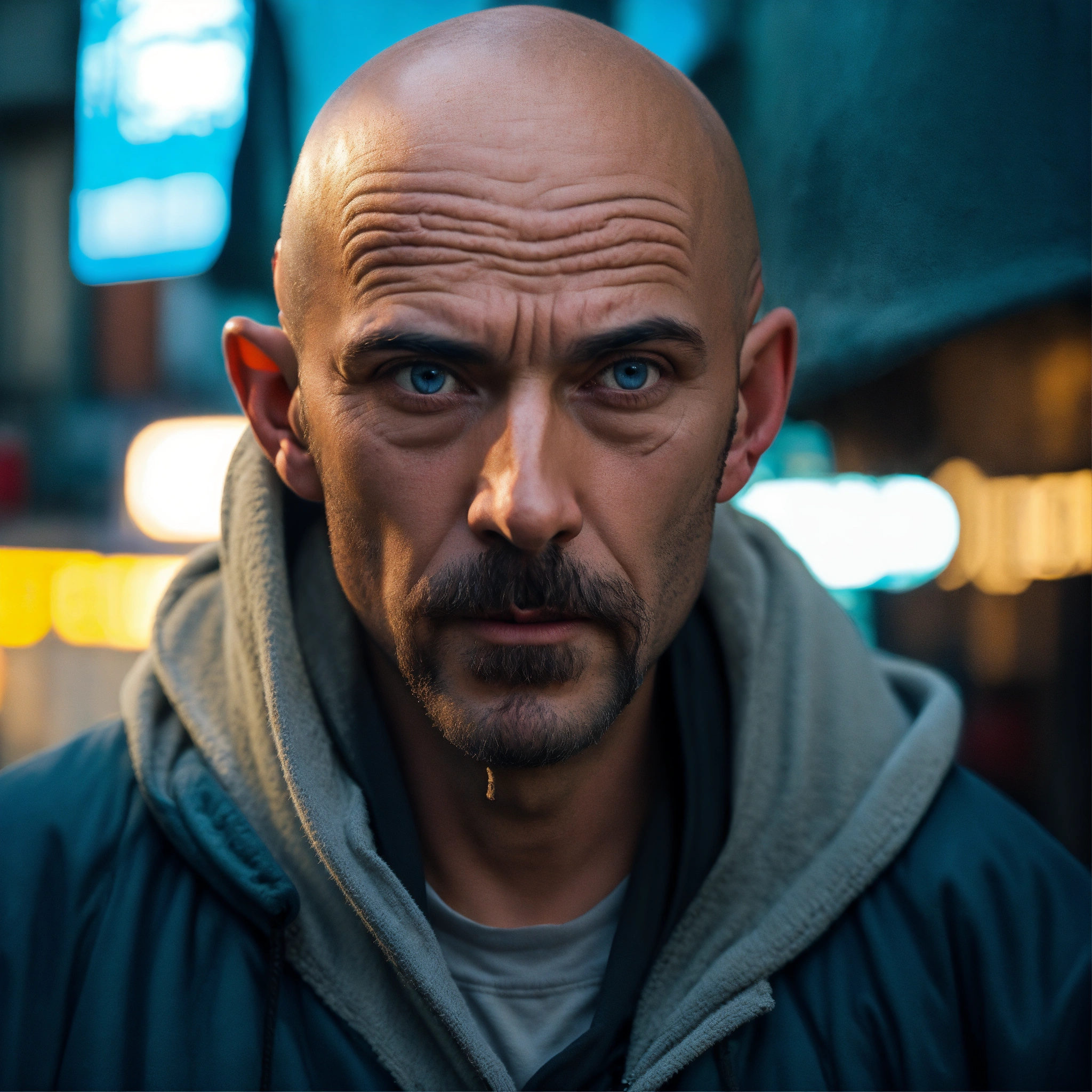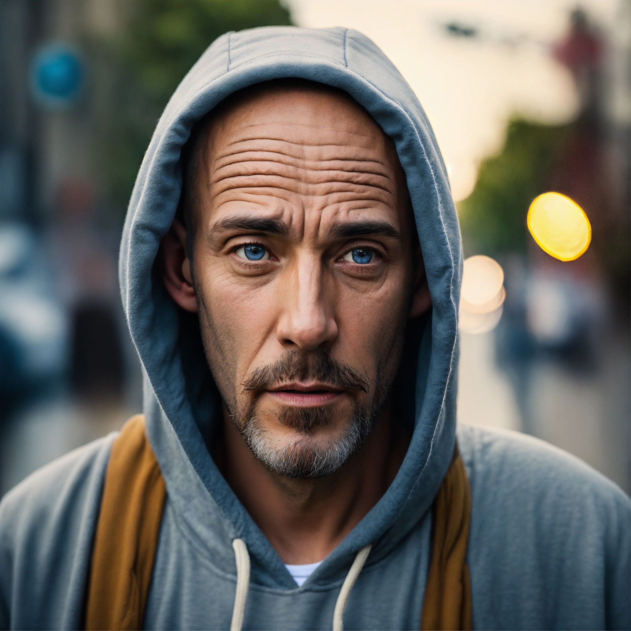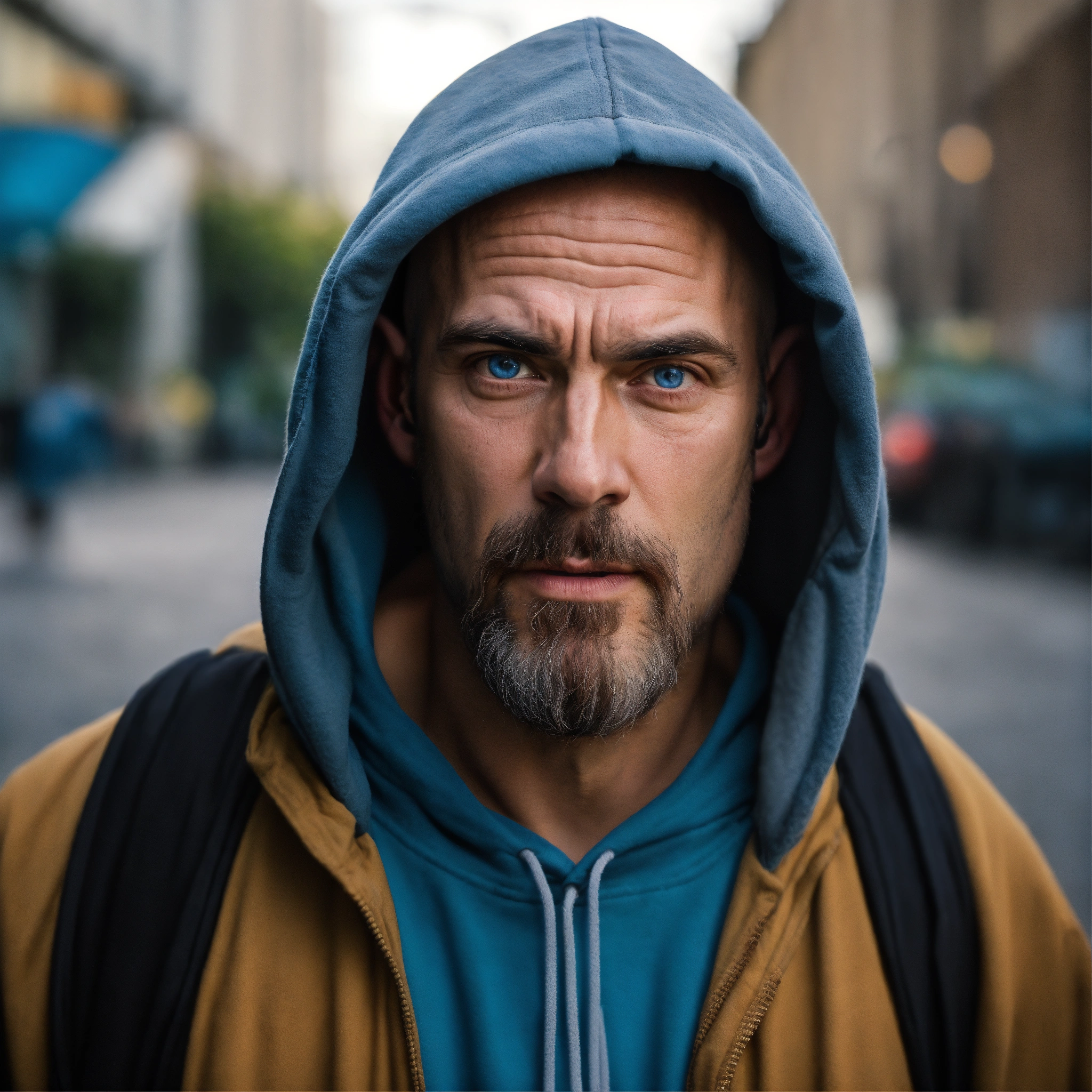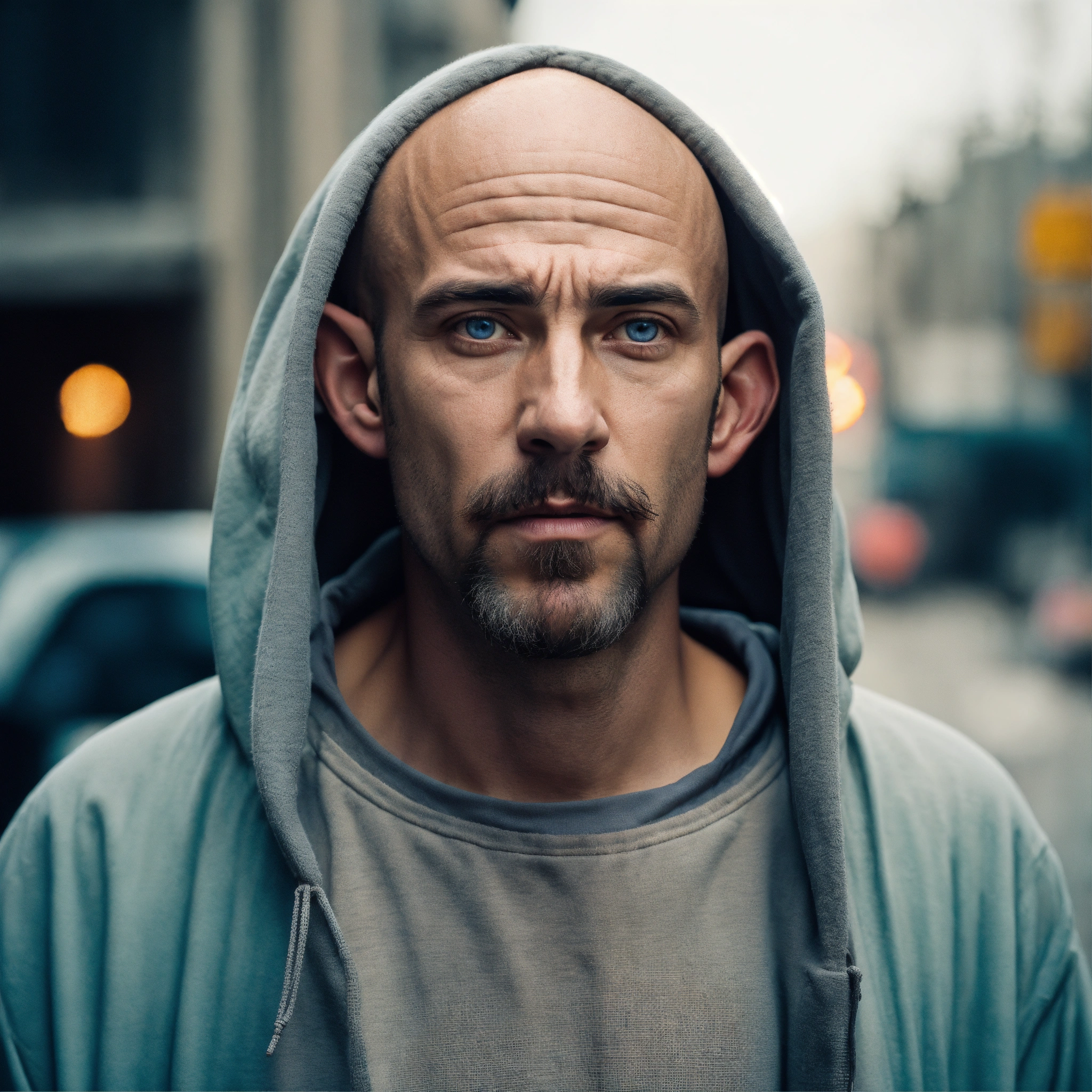 A huge homeless man, lumpy bald head, a tiny goatee, no mustache, protruding brow forehead, sunken light grayish-blue eyes, crooked mouth, large ears, wearing a hoodie up over his head, standing out in the street