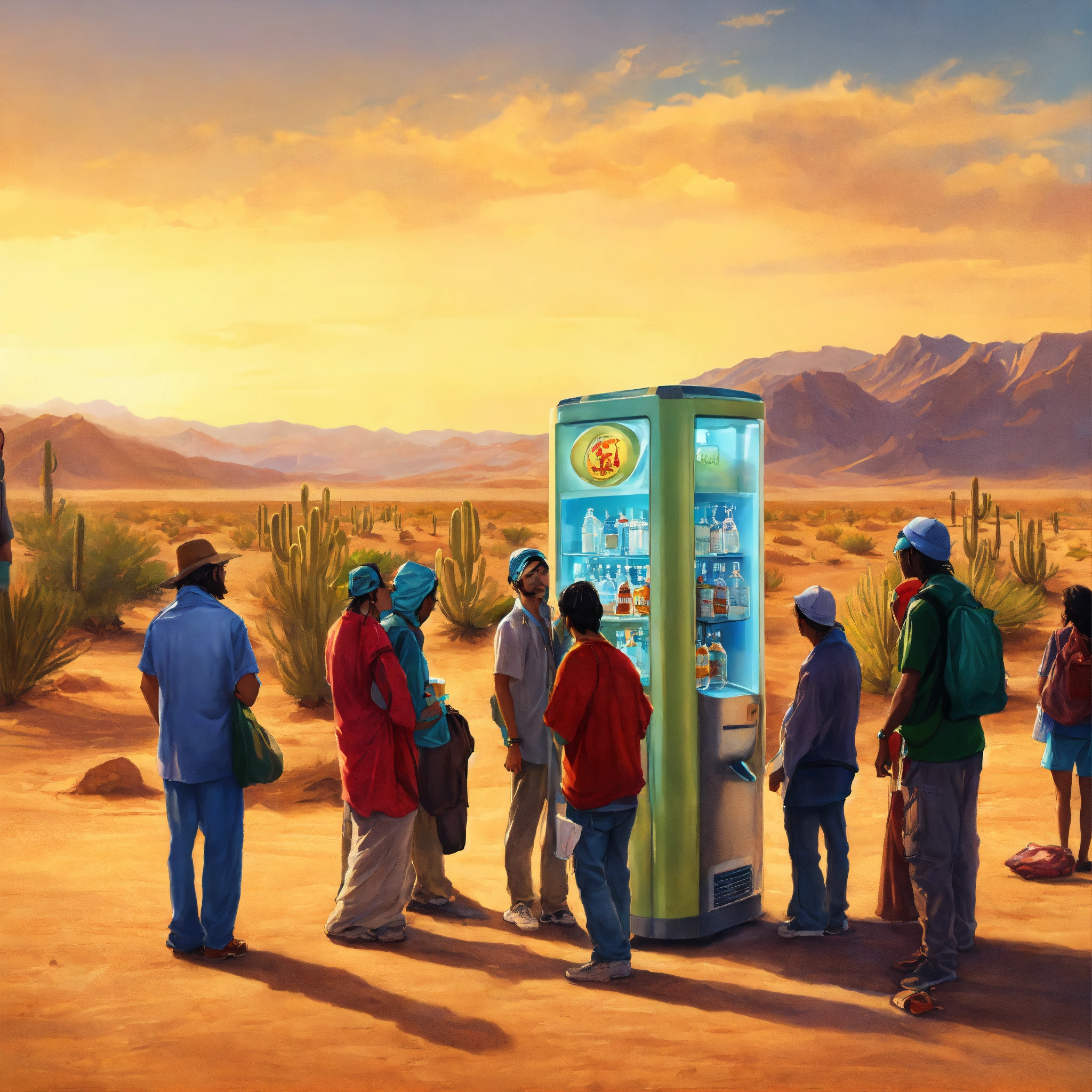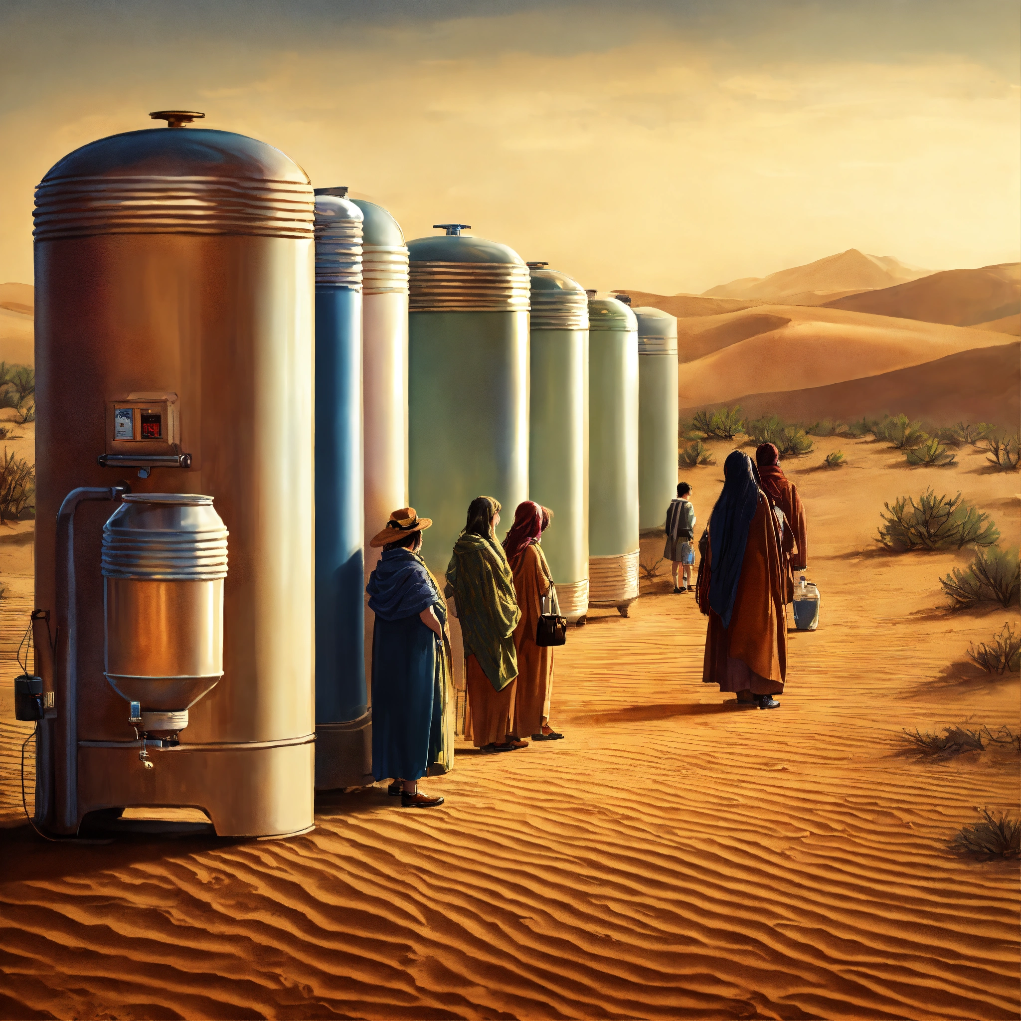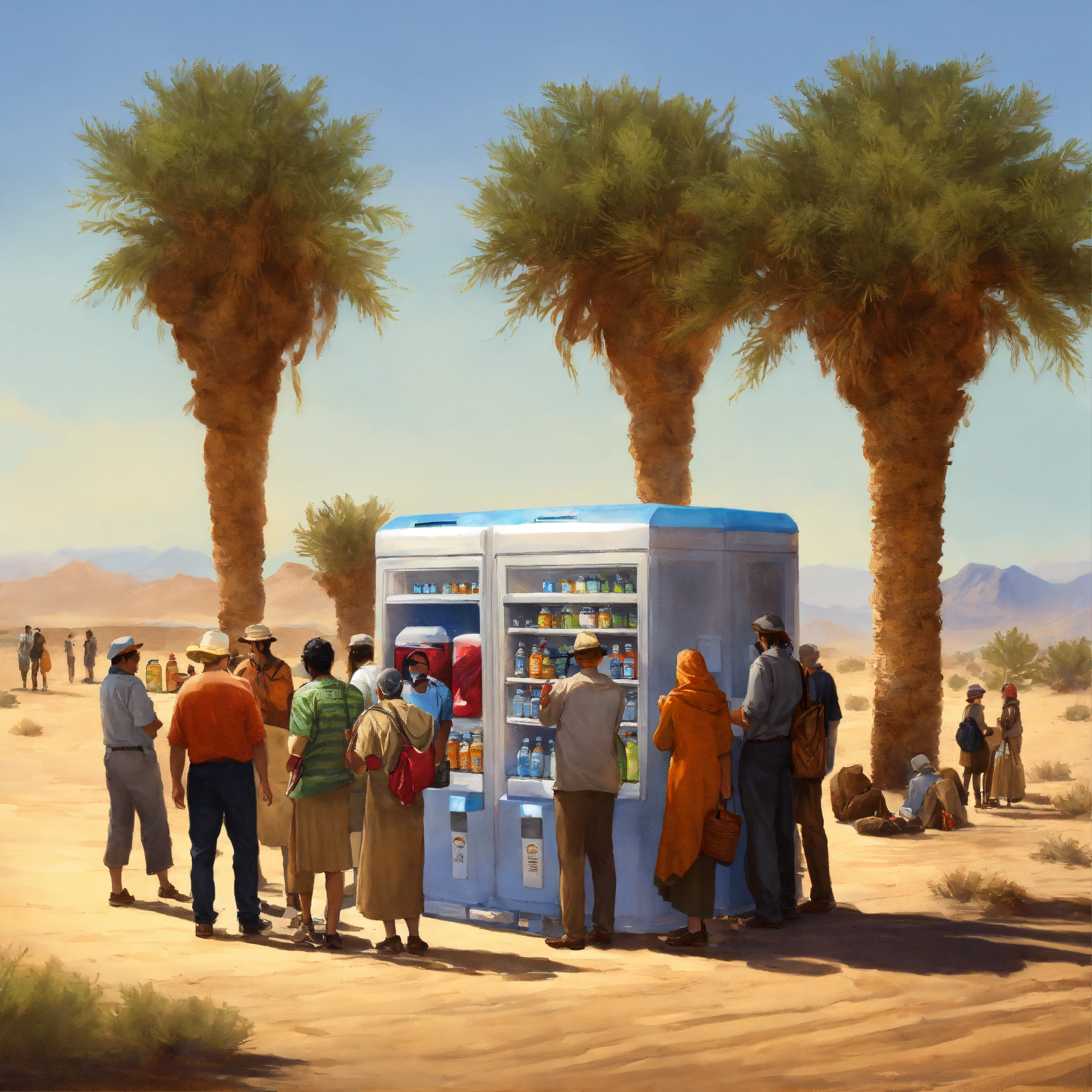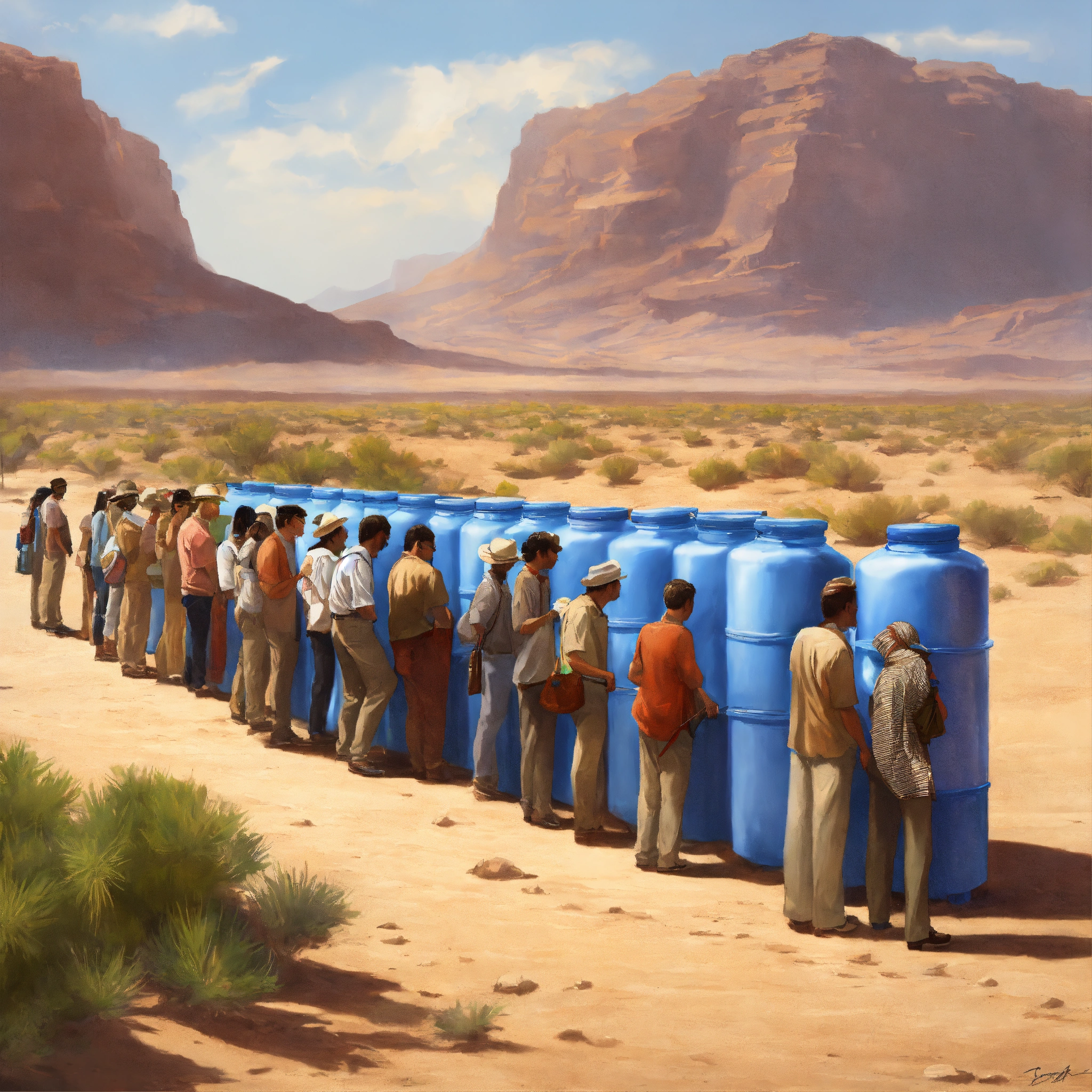 In the desert, a line of people queue up for a water cooler like a big glass water bottle. фото realism