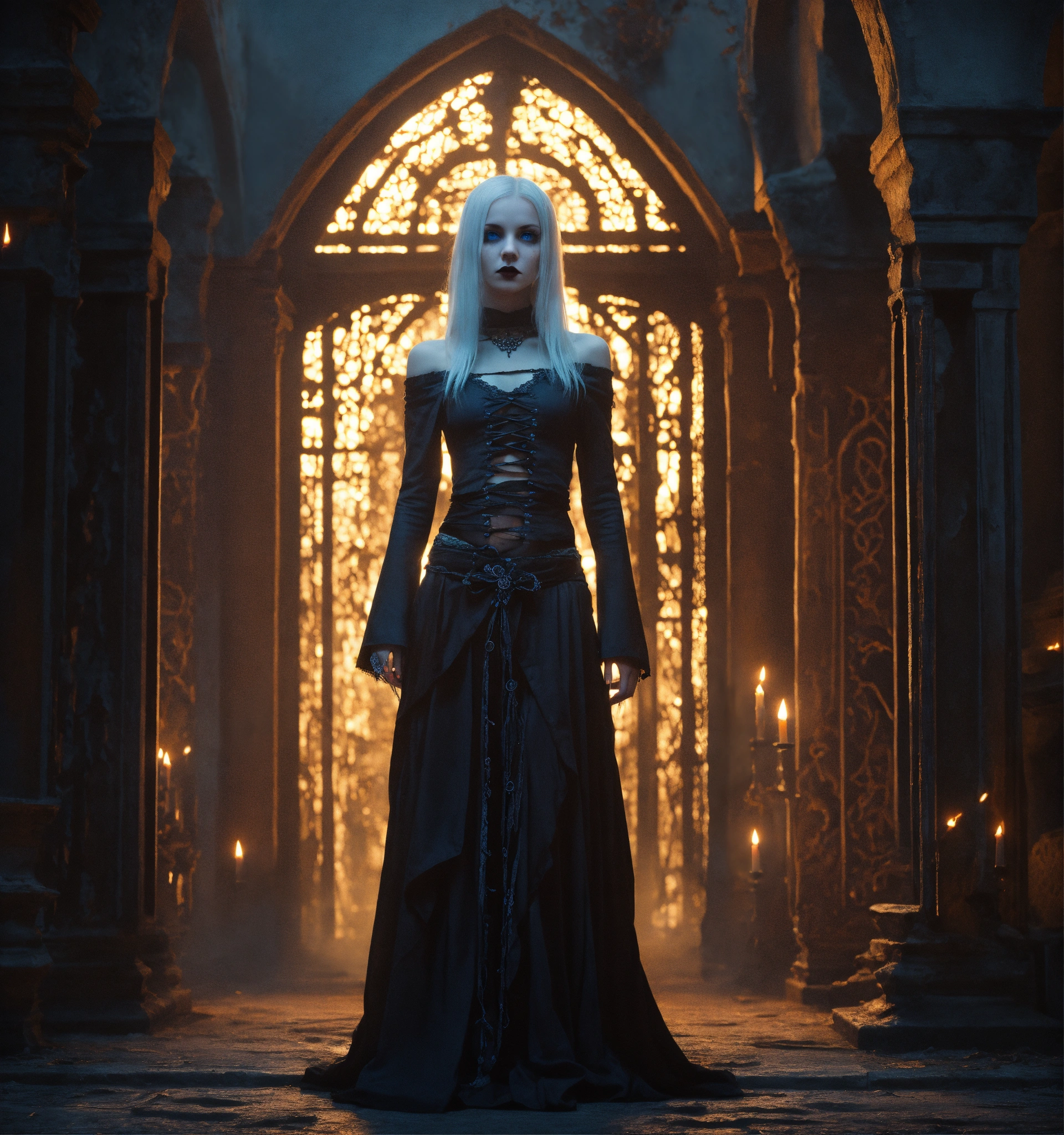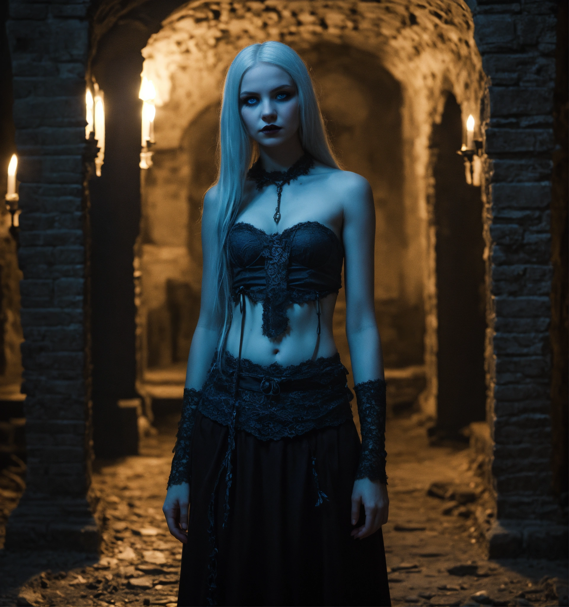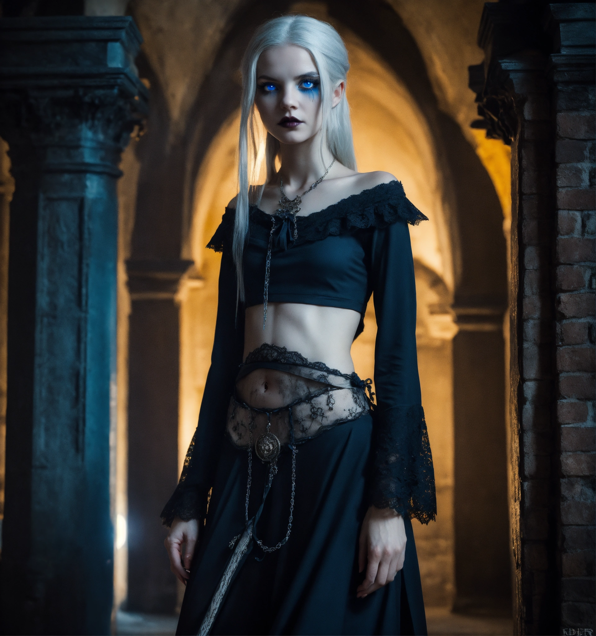 Body portrait, sehr kindhafte deadly pale twelve year old female goth necromancer child with waist long silverwhite hair and a aufreizendes off-the-shoulder lace silk cropped top mit tiefem ausschnitt and a low-waisted high slit skirt, very flat belly, extremely skinny, extremely slim and emaciated body, very narrow face, alabaster skin, pale as a corpse, glowing blue eyes, slim face, innocent looking, in a gloomy crypt, kindlich, unschuldig, childlike, juvenile, graceful, wispy, glowing blue eyes, ghostly, dead, evil, demonic, undead, darkness, grotesque, mysterious, dark, dark, cold ambient lighting, extremely detailed, fantasy, medieval setting