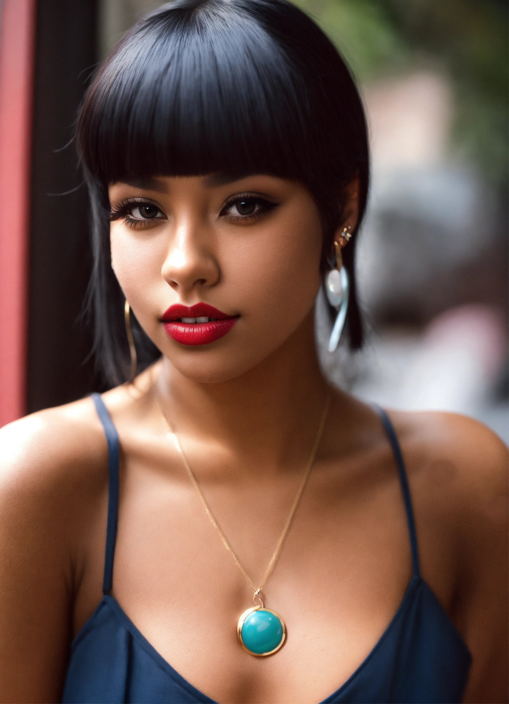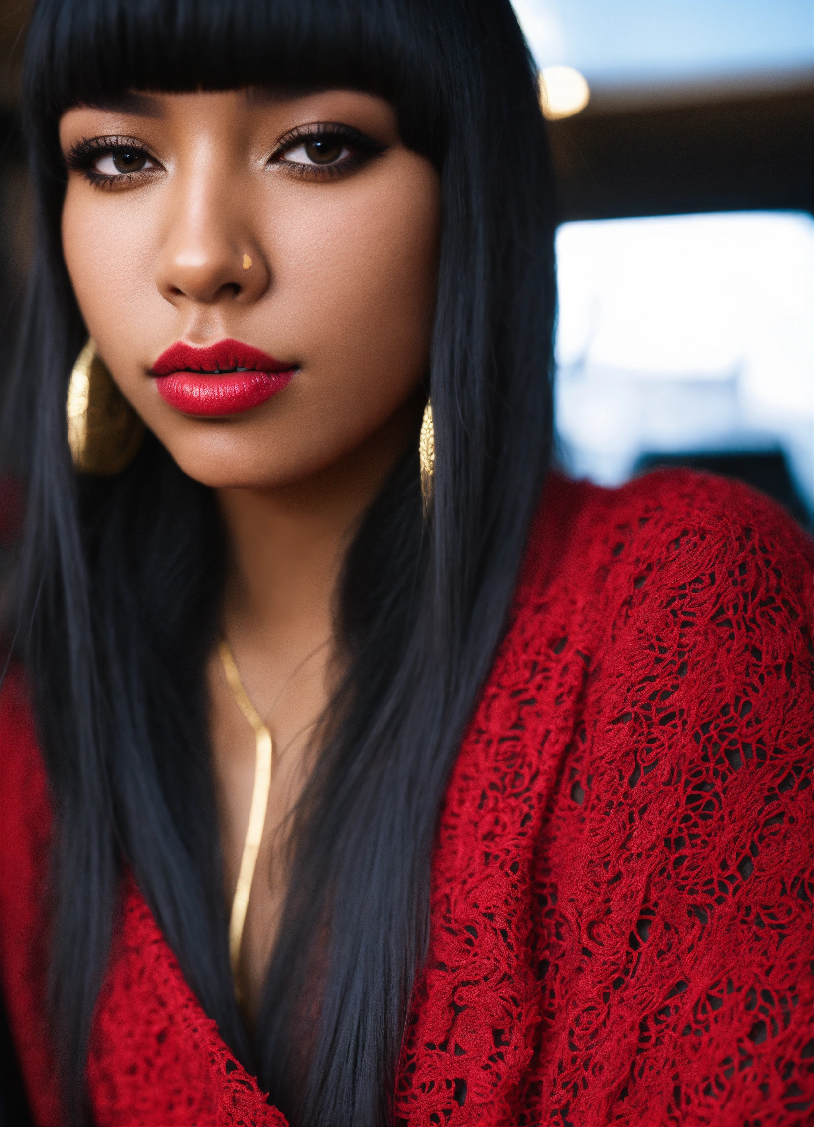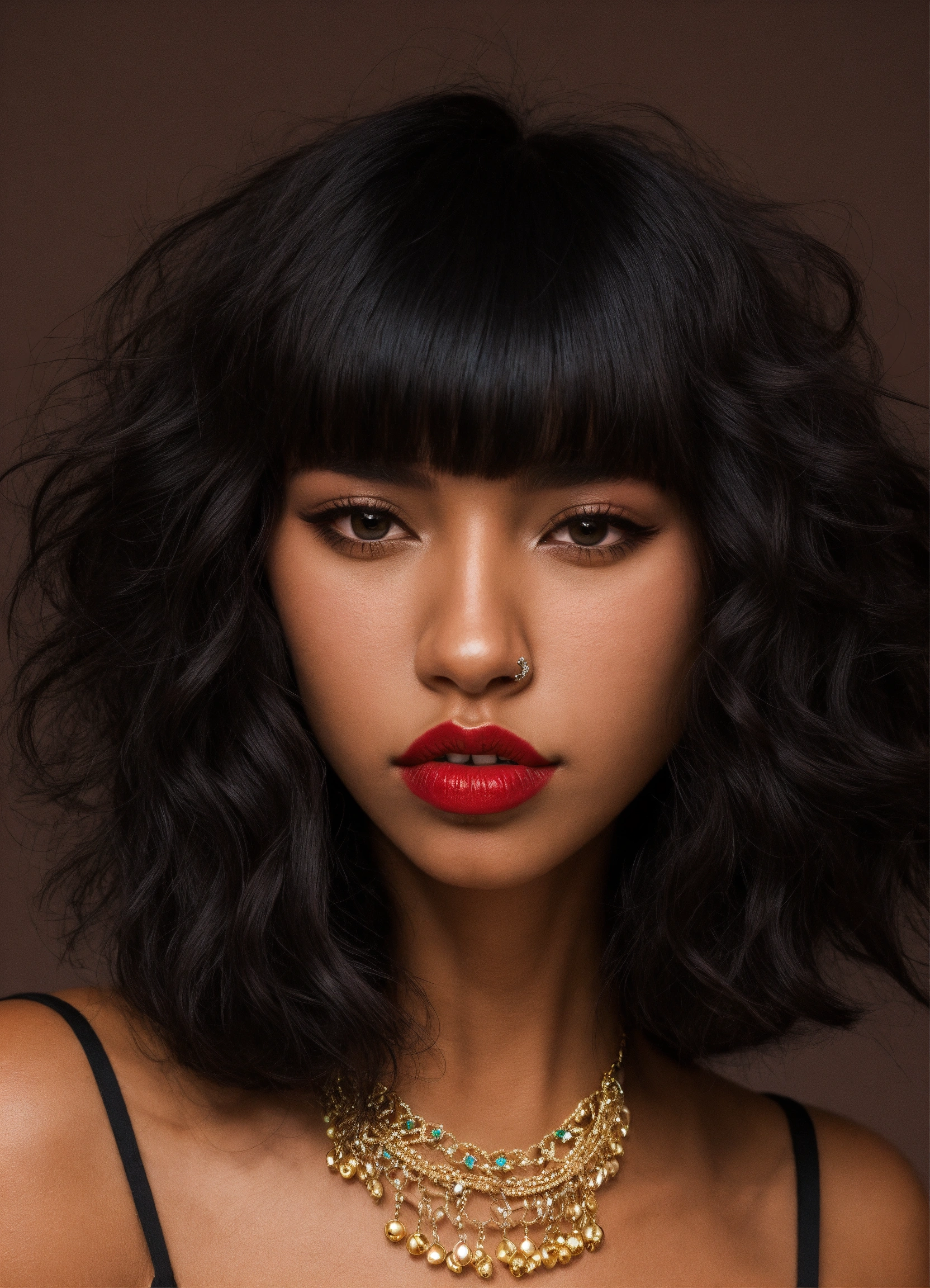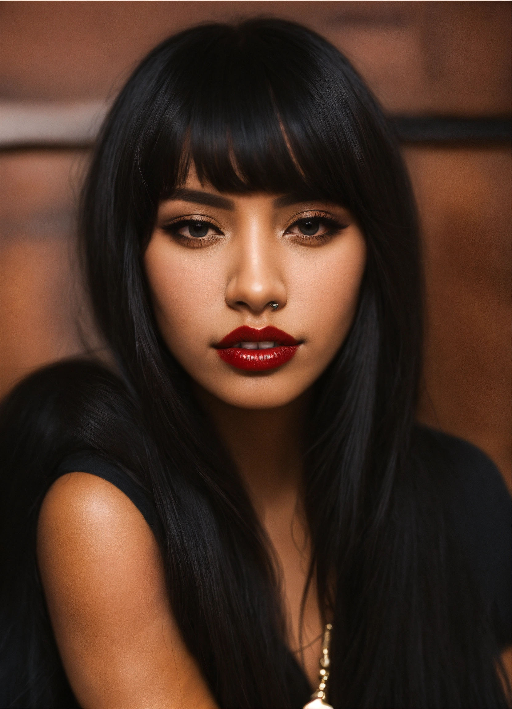 Tan skin "nose ring" "black hair" bangs "carmine lips"