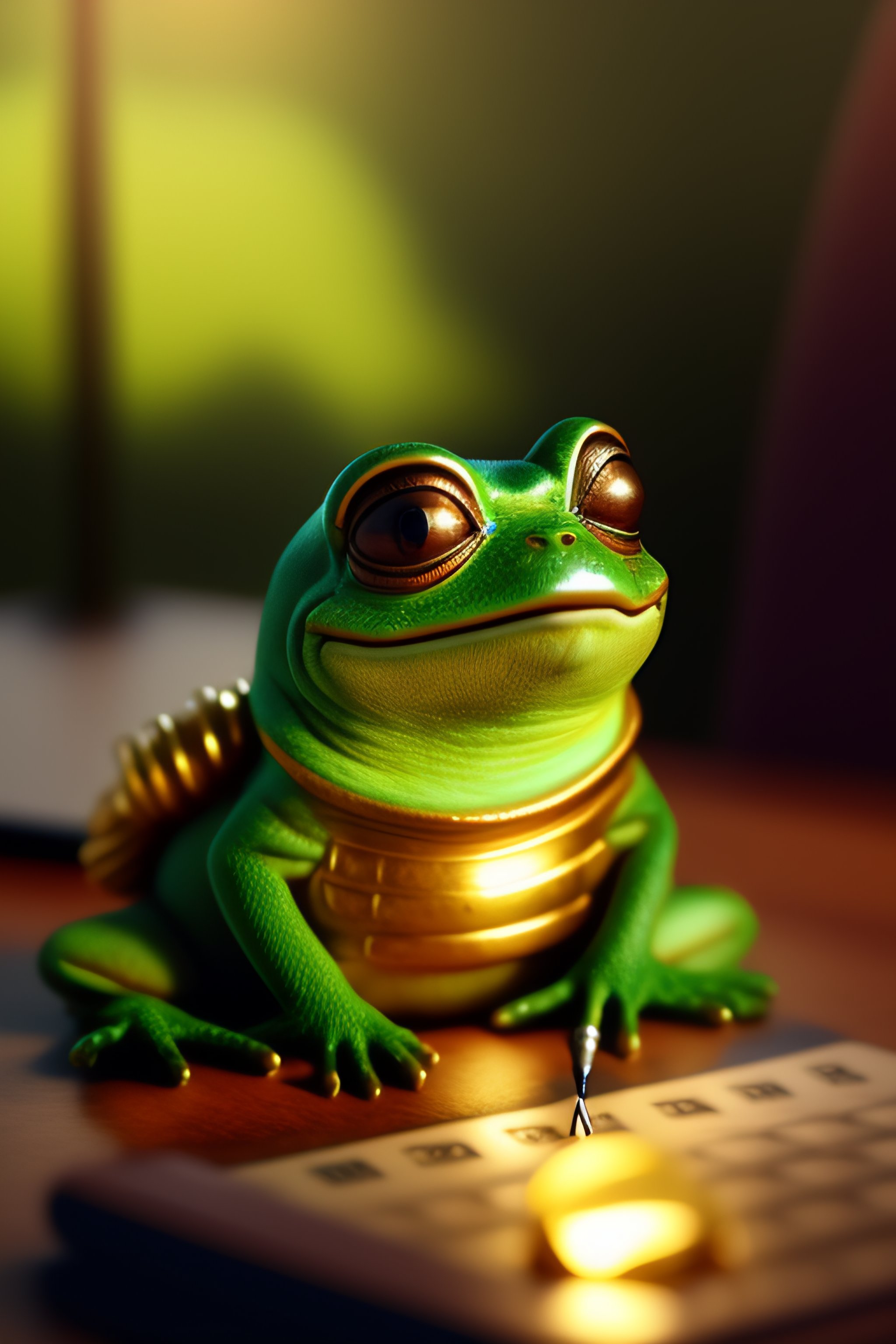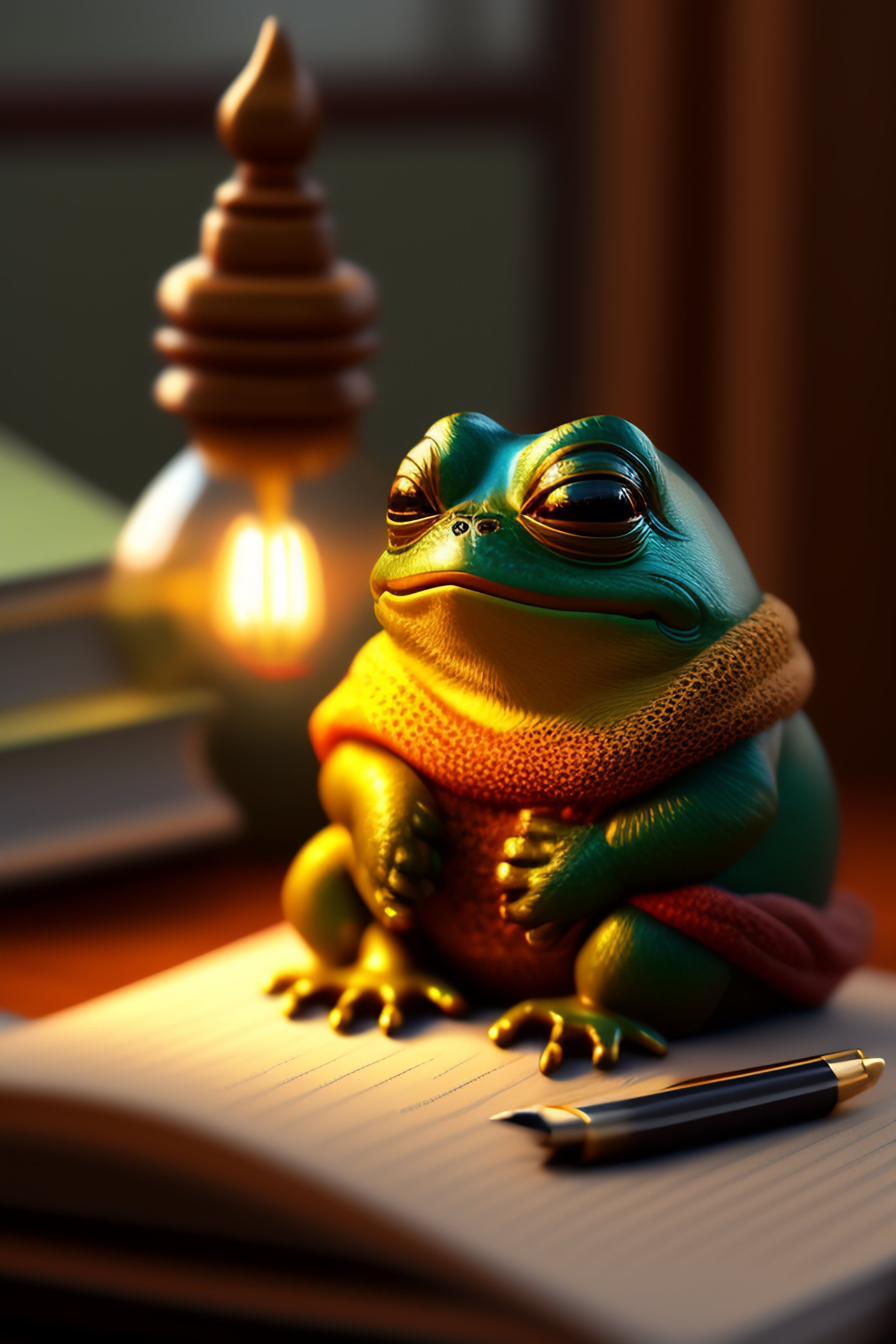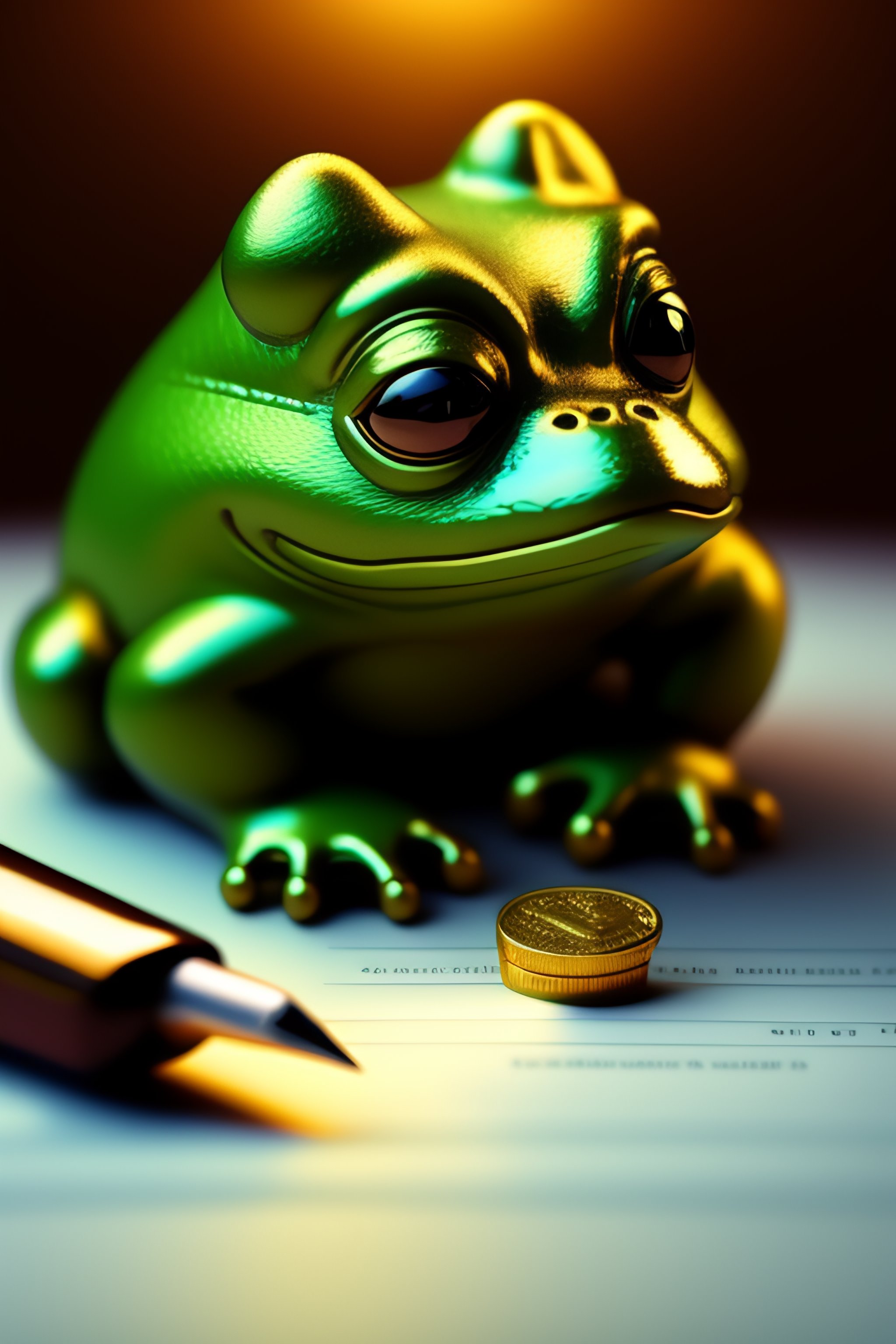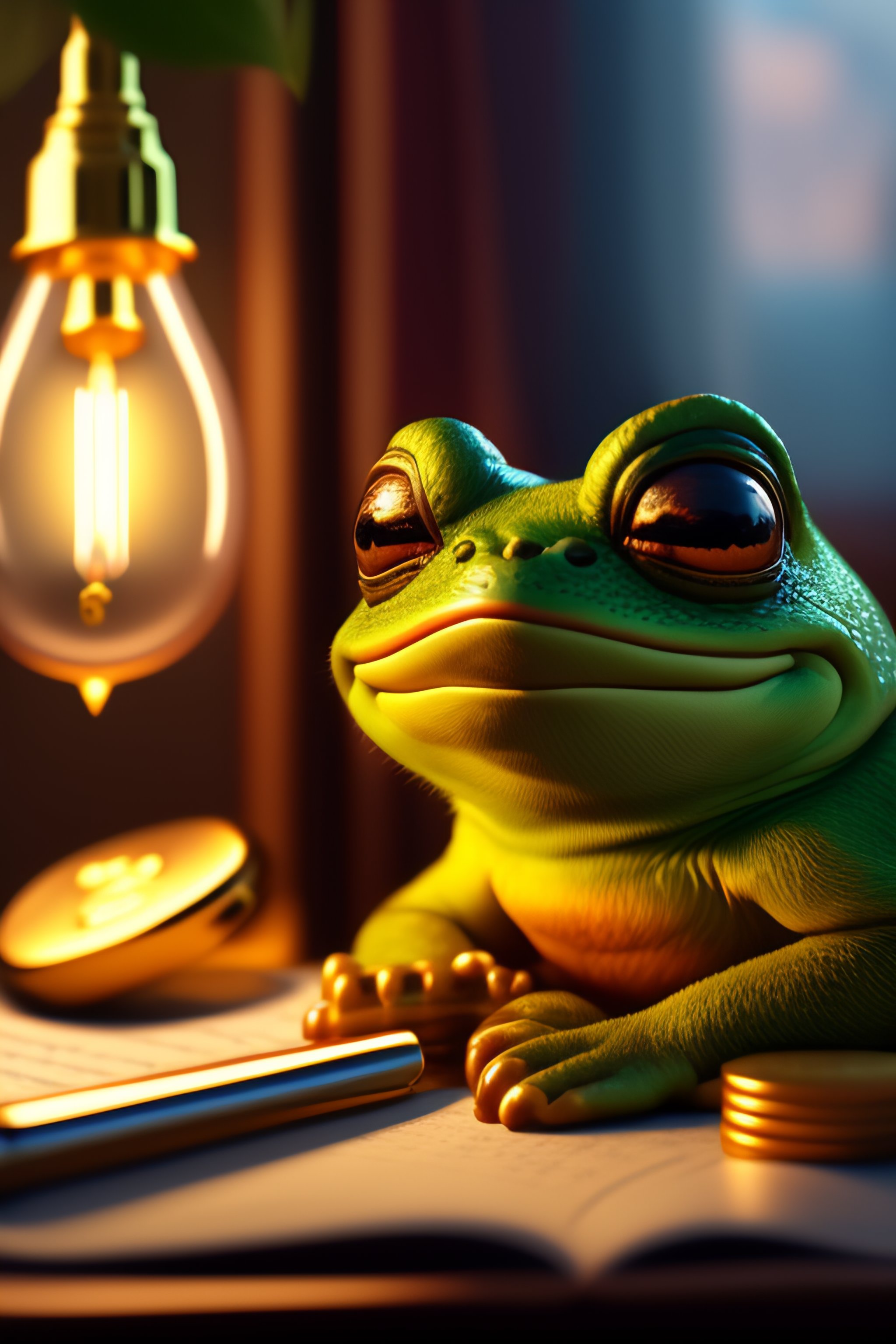 An exhausted pepe the frog commiting tax fraud, paperwork, gold coins pile, writing pen, desk, greedy, night- key lighting, soft lights, foggy, by steve hanks, by lisa yuskavage, by serov valentin, by tarkovsky, 8 k render, detailed, cute cartoon style, very cute face