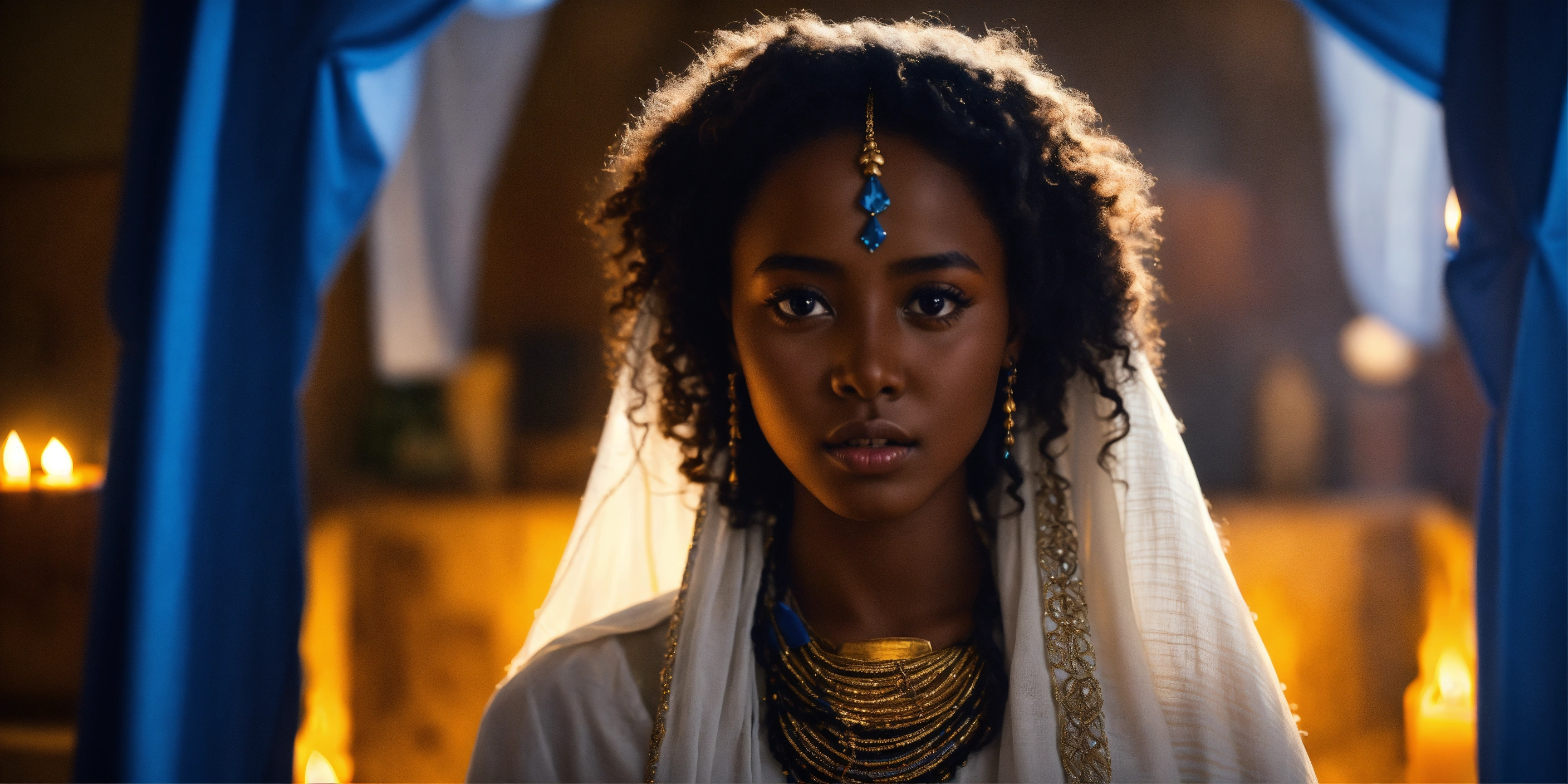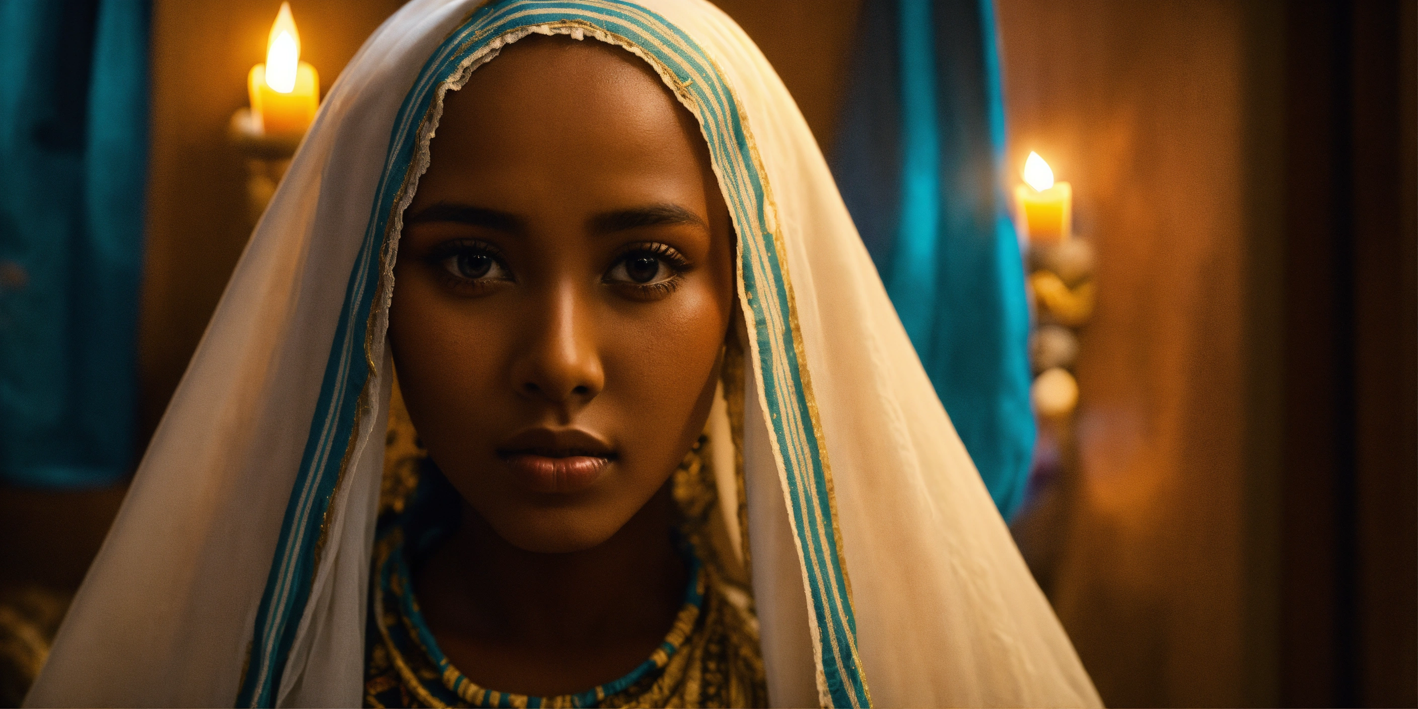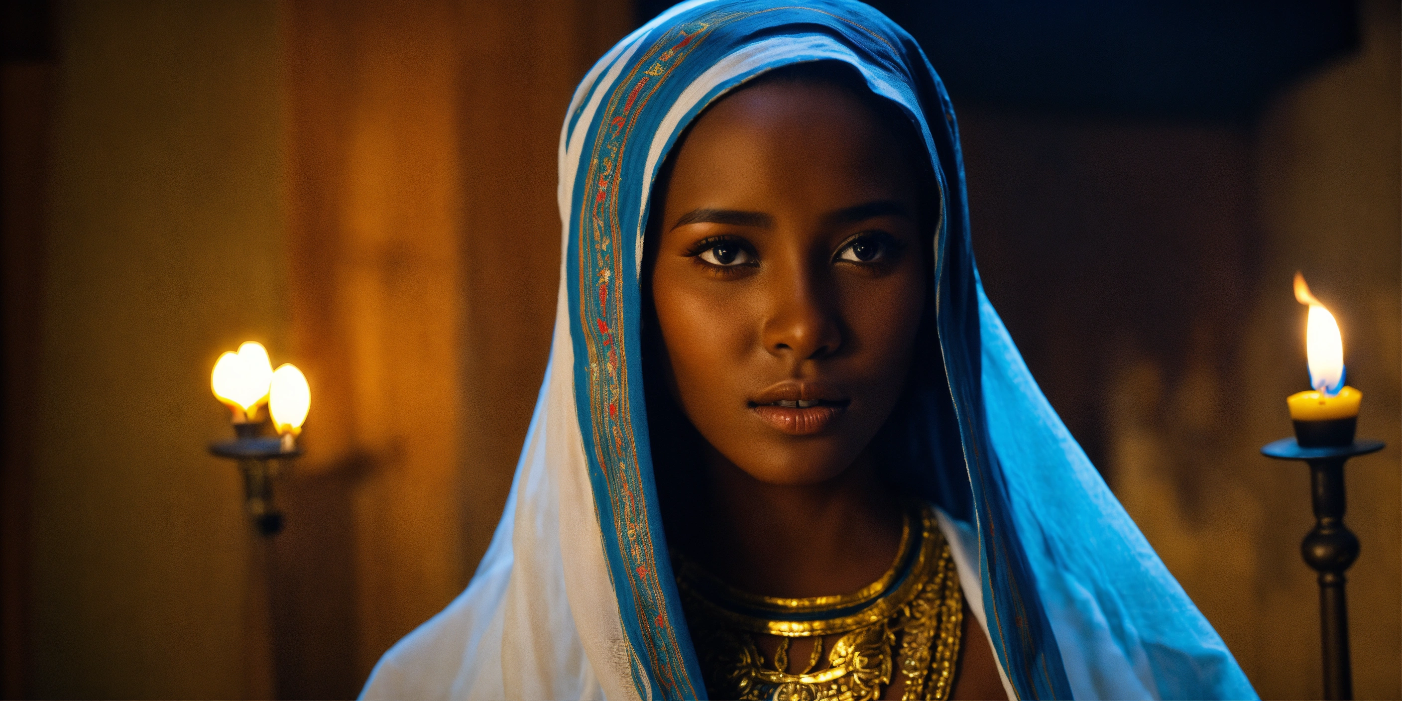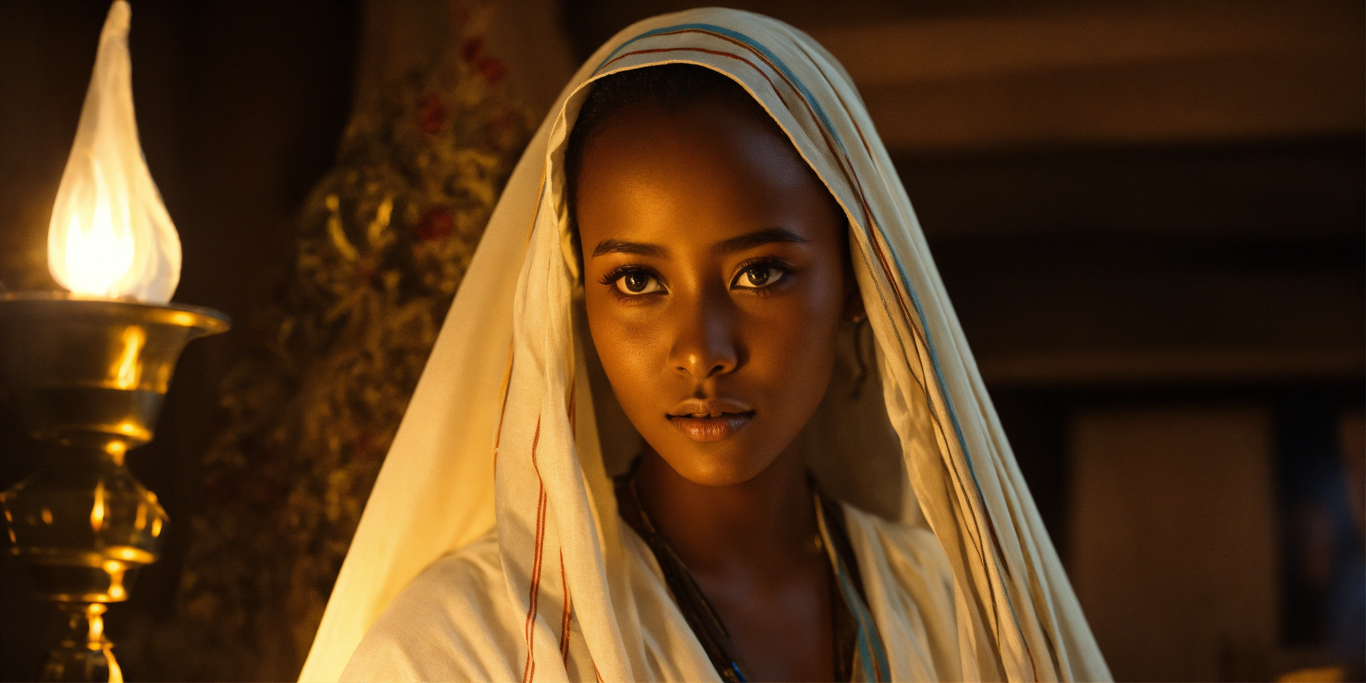 Illustrate a view of a pretty young 16-year-old ethiopian woman, she wears old traditional garments of ethiopia made of white cotton with blue stripes on the edges, she also wears a veil of the same fabric, she looks startled surprised and reverent because she sees a bright shining black angel, the angel has large white wings, her room was lit by candlelight, illustrate a bright shining pillar in the room, fantasy, photorealistic 8k