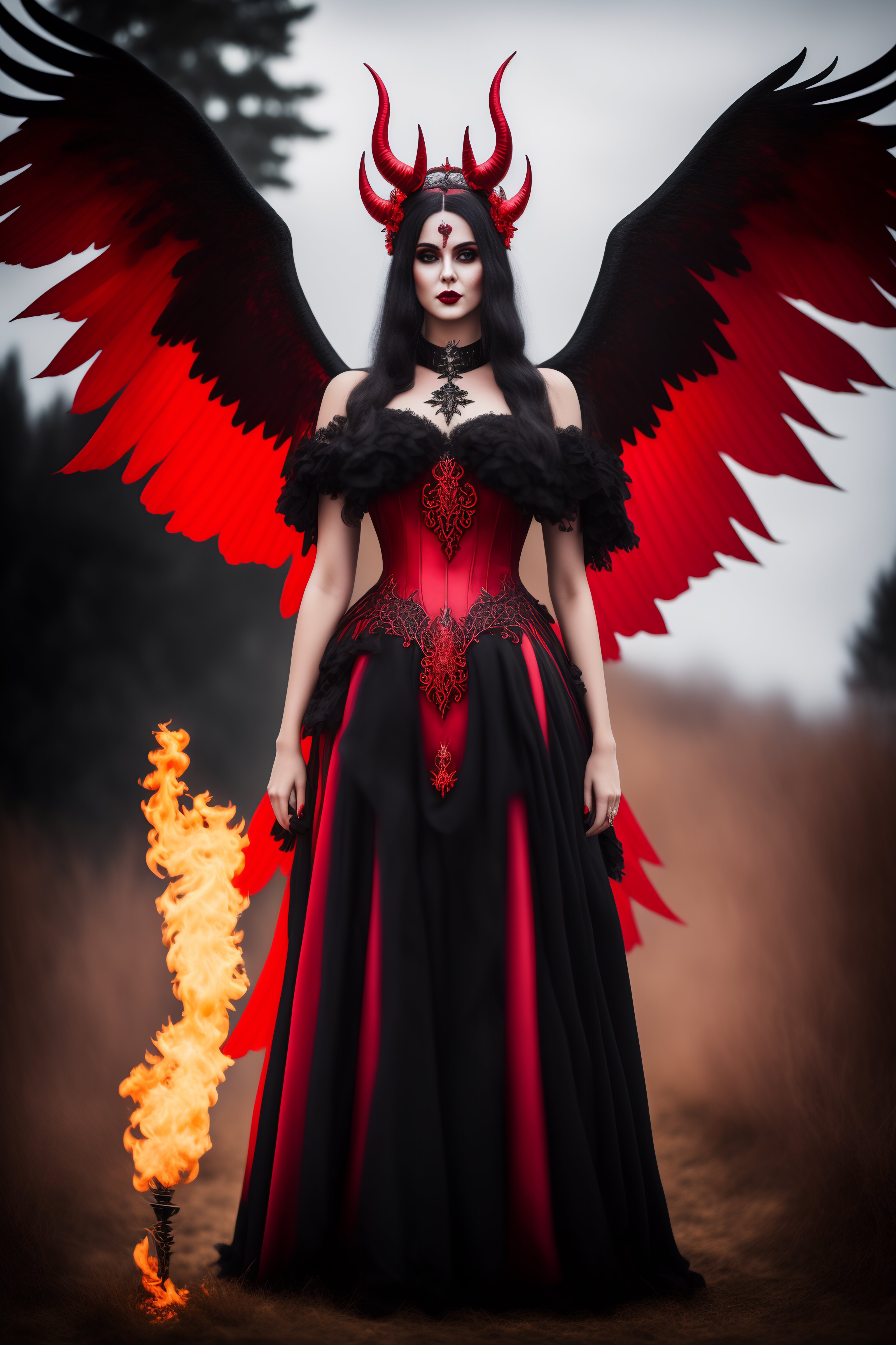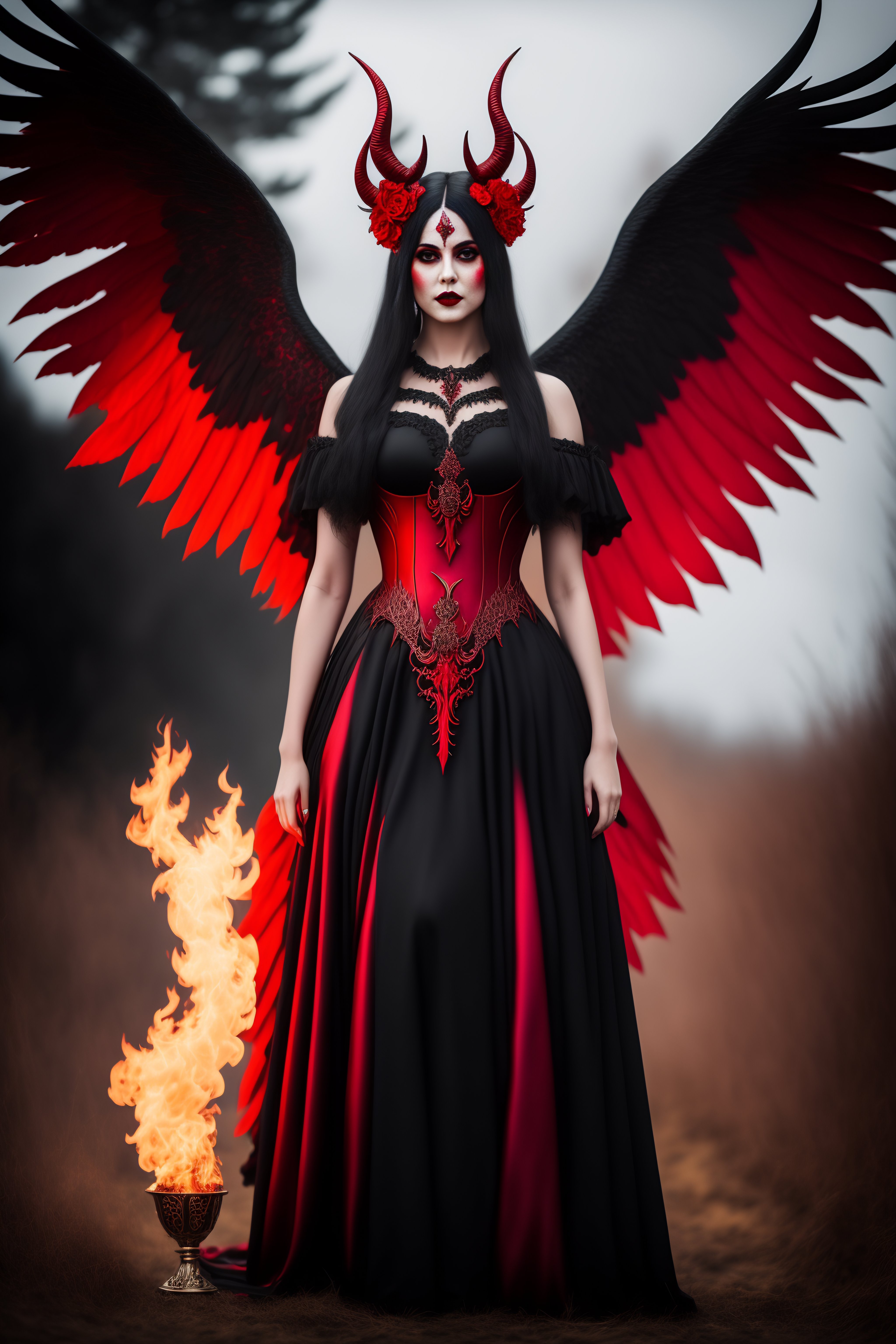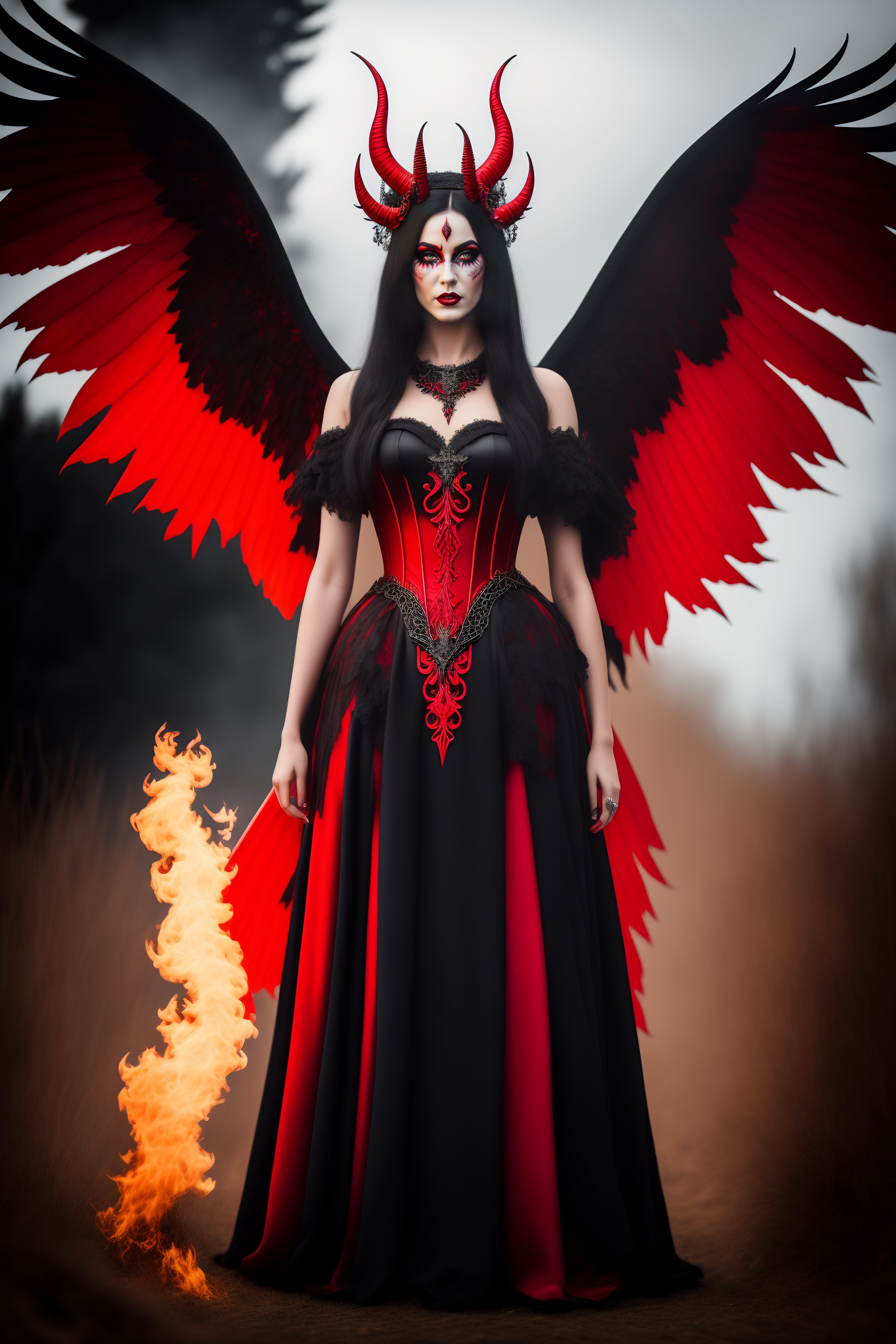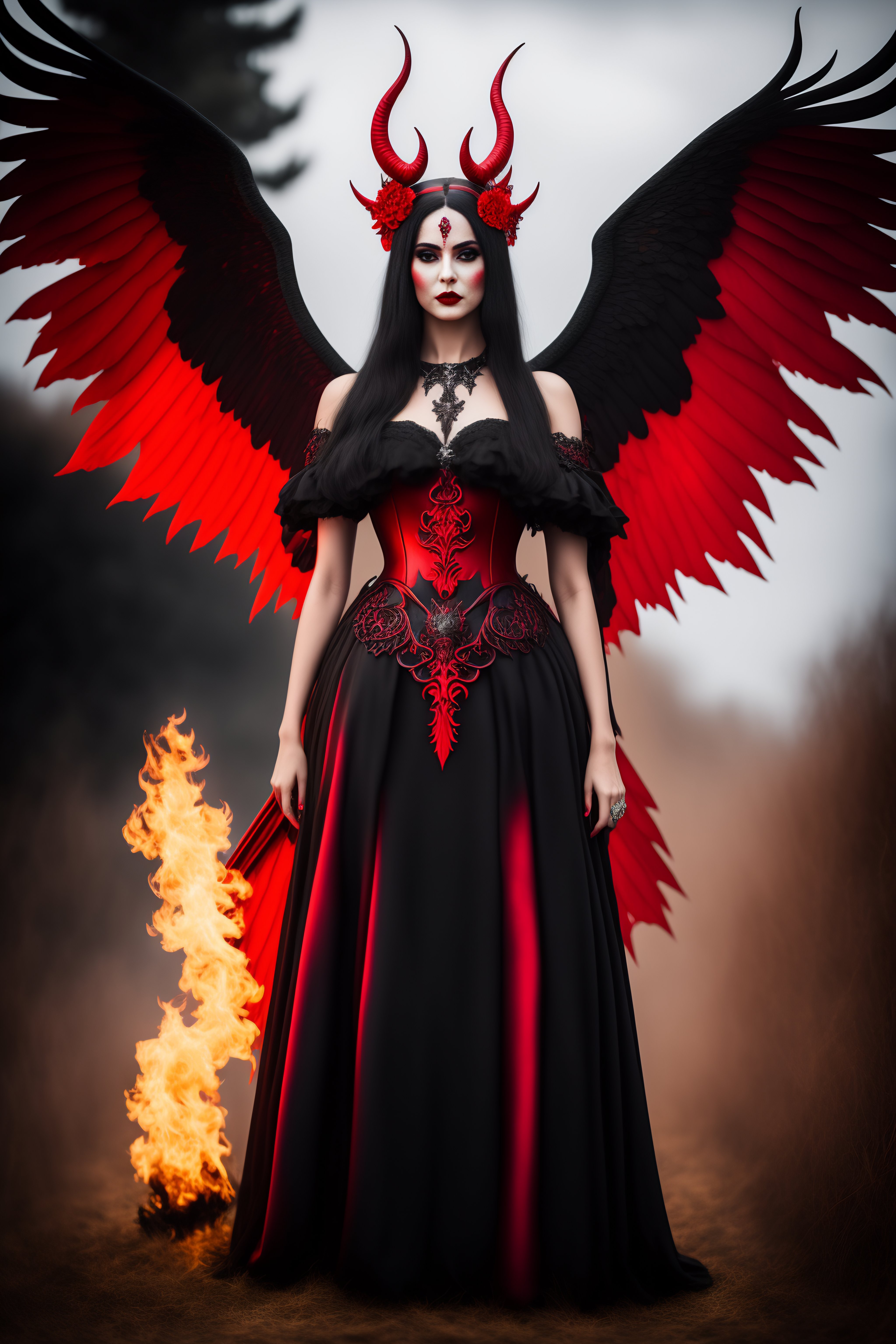Black metal girl, devil makeup, realistic detailed, beautiful gorgeous, red art nouveau dress, proportional body, nikon 70-200mm f/2.8g, fire background, blood wings