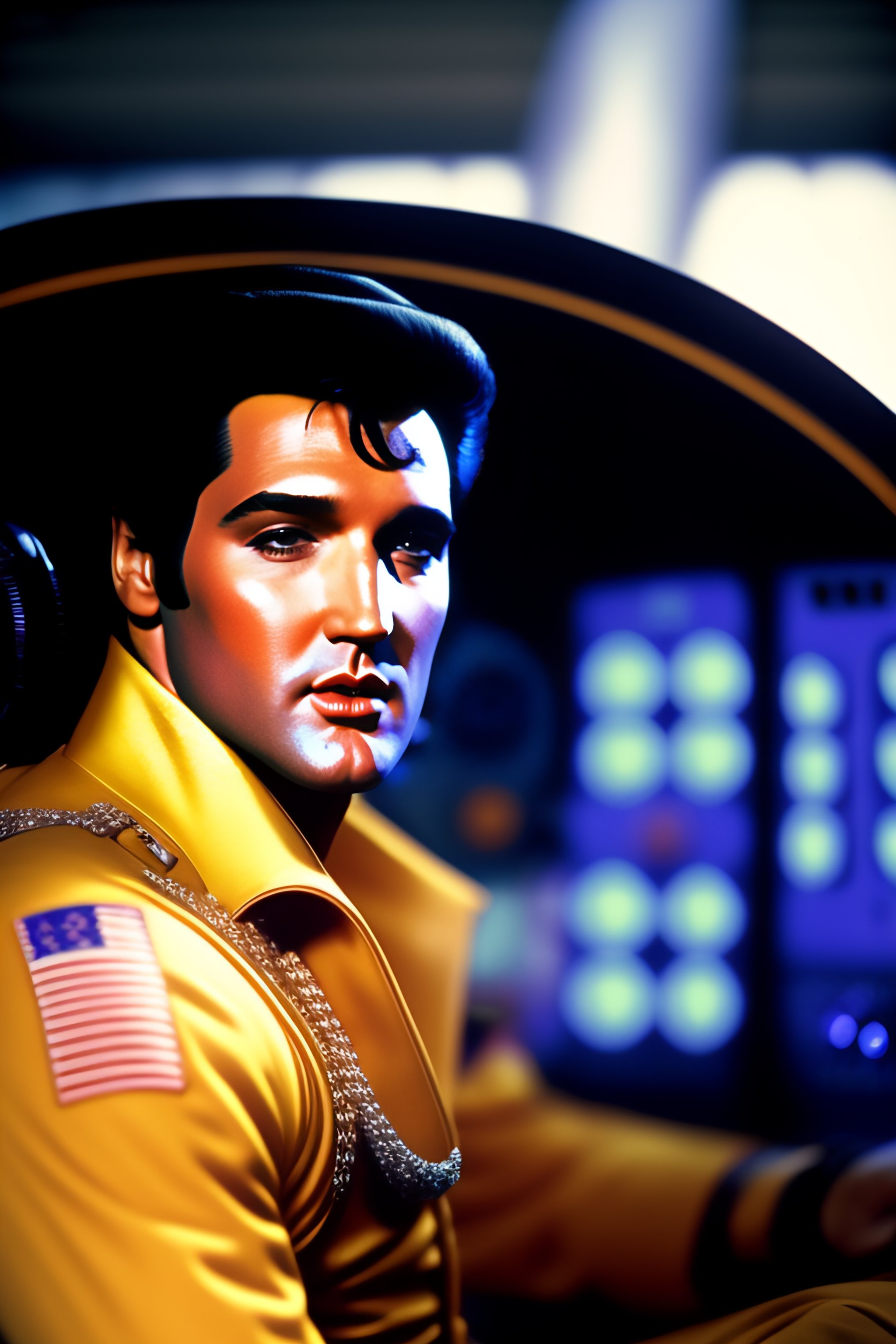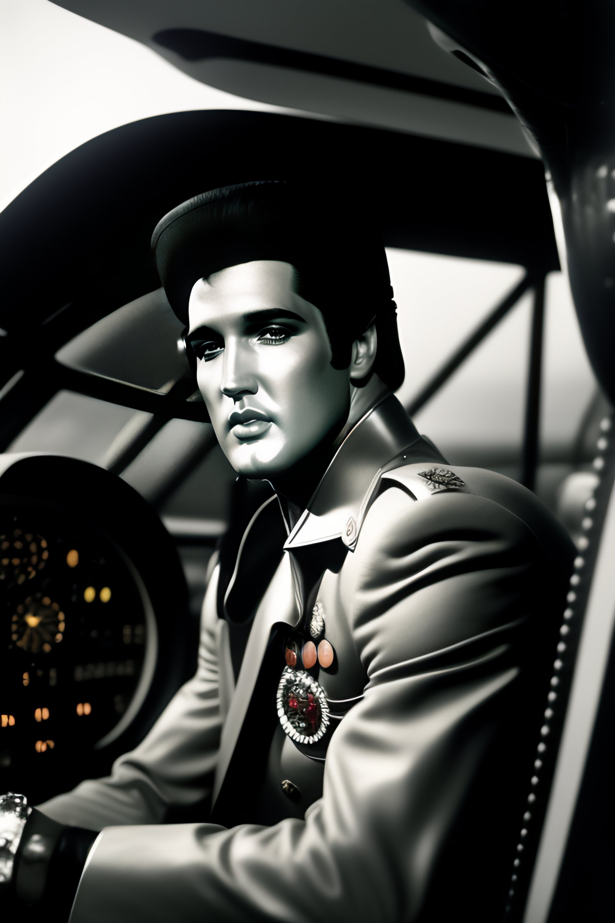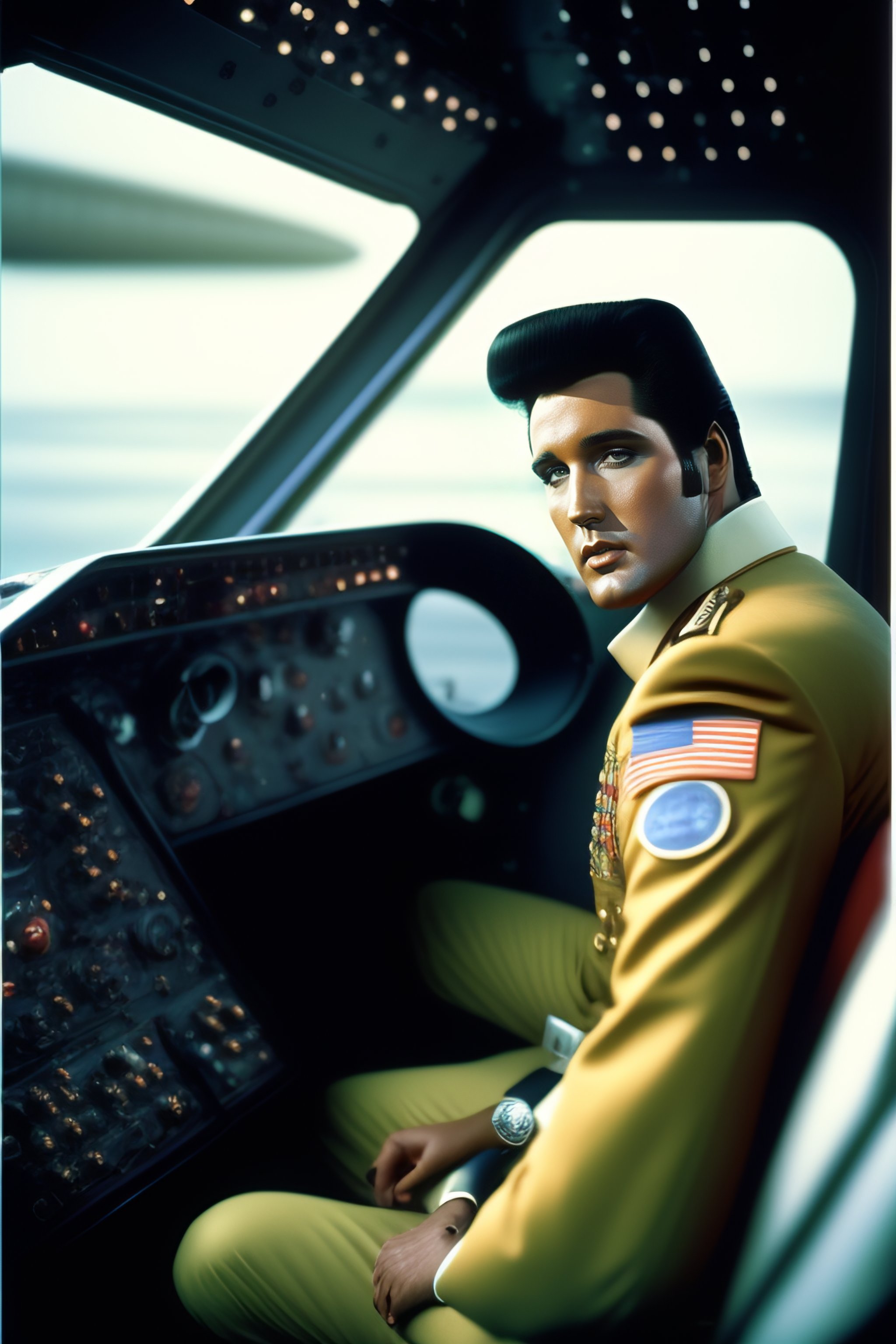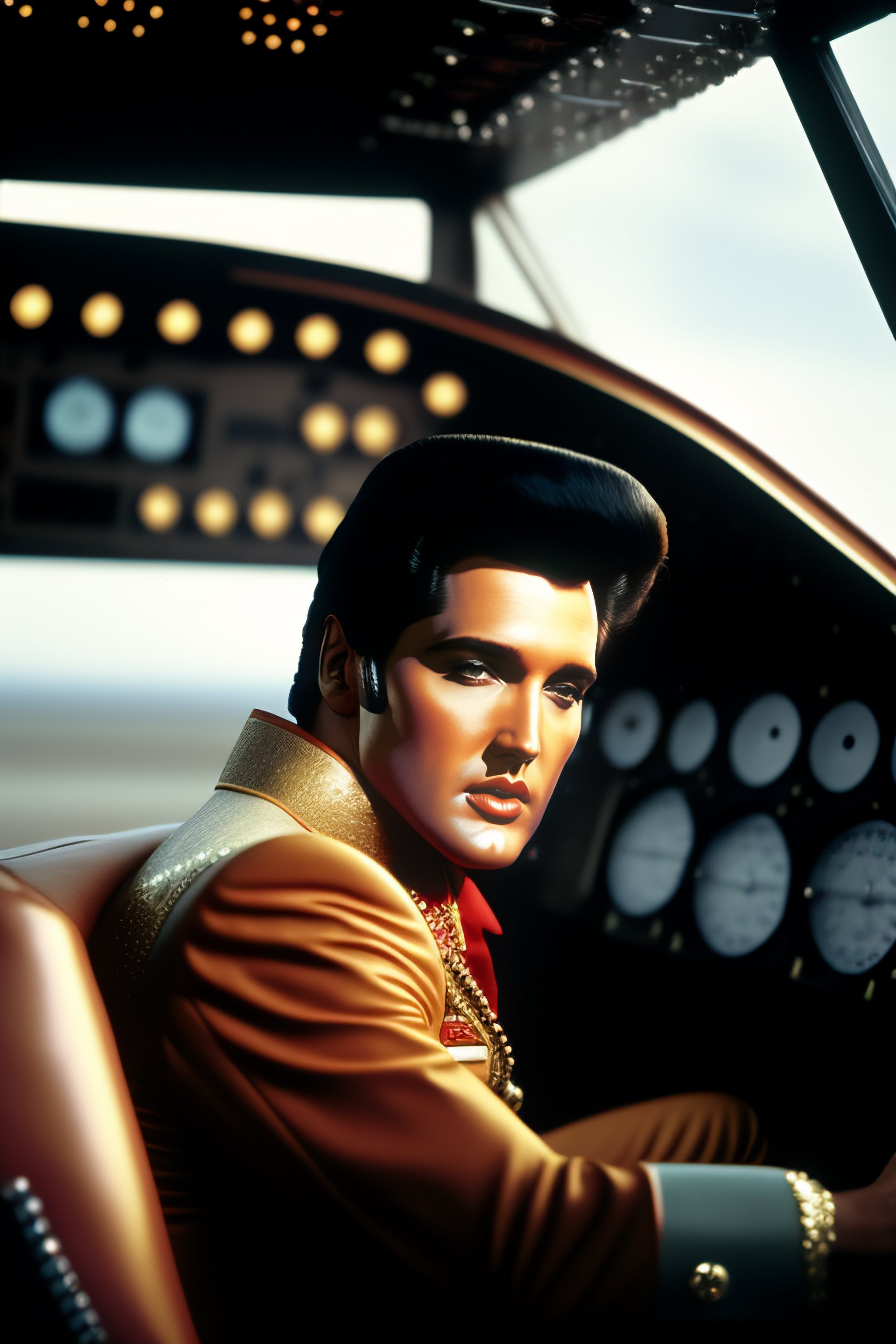 Elvis sitting in pilot seat of an airplane and cockpit control panel in view