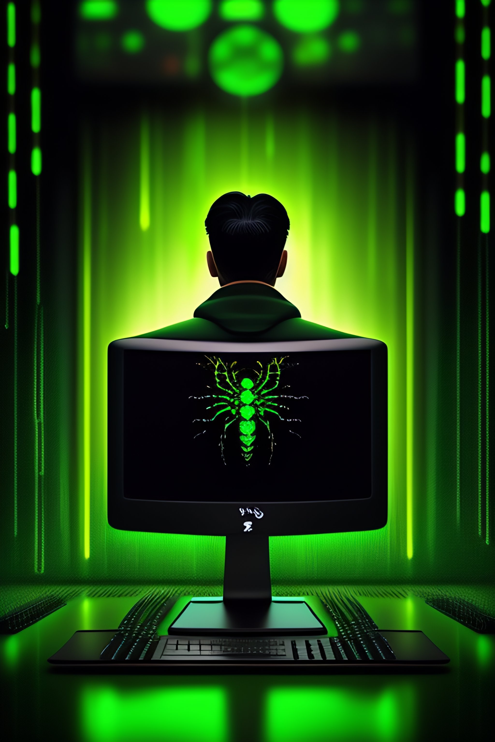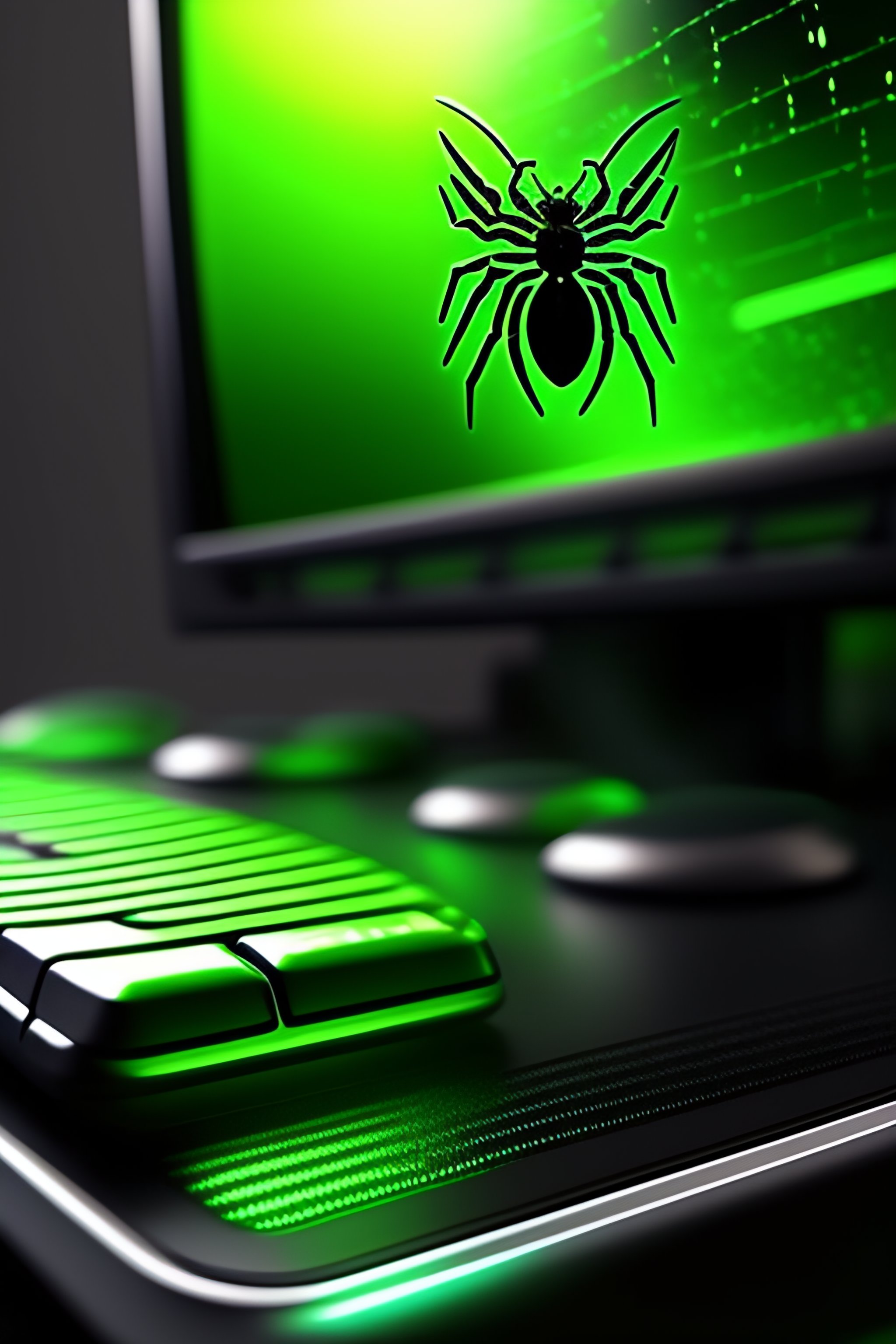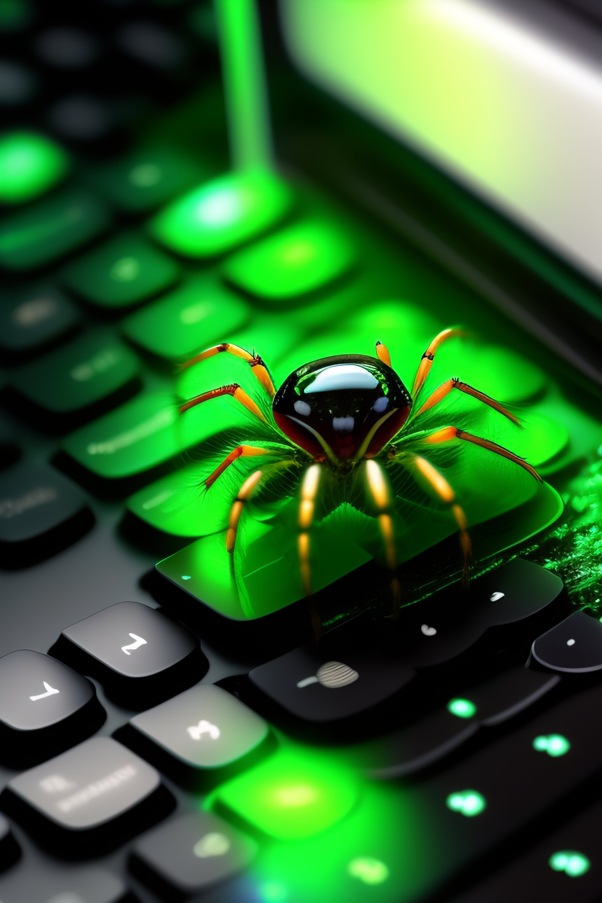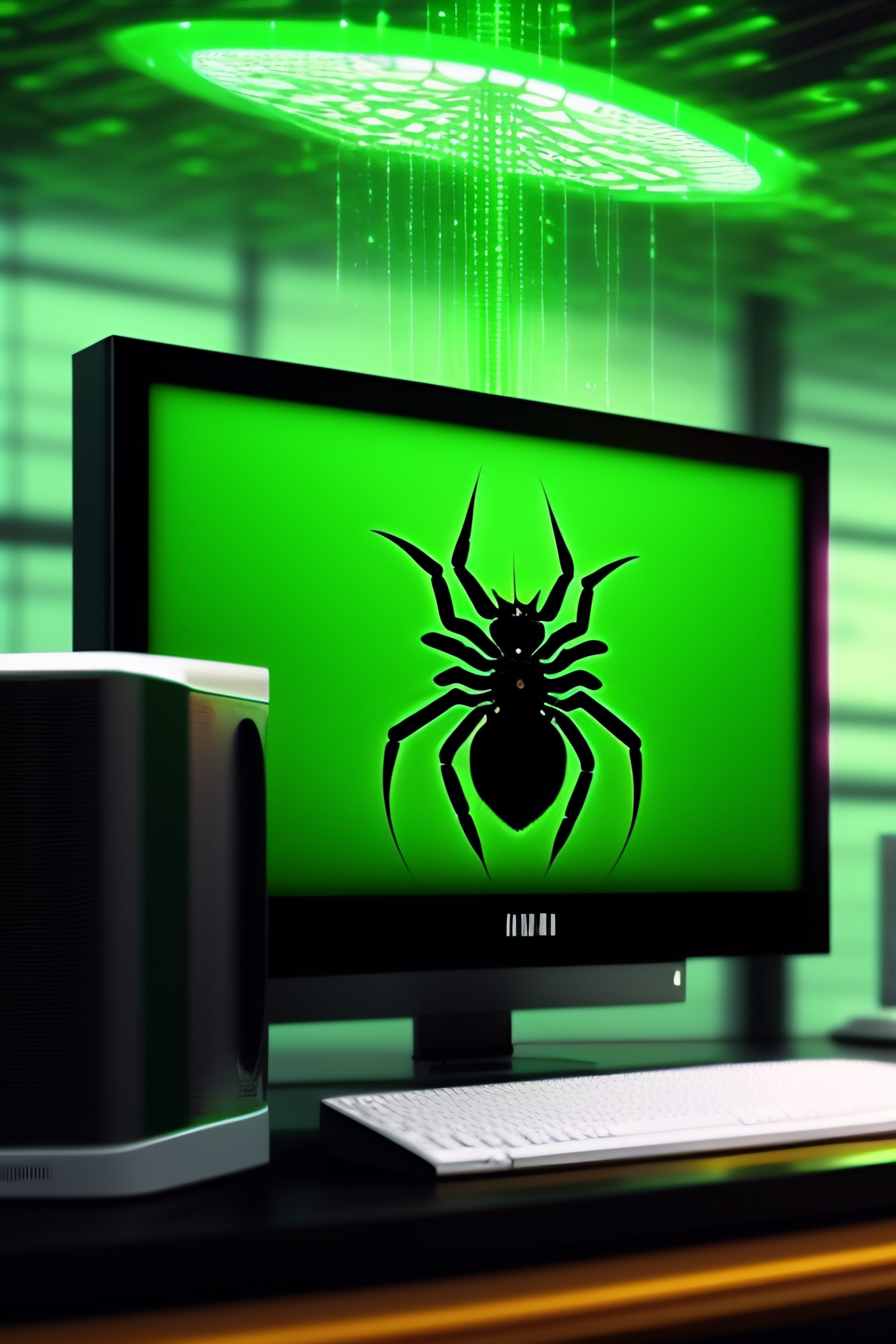 Digital art of a spider hanging over a computer keyboard, in the background a computer screen displays green rain code from the movie the matrix