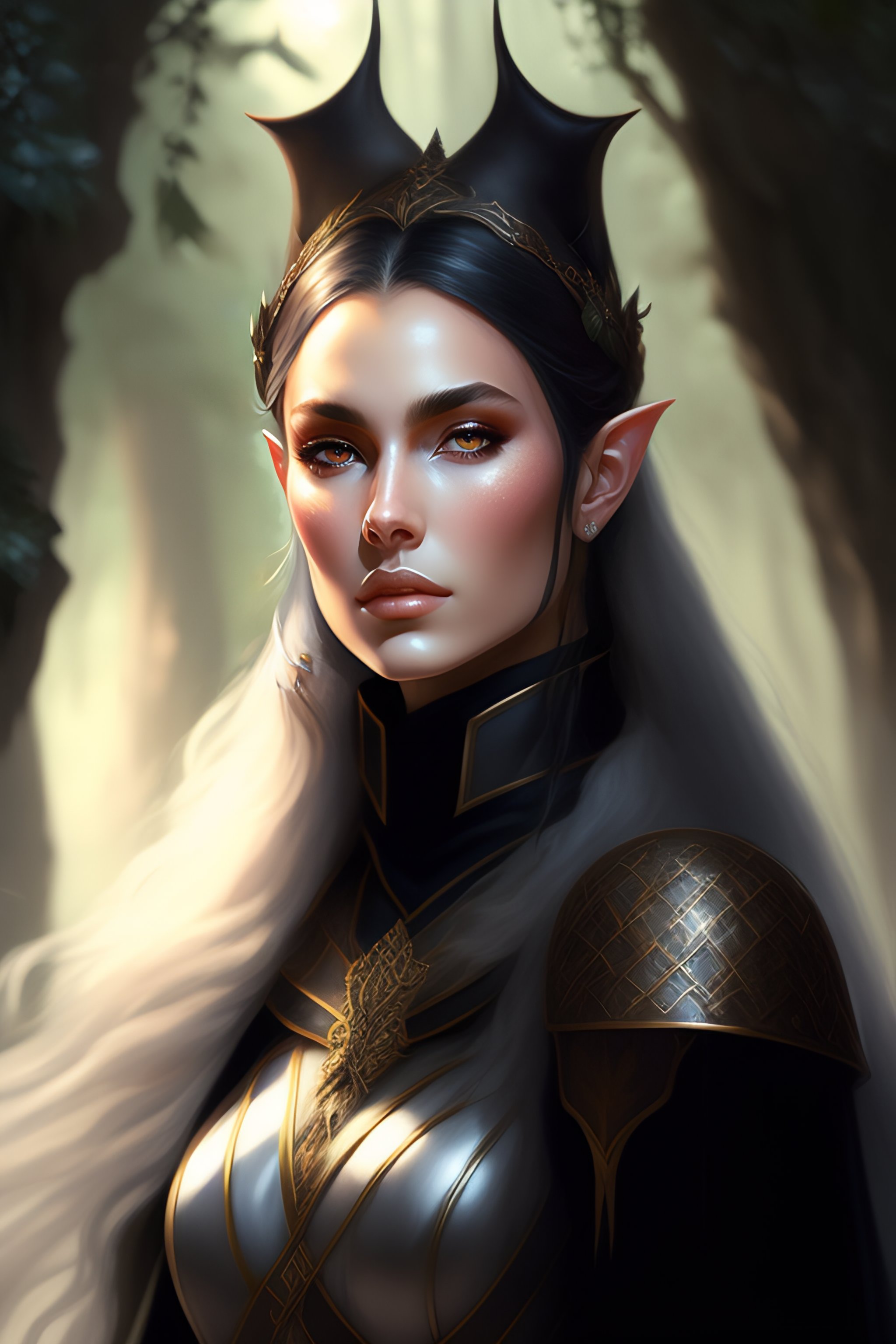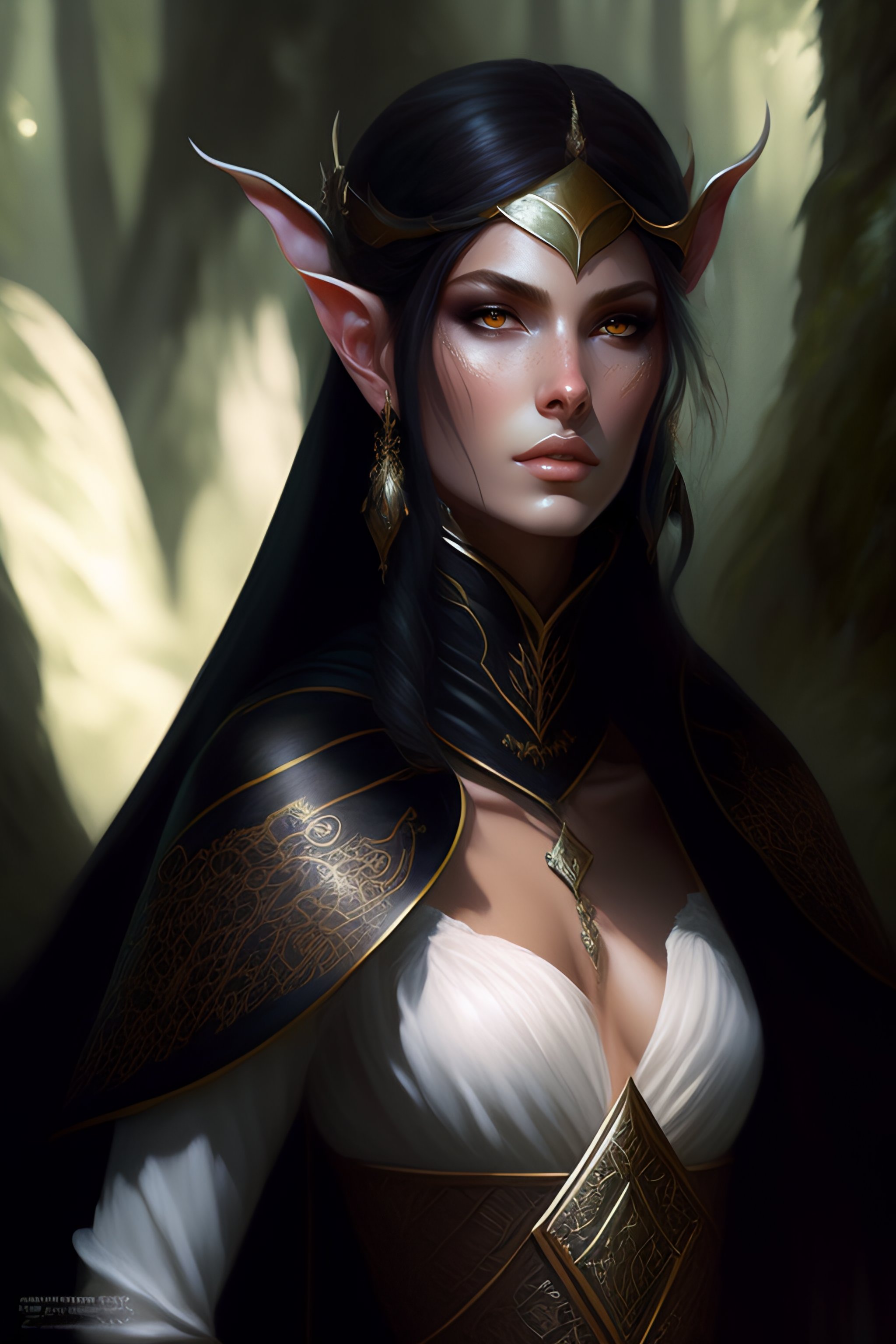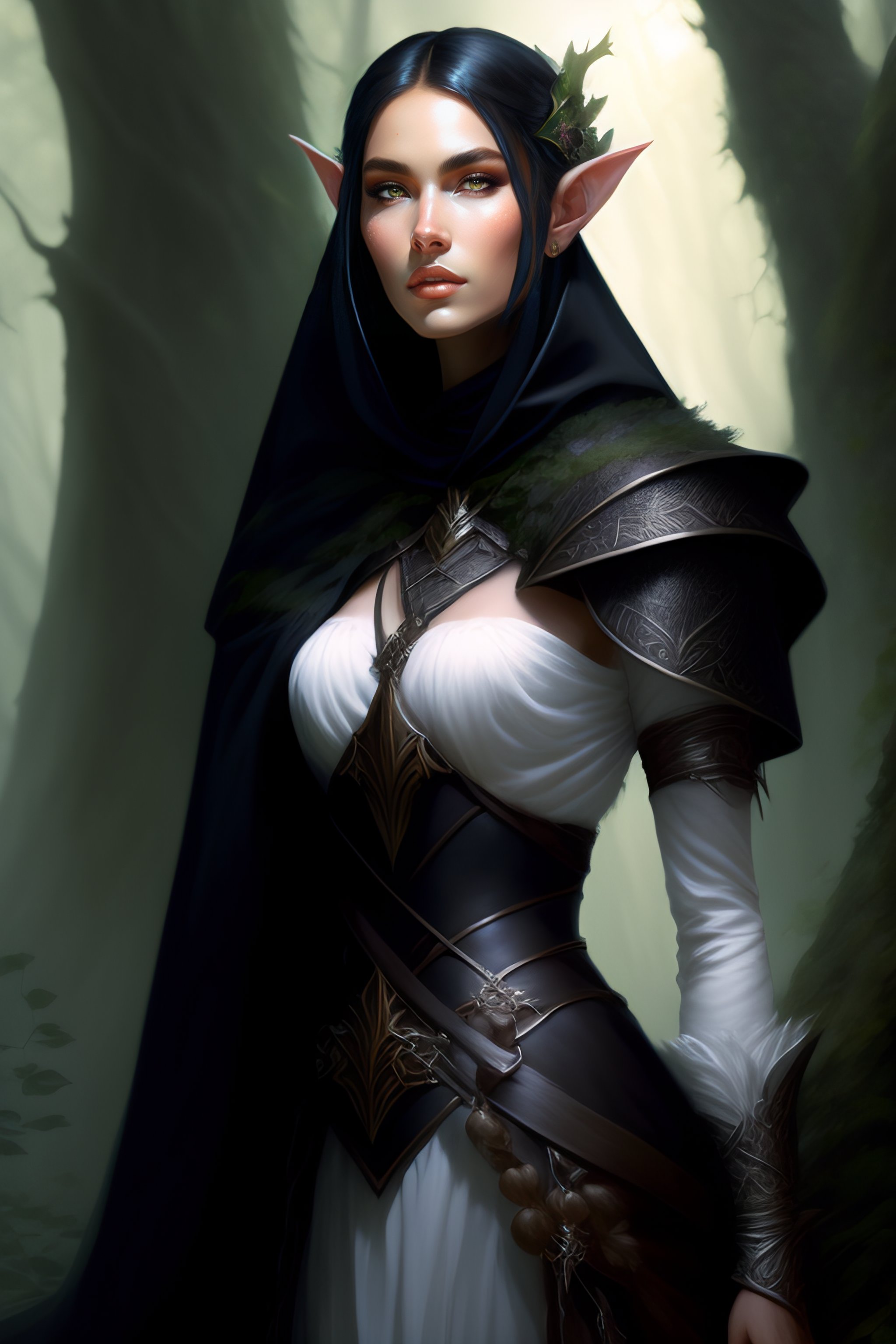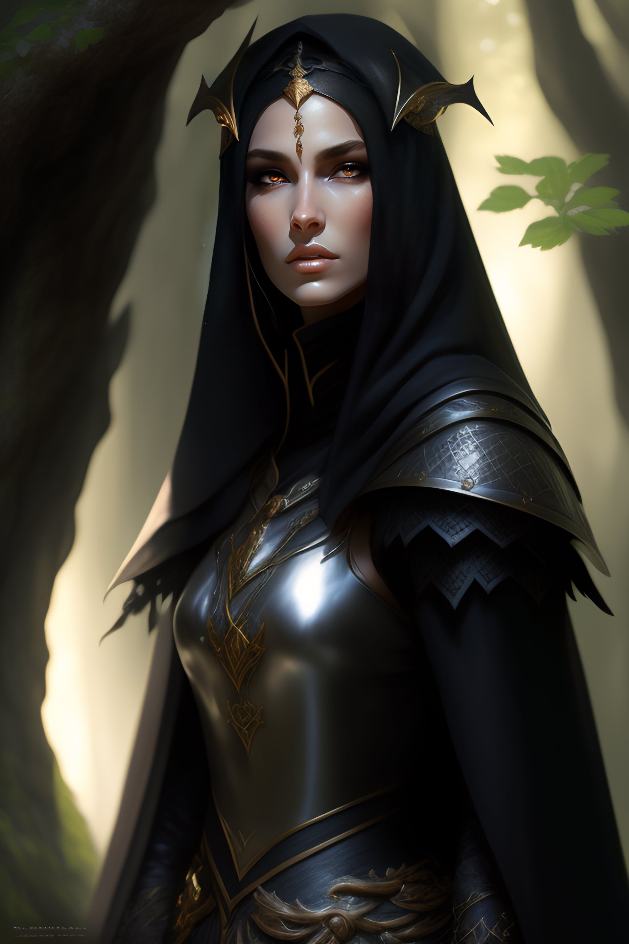Dungeons and dragons forest elf chieric character full body portrait, white skin, dark gothic black armor, wearing a black veil, dramatic light, dungeon background, 2 0 0 mm focal length, painted by stanley lau, painted by greg rutkowski, painted by stanley artgerm, brom, digital art, trending on artstation