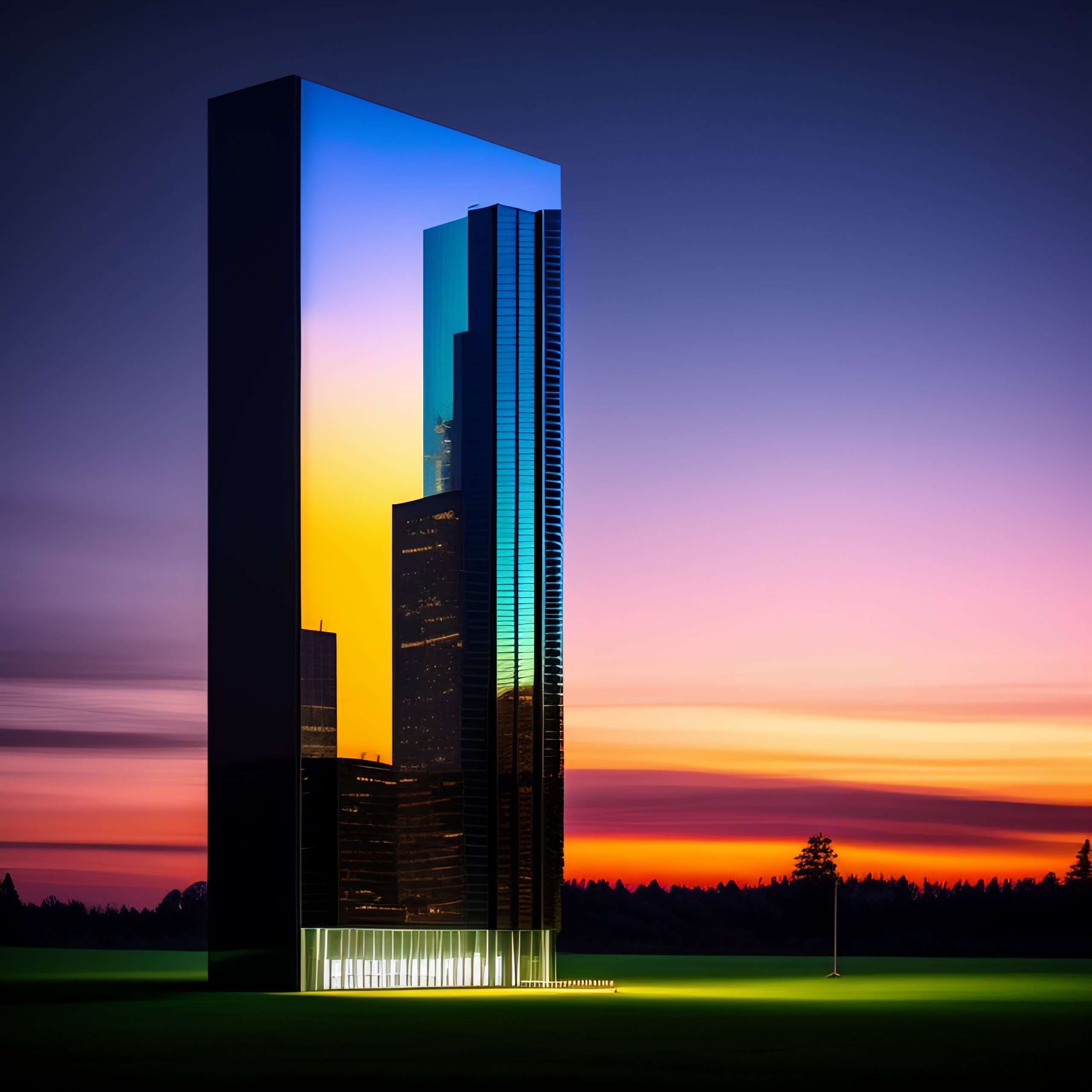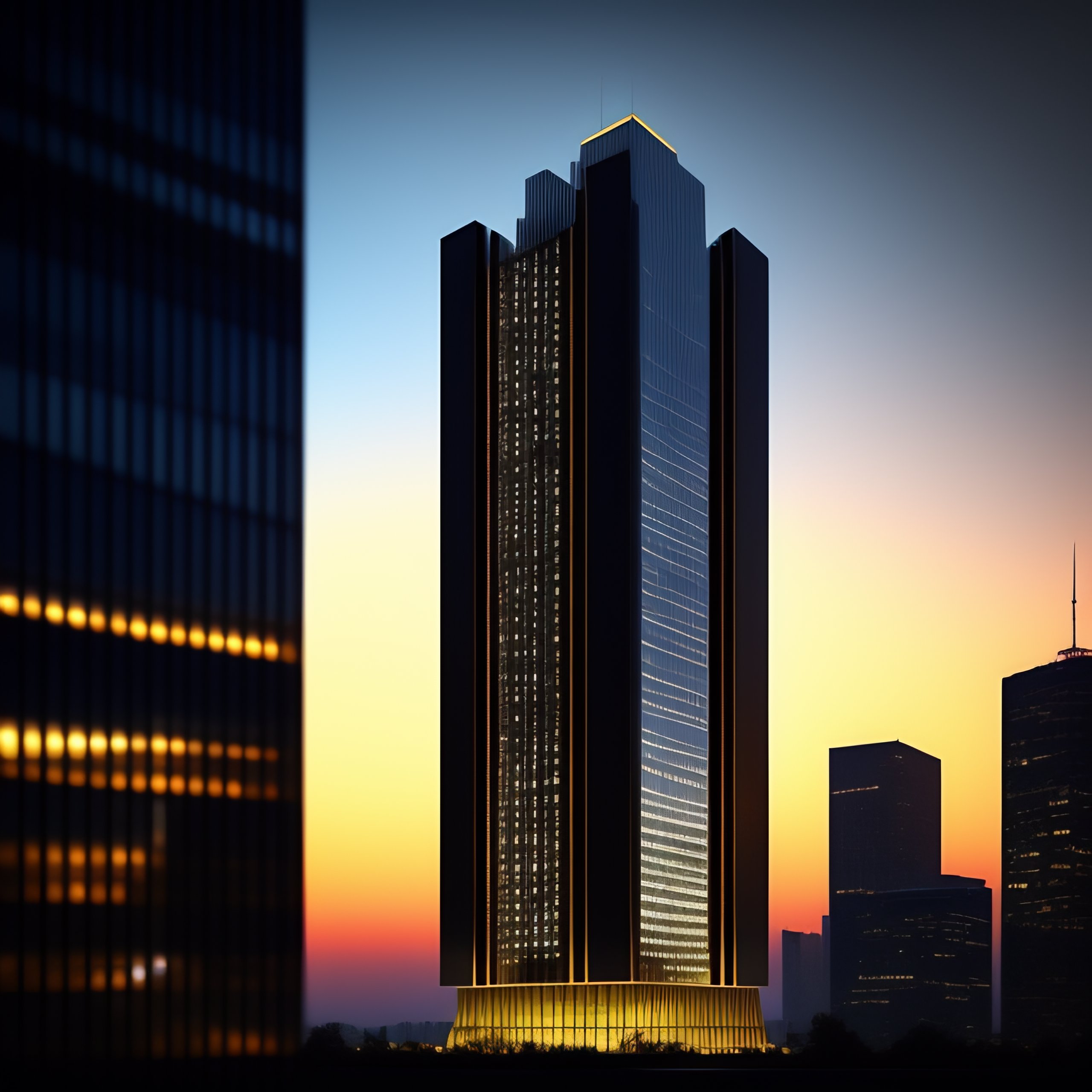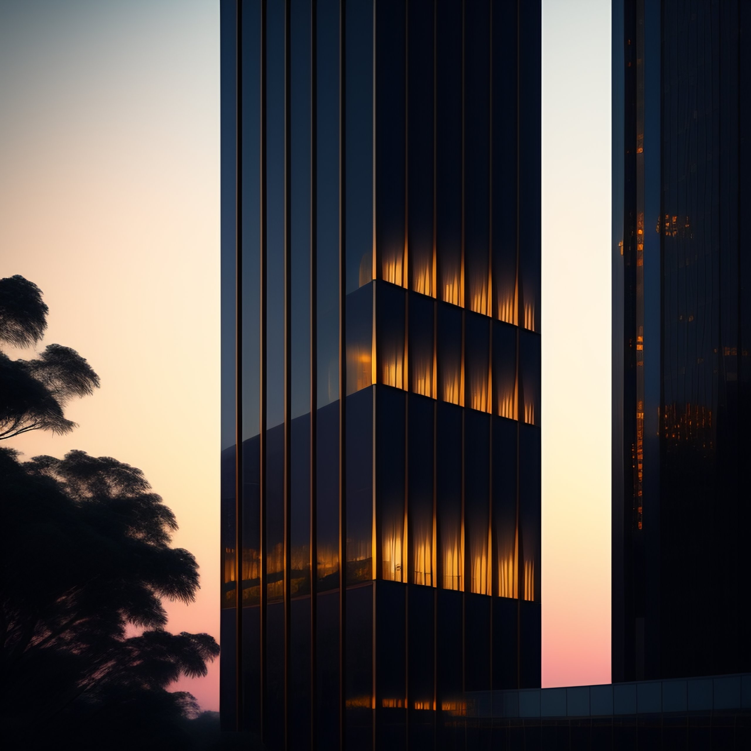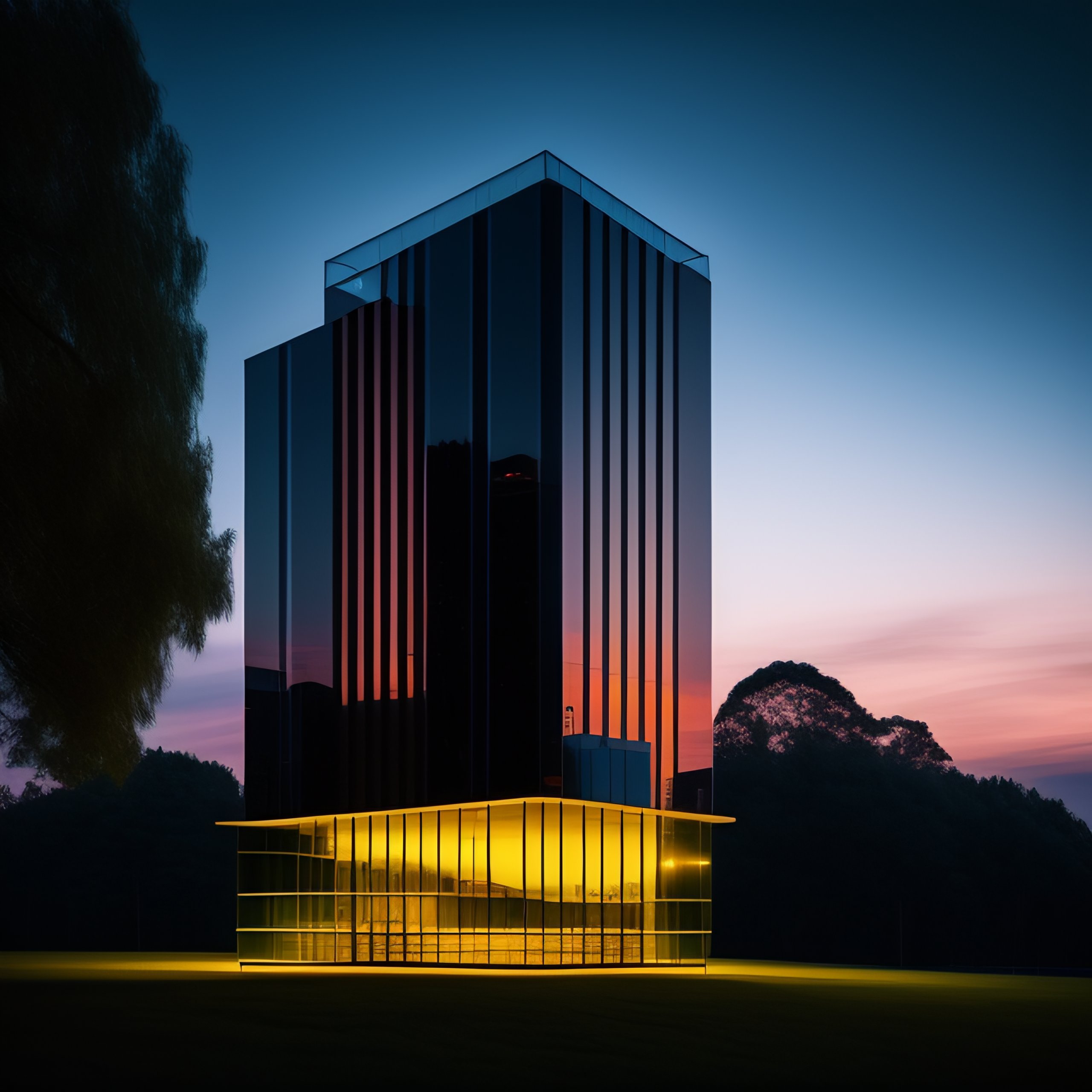 A modern glass tower skyscraper shining during a dark night in the style of edward hopper