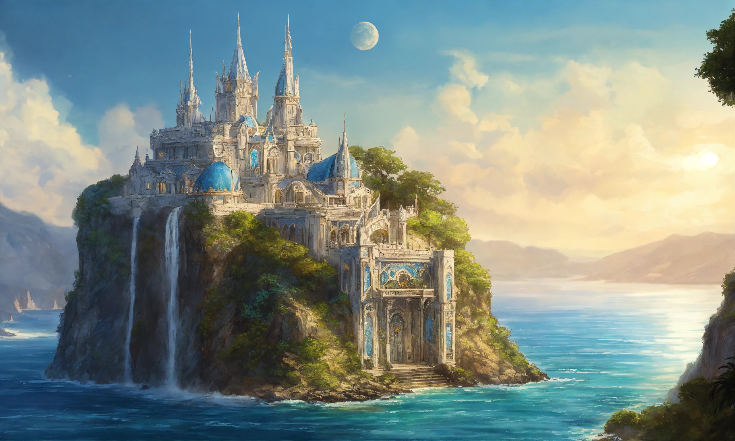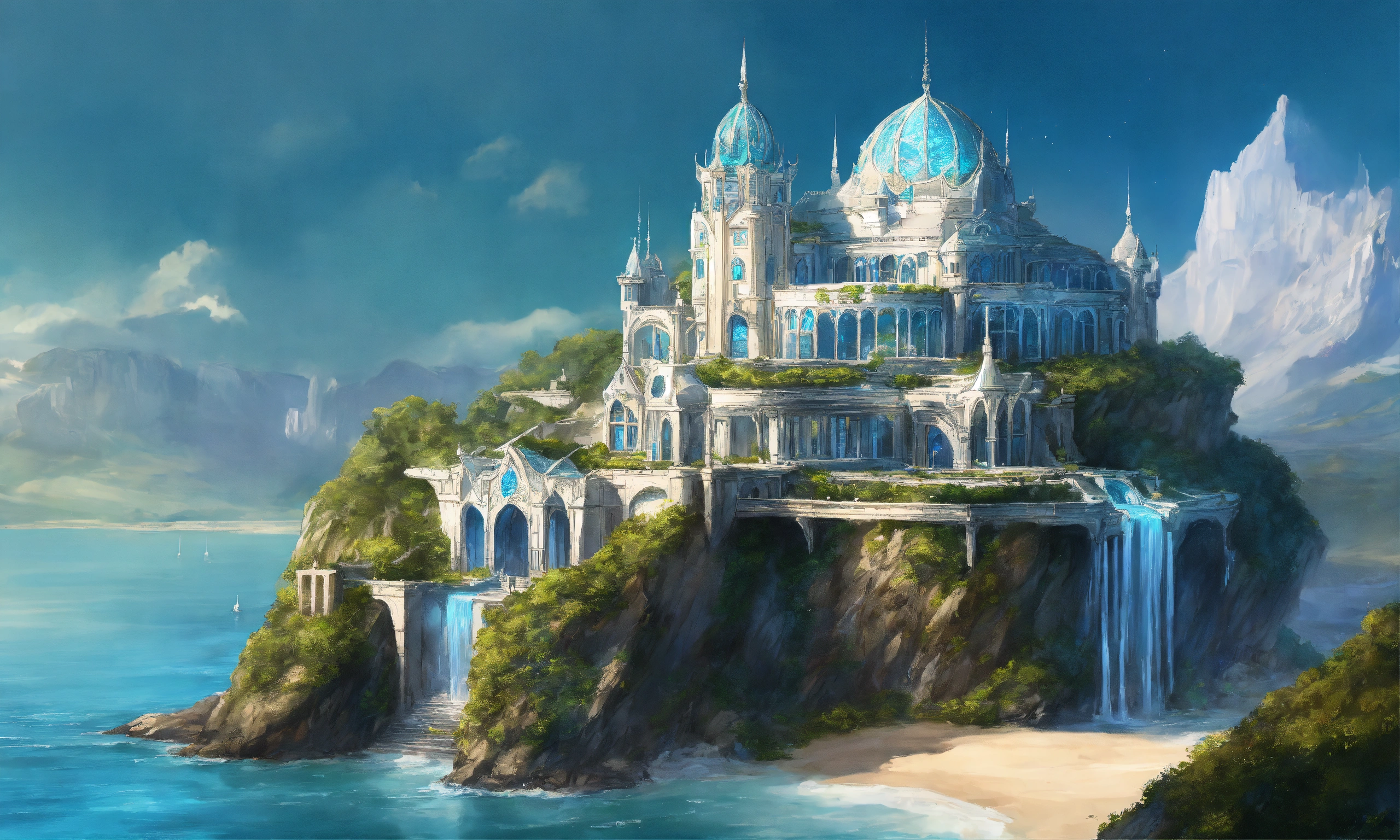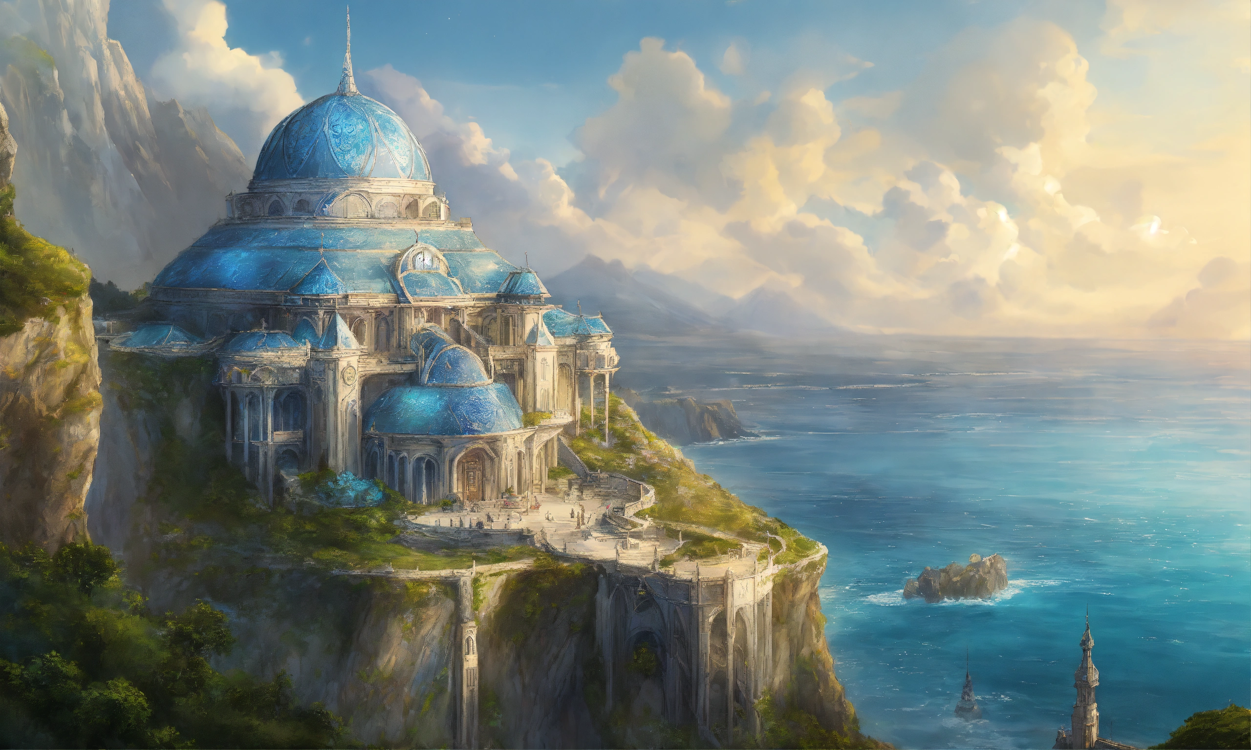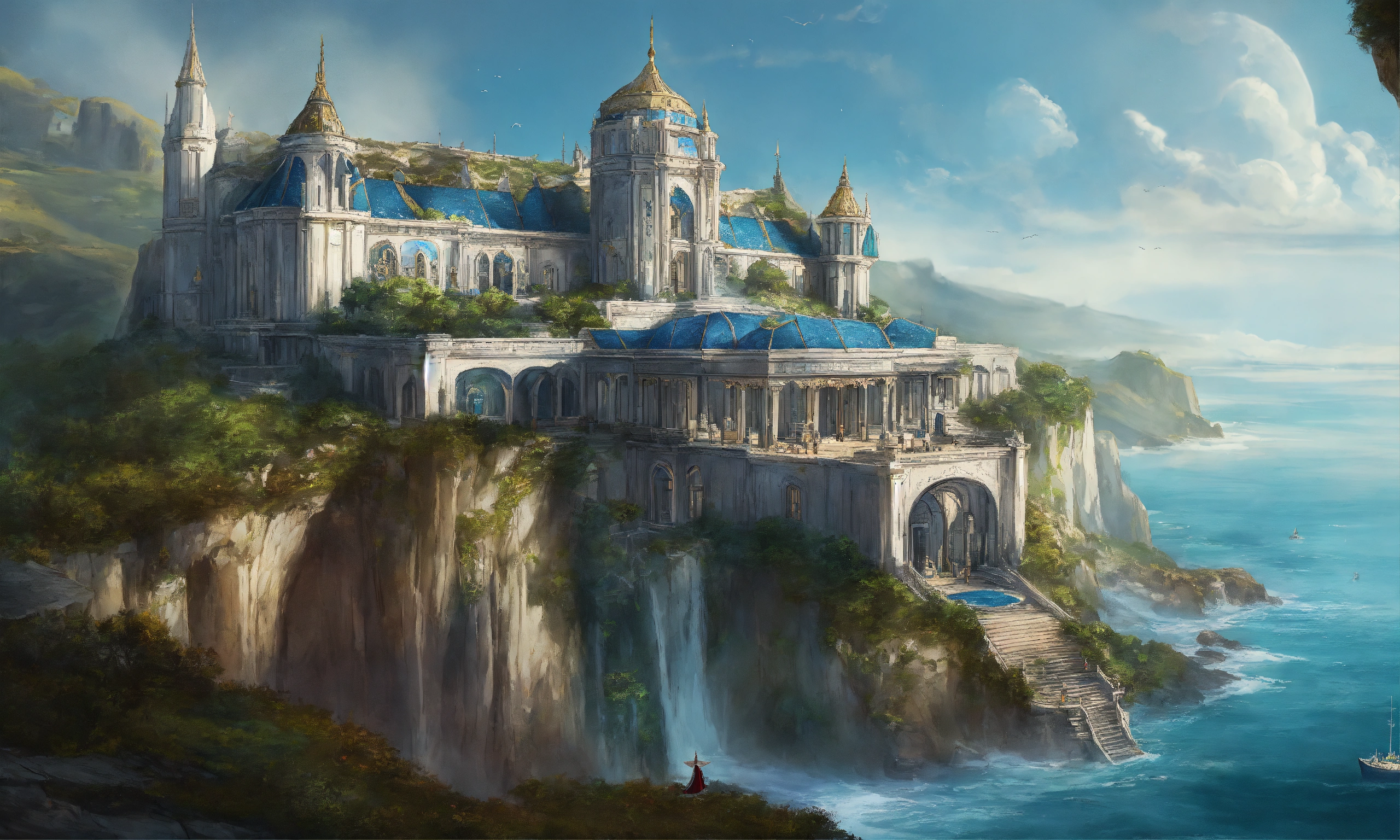 Drawing of the full image of an elegant white high elf sci fi palace with a blue roof on a cliff overlooking the ocean, elven architecture, immensely detailed