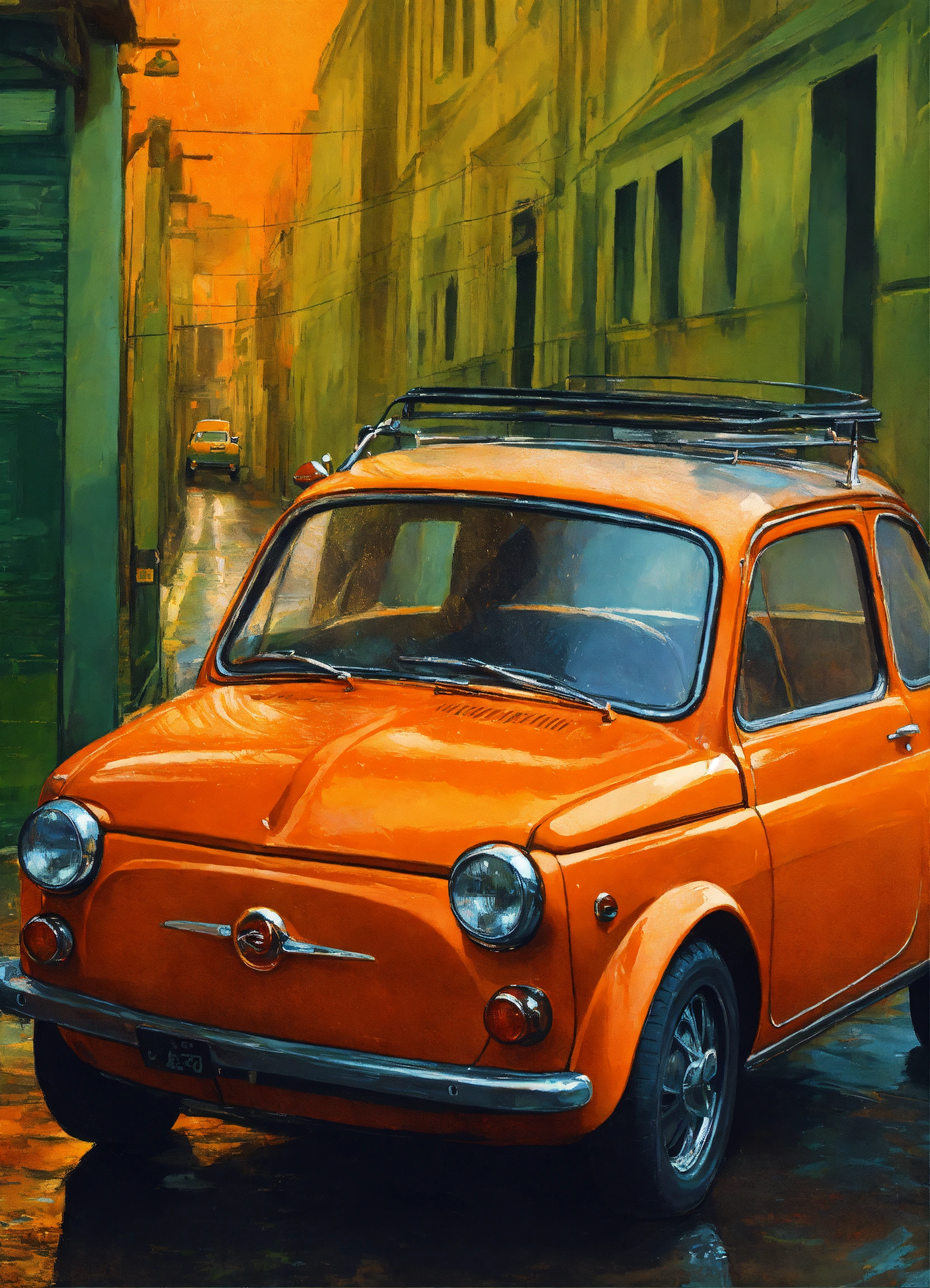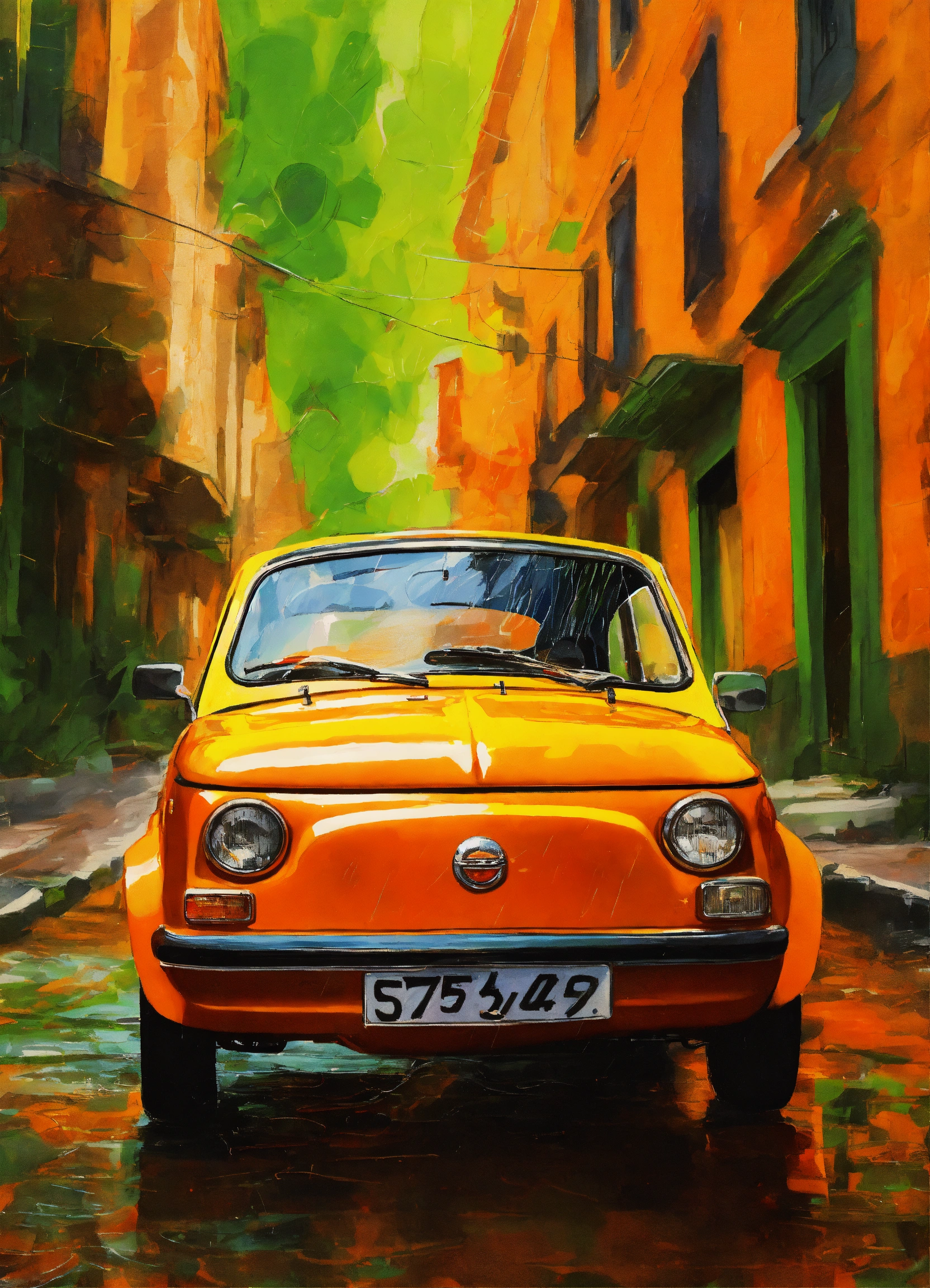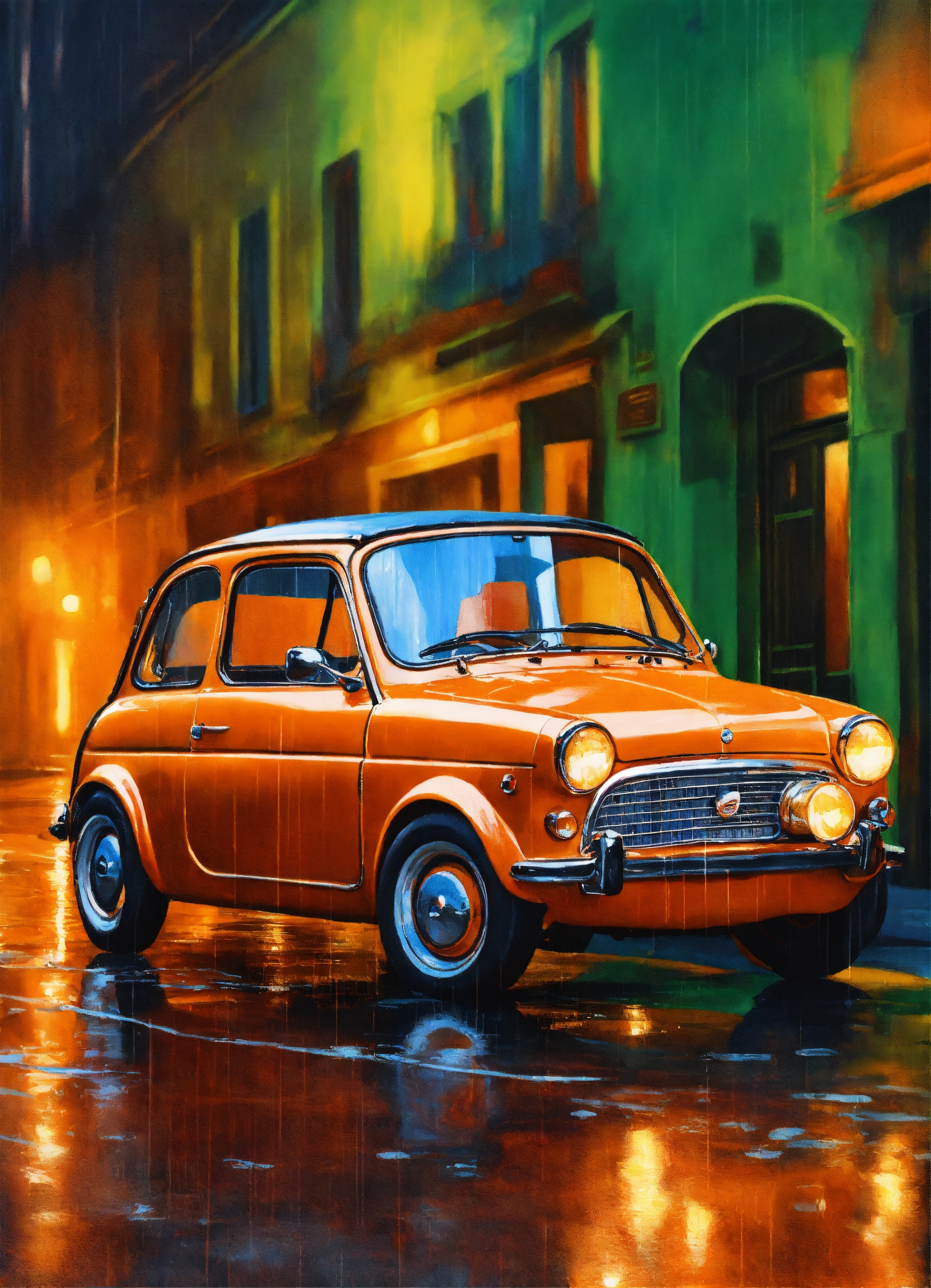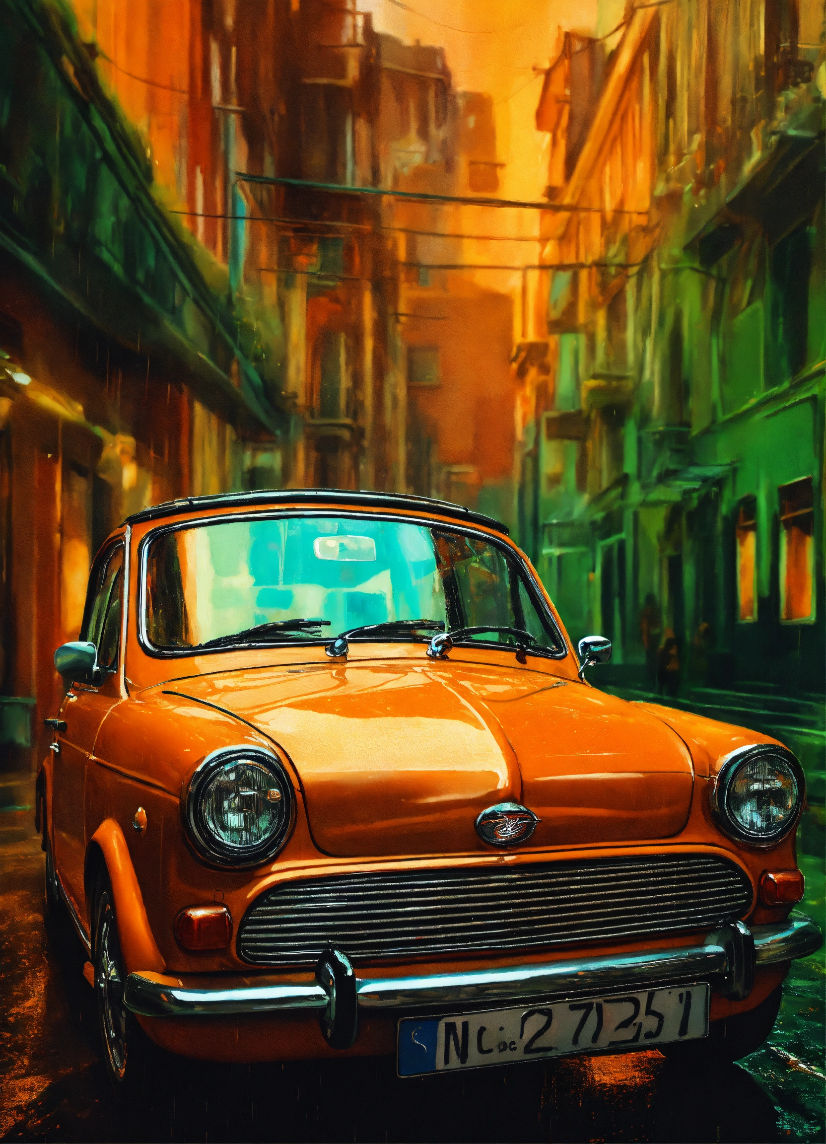 A oranges rainnig, in the style of digital painting and drawing, classic american cars, iconic album covers, synthetism-inspired, cinquecento, shock art, green backgroundwimmelbilder --s 750