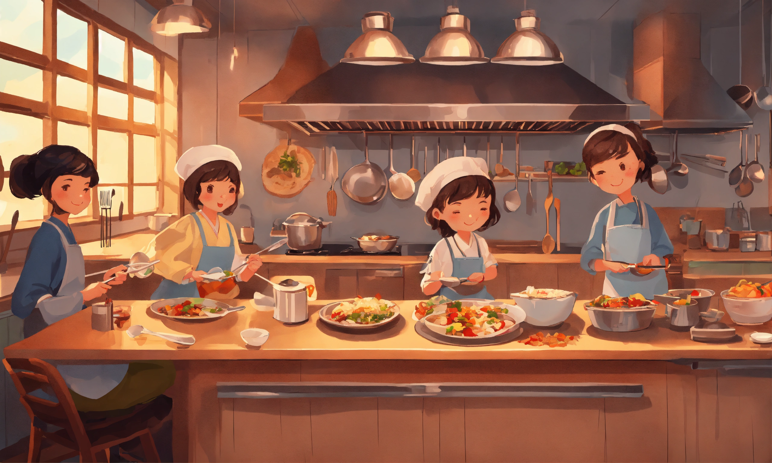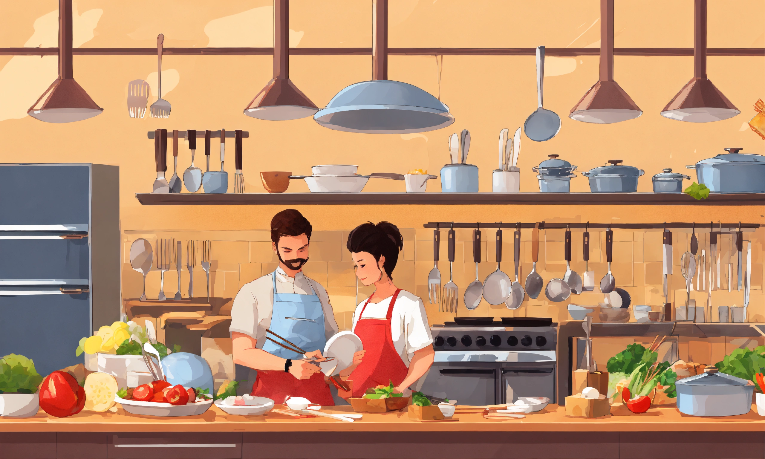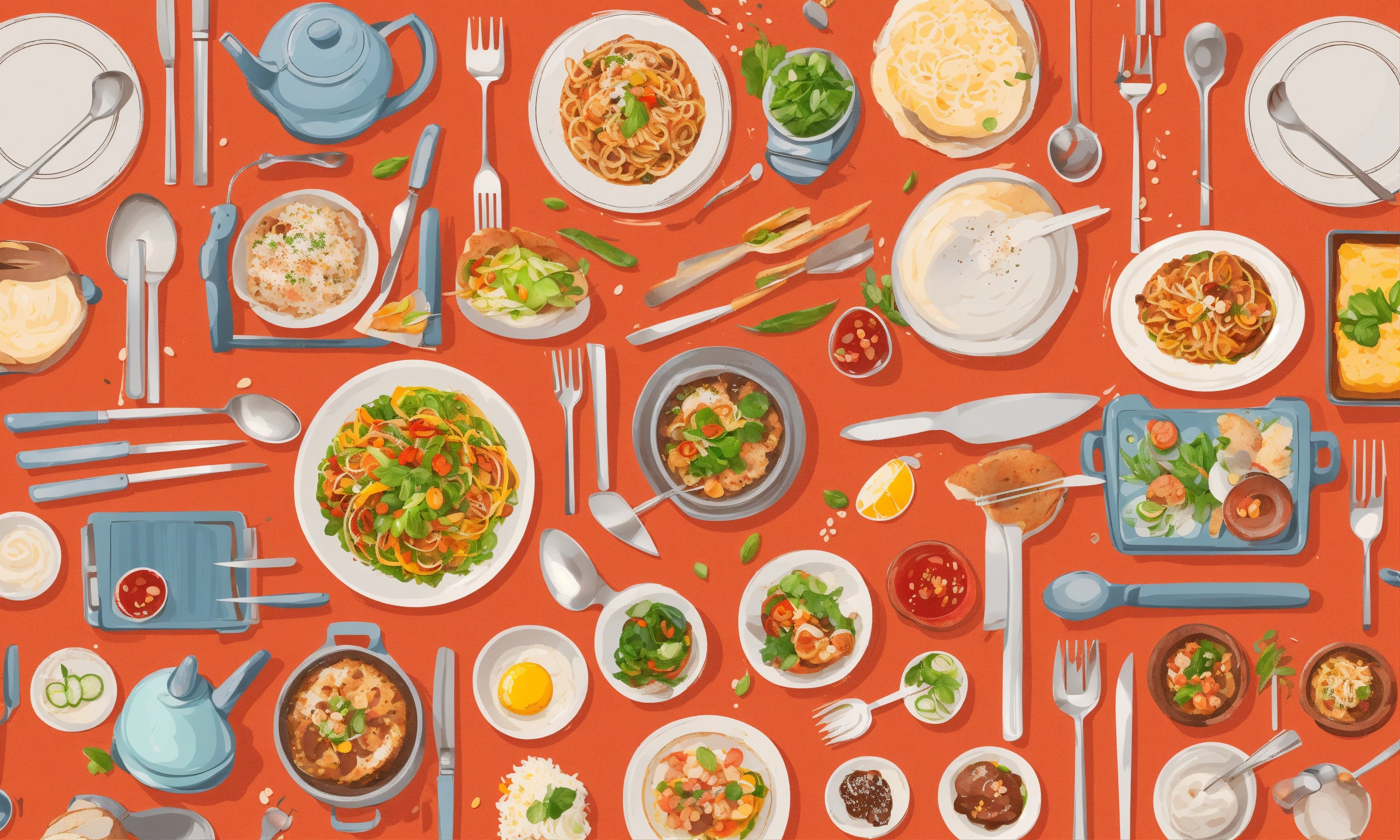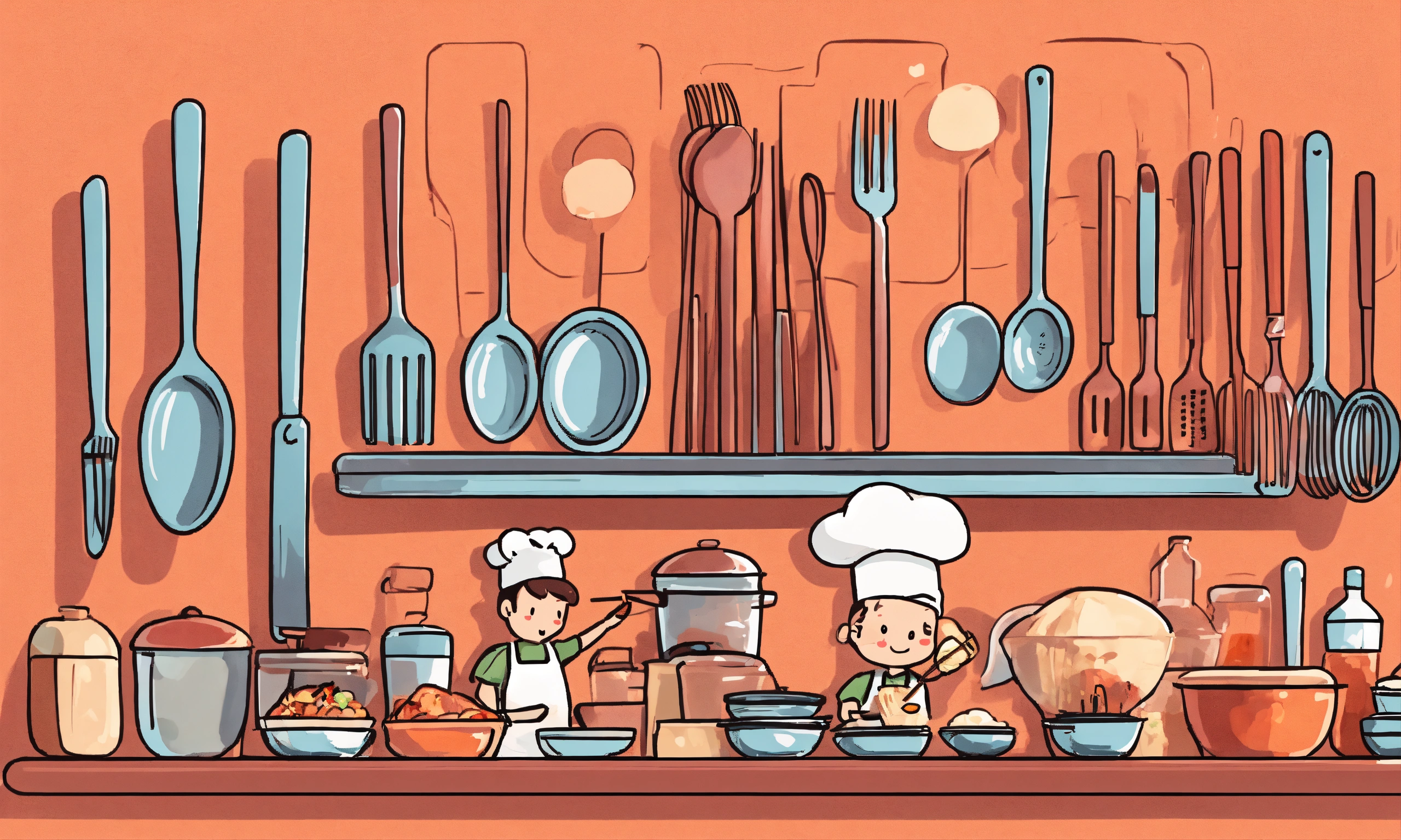 Very high detailed, ultra realistic, 2d illustration, tiny people with giant kitchen utensils. person holding fork, knife, spoon, chopsticks. cute isolated characters. cartoon style. hand drawn vector illustration. food service, restaurant concept