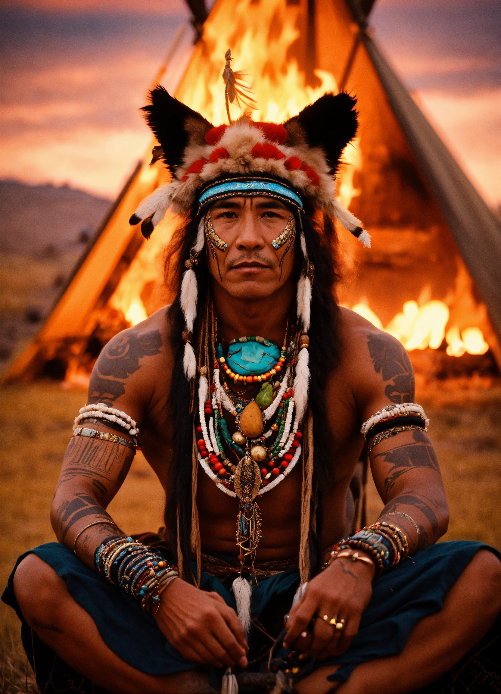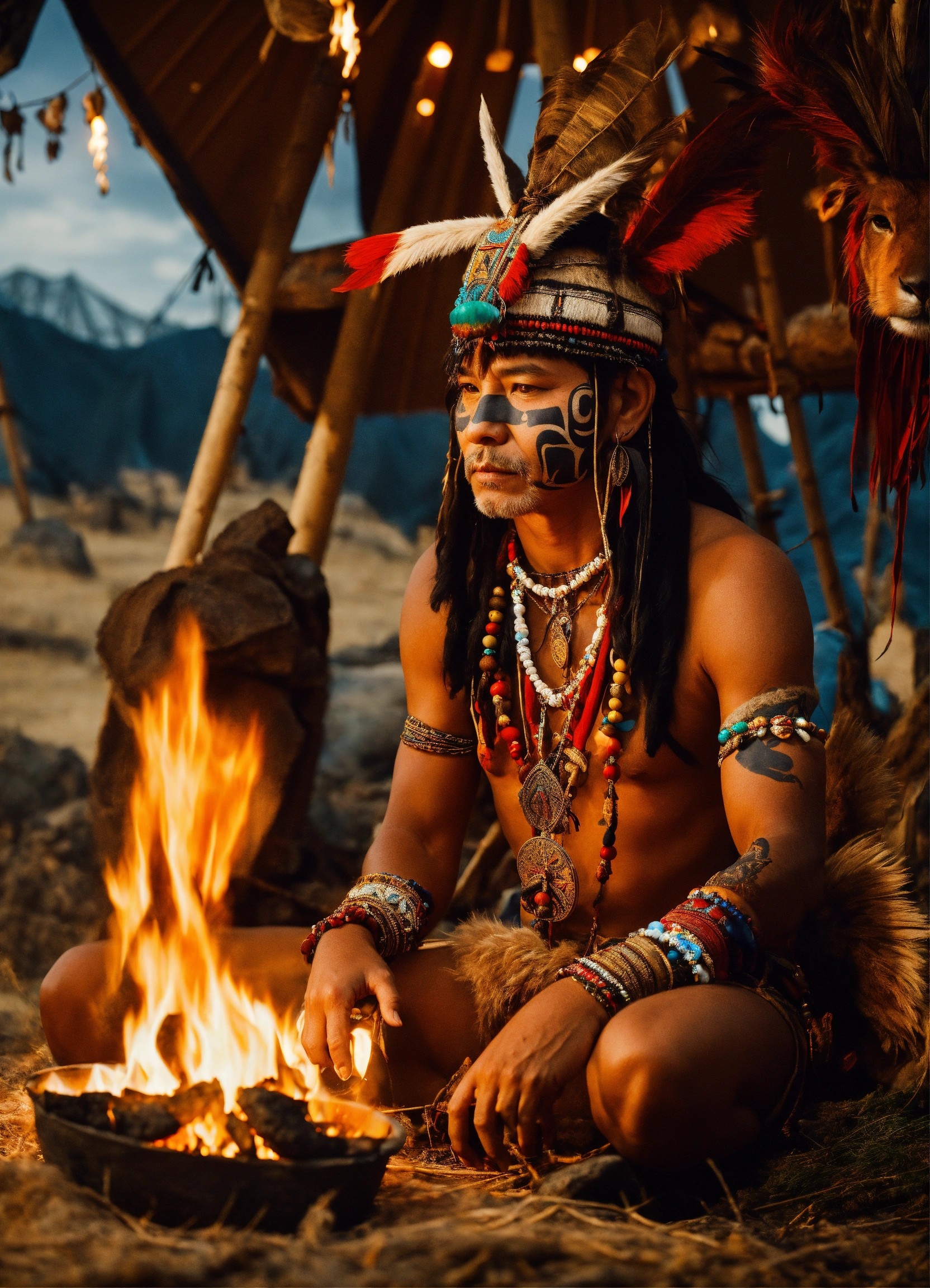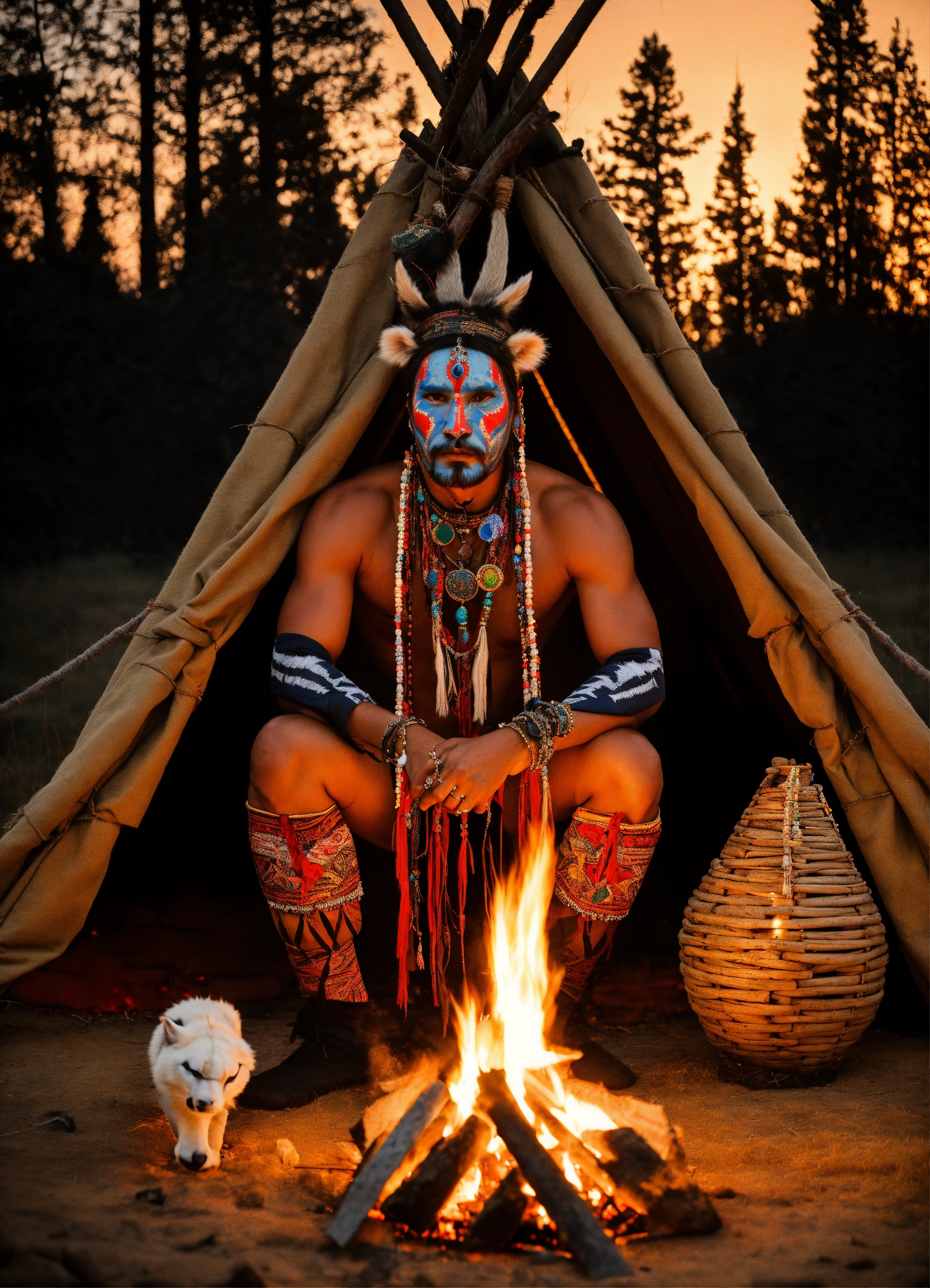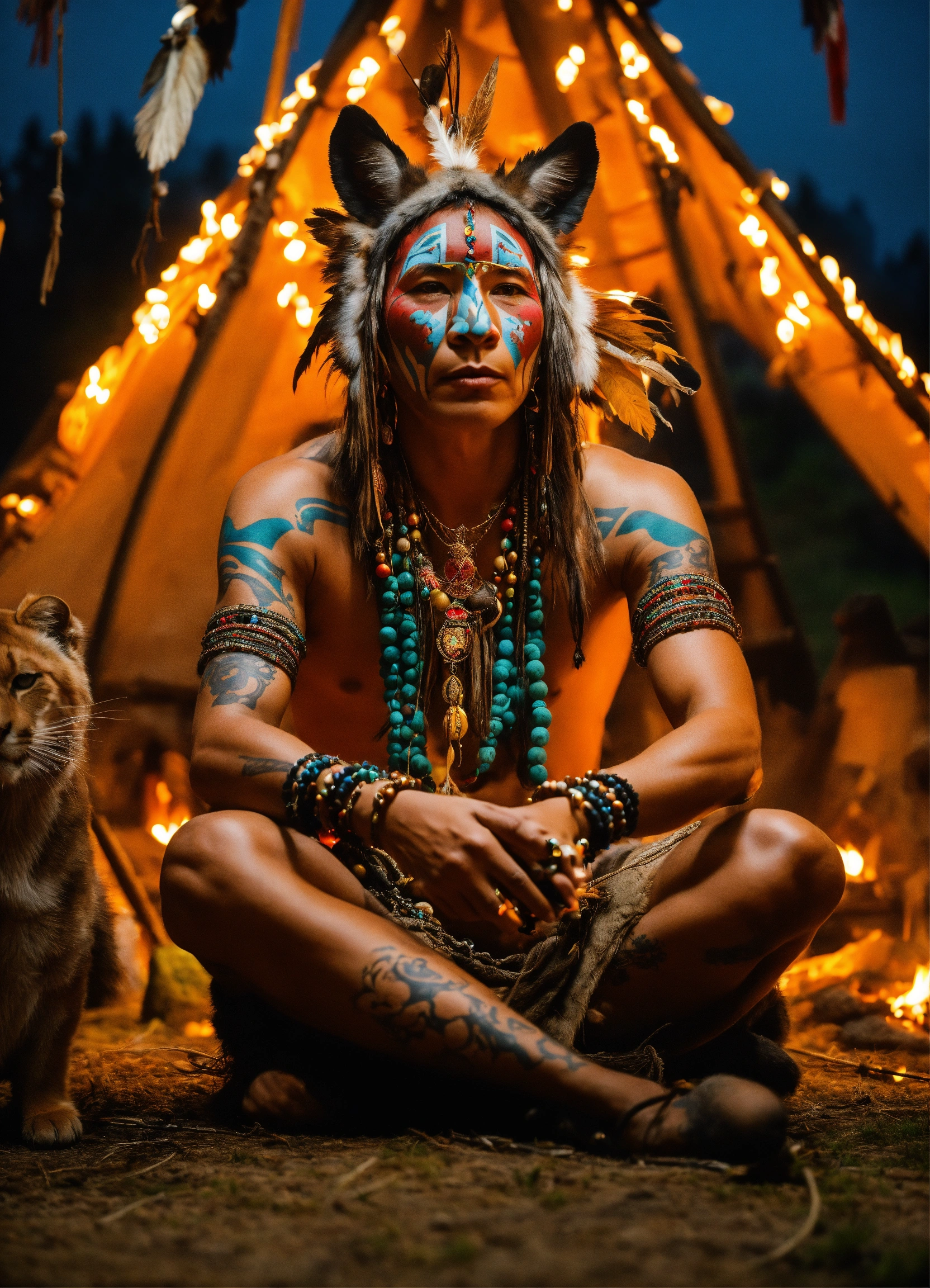 Puma head ancestral shaman, antropomorph, animal, surrealistic, holding a rattle, by the fire, big teepee in the background, jewlery