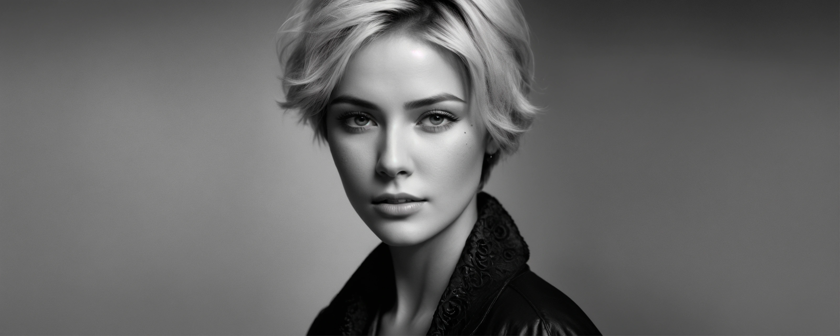 Photo portrait of a blonde woman, short hair, with light eyes, with a mole, with skin details, 16k image quality, ultra-realistic, black and white, professional photo studio, high definition, harcourt studio style, with a shadow on the face, black background