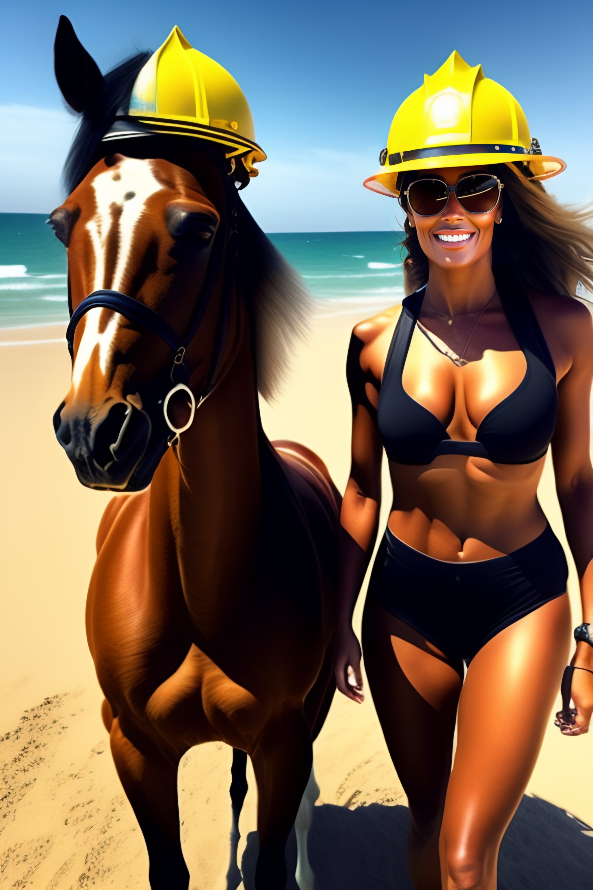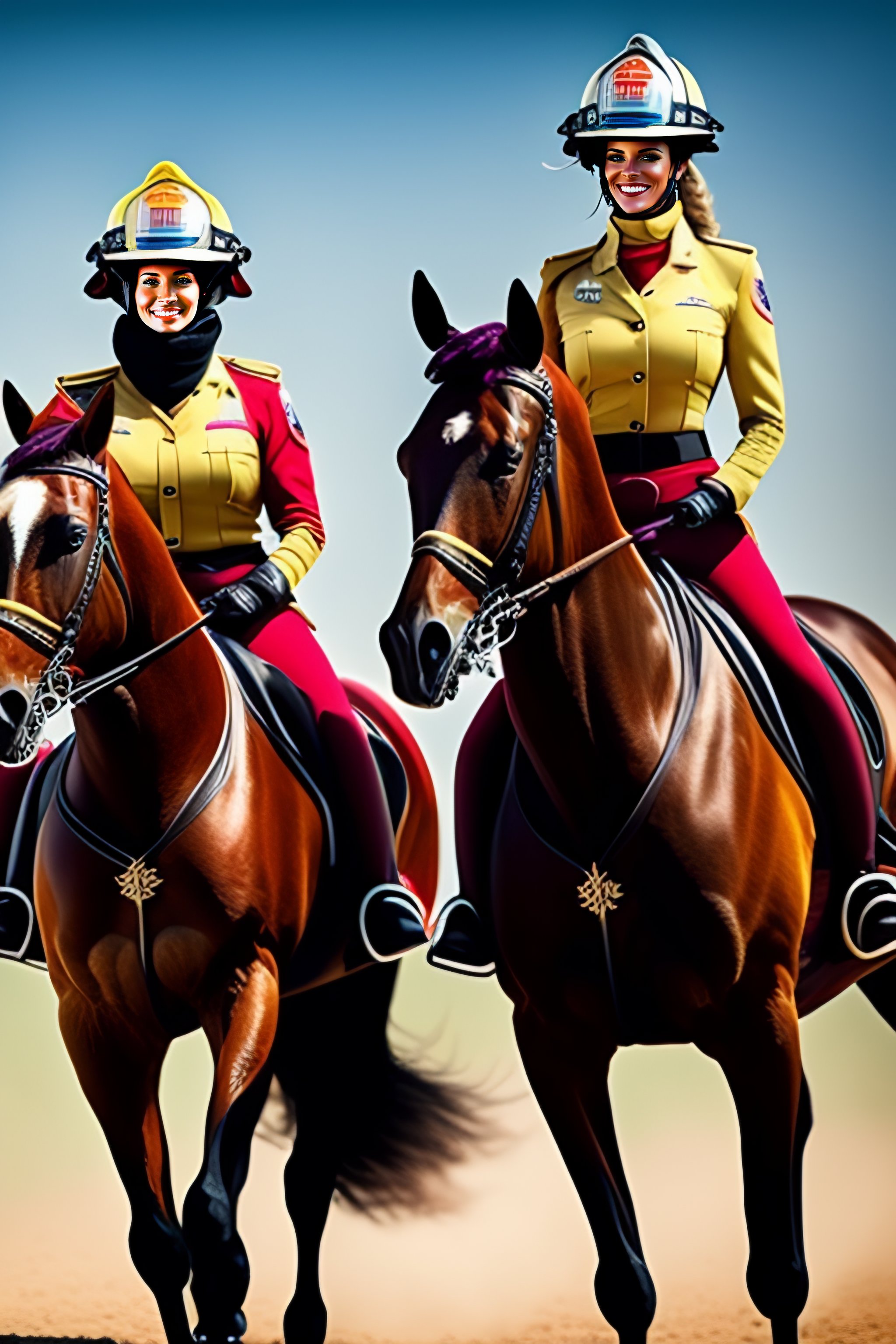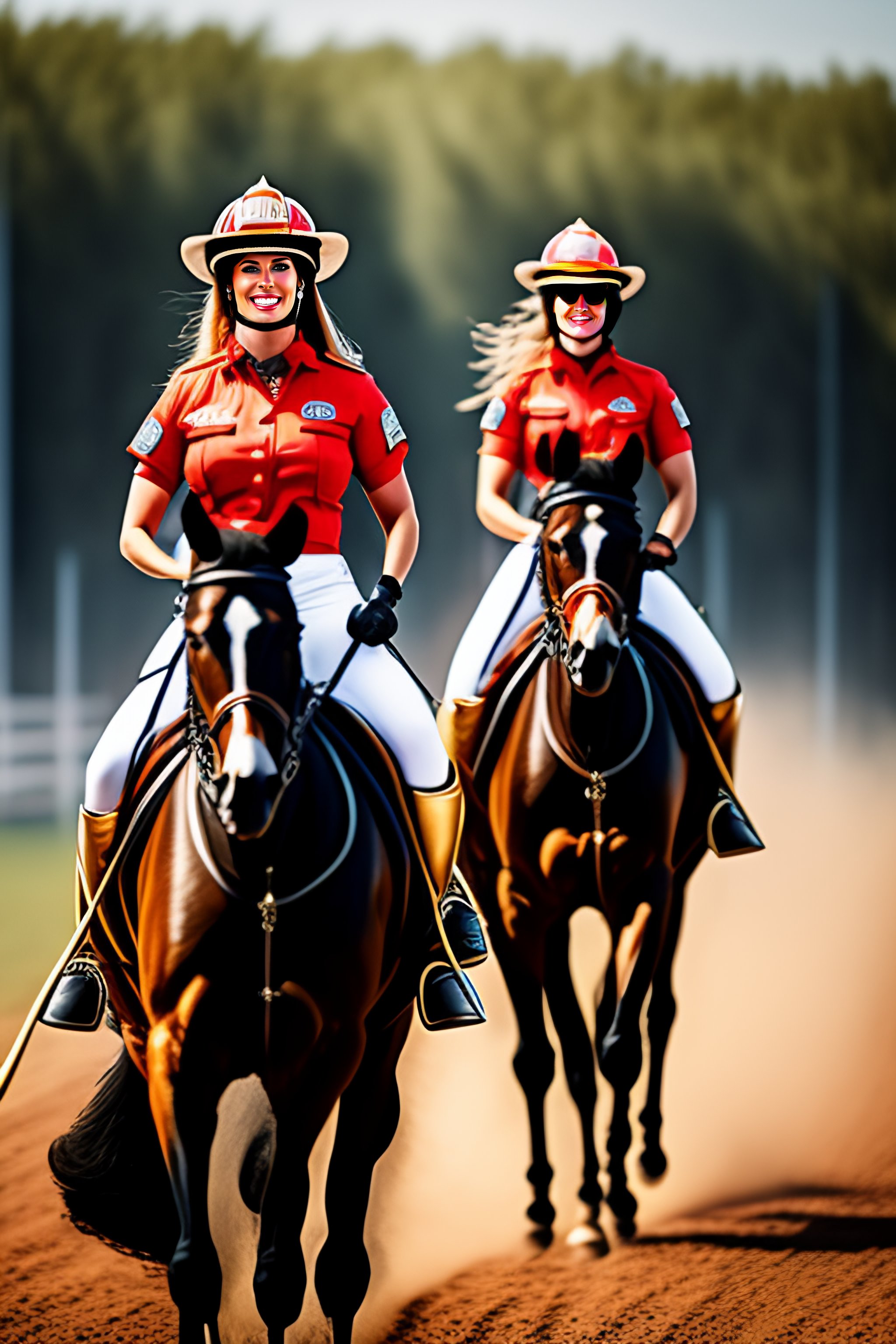 Female firefighters riding horses in bikinis