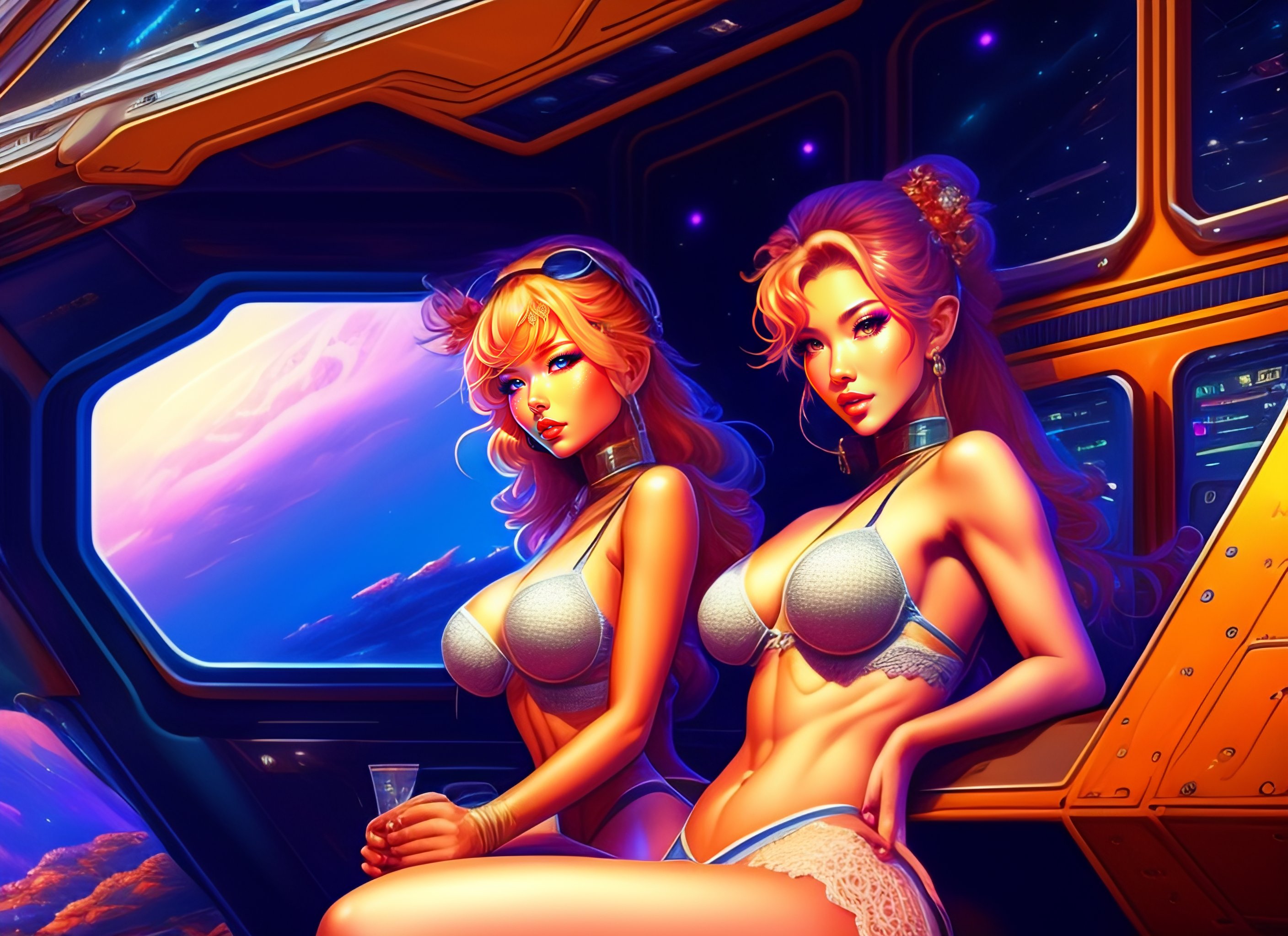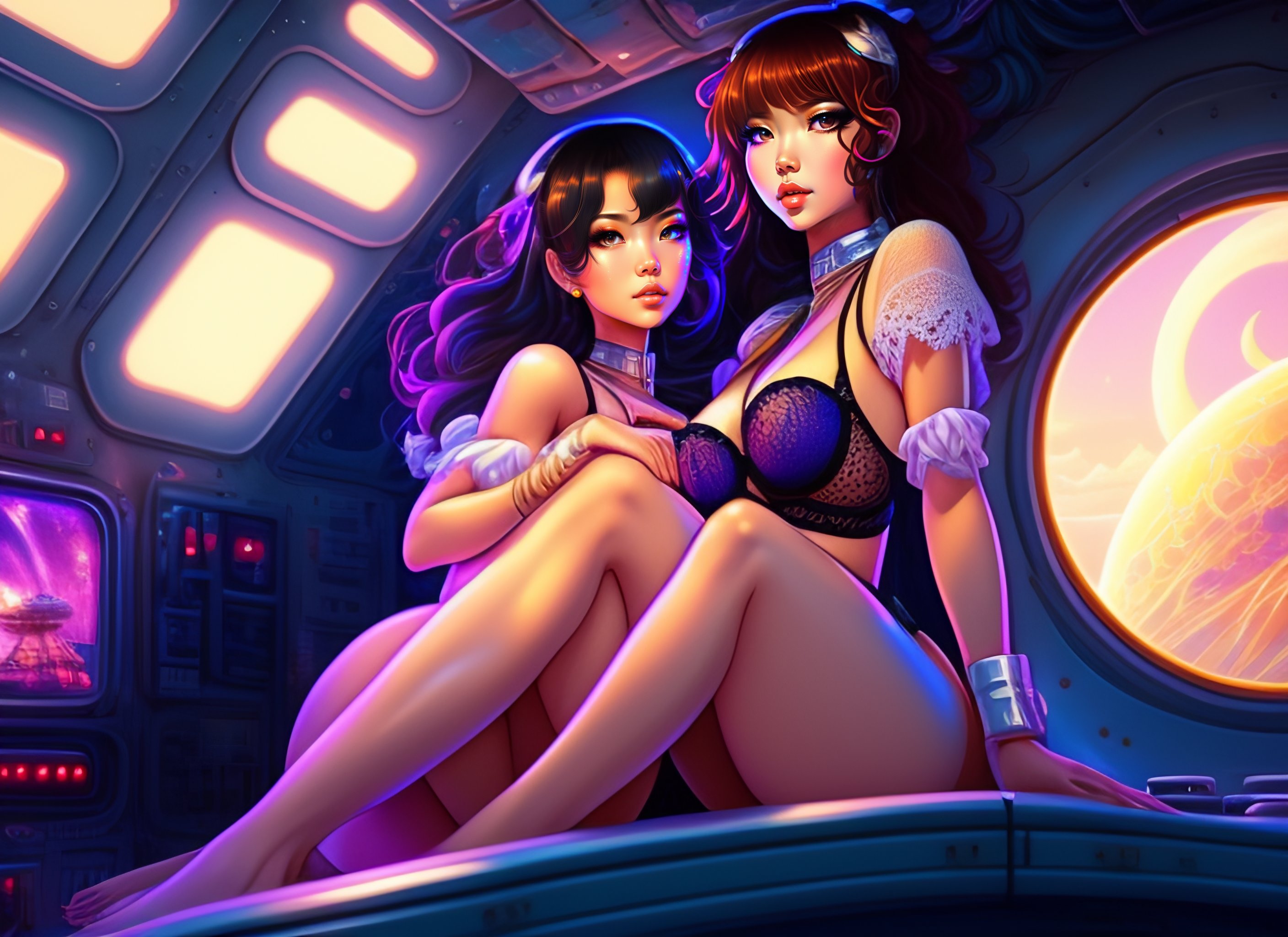 Full body 2 cute babes kawai in a little piece of lace under wear, sitting on floor of cabin on a spaceship, 4k, 8k, trending in artstation, trending in deviantart, high detailed, masterpiece, vibrant colors, hdr, by hajime sorayama, greg tocchini, virgil finlay, sci-fi, colors, line art