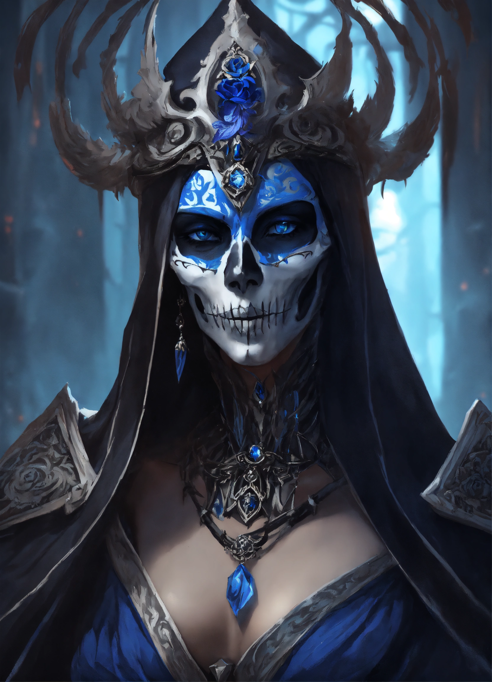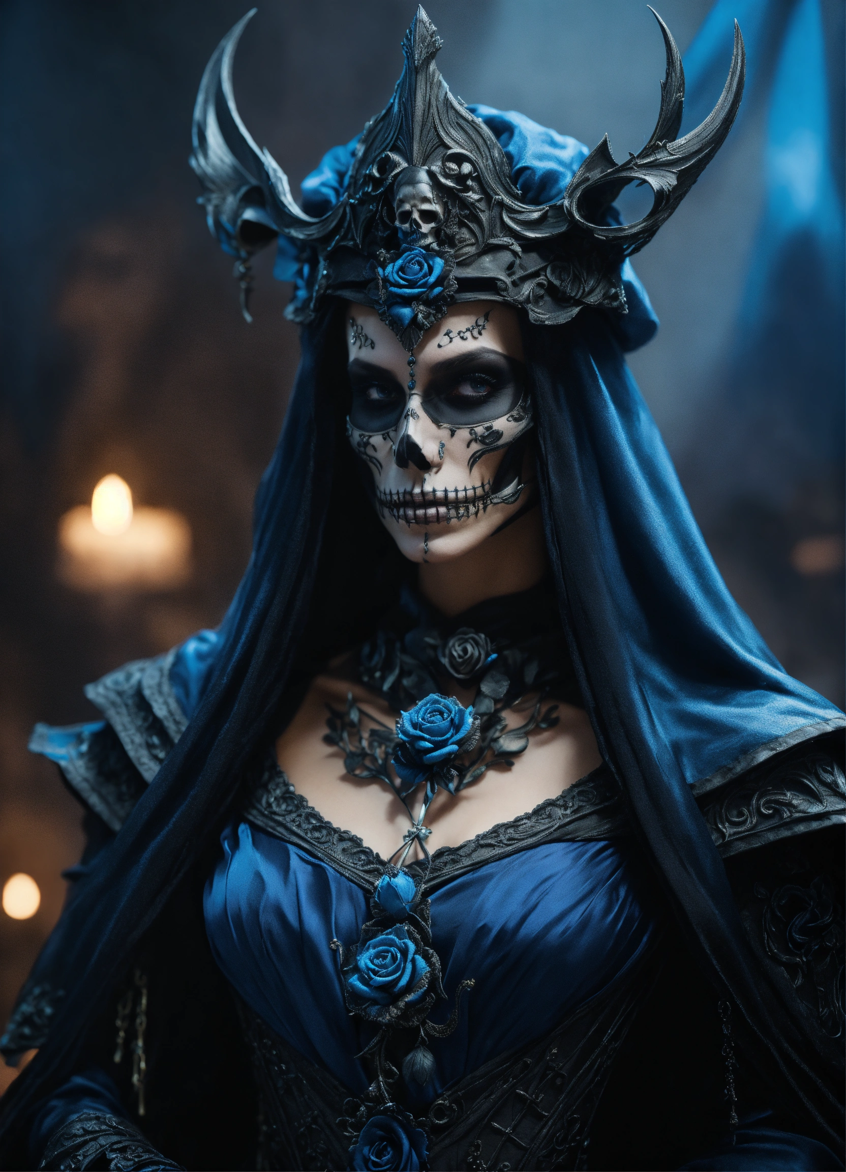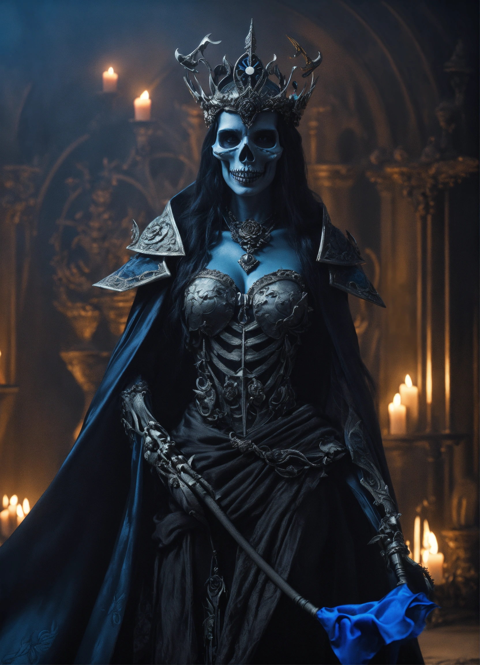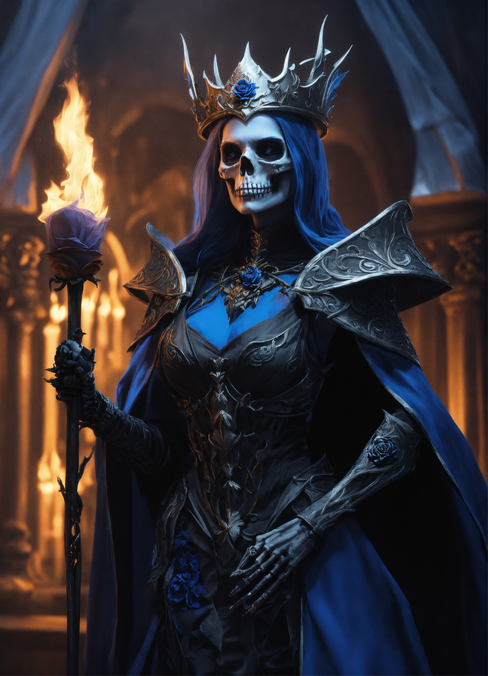Skeletal feminine lich queen with charcoal silk garbs covering her. a blue flag with a symbol of a black rose on it in background. d&d, fantasy, cinematic