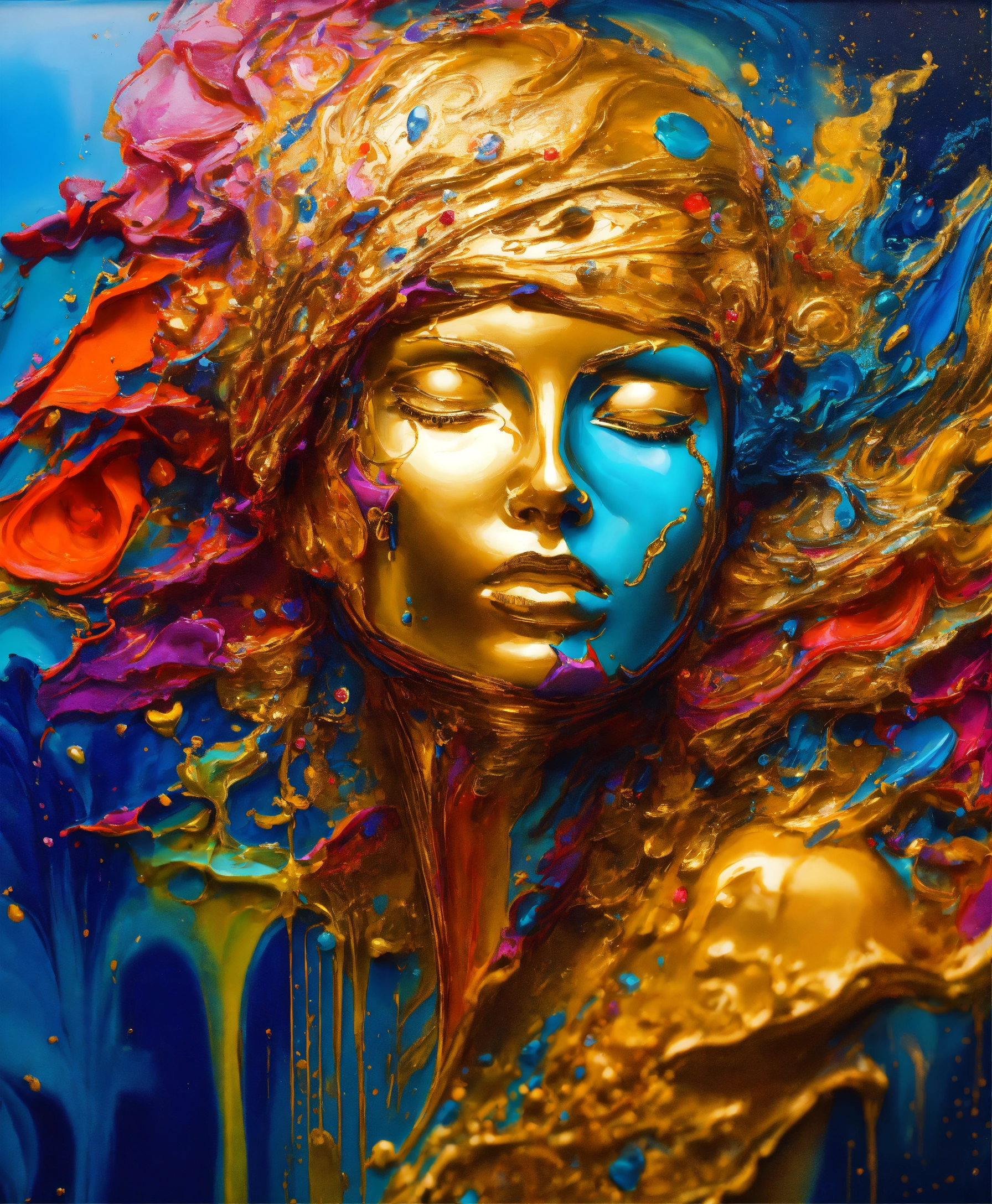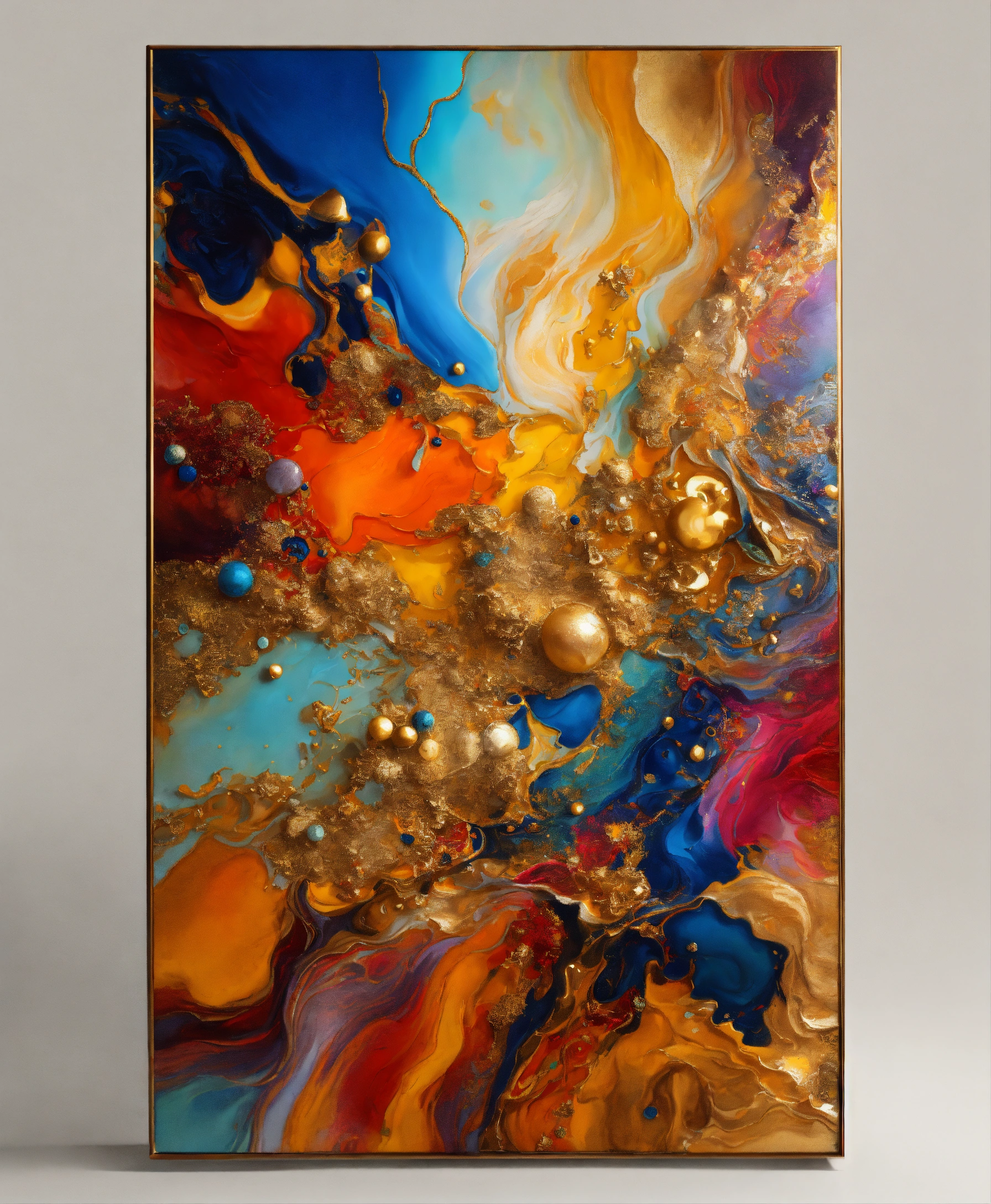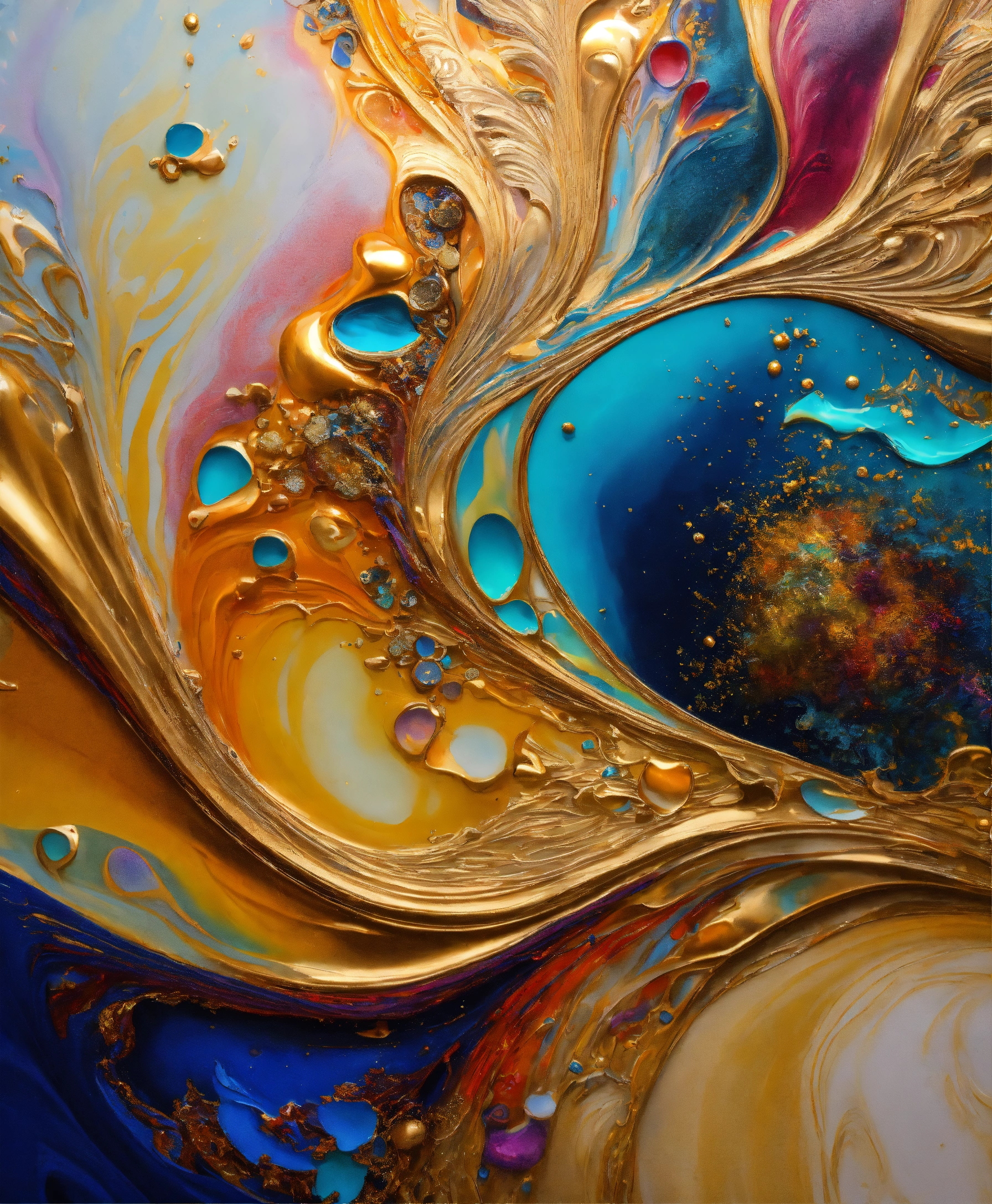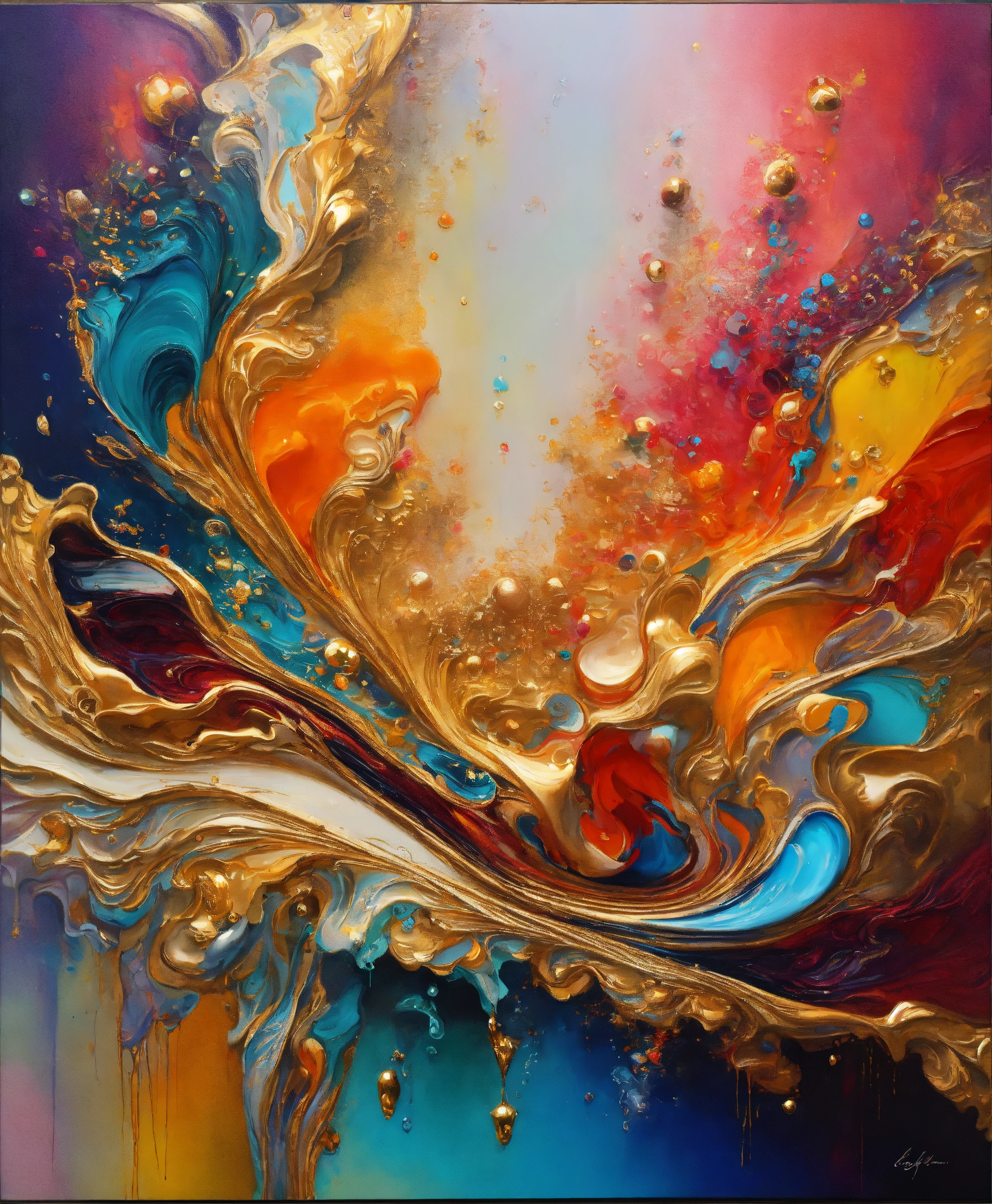 Colorful abstract painting oil and water complex complicated bright vivid colors beautiful opulent wealthy intricate hyperdetailed masterpiece awesome gold trim 8k