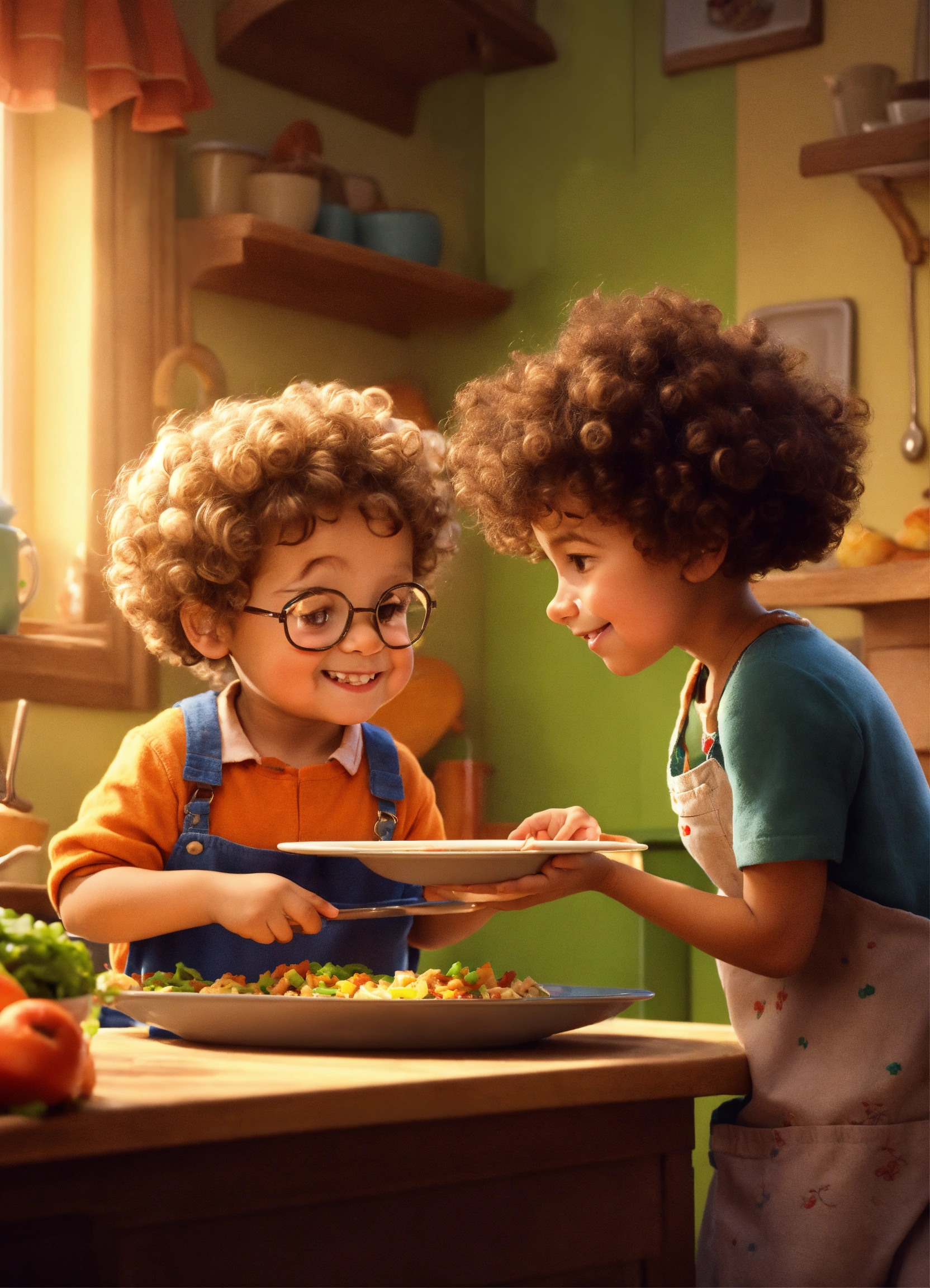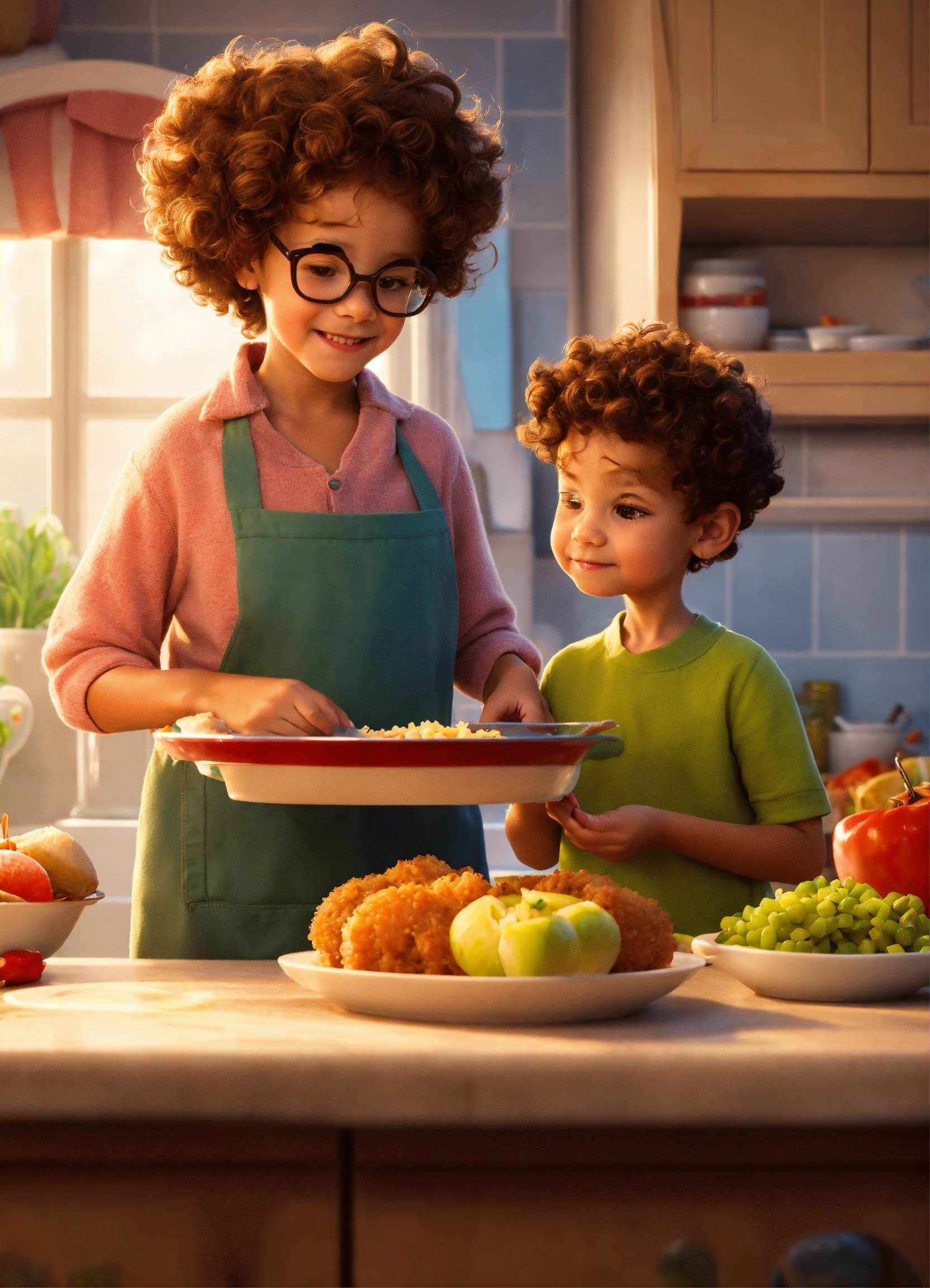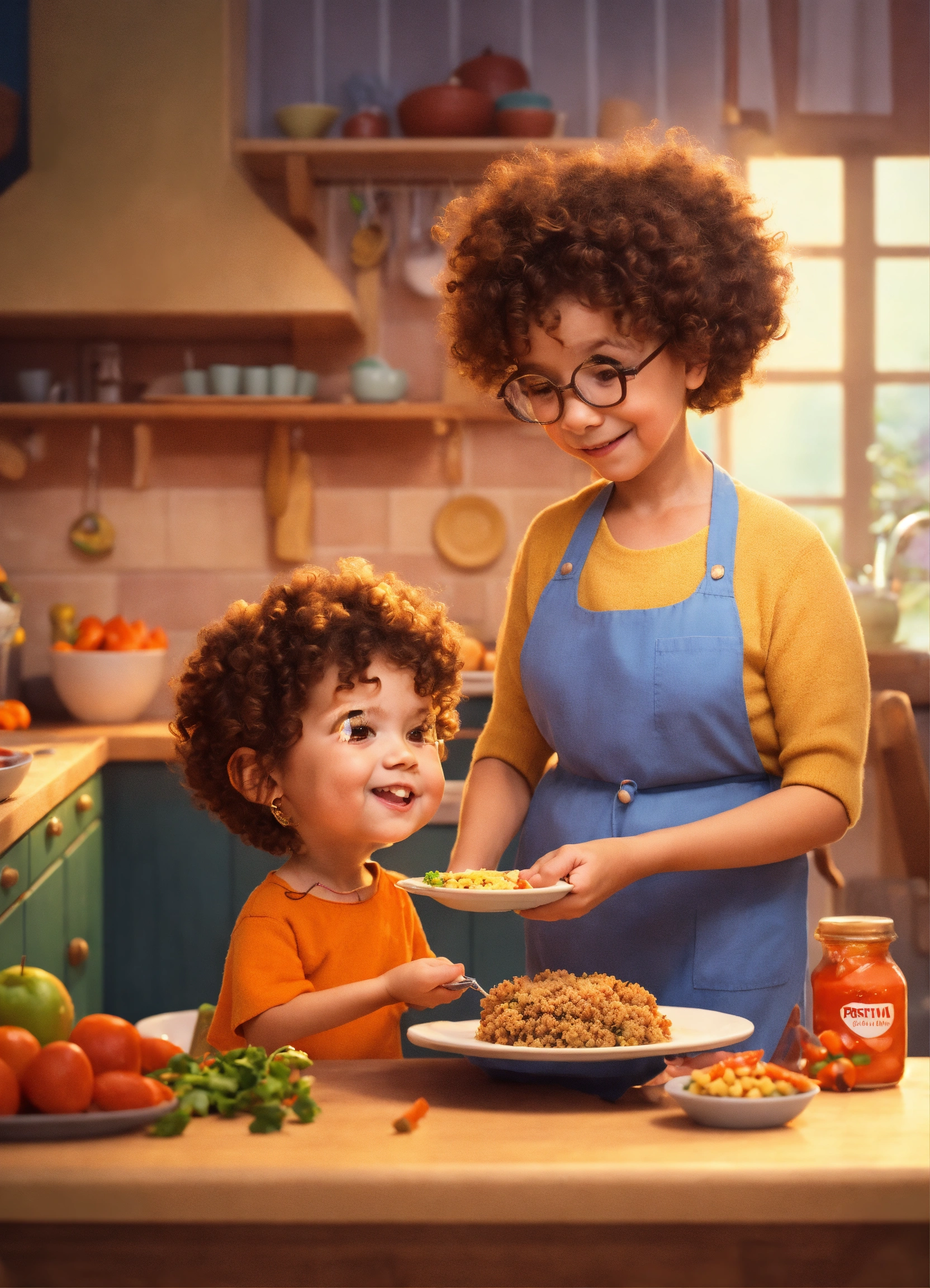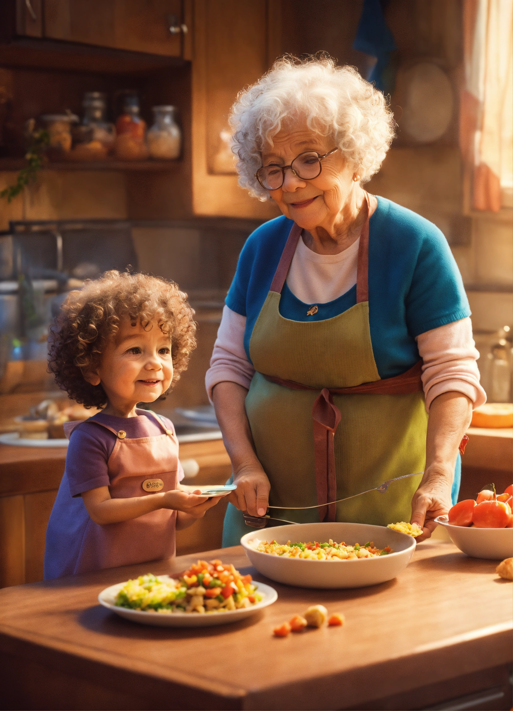 A curly-haired child is measuring his weight on a scale, next to him stands a grandmother with a plate of food in her hands. the photo is positive, cozy in pixar style.