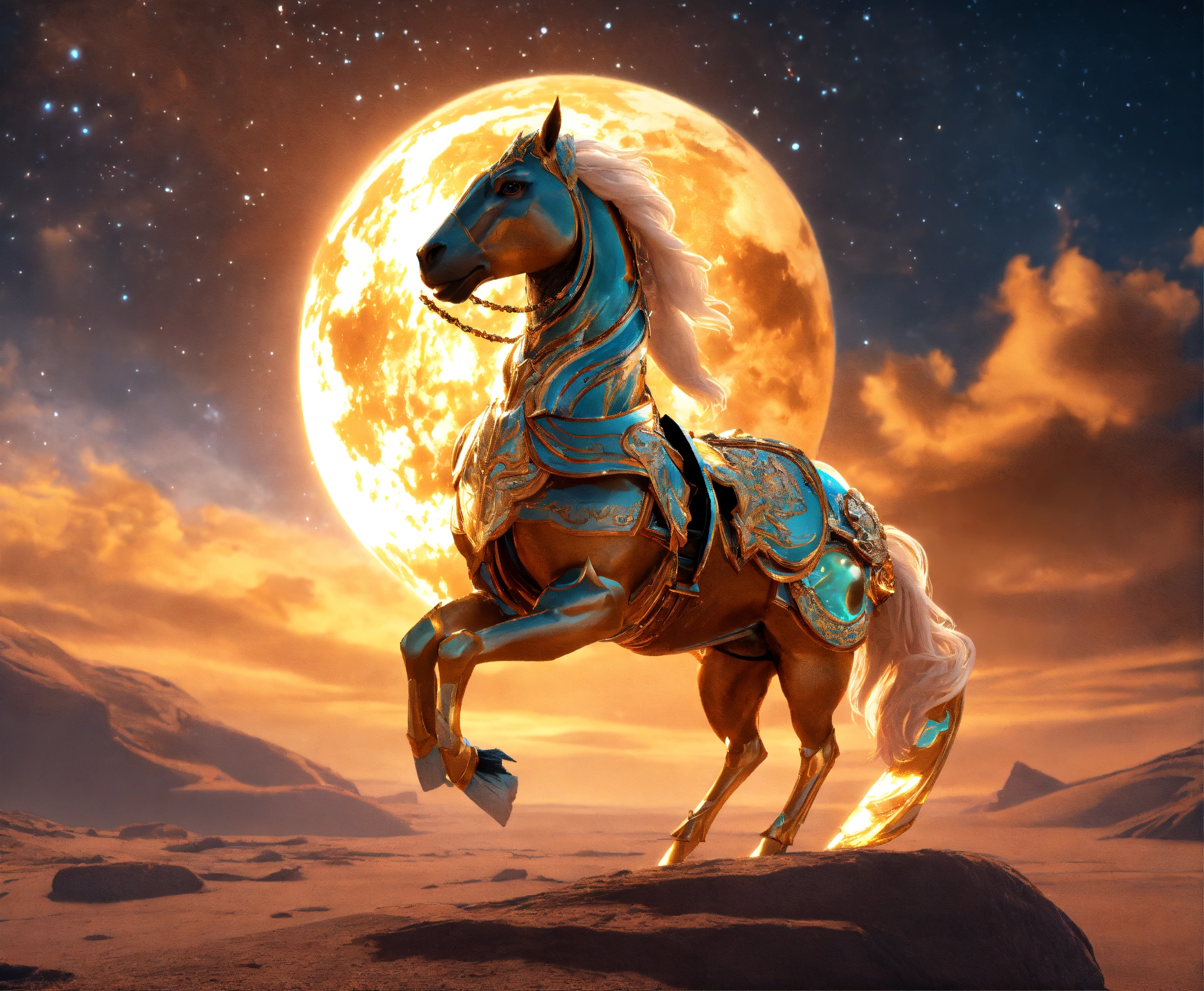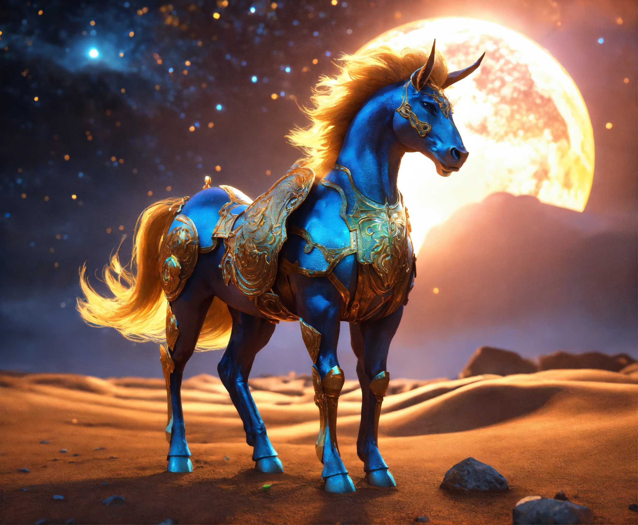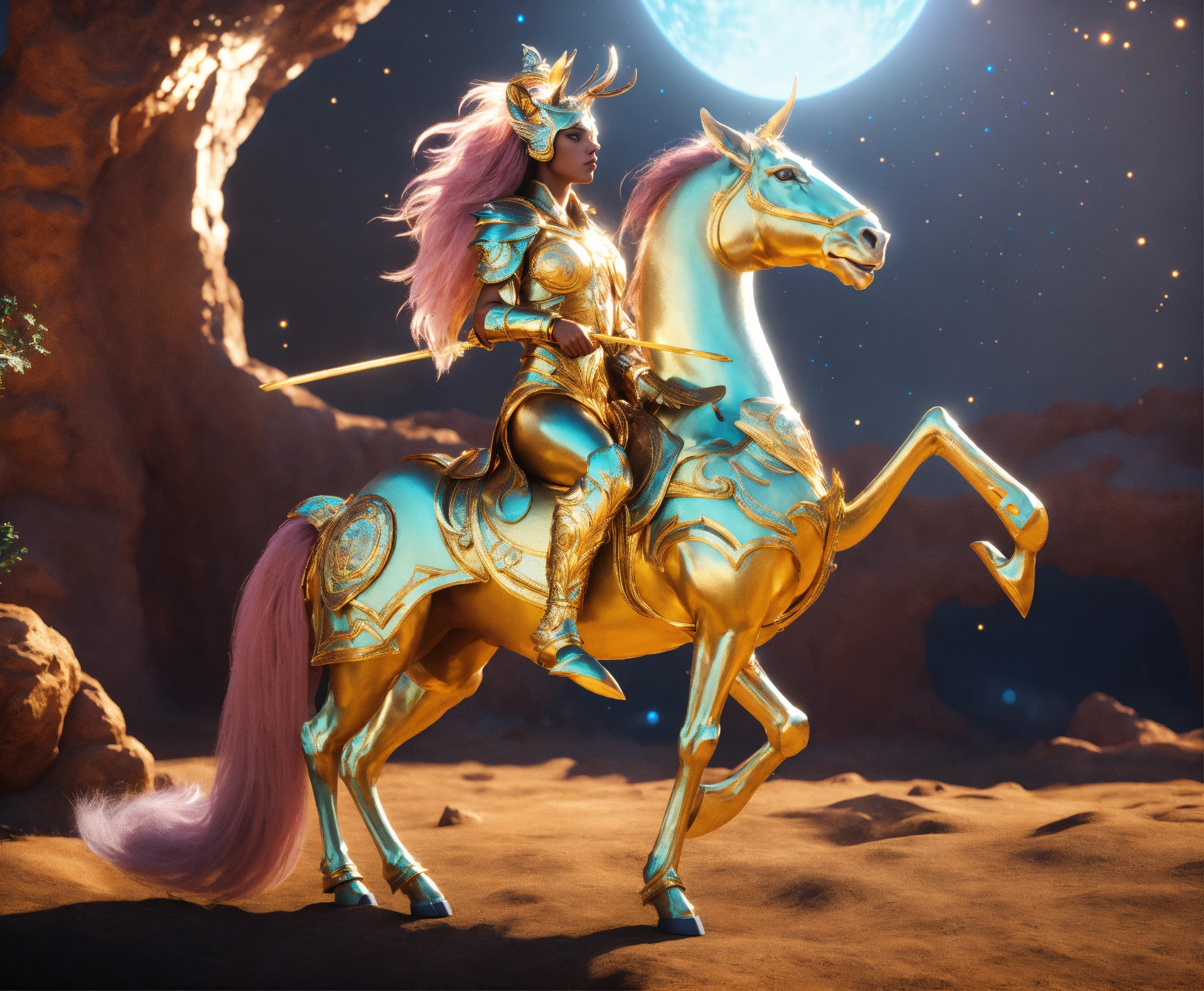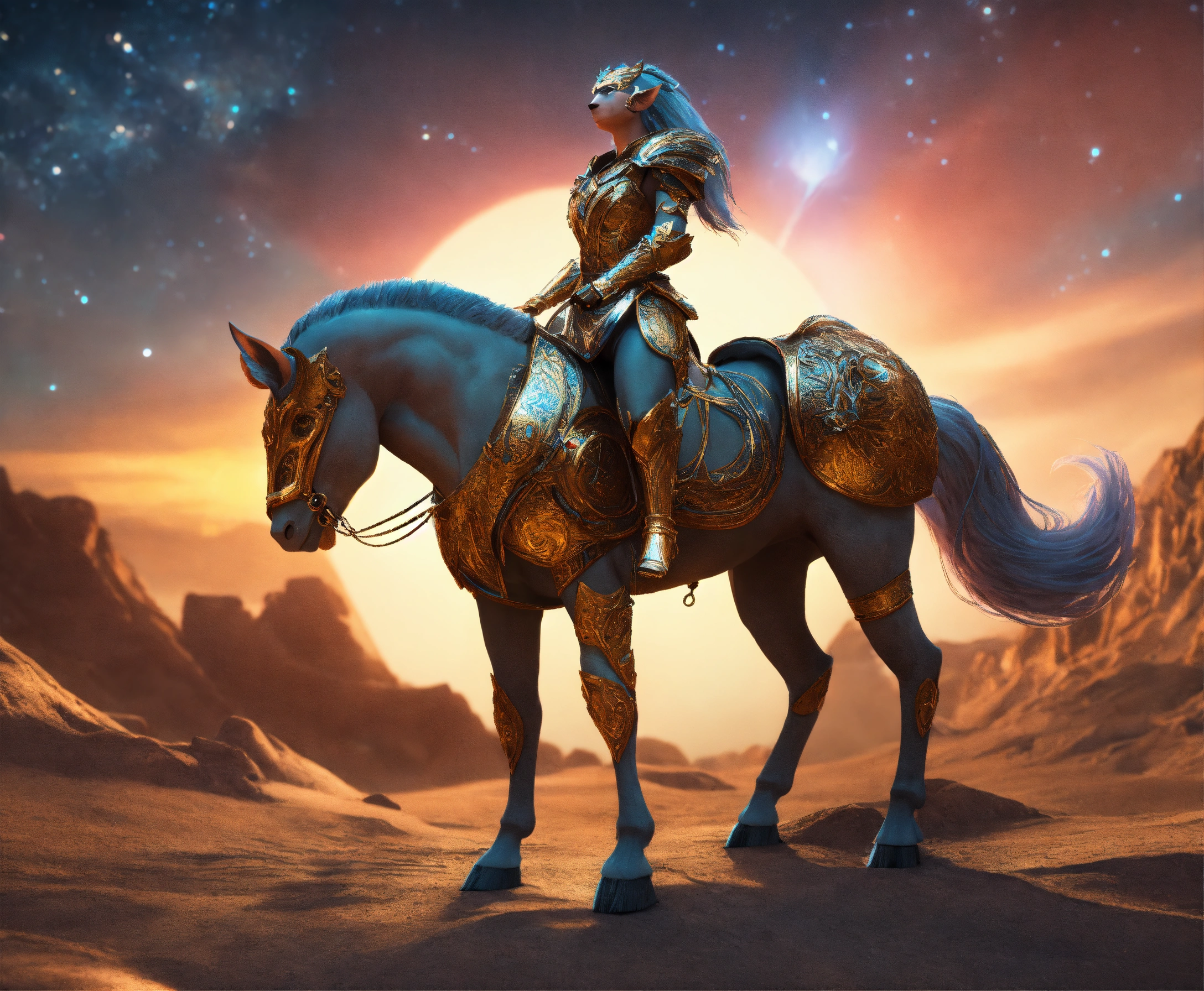 Celestial centaurion in 8k ultra 3d, this centaur-like creature dons celestial armor that gleams with an otherworldly radiance, embodying the essence of cosmic protection.