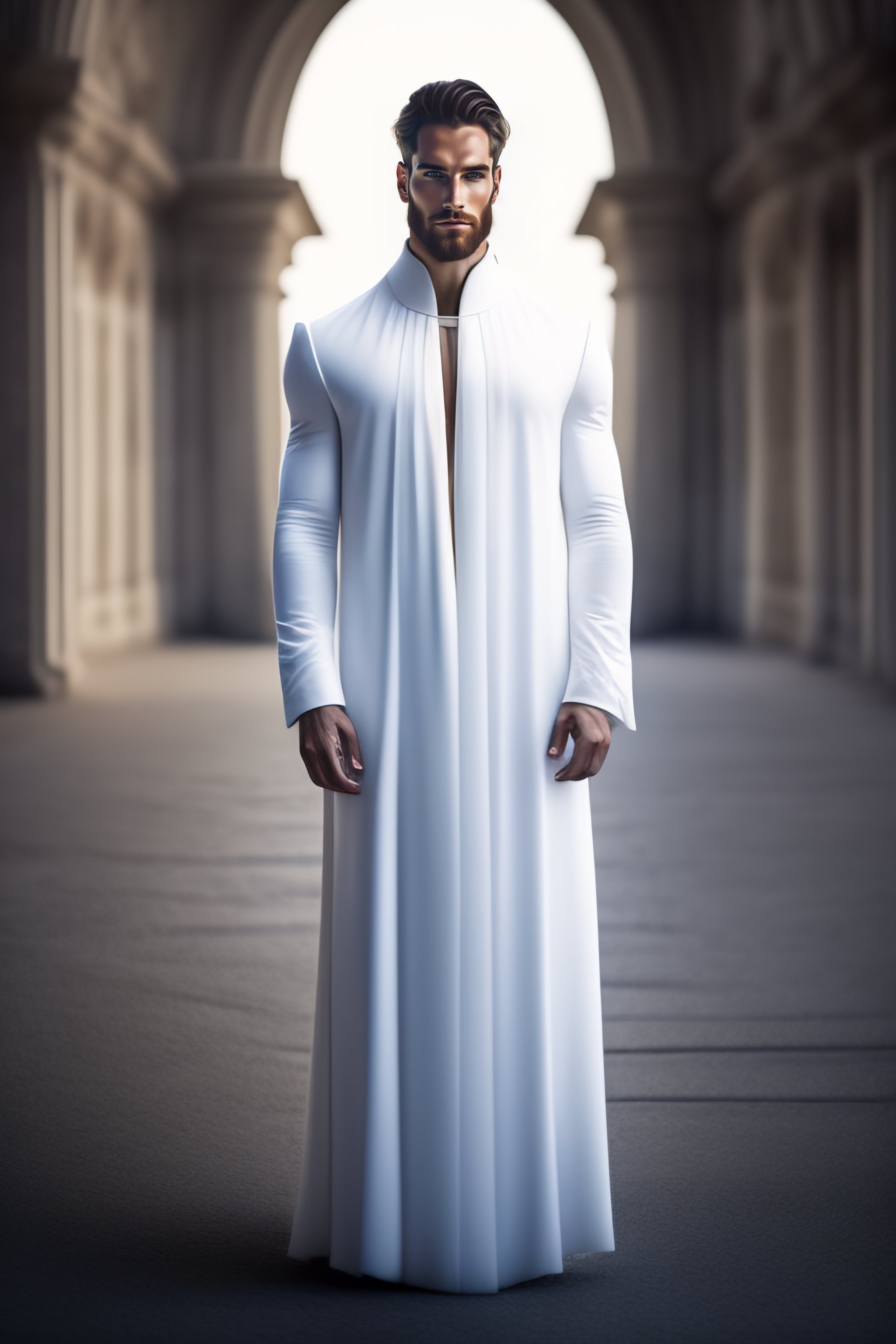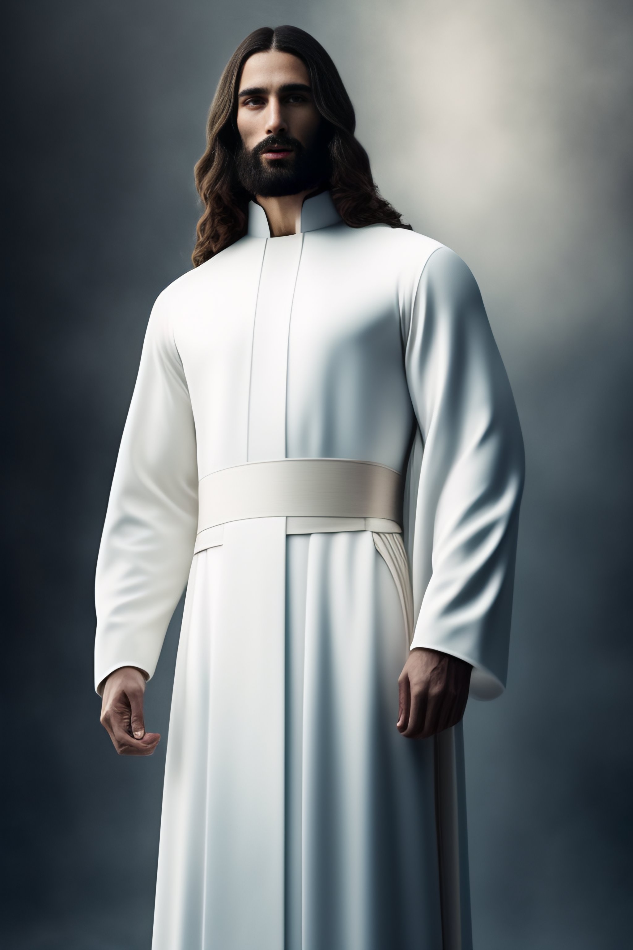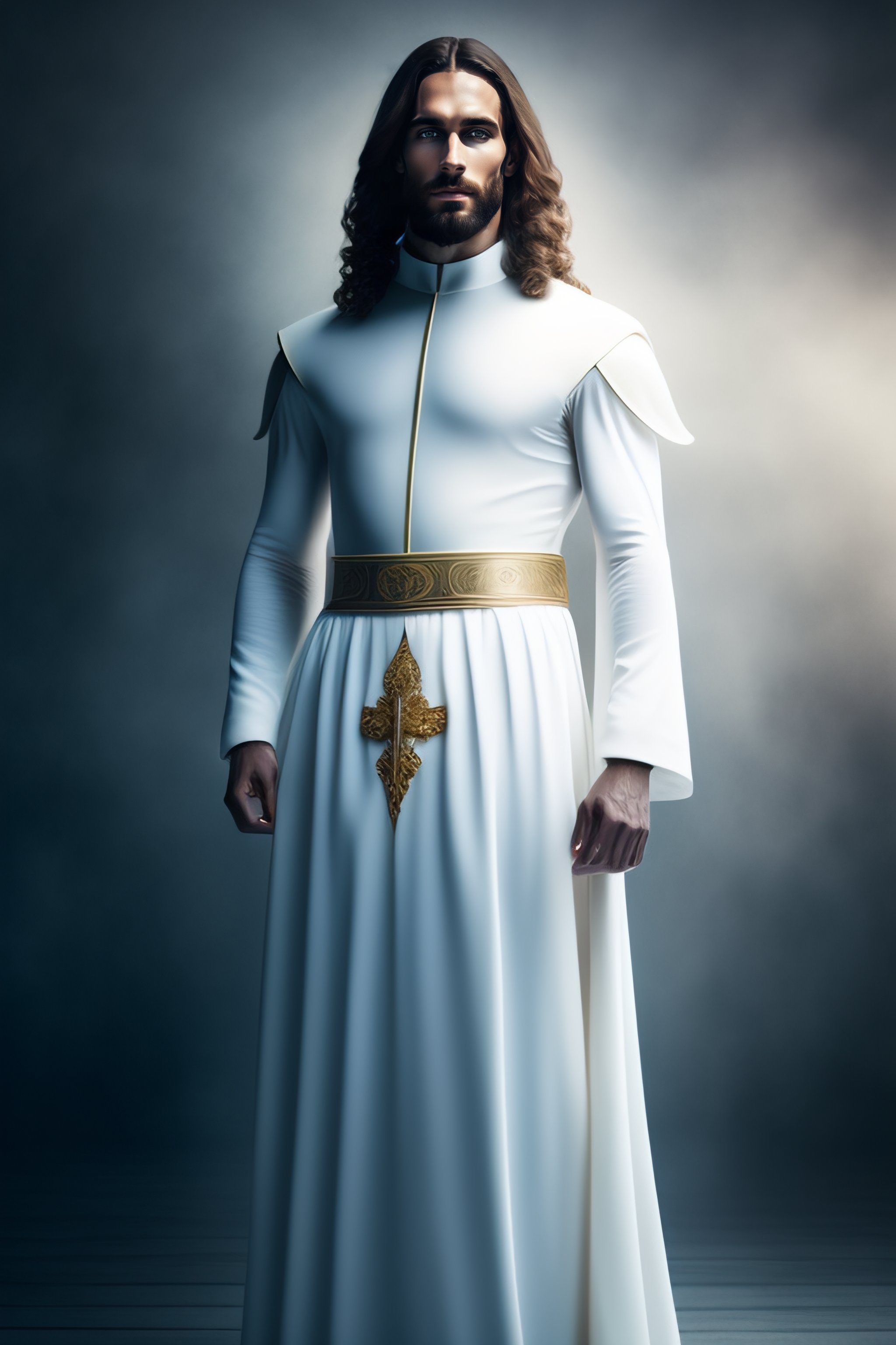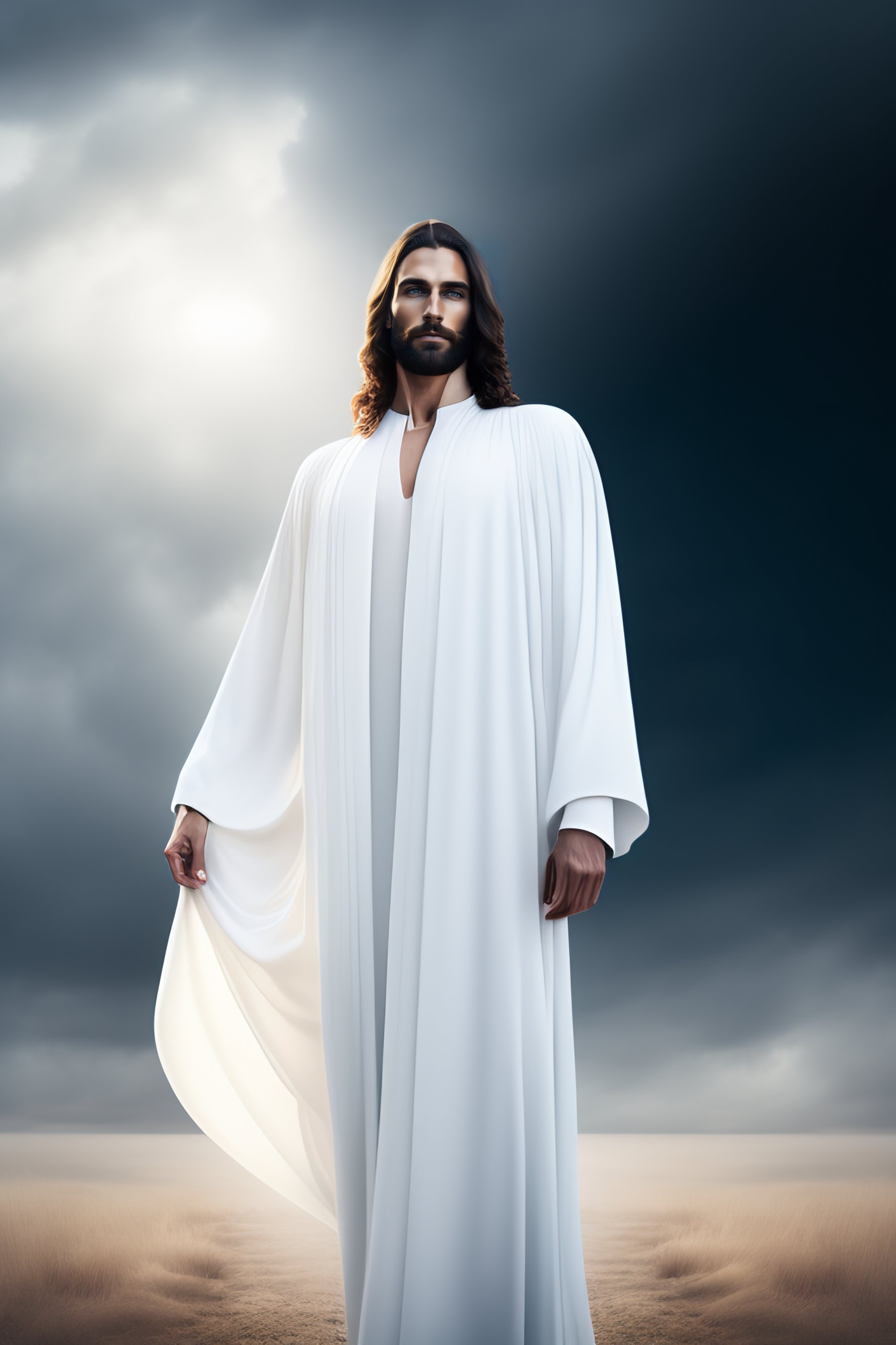 Jesus christ, realistic photography, dressed, man, suffering, white long clothes, crown, open arms, smile
