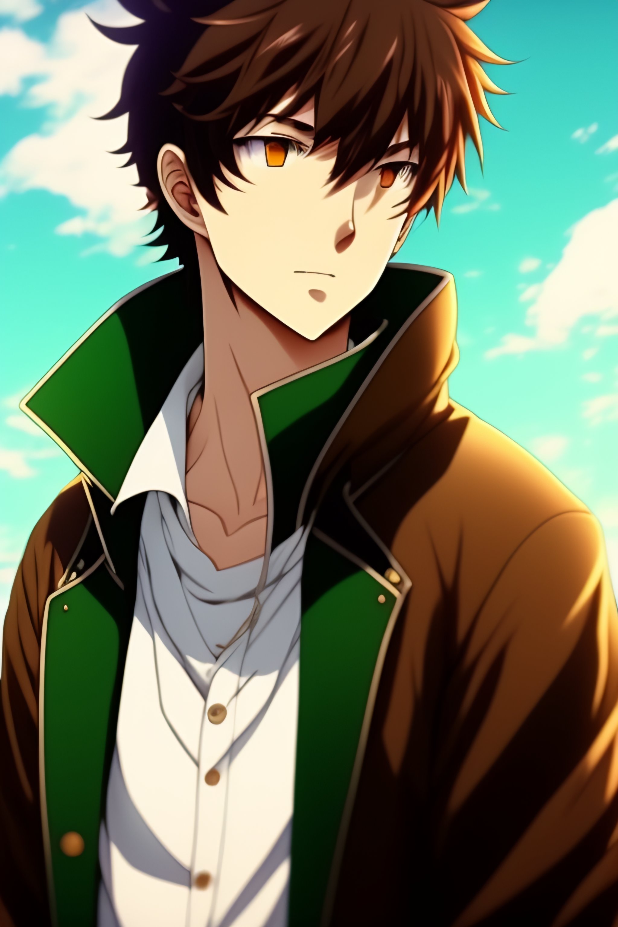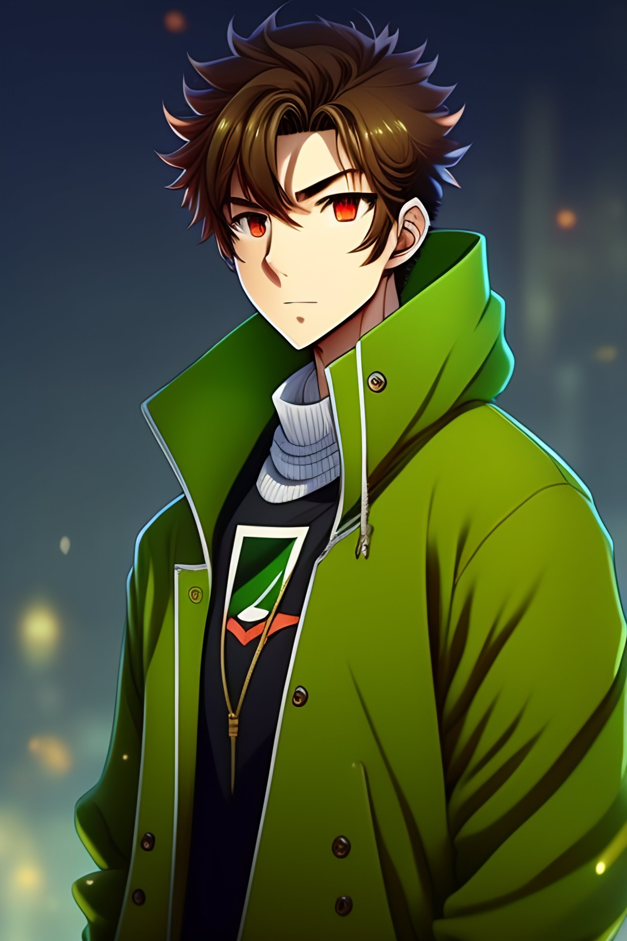 Anime guy, 19 years old, wearing green coat, long little bit messy lighter brown hair, medium brown beard, brown eyes, anime style