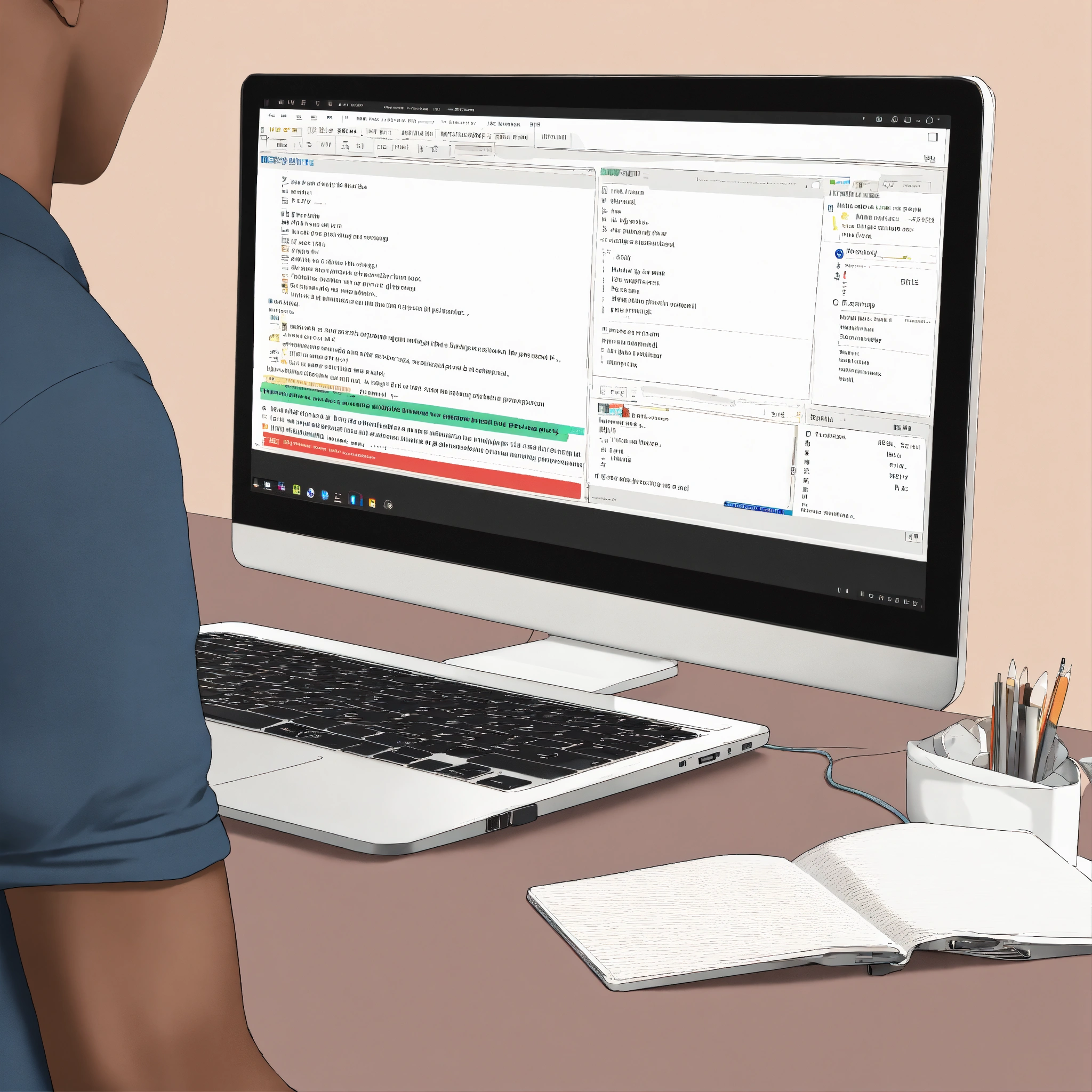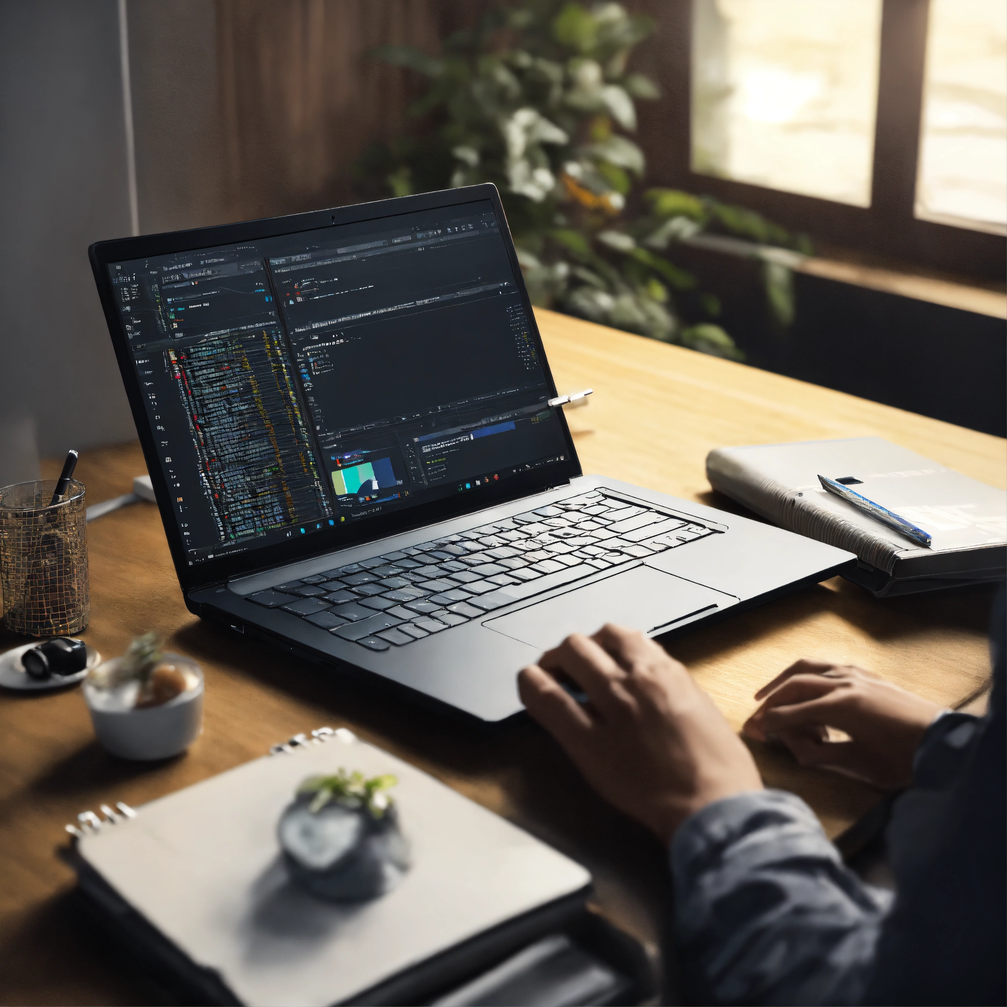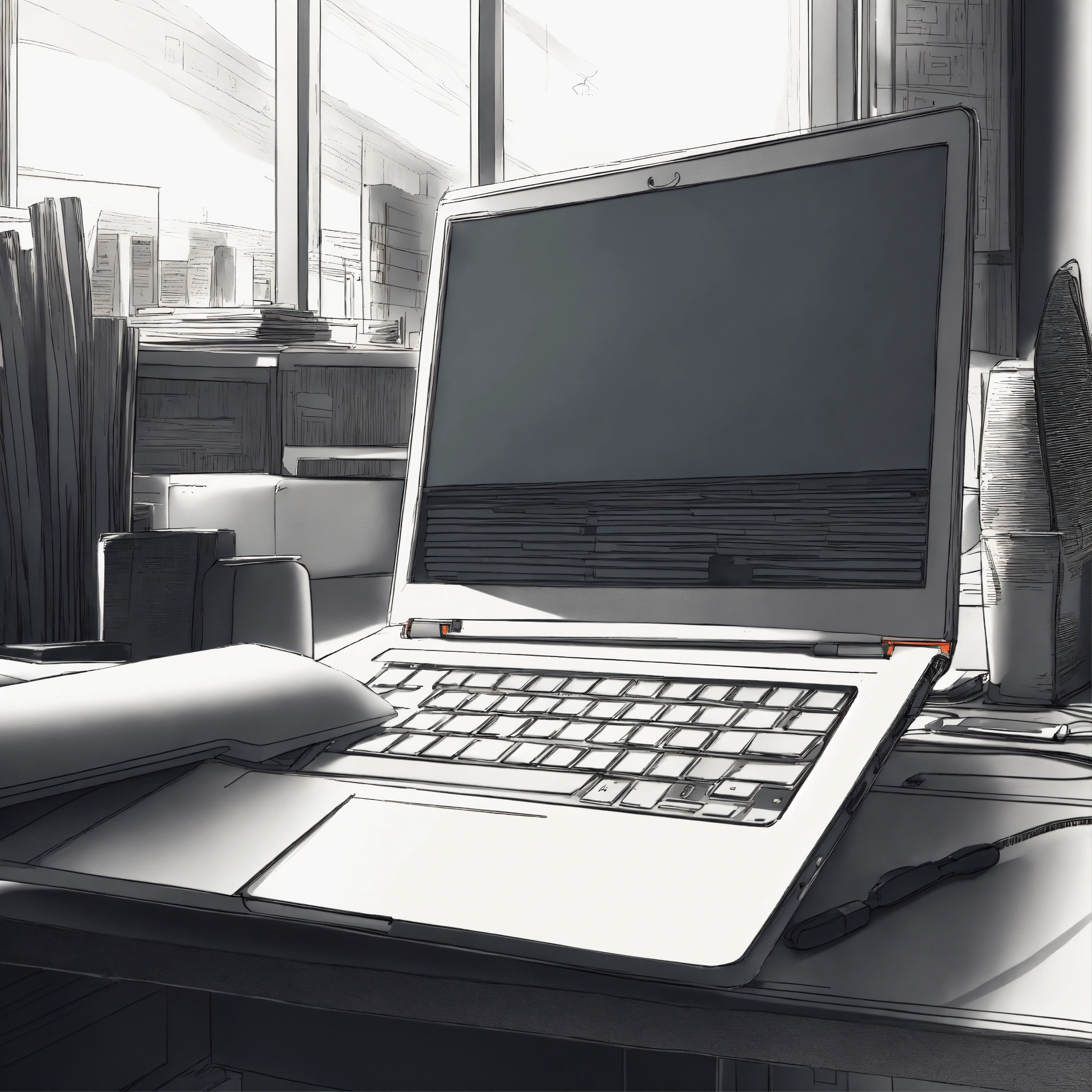 Image from a person working with a laptop, angle backside of the laptop, office environment, highly detailed, minimal