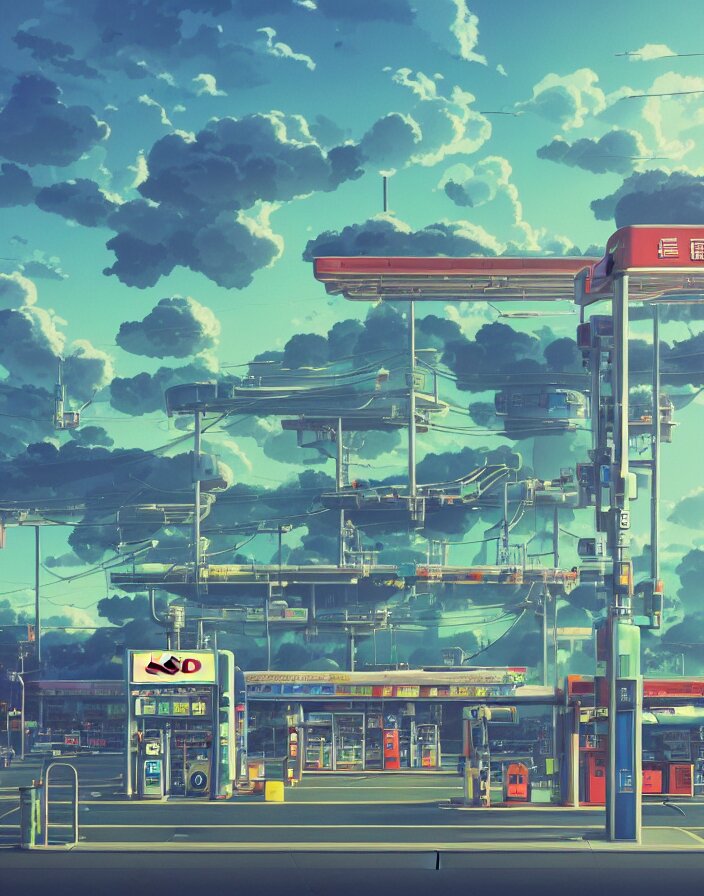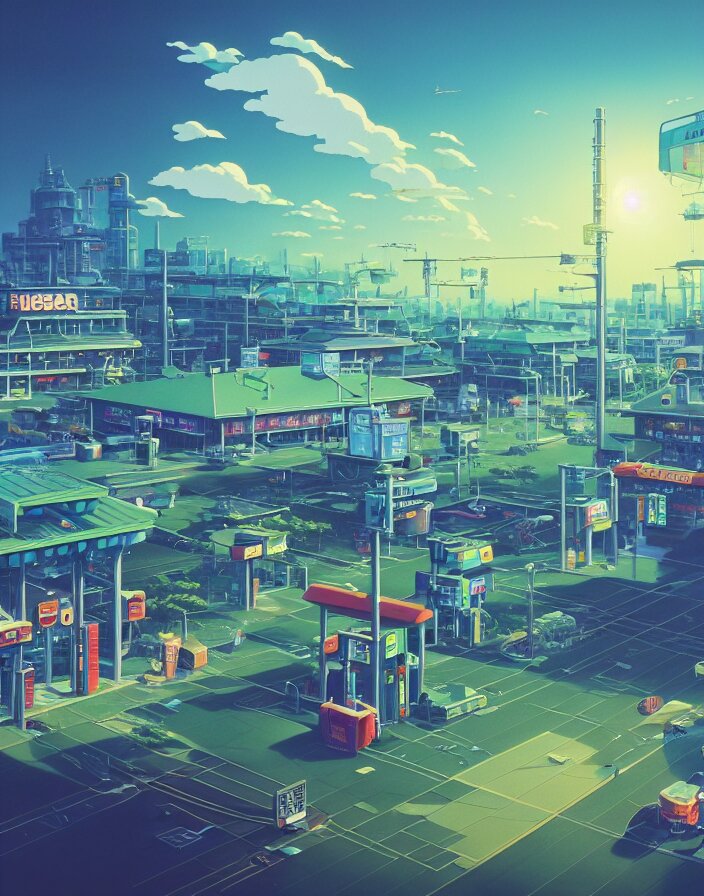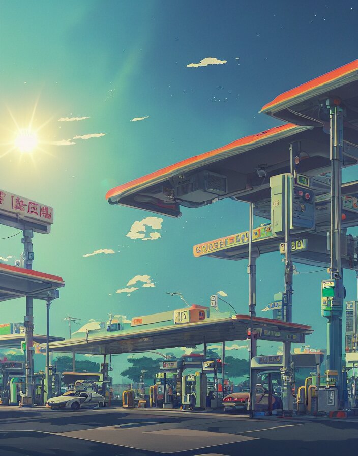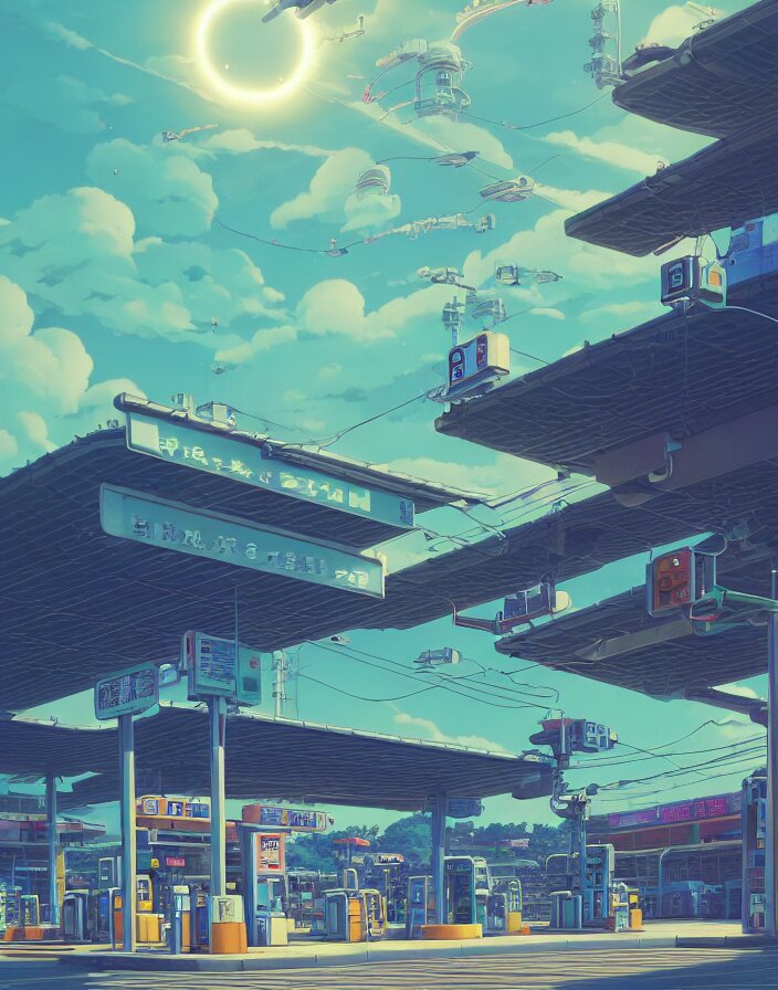 Studio ghibli, gas station, in a flying city, solar, green technology, optimist future by asher durand. intricate artwork by tooth wu and wlop and beeple and dan mumford and greg rutkowski and nekroxiii. halo. octane render, cinematic, hyper realism, octane render, 8k, depth of field, bokeh. iridescent accents. vibrant.