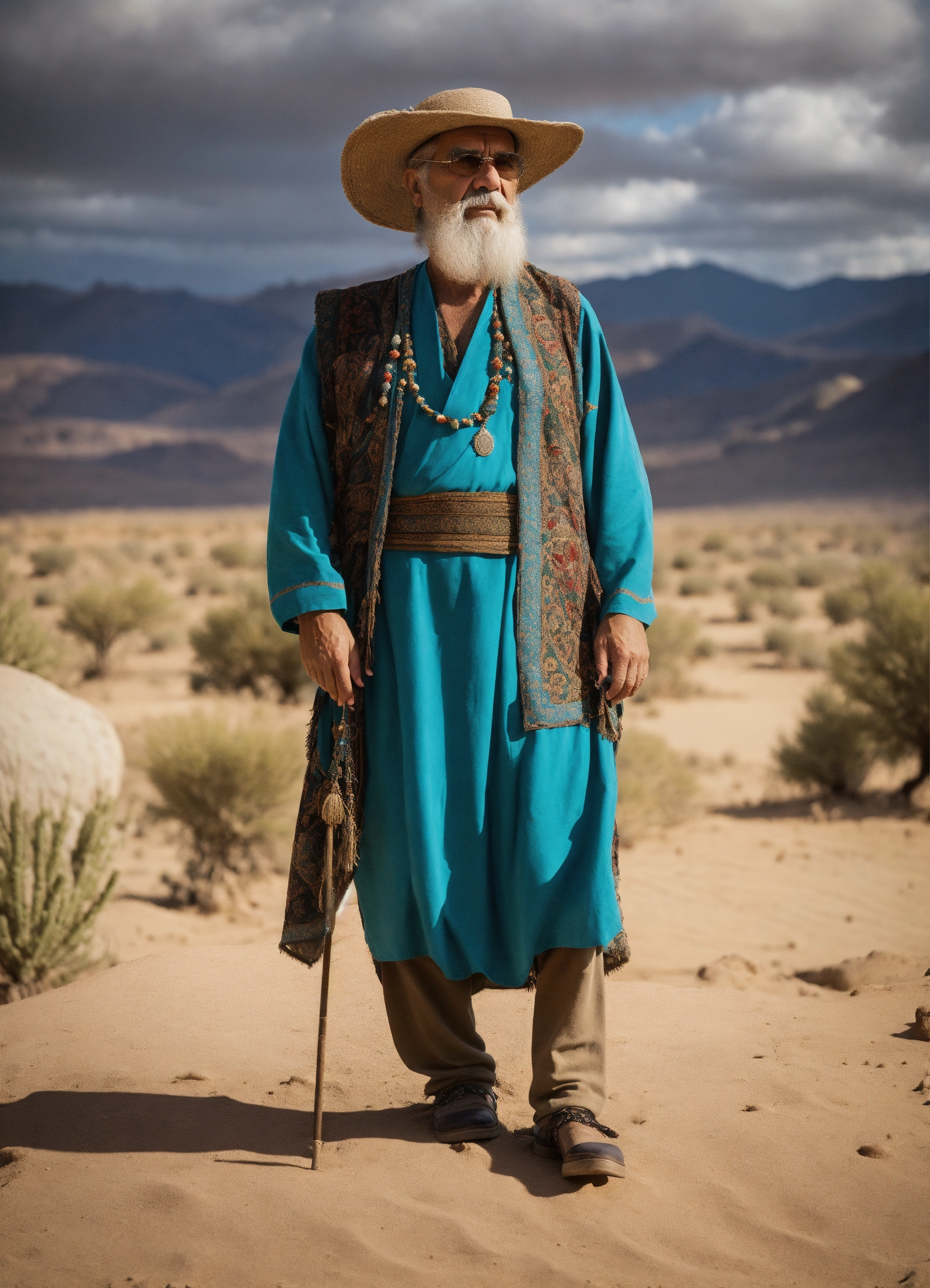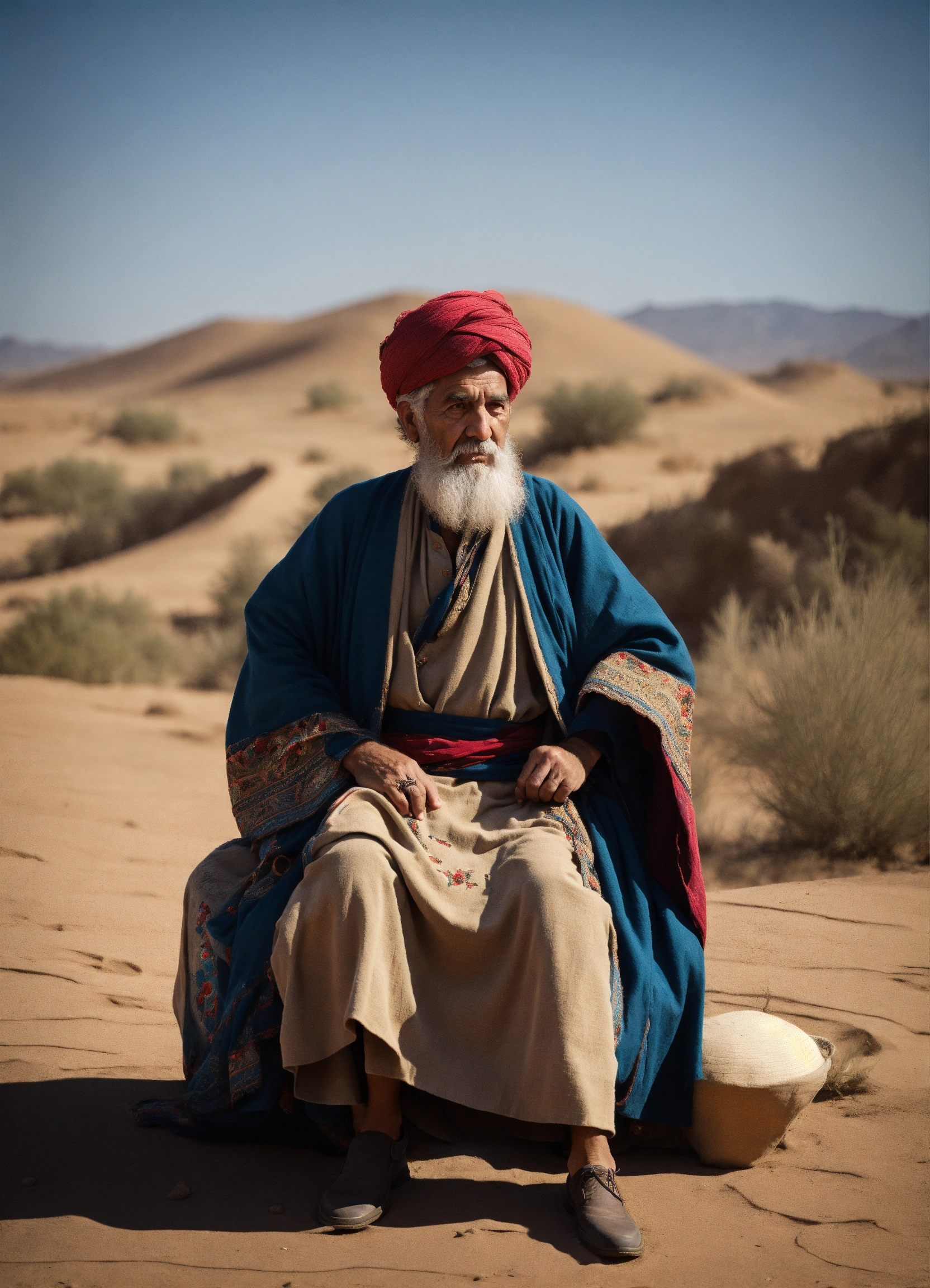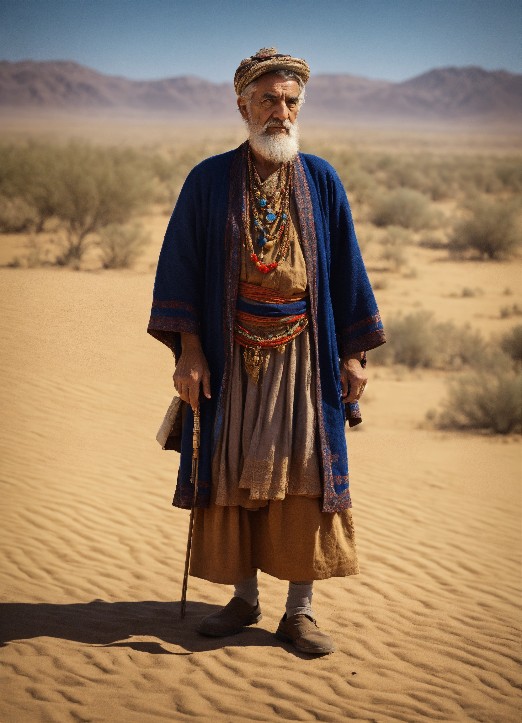 Anciano sabio en el desierto, vestido con ropas antiguas, barbudo mirando hacia el oriente con actitud de preocupacion, hiperrealista