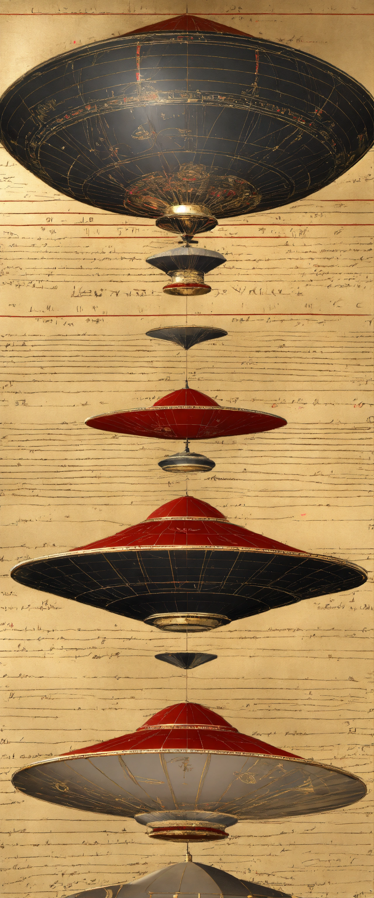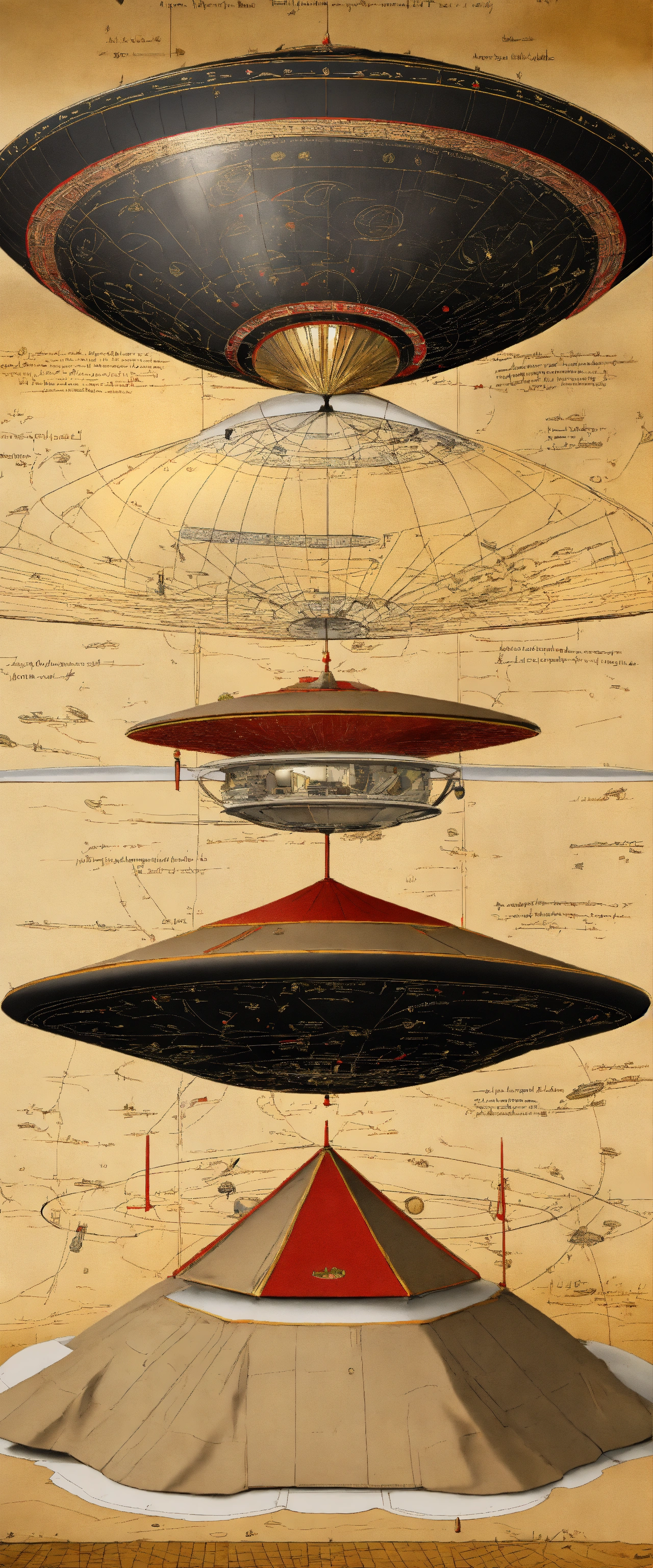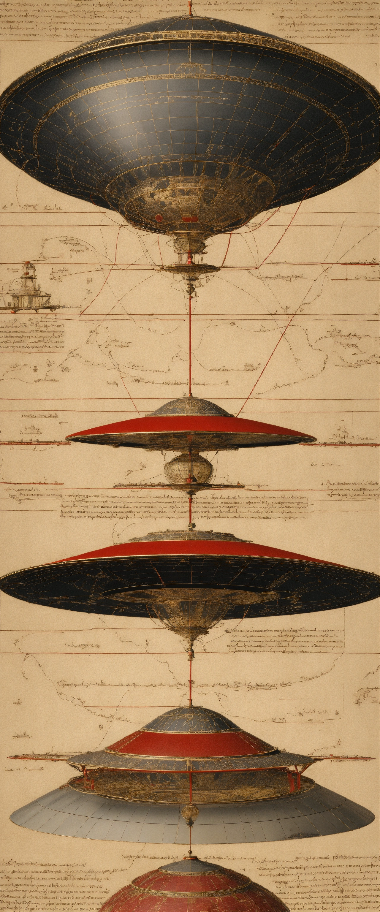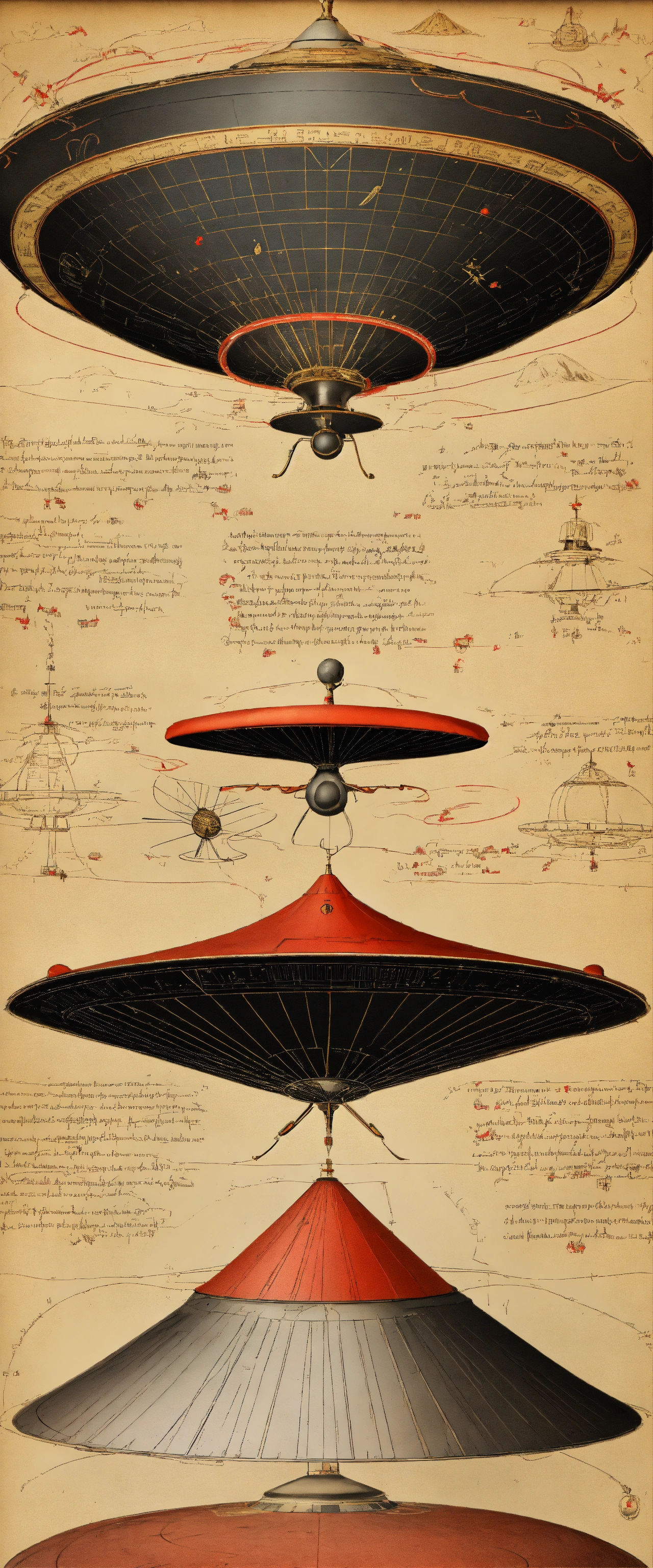 A 3d render of a ufo in silver, black, gold, and red with accurate lines, from different perspectives designed by leonardo da vinci in the voynich manuscript, 256k highest resolution, surreal, very sharp, vintage paper, very accurate lines.