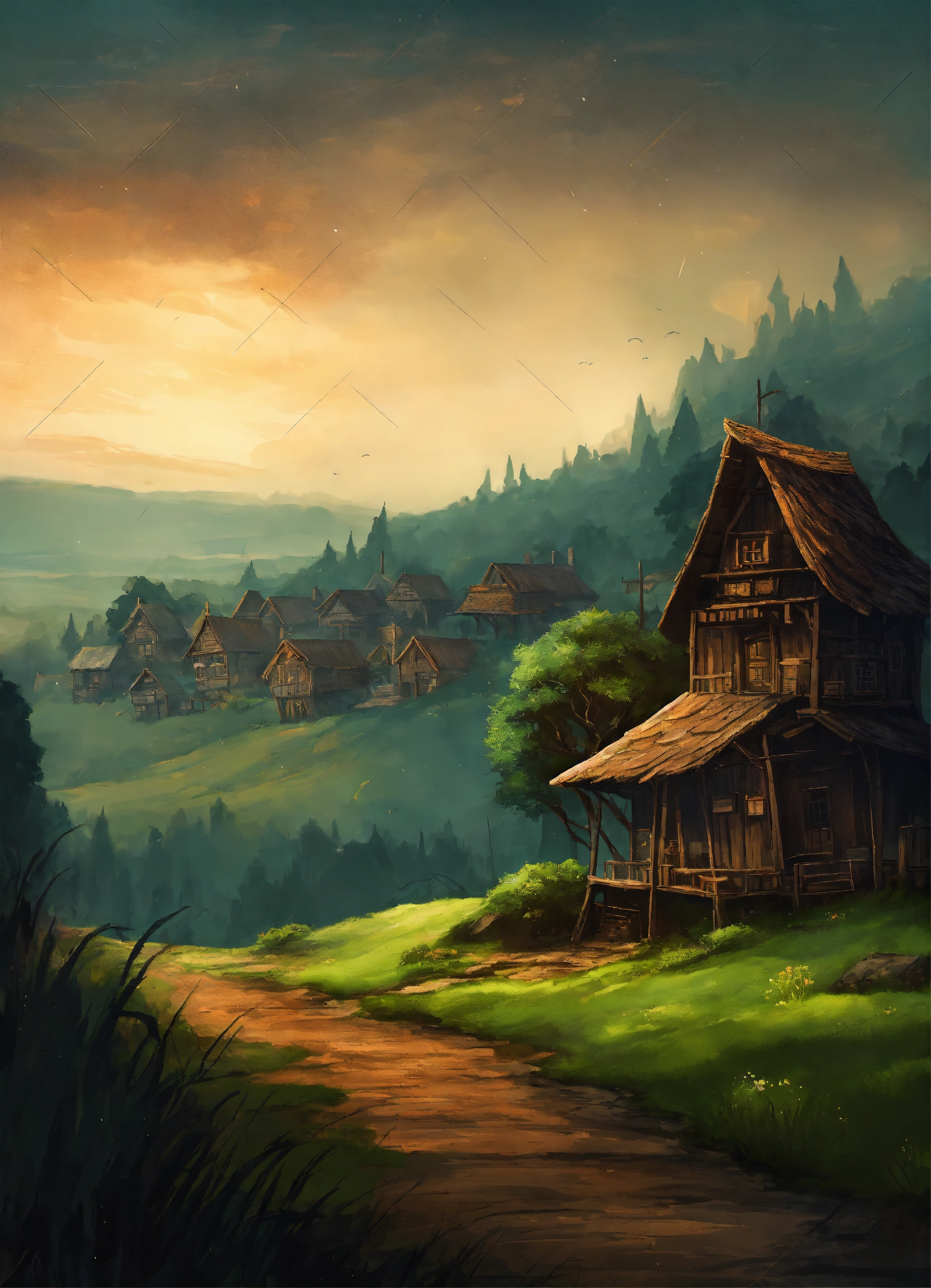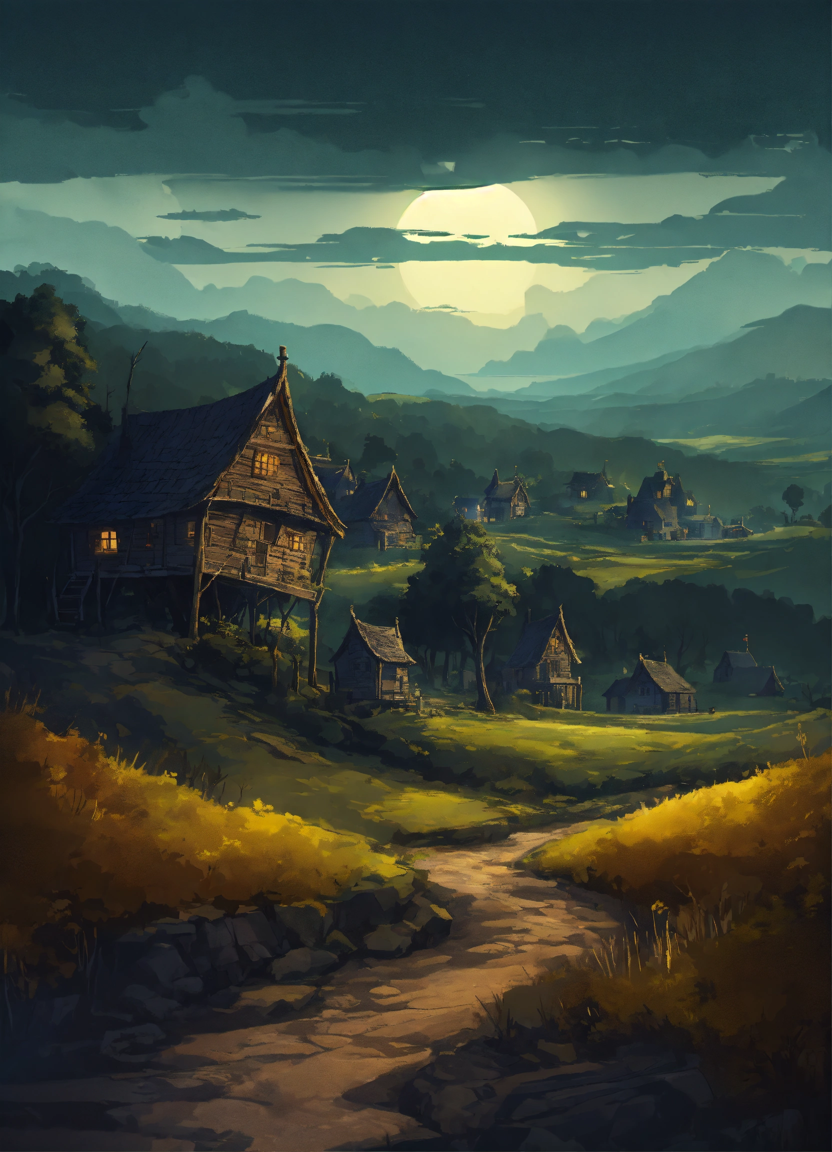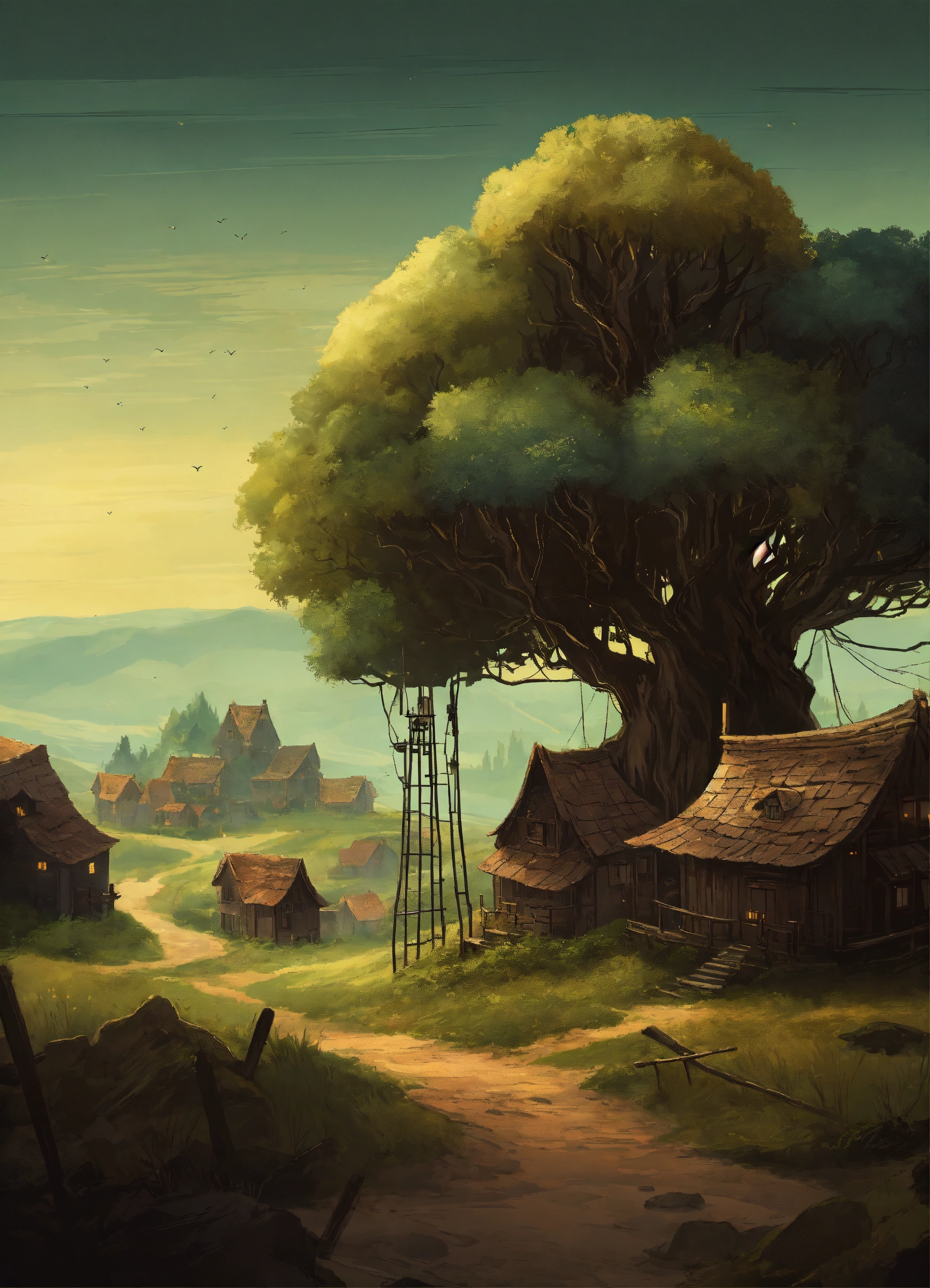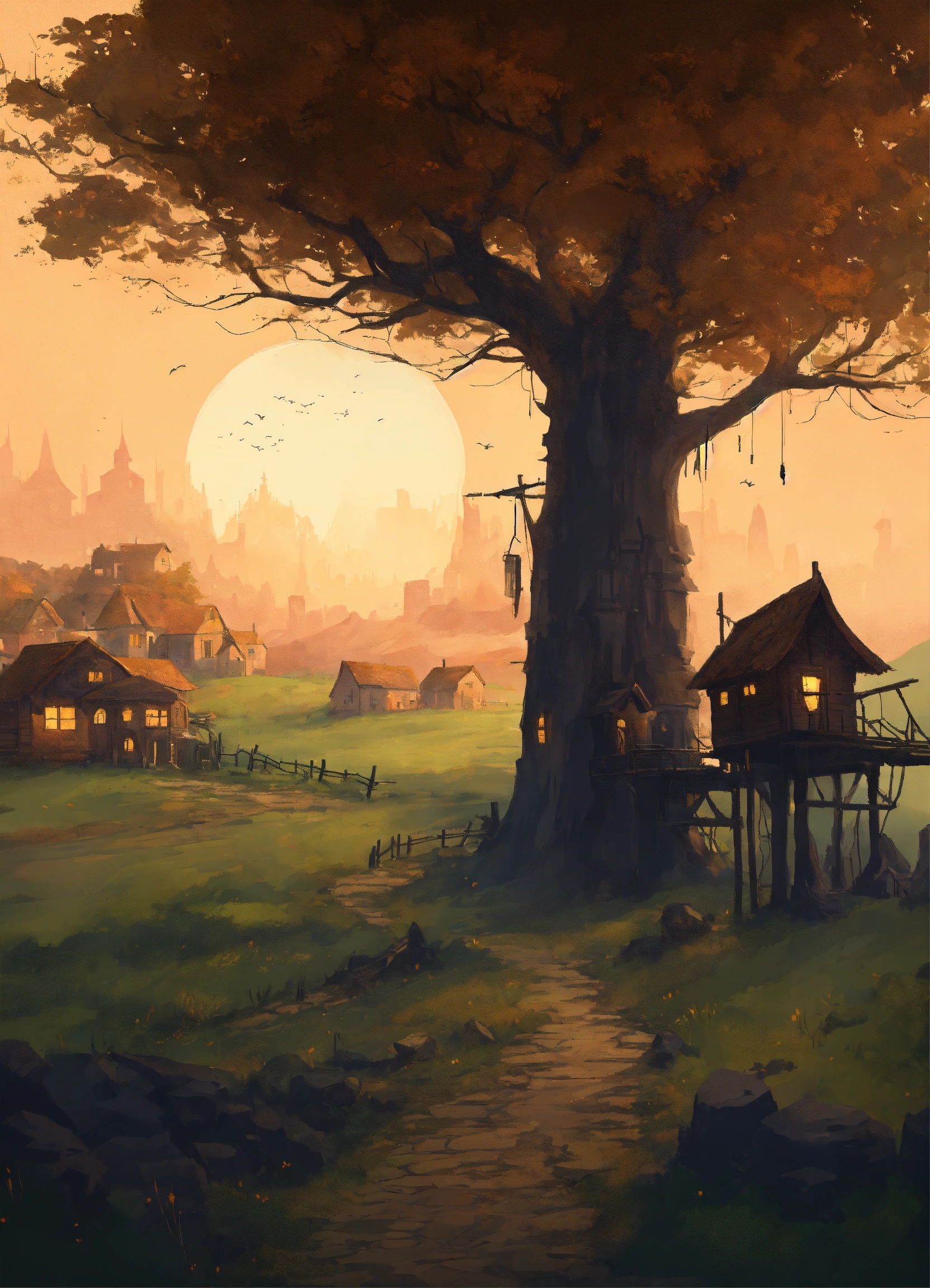 Dark landscape with a village in the distance dark village fantasy tree houses on gigantic old trees, simple stile, texture painting, texture vector illustration, nature dusty colors, lots of brush texture