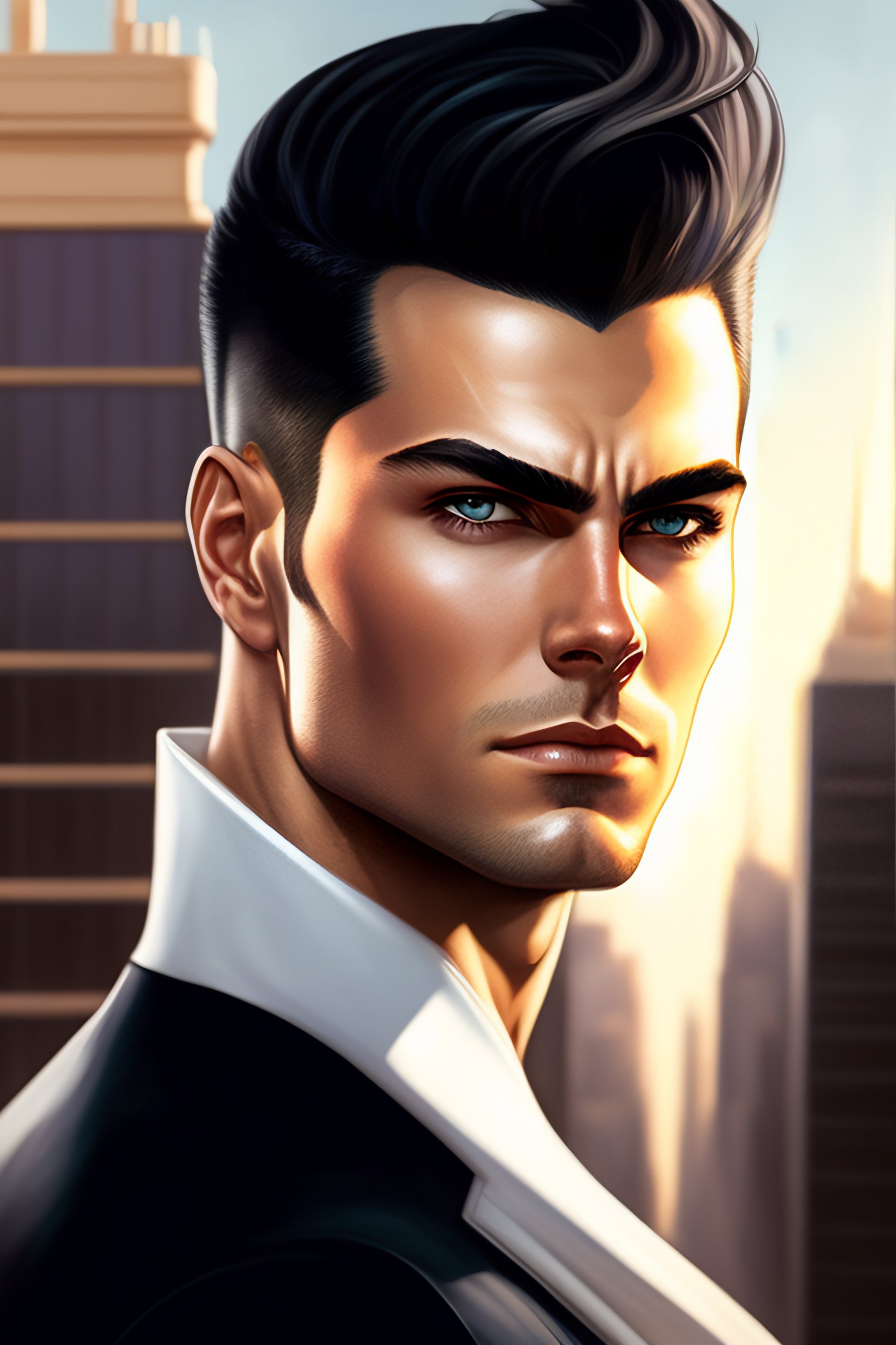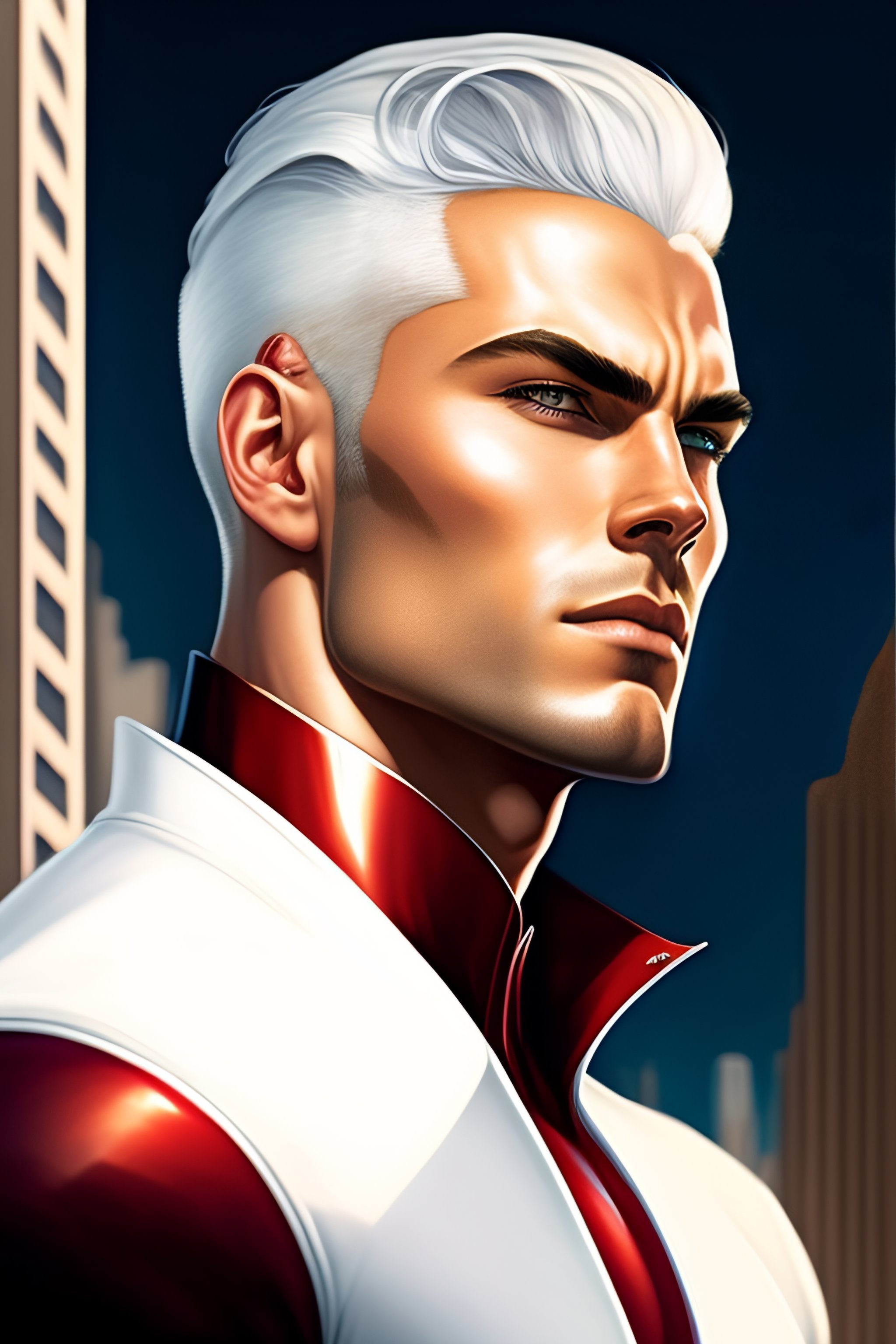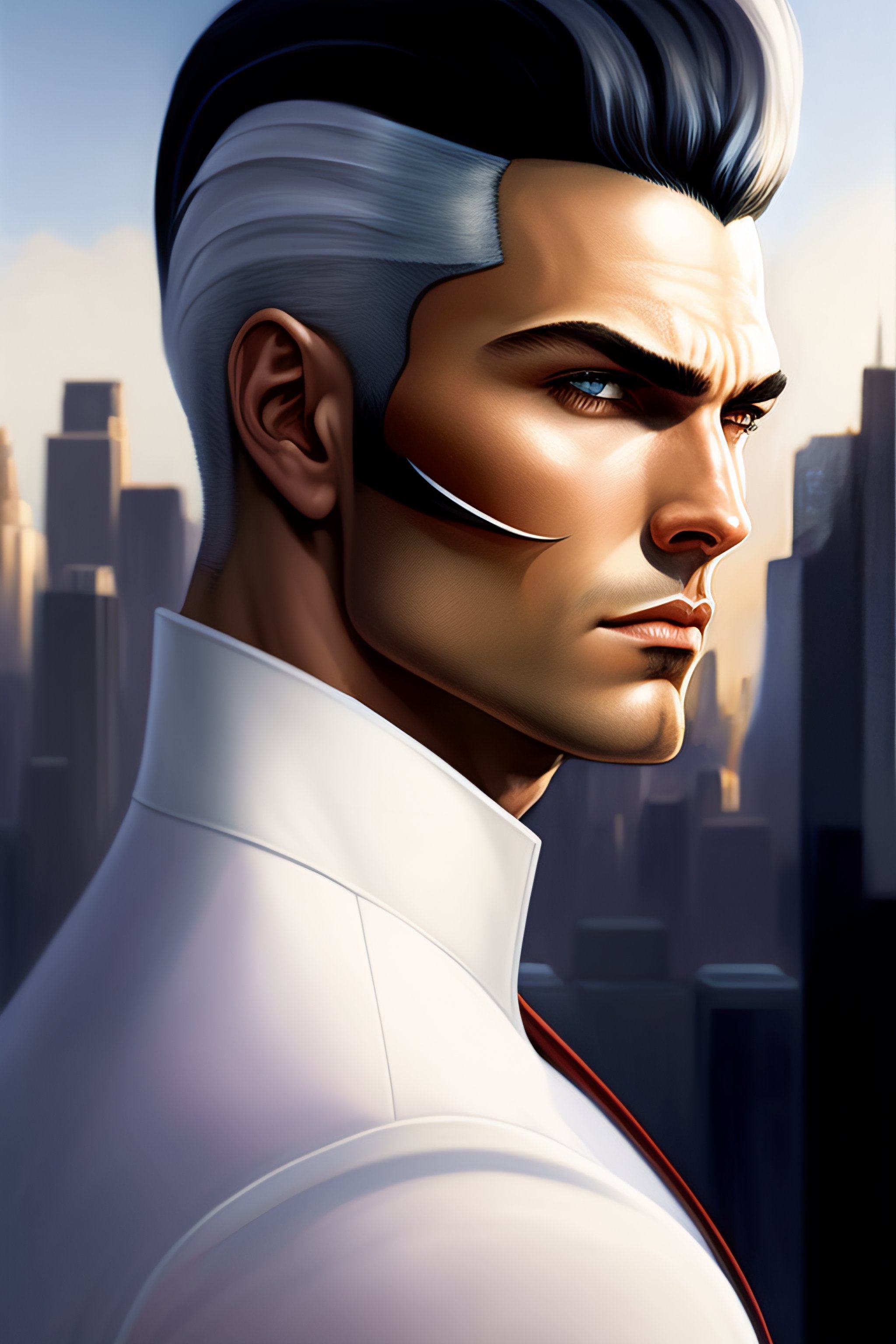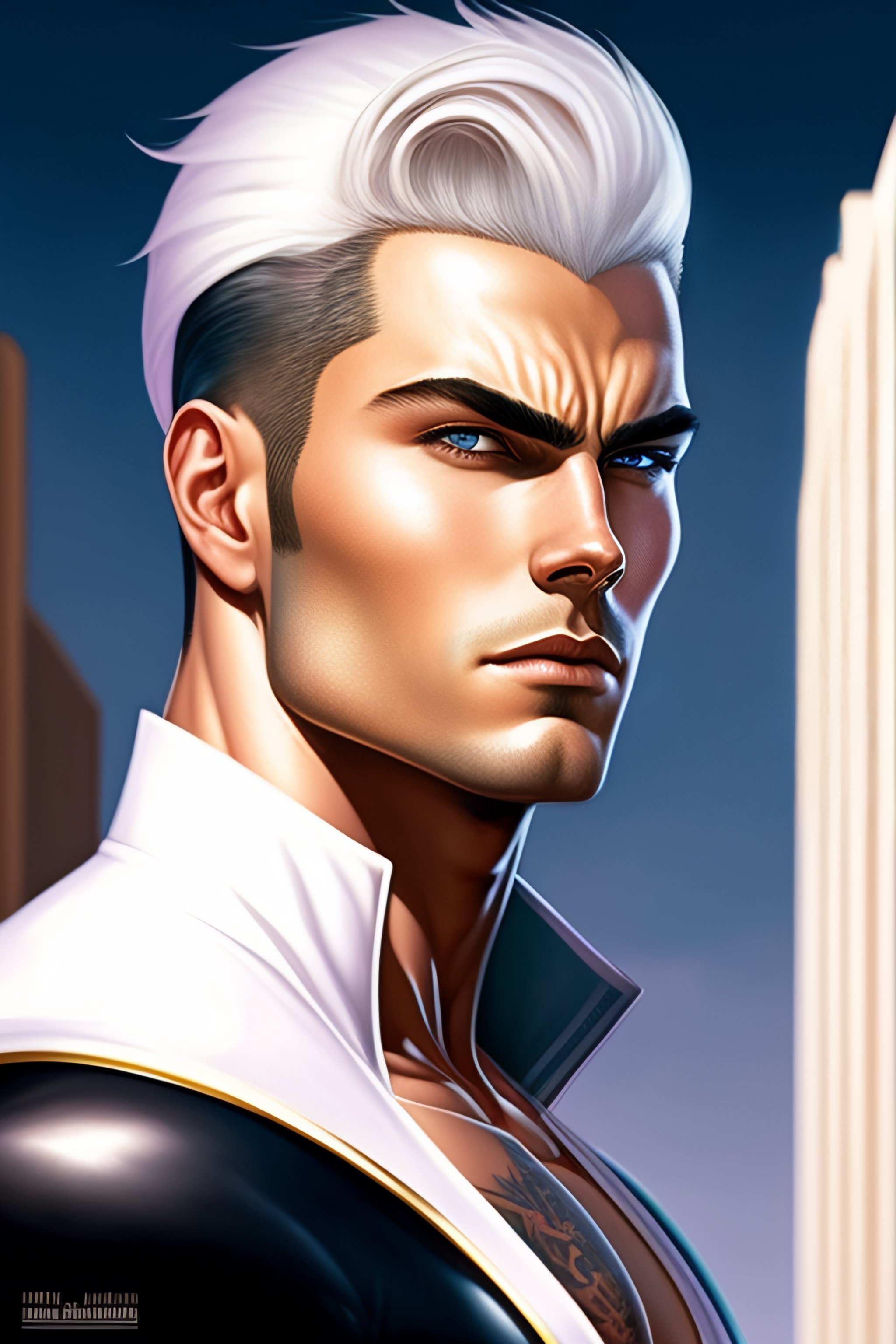 Beautiful portrait of handsome badass superhero, phil noto comicbook cover art, pompadour platinum white hair, marvel, symmetrical eyes, city rooftop