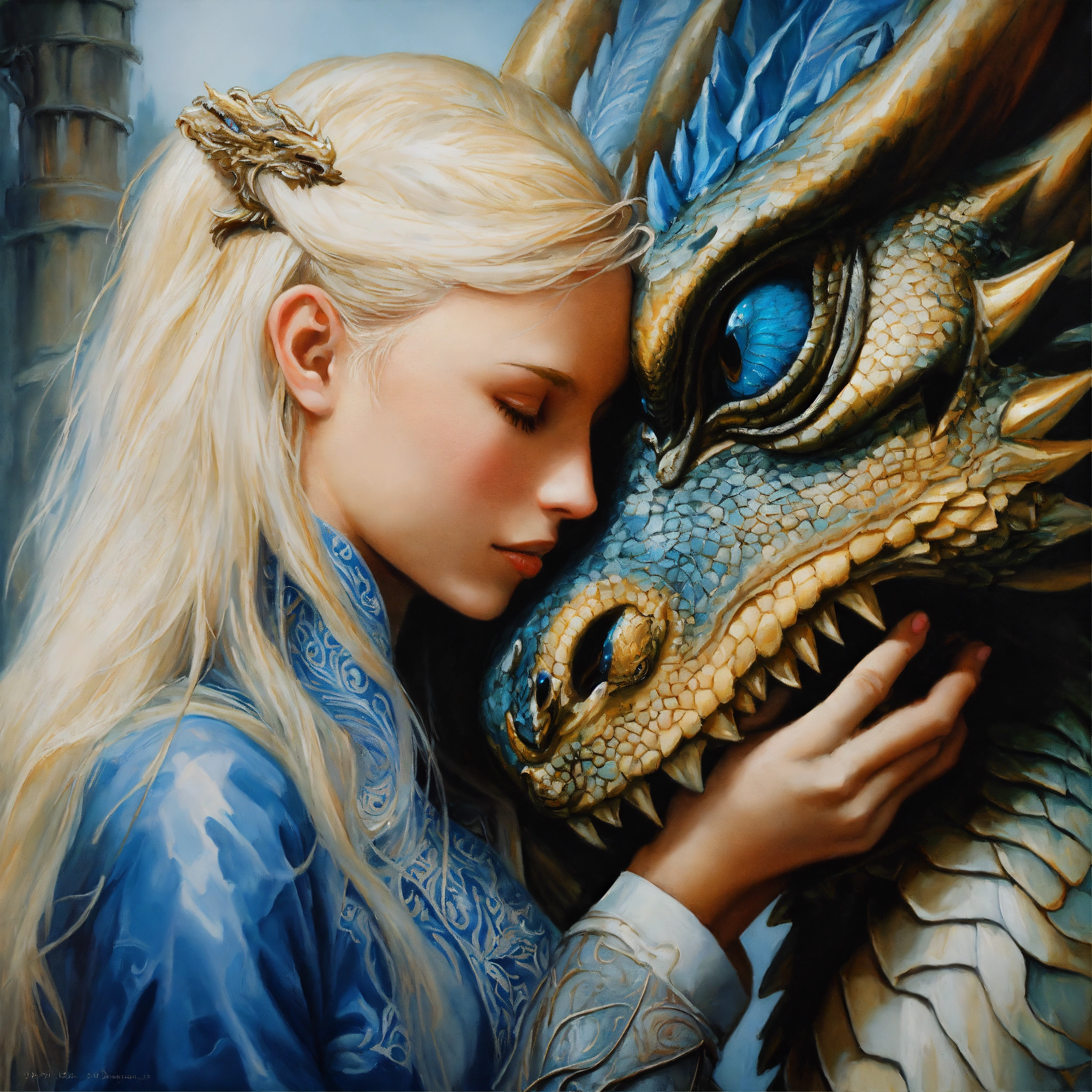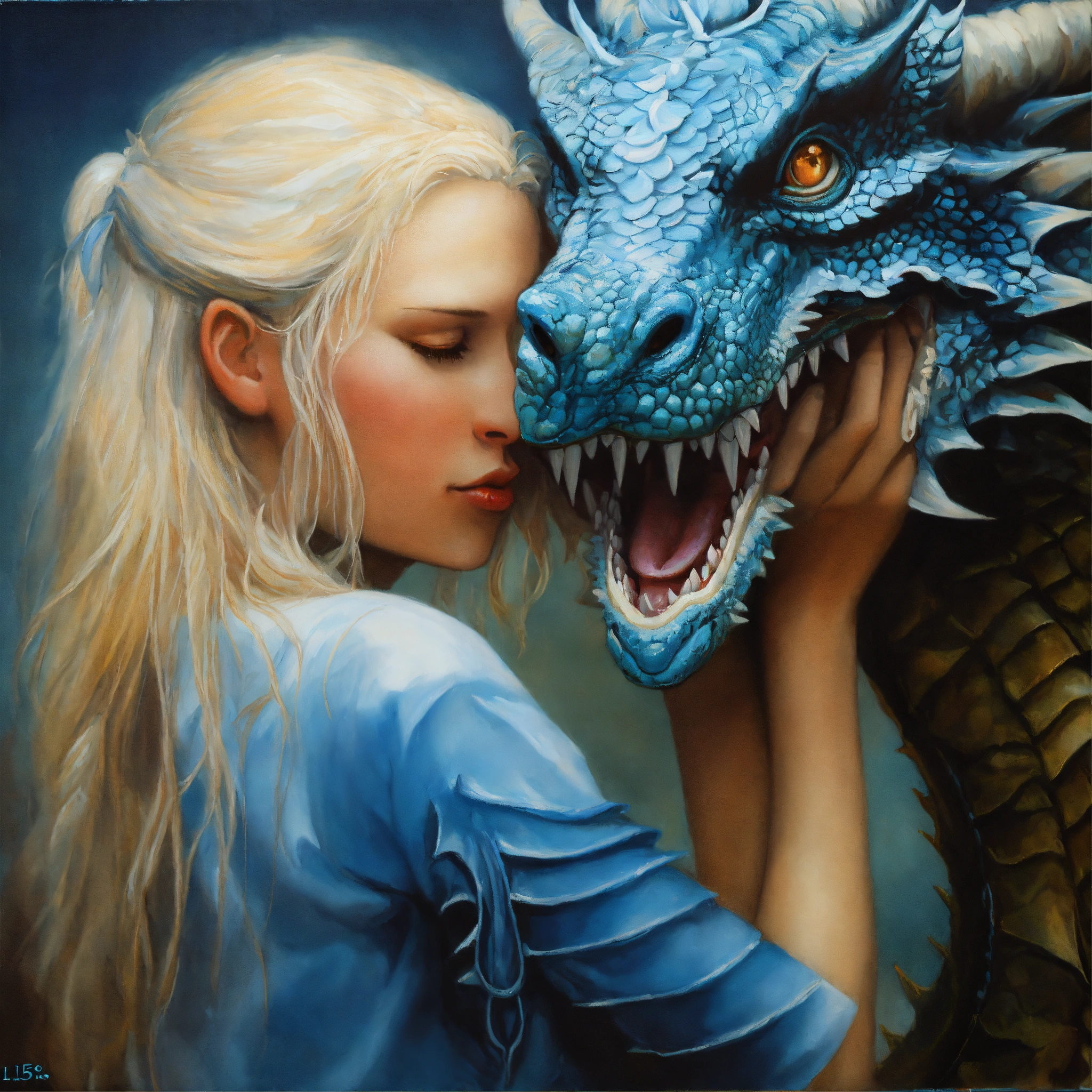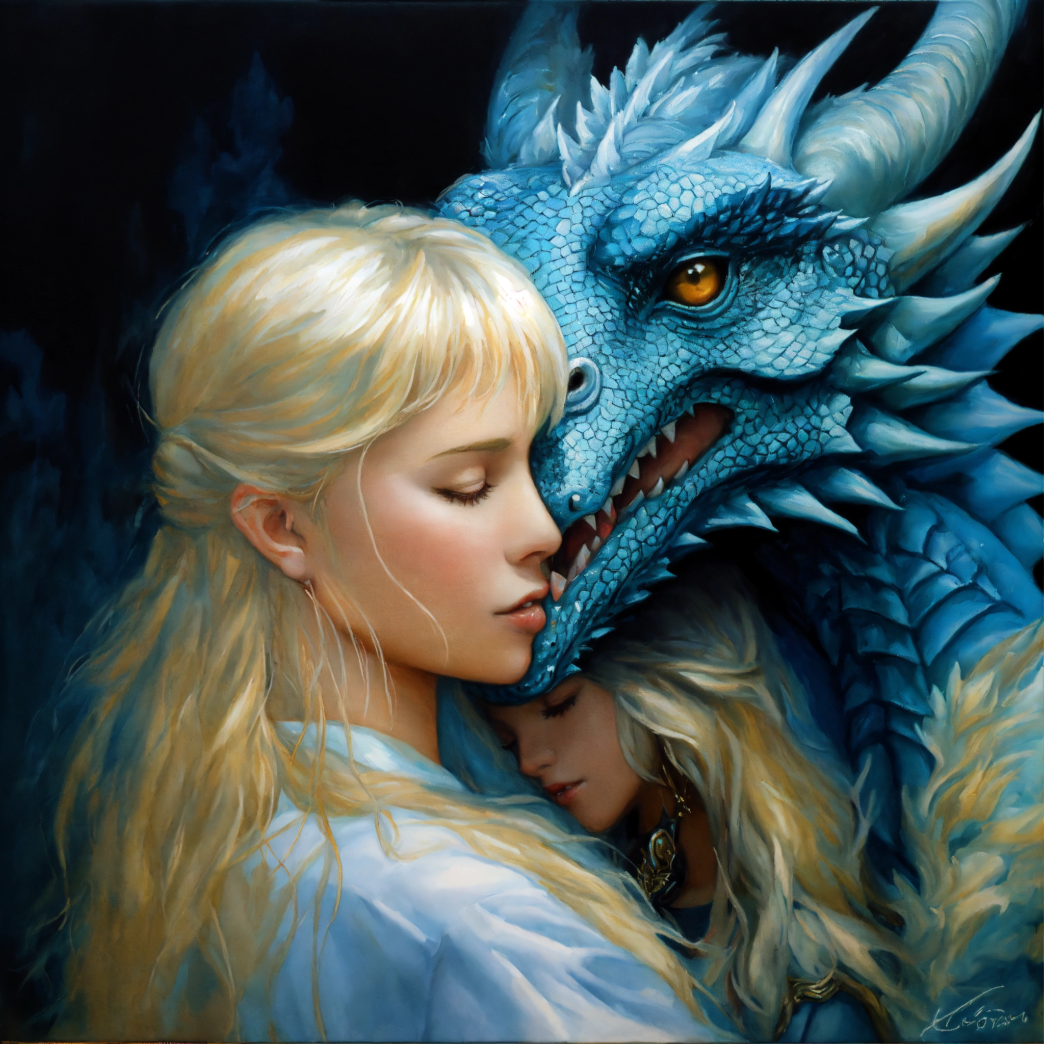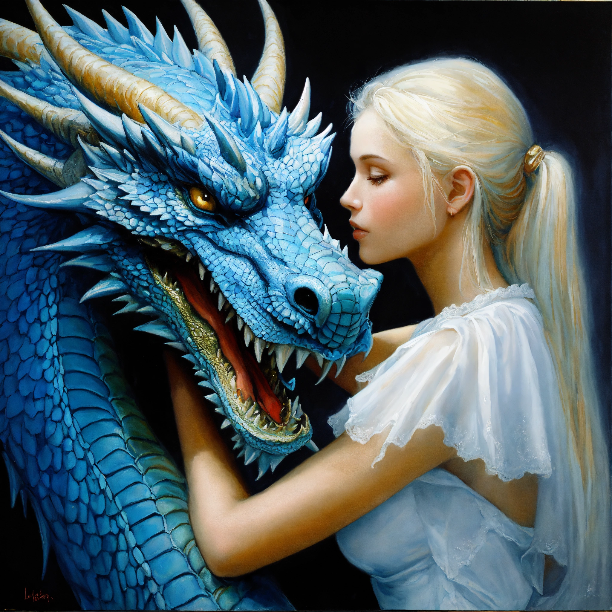 Oil painting of a huge magnificent two meter big blue dragon's head with a 15 year old white blonde elf girl lovingly hugging and kissing the dragon's head, the dragon's head is as big as the entire girl, ultra detailled, ultra realistic, in the style of luis royo