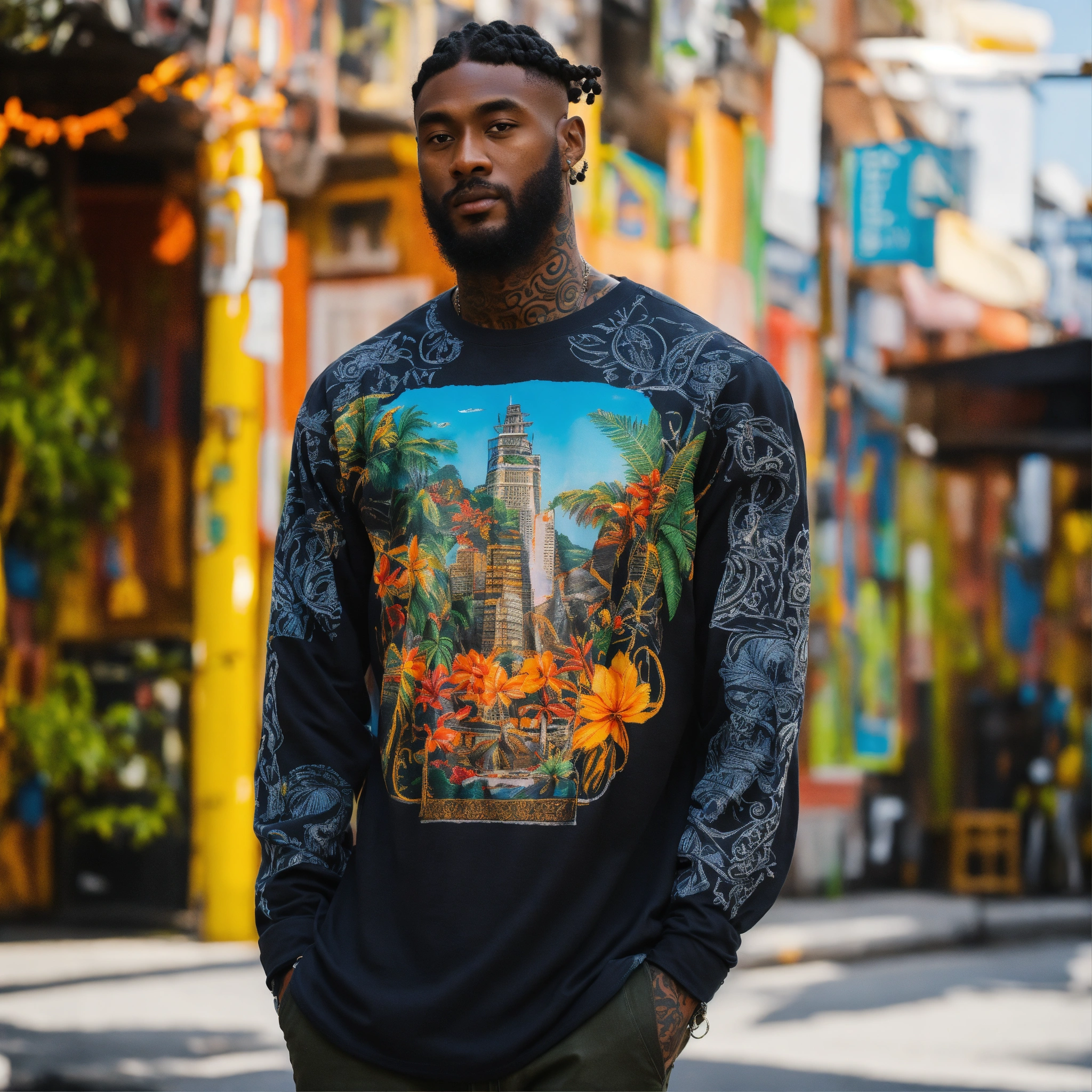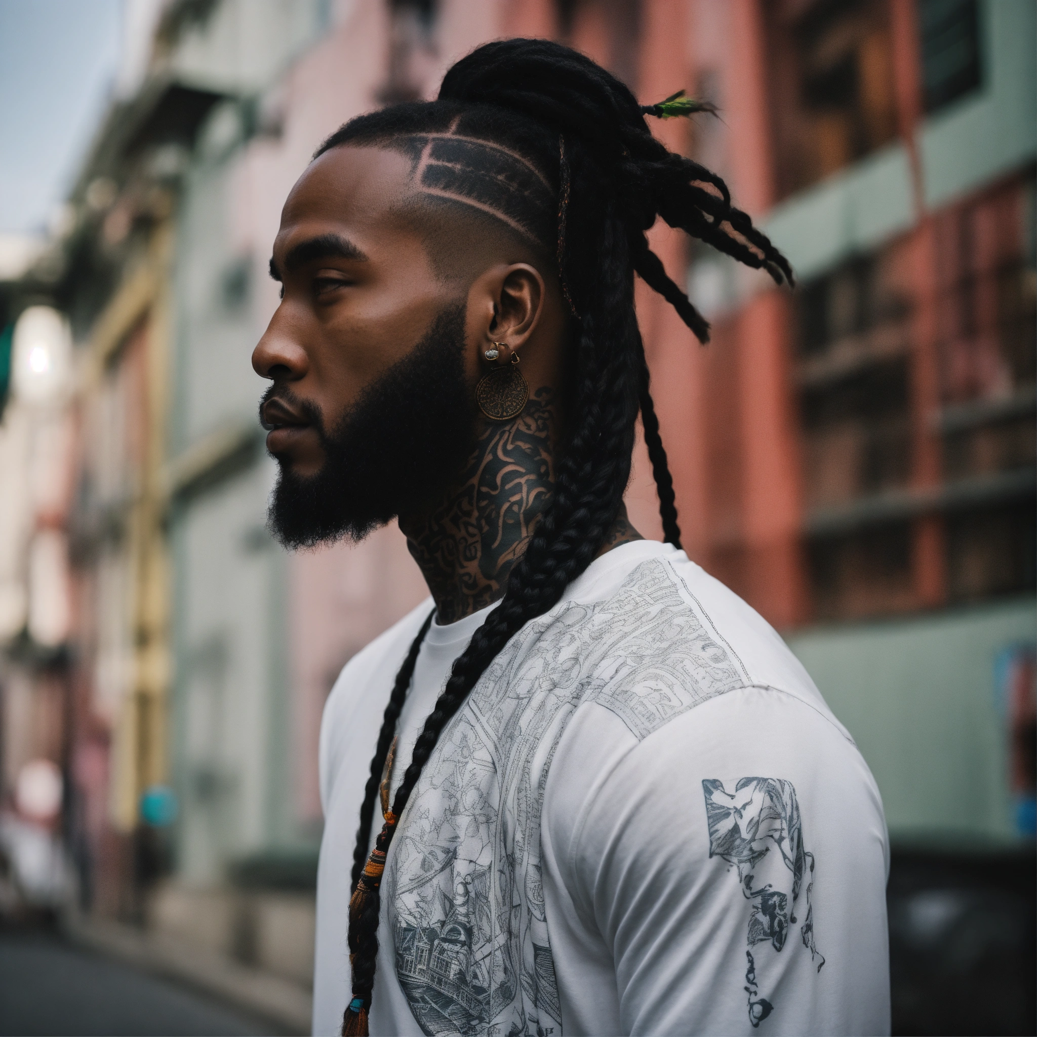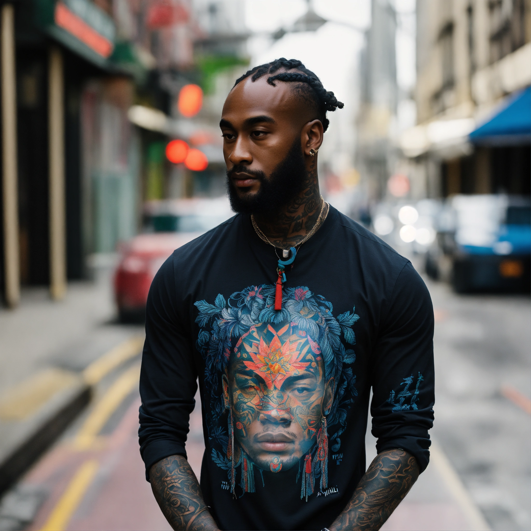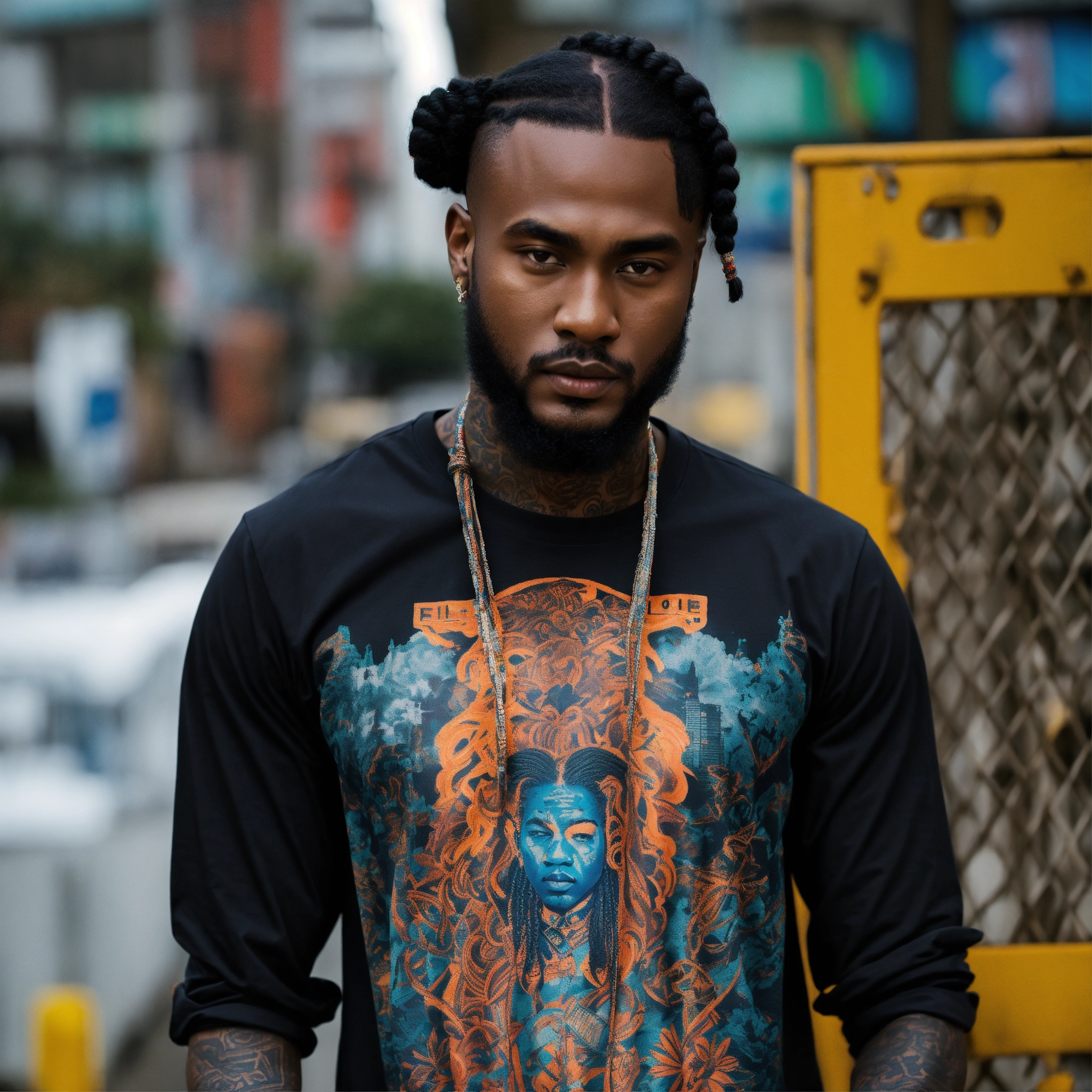 Design long-sleeve shirt, city, a black male model with braids hairstyle, plain long-sleeve shirt, canvas, his arms inked, polynesian, tattoos, collaboration, virgil abloh, chen zhen, artistic, vibrant, gritty